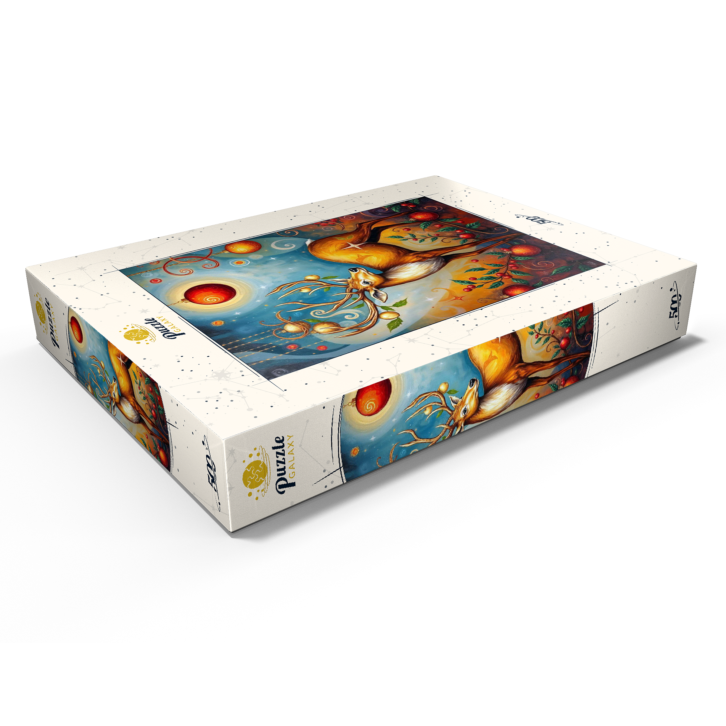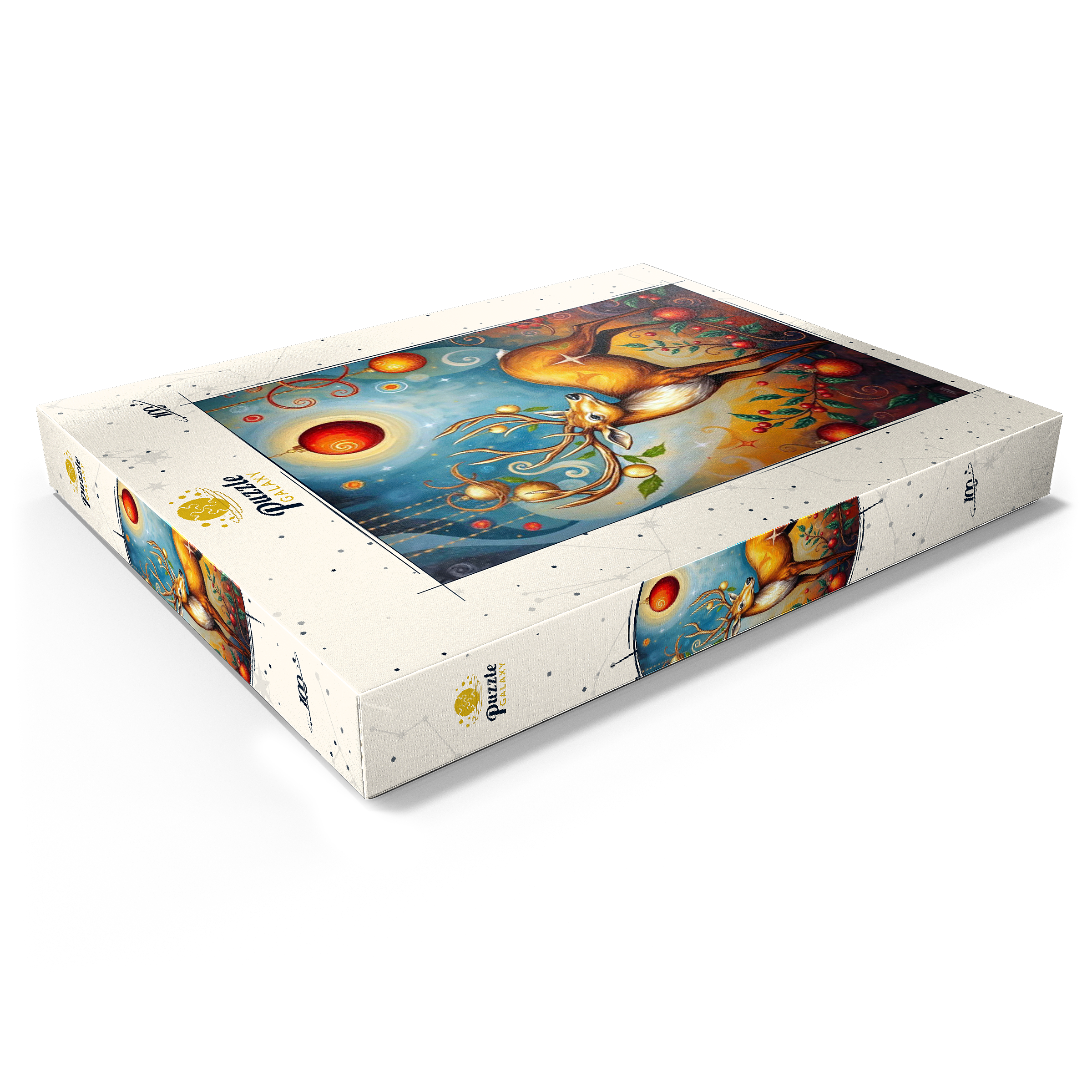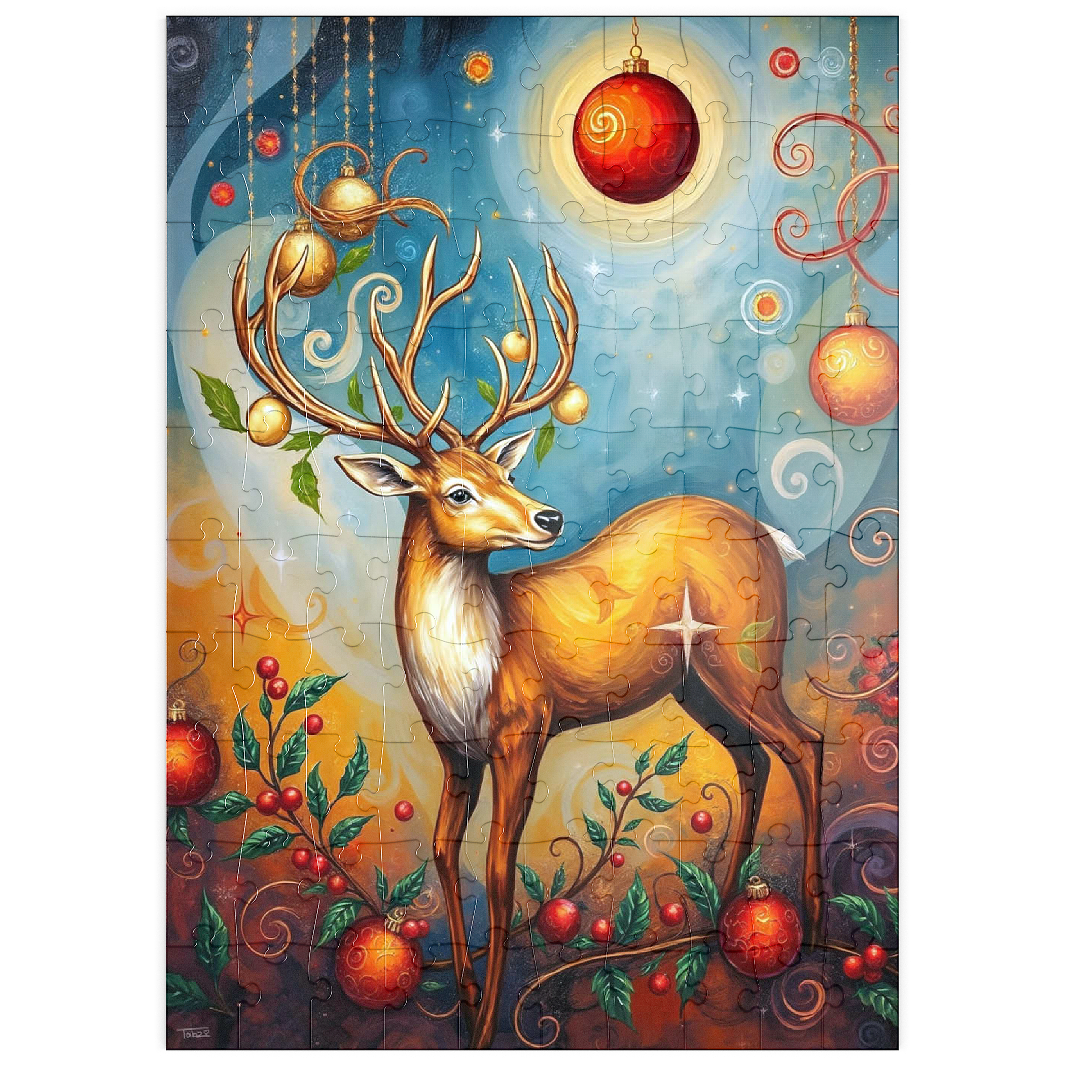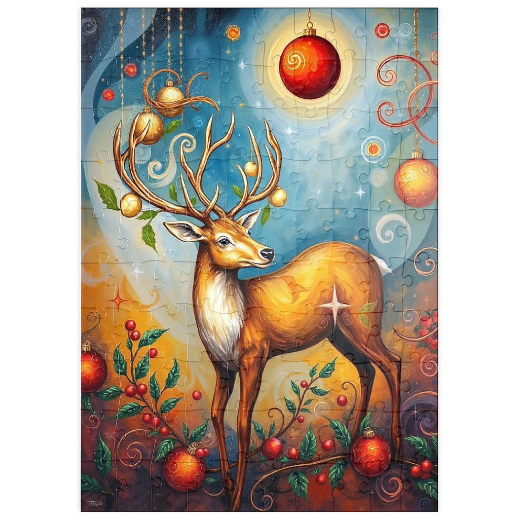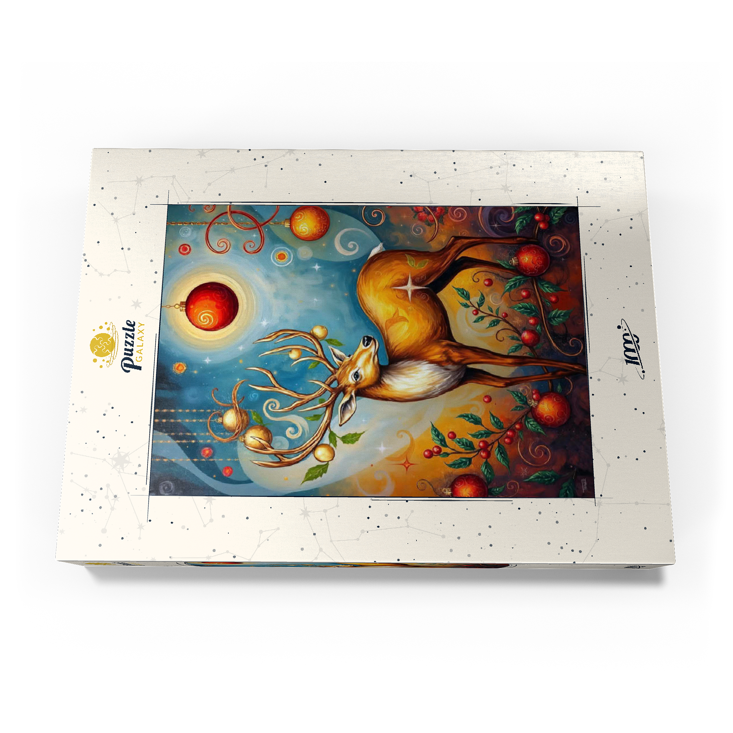 Ein verspieltes digitales Kunstwerk mit einem majestätischen Hirsch, der mit goldenen Geweihen geschmückt ist, die mit glitzernden Weihnachtsornamenten und Stechpalmenblättern verziert sind. Der Hintergrund ist ein magischer Wirbel aus tiefen Blau-, Gold- und Rottönen, mit leuchtenden Sternen und funkelnden Kugeln, die in der Luft schweben. Leuchtend rote Beeren und festliches Grün umgeben den Hirsch und verleihen dem Bild einen klassischen weihnachtlichen Touch. Der sanfte Ausdruck und die elegante Haltung des Hirsches strahlen Wärme und Wunder aus und machen dieses Kunstwerk perfekt für die saisonale Dekoration. Ideal für alle, die Weihnachtsmotive, festliche Tierkunst und bezaubernde Weihnachtsillustrationen lieben.