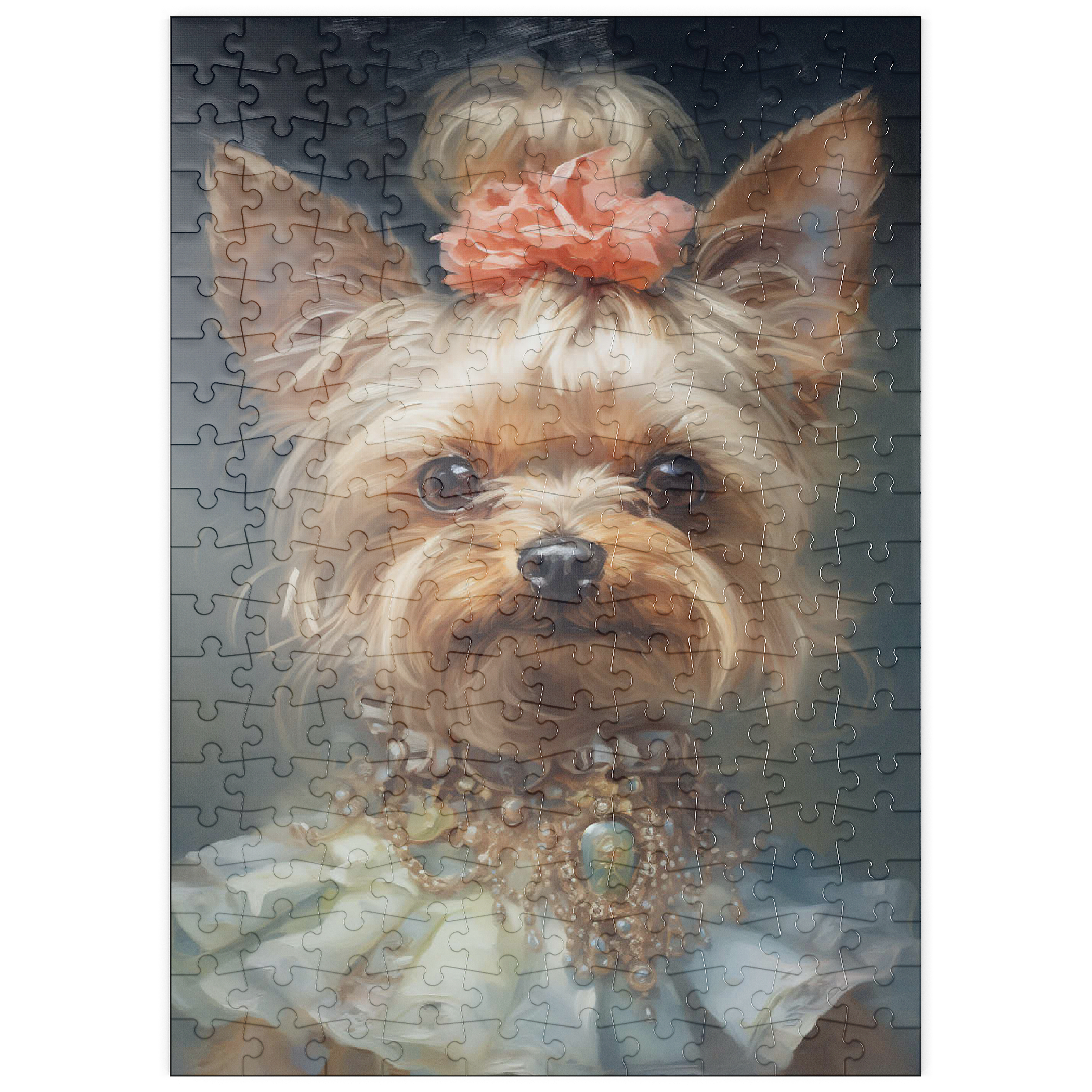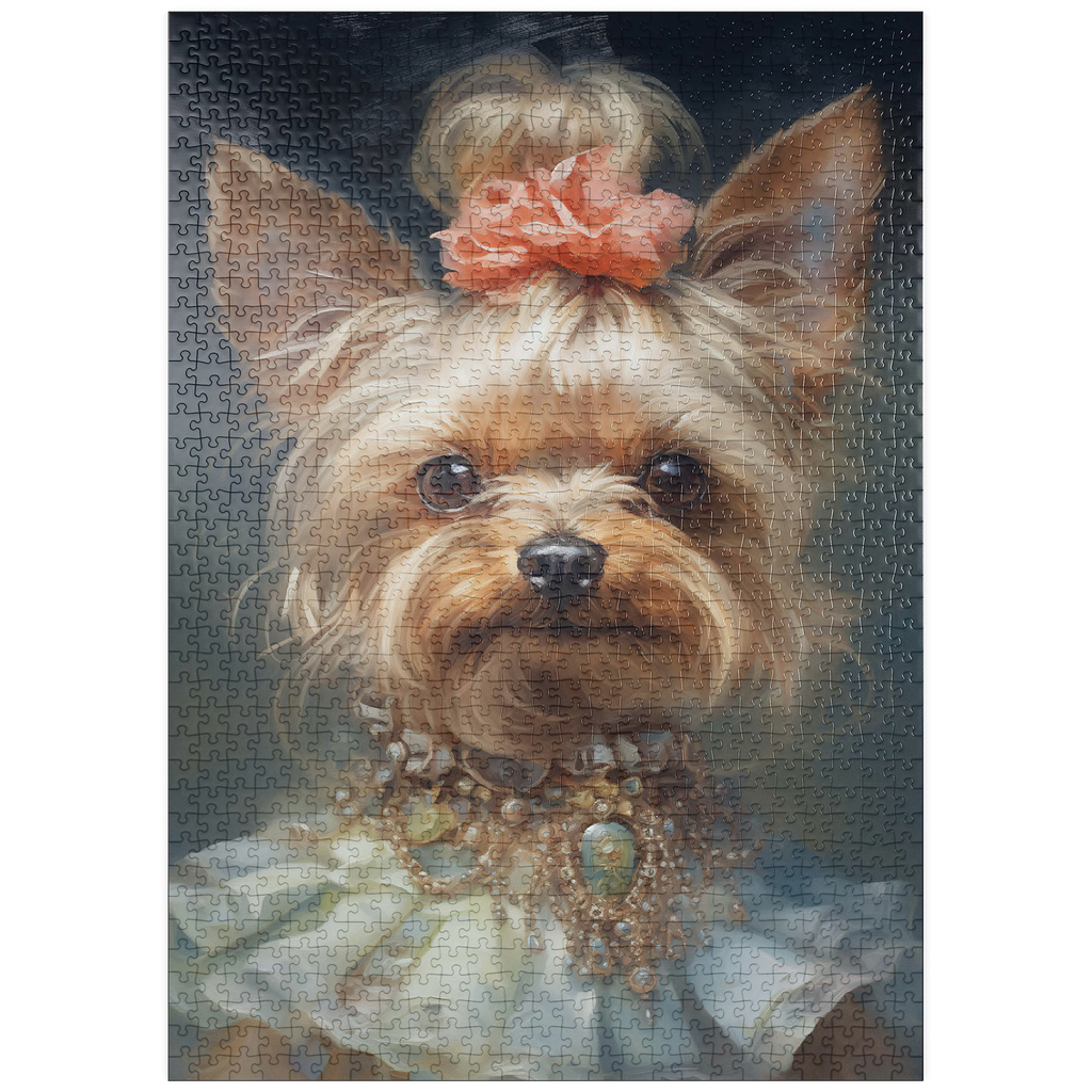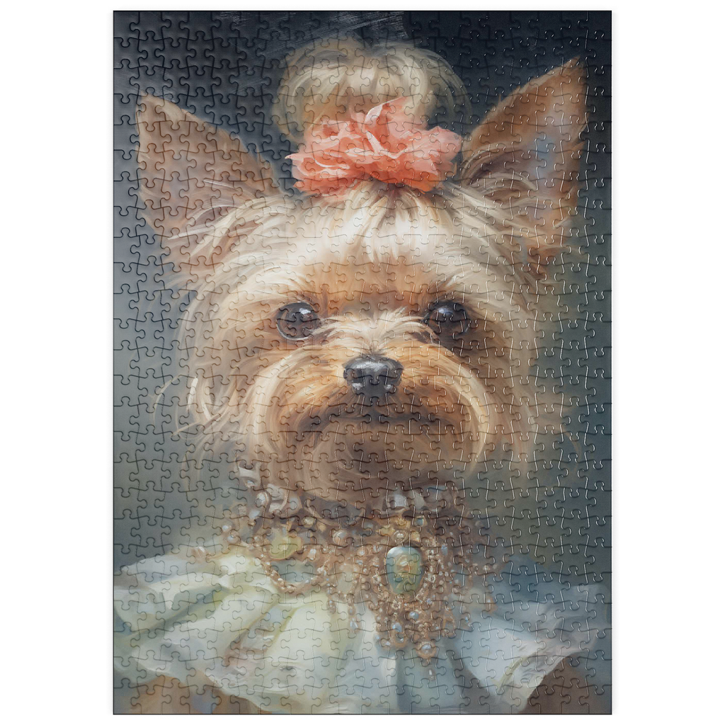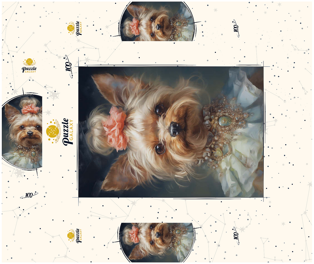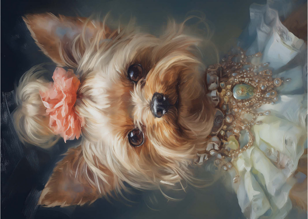 Dieses bezaubernde Kunstwerk zeigt einen Yorkshire Terrier in einem aristokratischen, viktorianisch inspirierten Porträt, das Anmut und Raffinesse ausstrahlt. Das detailreiche Werk zeigt den Yorkshire Terrier mit einem kunstvollen Perlen- und Edelsteinhalsband, einem zarten Spitzenkleid und einem charmanten Blumenhaarschmuck. Die sanften Pinselstriche und der klassische Stil verleihen einen altmodischen Charme, der an königliche Tierporträts aus der Vergangenheit erinnert. Eine perfekte Ergänzung für Liebhaber von eleganter Hundekunst, Vintage-Ästhetik und barocken Tierillustrationen.