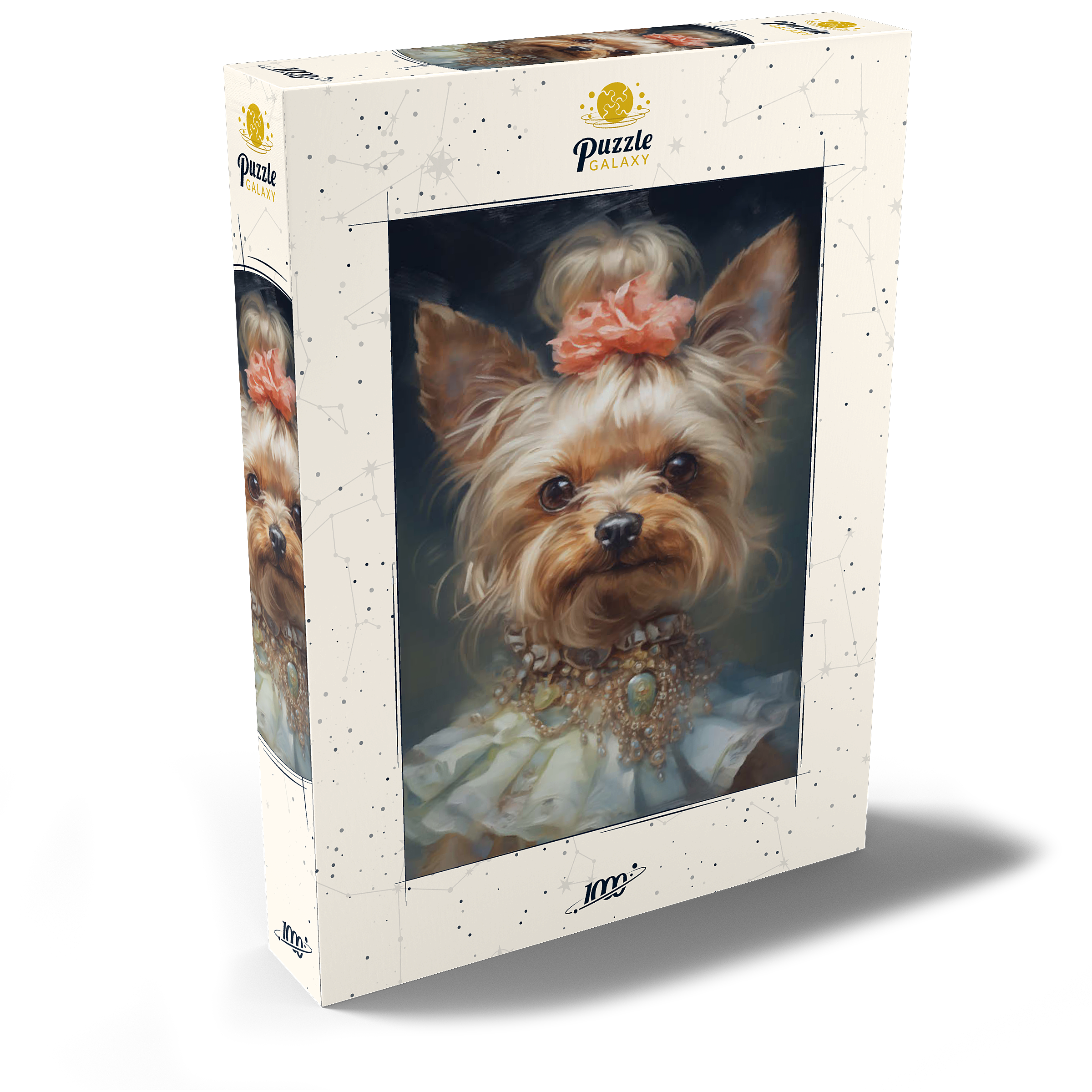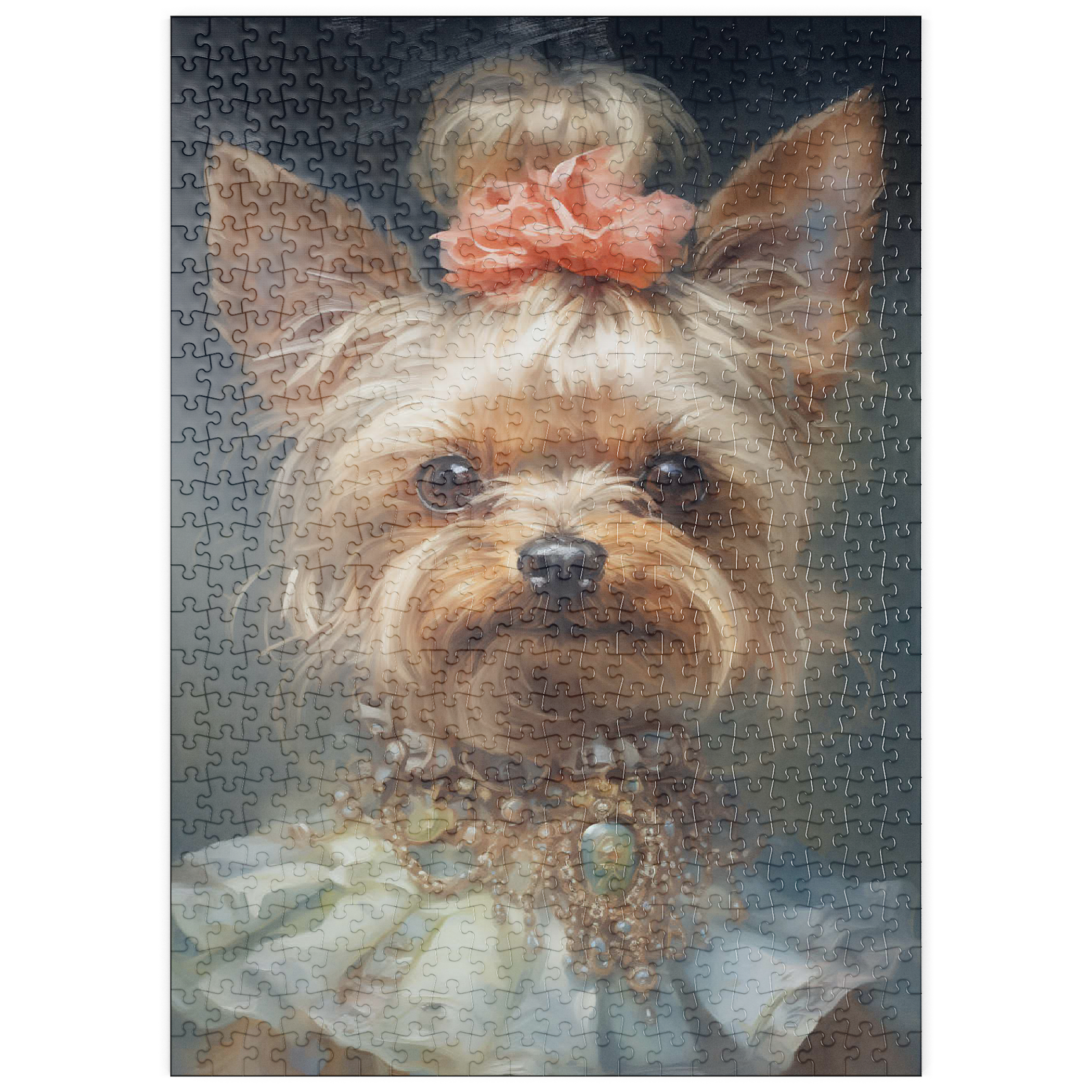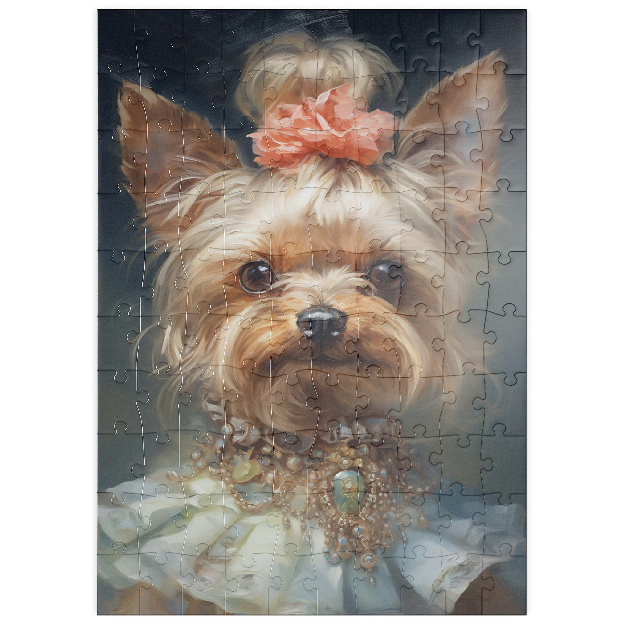 Dieses bezaubernde Kunstwerk zeigt einen Yorkshire Terrier in einem aristokratischen, viktorianisch inspirierten Porträt, das Anmut und Raffinesse ausstrahlt. Das detailreiche Werk zeigt den Yorkshire Terrier mit einem kunstvollen Perlen- und Edelsteinhalsband, einem zarten Spitzenkleid und einem charmanten Blumenhaarschmuck. Die sanften Pinselstriche und der klassische Stil verleihen einen altmodischen Charme, der an königliche Tierporträts aus der Vergangenheit erinnert. Eine perfekte Ergänzung für Liebhaber von eleganter Hundekunst, Vintage-Ästhetik und barocken Tierillustrationen.