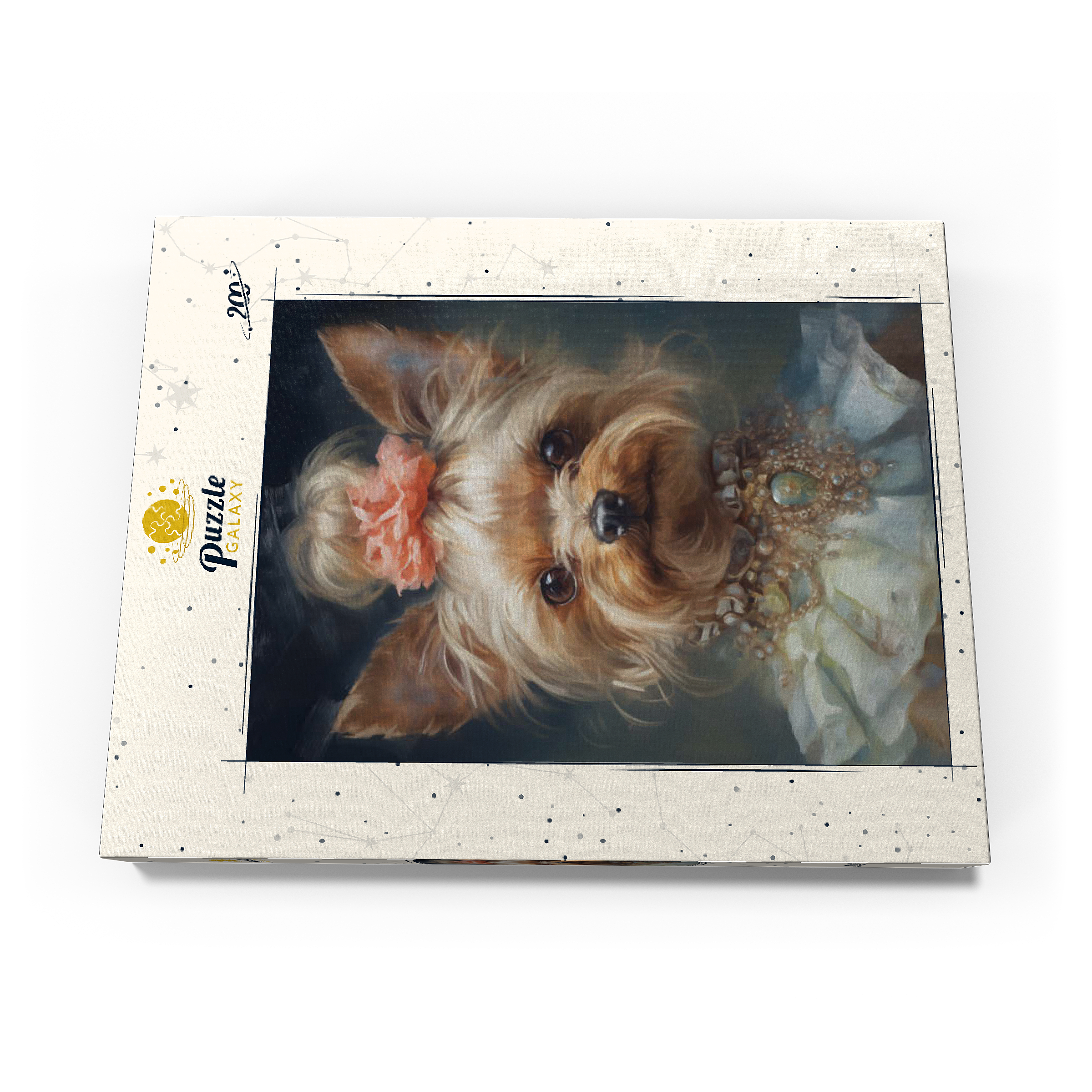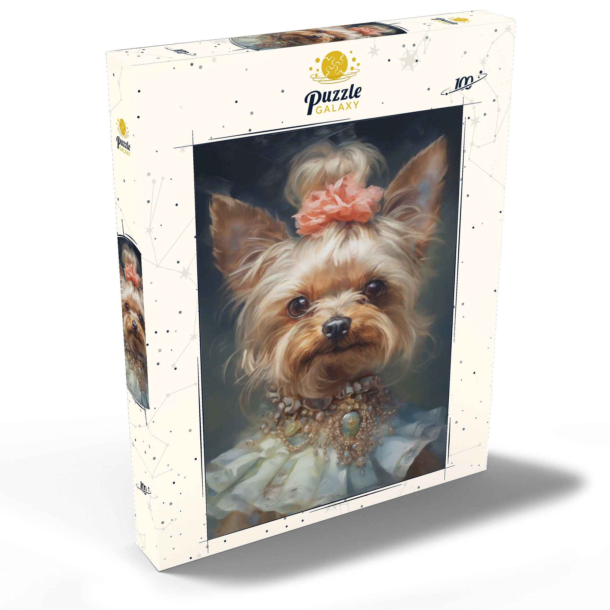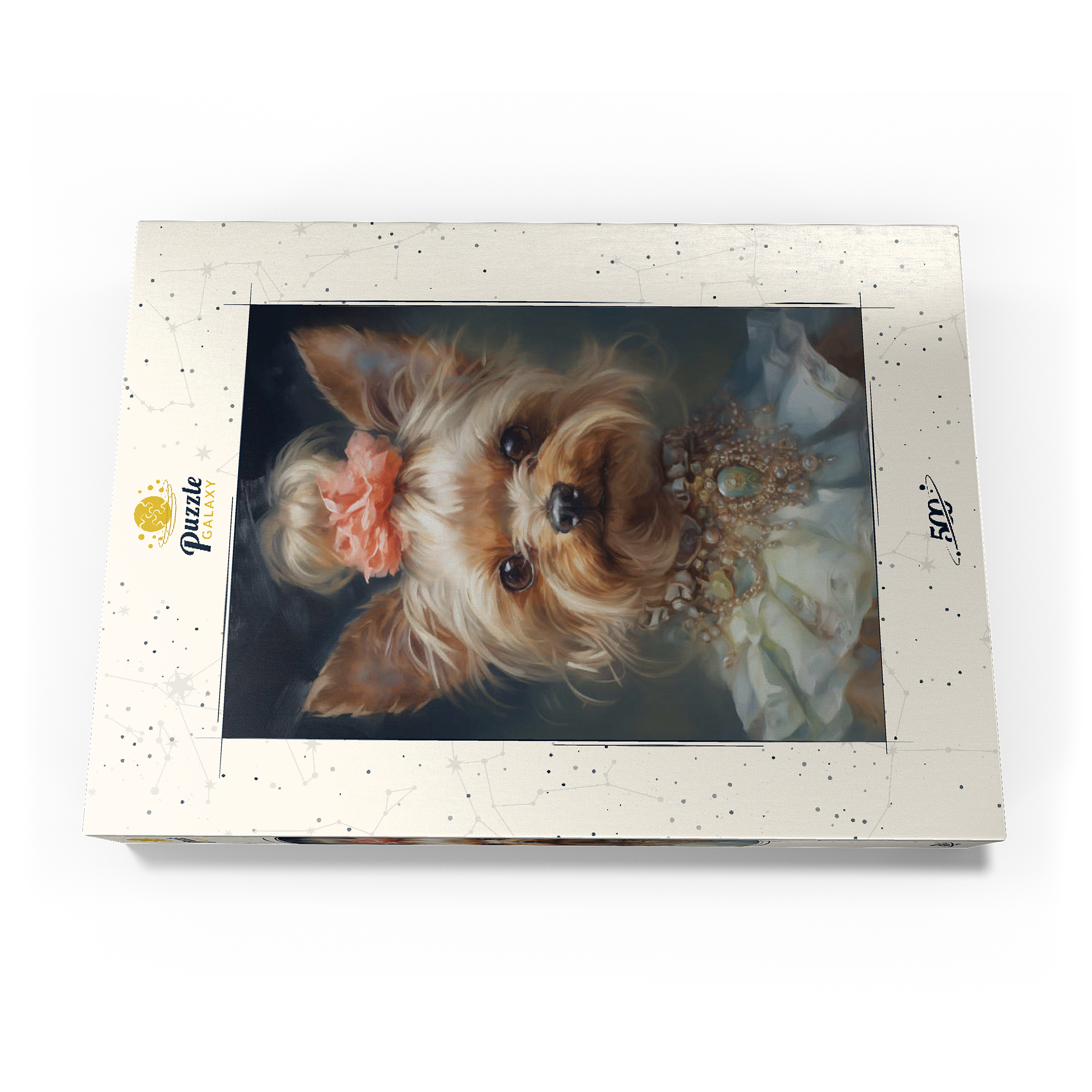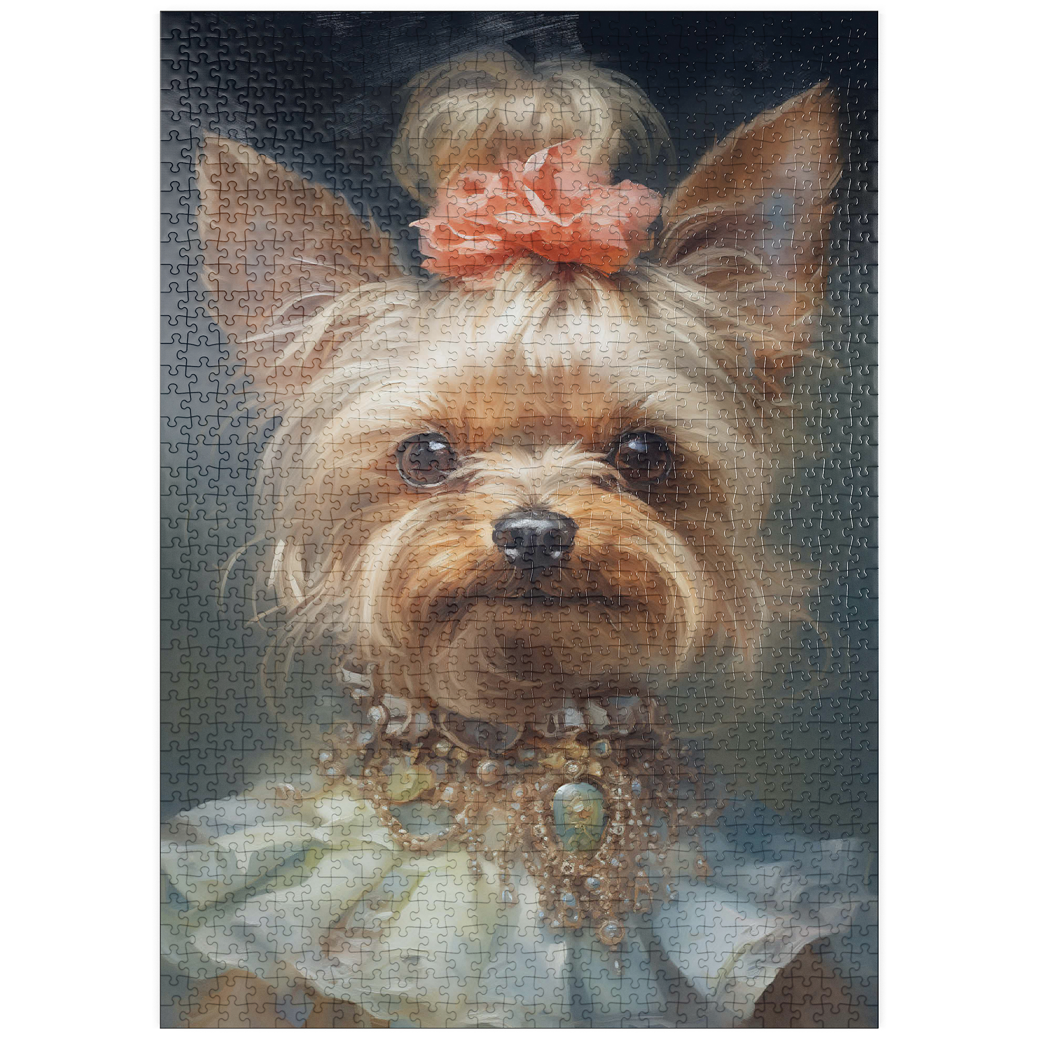 Dieses bezaubernde Kunstwerk zeigt einen Yorkshire Terrier in einem aristokratischen, viktorianisch inspirierten Porträt, das Anmut und Raffinesse ausstrahlt. Das detailreiche Werk zeigt den Yorkshire Terrier mit einem kunstvollen Perlen- und Edelsteinhalsband, einem zarten Spitzenkleid und einem charmanten Blumenhaarschmuck. Die sanften Pinselstriche und der klassische Stil verleihen einen altmodischen Charme, der an königliche Tierporträts aus der Vergangenheit erinnert. Eine perfekte Ergänzung für Liebhaber von eleganter Hundekunst, Vintage-Ästhetik und barocken Tierillustrationen.