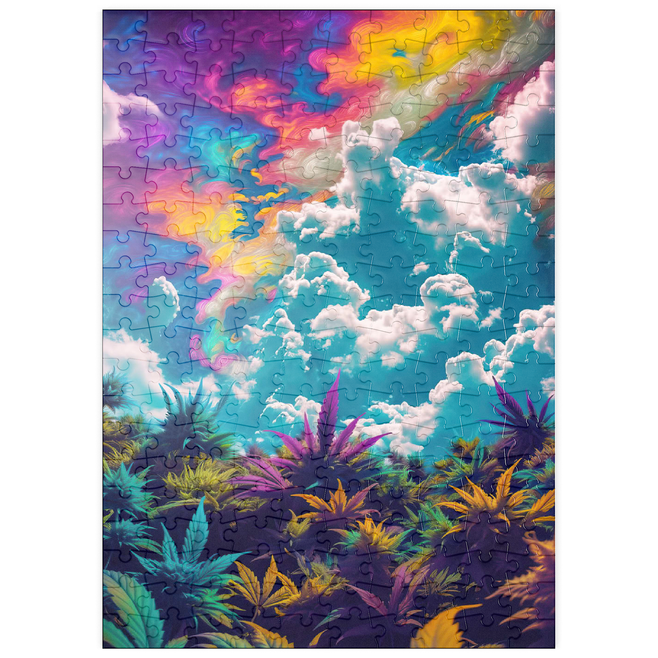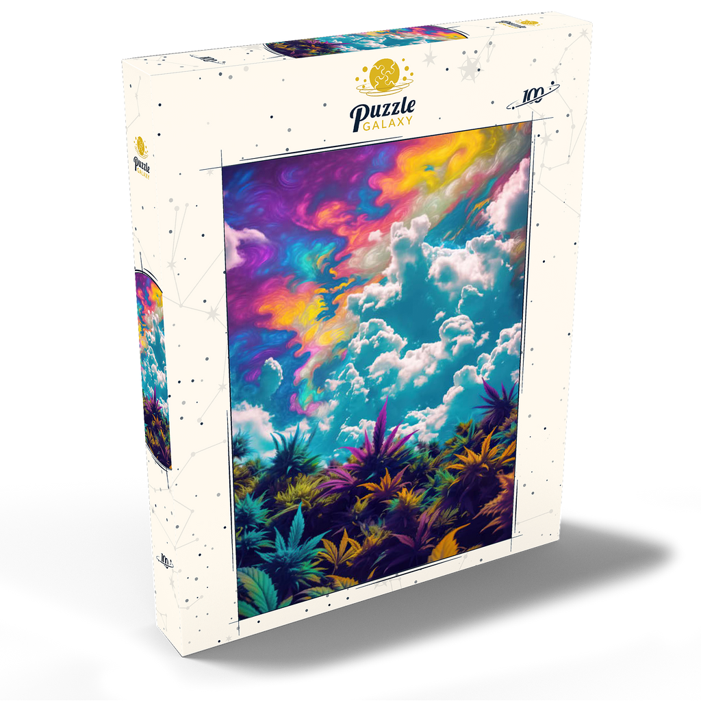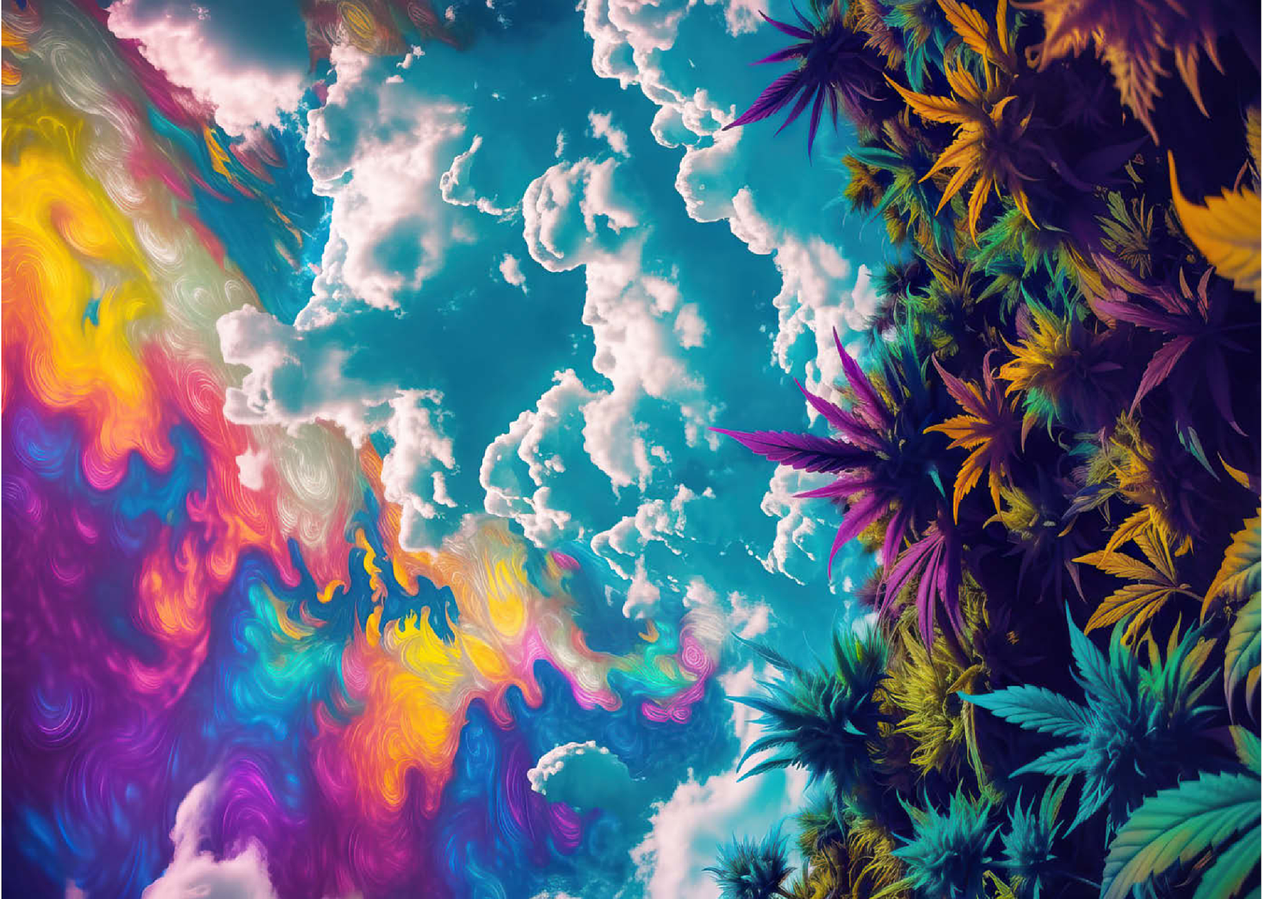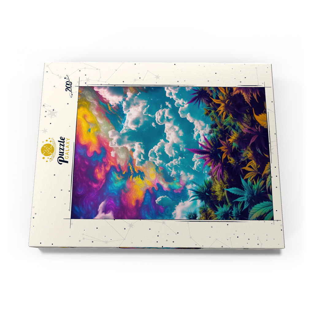 Dieses faszinierende Kunstwerk ist eine Mischung aus Natur und Fantasie. Es zeigt einen surrealen Himmel mit wirbelnden Neontönen in Lila, Orange, Blau und Rosa. Darunter bildet üppiges und farbenfrohes Laub in tiefen Grün-, Violett- und Goldtönen einen traumhaften Kontrast zu den hellen, wogenden Wolken. Die Verschmelzung von Realismus und abstrakten psychedelischen Elementen verleiht diesem Werk eine hypnotische und jenseitige Atmosphäre und macht es perfekt für Liebhaber von visionärer Kunst, lebendigen Naturszenen und surrealen Traumlandschaften. Ein auffälliges Statement für jeden Raum, der Fantasie und Kreativität zelebriert.