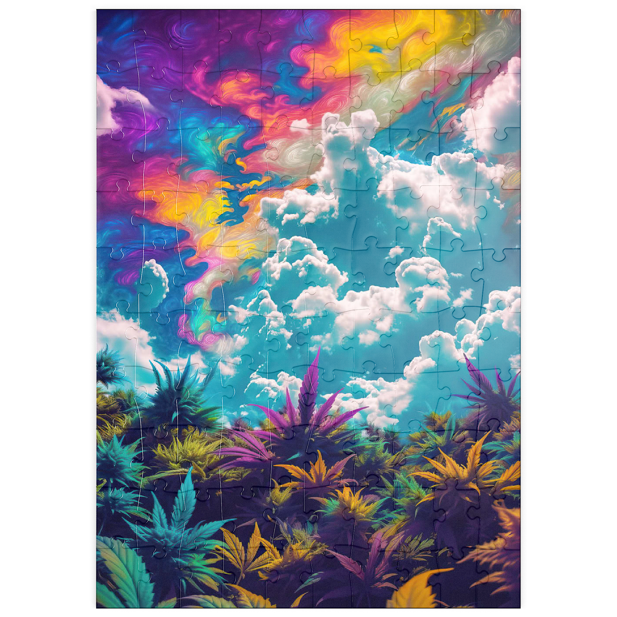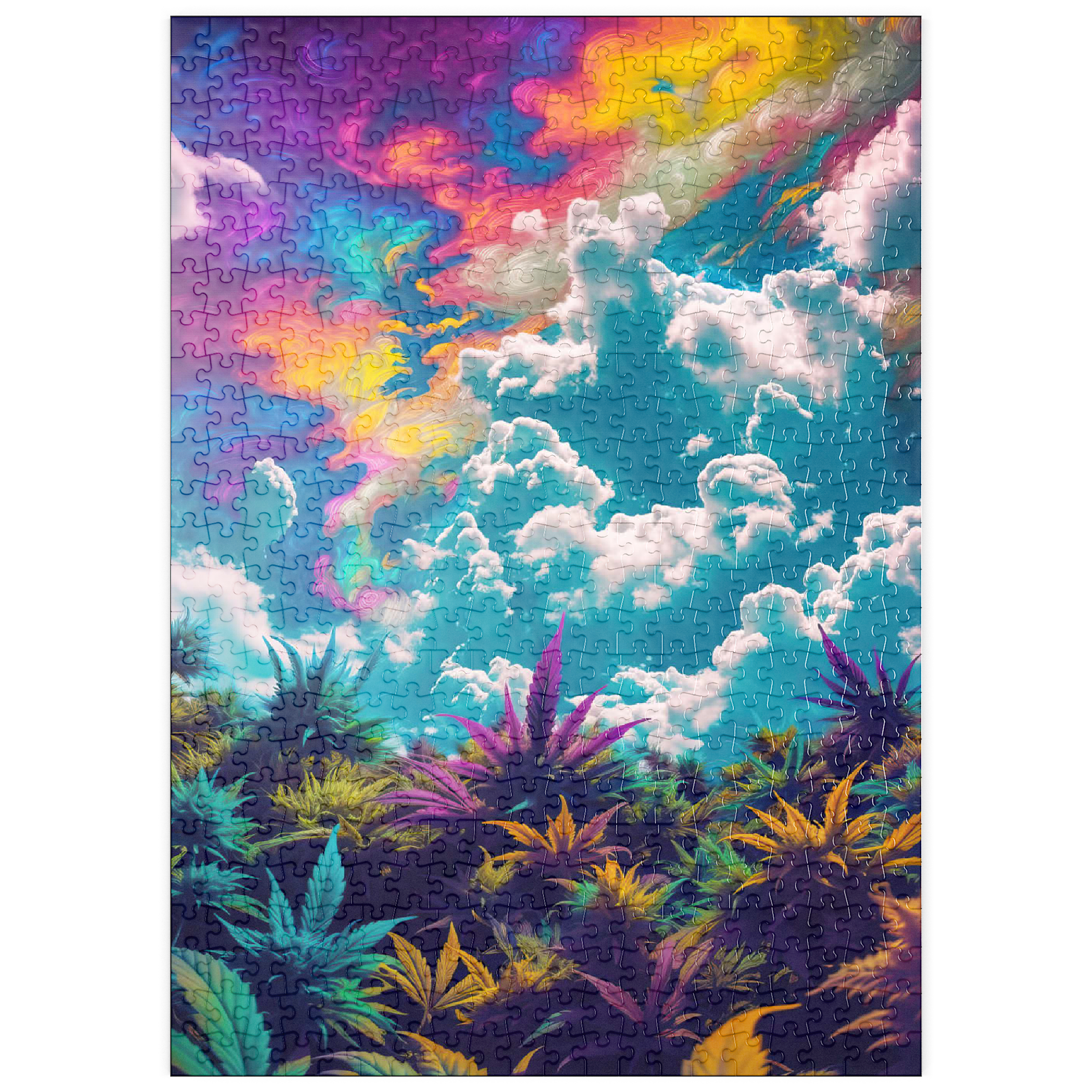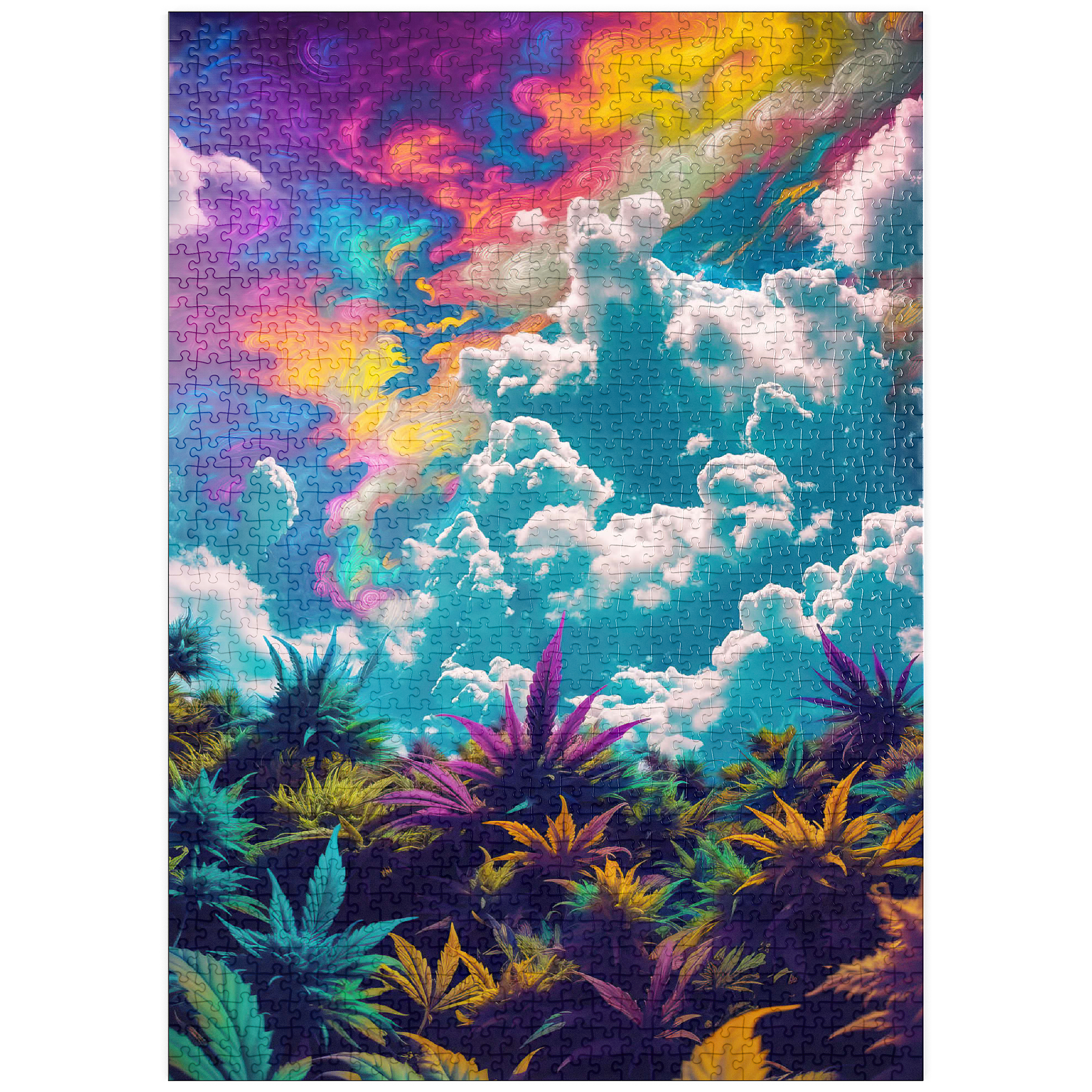 Dieses faszinierende Kunstwerk ist eine Mischung aus Natur und Fantasie. Es zeigt einen surrealen Himmel mit wirbelnden Neontönen in Lila, Orange, Blau und Rosa. Darunter bildet üppiges und farbenfrohes Laub in tiefen Grün-, Violett- und Goldtönen einen traumhaften Kontrast zu den hellen, wogenden Wolken. Die Verschmelzung von Realismus und abstrakten psychedelischen Elementen verleiht diesem Werk eine hypnotische und jenseitige Atmosphäre und macht es perfekt für Liebhaber von visionärer Kunst, lebendigen Naturszenen und surrealen Traumlandschaften. Ein auffälliges Statement für jeden Raum, der Fantasie und Kreativität zelebriert.