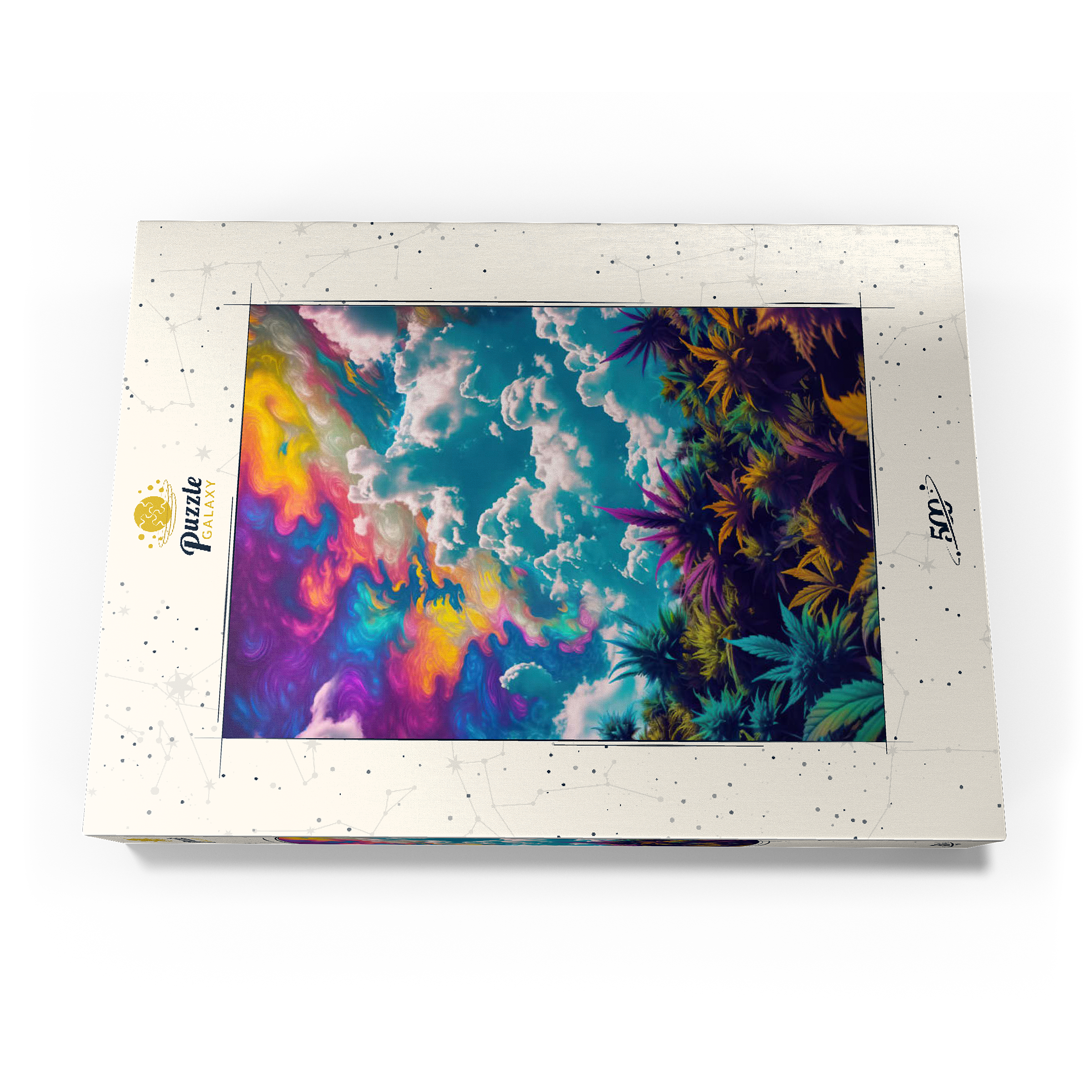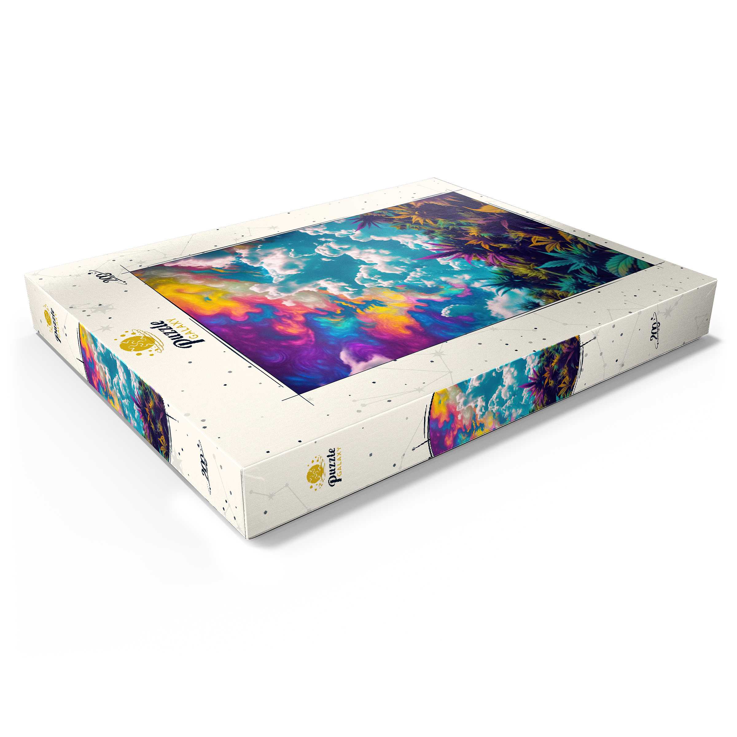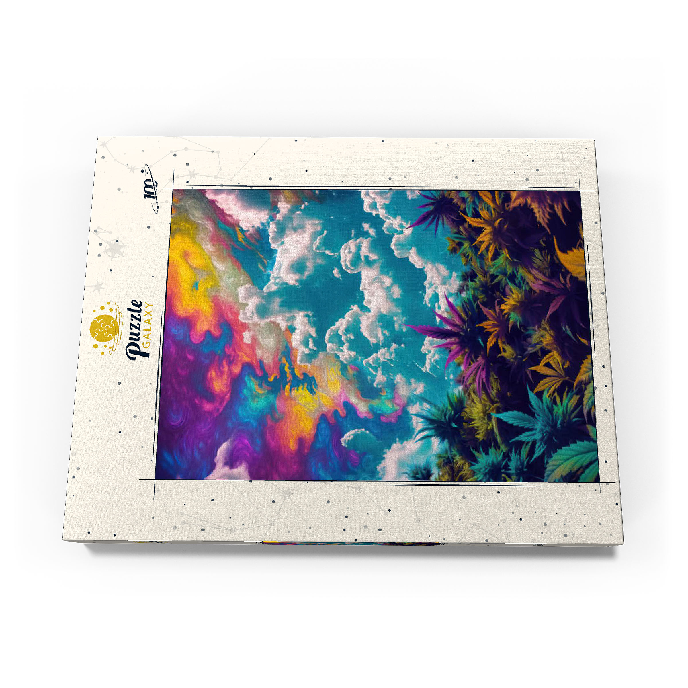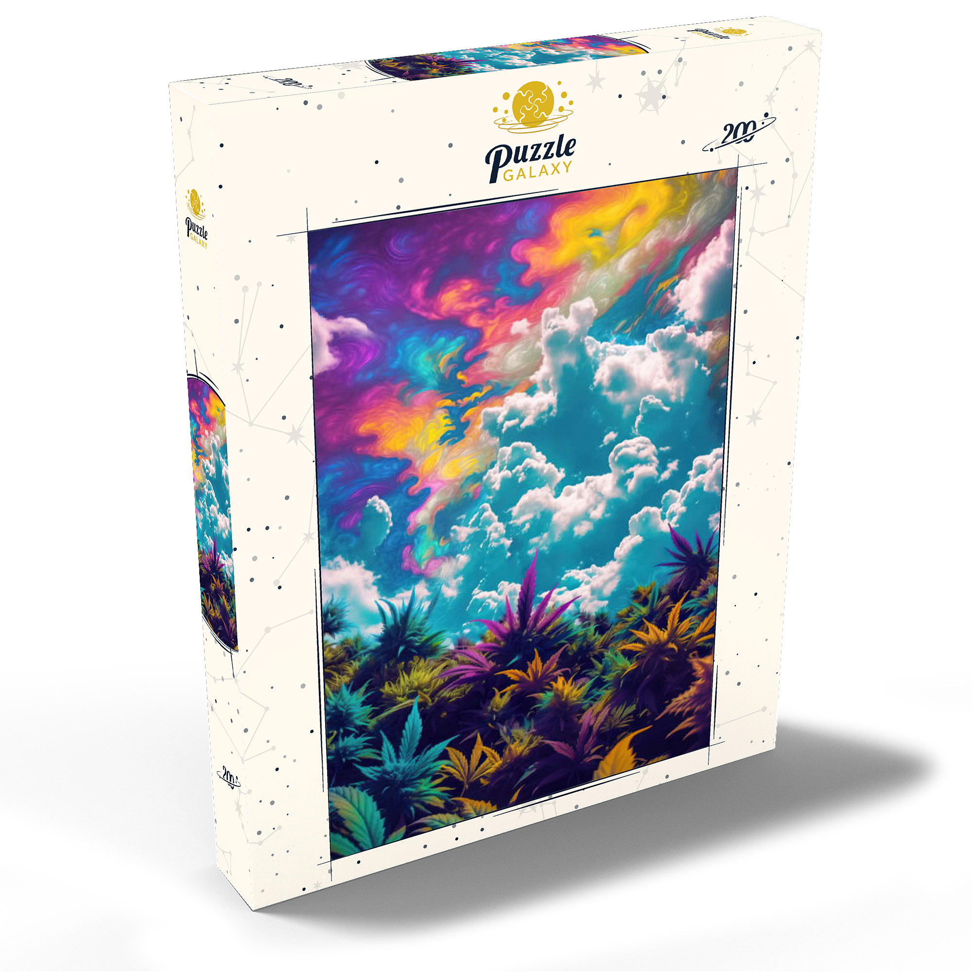 Dieses faszinierende Kunstwerk ist eine Mischung aus Natur und Fantasie. Es zeigt einen surrealen Himmel mit wirbelnden Neontönen in Lila, Orange, Blau und Rosa. Darunter bildet üppiges und farbenfrohes Laub in tiefen Grün-, Violett- und Goldtönen einen traumhaften Kontrast zu den hellen, wogenden Wolken. Die Verschmelzung von Realismus und abstrakten psychedelischen Elementen verleiht diesem Werk eine hypnotische und jenseitige Atmosphäre und macht es perfekt für Liebhaber von visionärer Kunst, lebendigen Naturszenen und surrealen Traumlandschaften. Ein auffälliges Statement für jeden Raum, der Fantasie und Kreativität zelebriert.