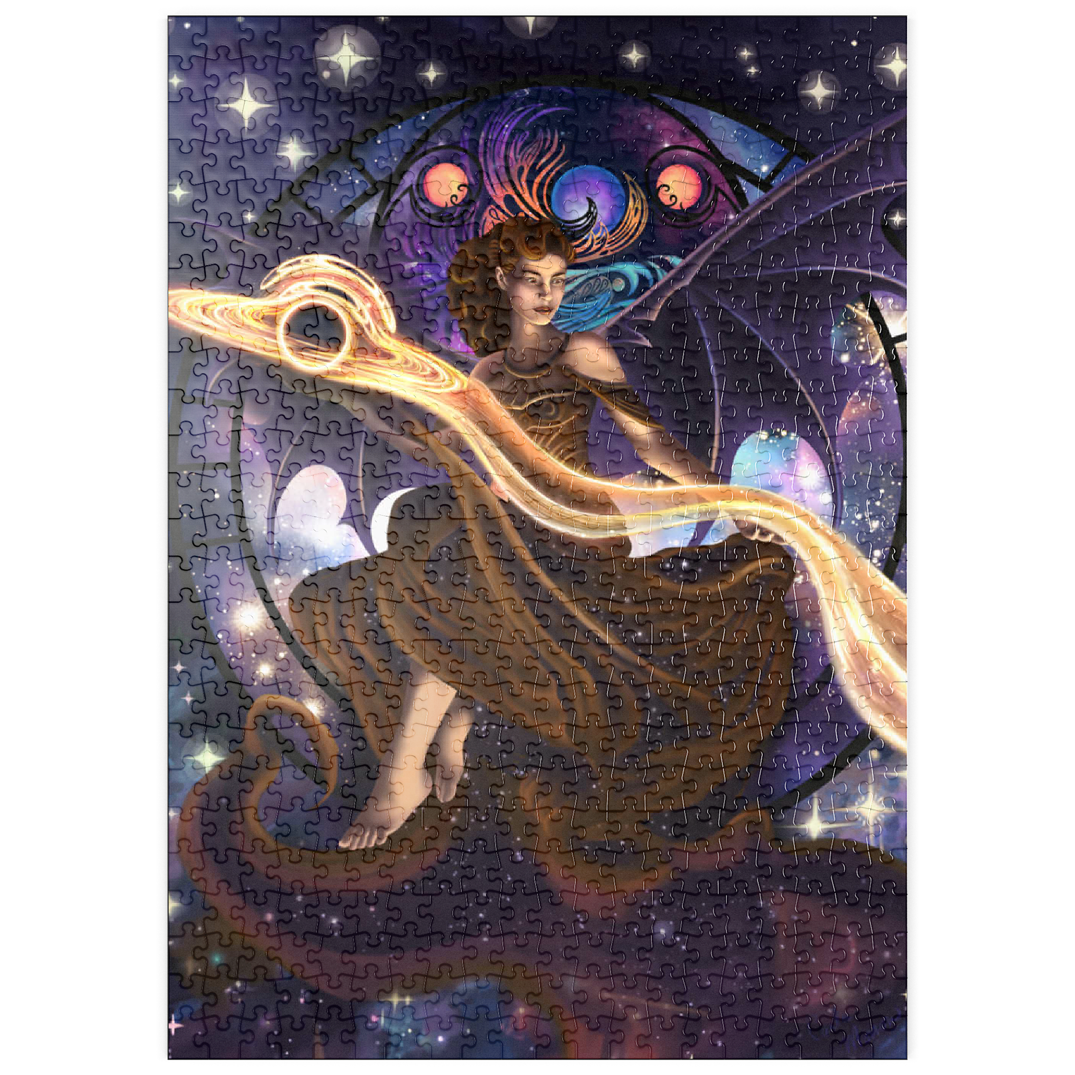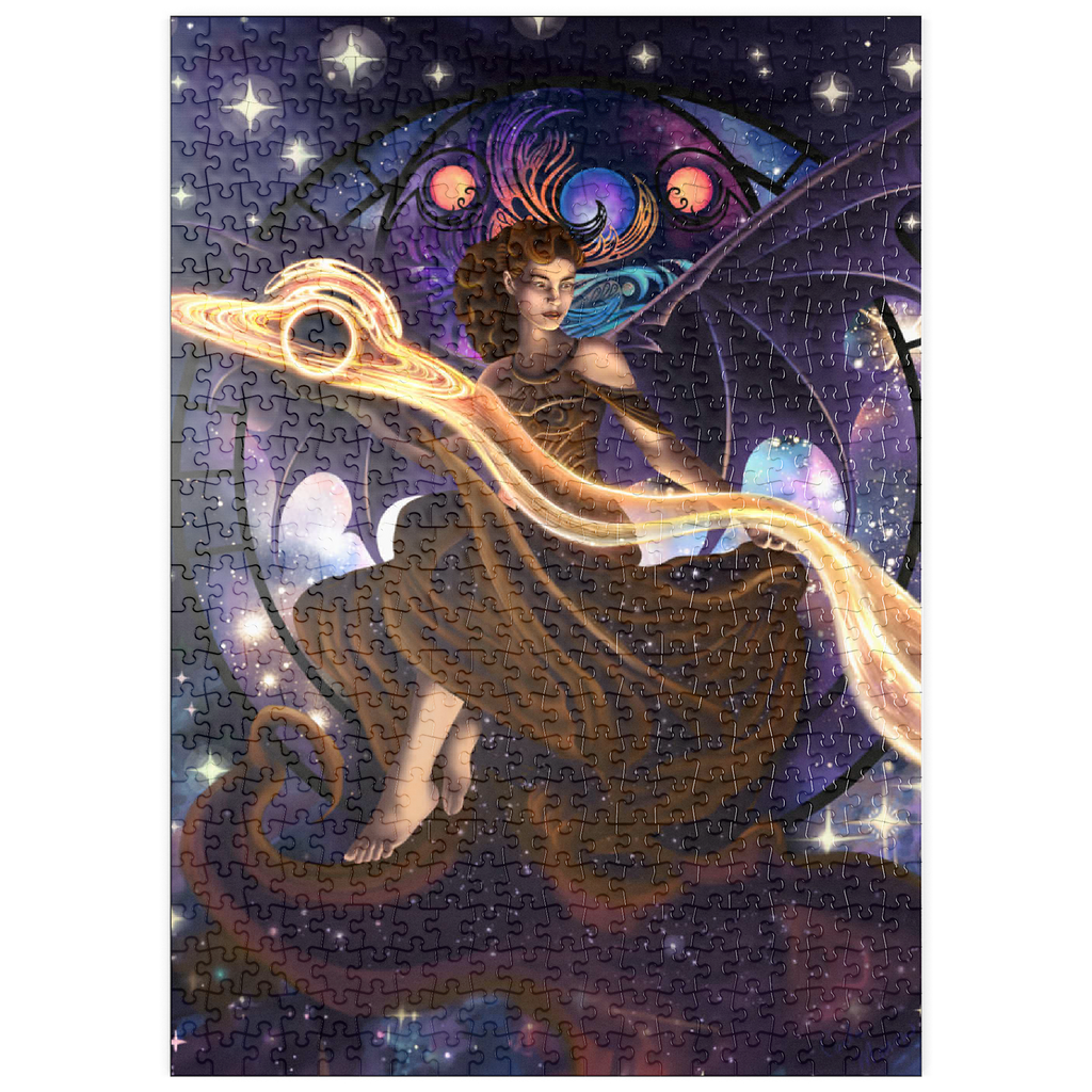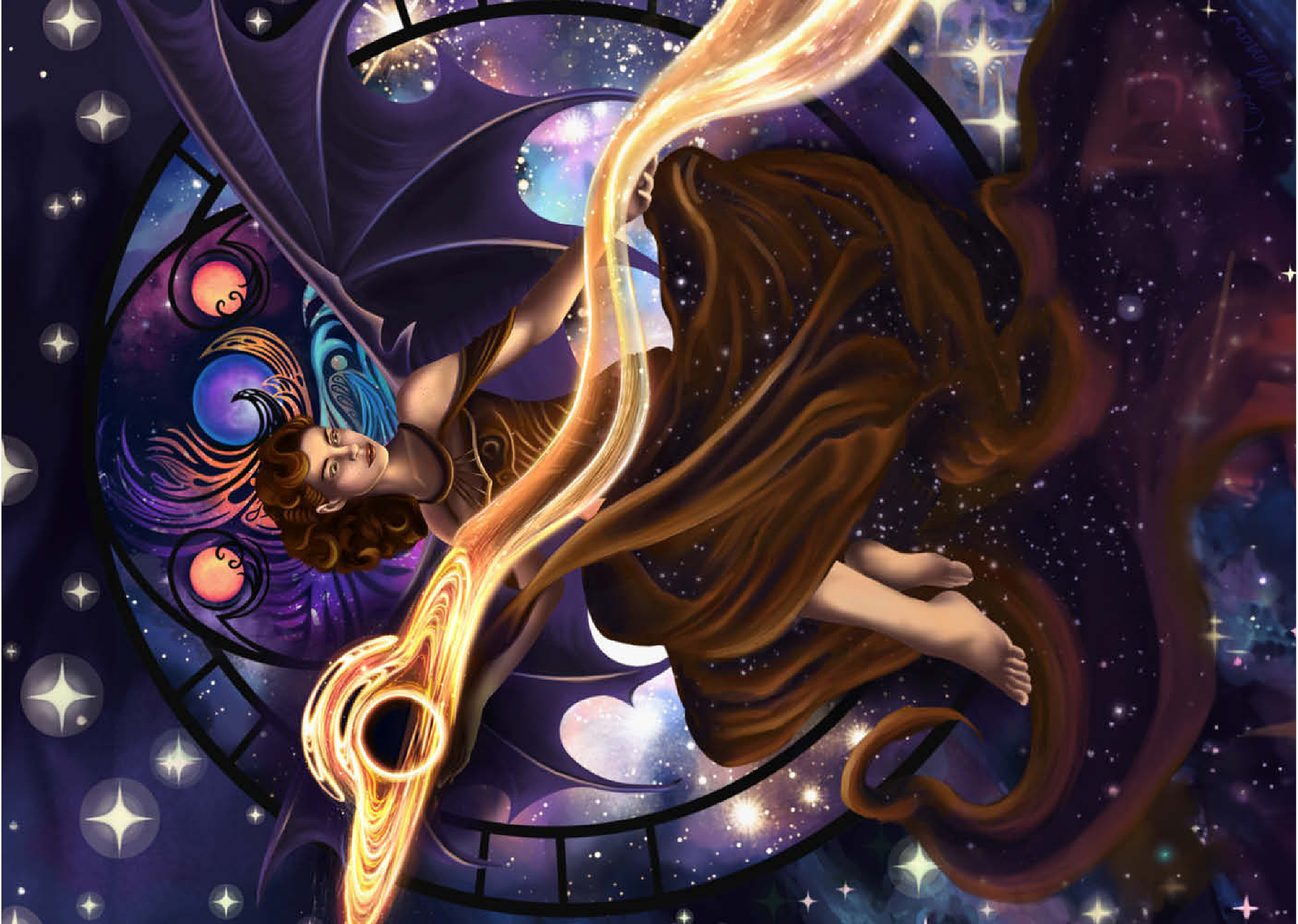 Void, dieses faszinierende Gemälde zeigt eine himmlische Gestalt, die in einer kosmischen Traumlandschaft sitzt, umgeben von wirbelnden Galaxien und strahlenden Sternen. Ihr fließendes dunkles Kleid, das mit Sternenstaub übersät ist, verschmilzt nahtlos mit der Leere um sie herum, während goldene Energielinien aus ihrer Hand spiralförmig aufsteigen und einen strahlenden Planetenring bilden. Hinter ihr erstrecken sich zwei fledermausartige Flügel vor einem Hintergrund, der an Buntglasfenster erinnert und mit abstrakten kosmischen Symbolen und satten, leuchtenden Farben gefüllt ist. Dieses mystische und kraftvolle Werk fängt die Erhabenheit des Universums und die geheimnisvolle Präsenz seiner Wächterin ein.