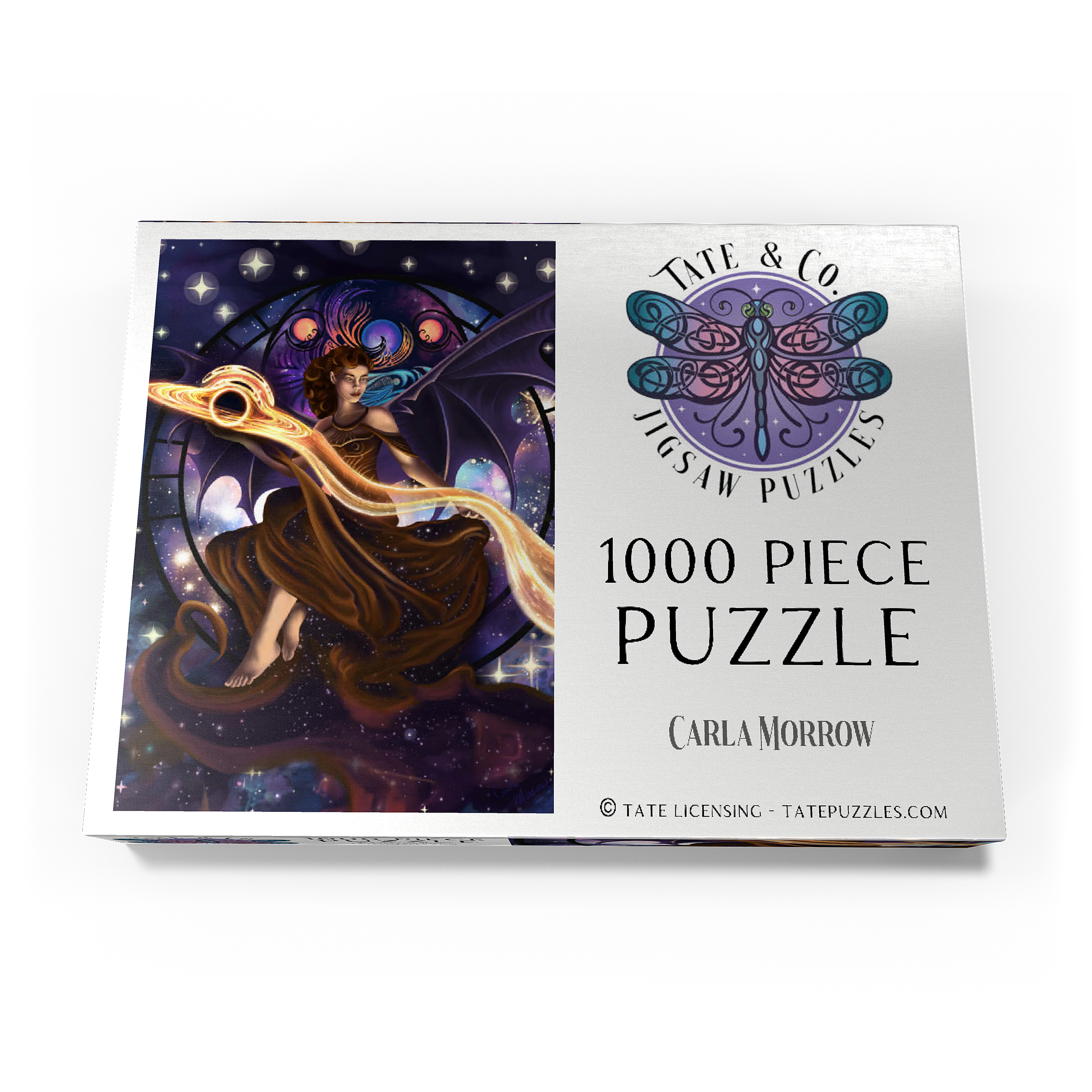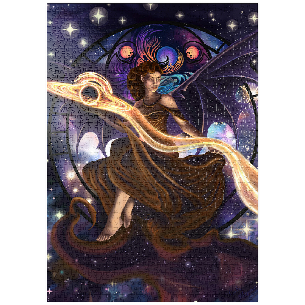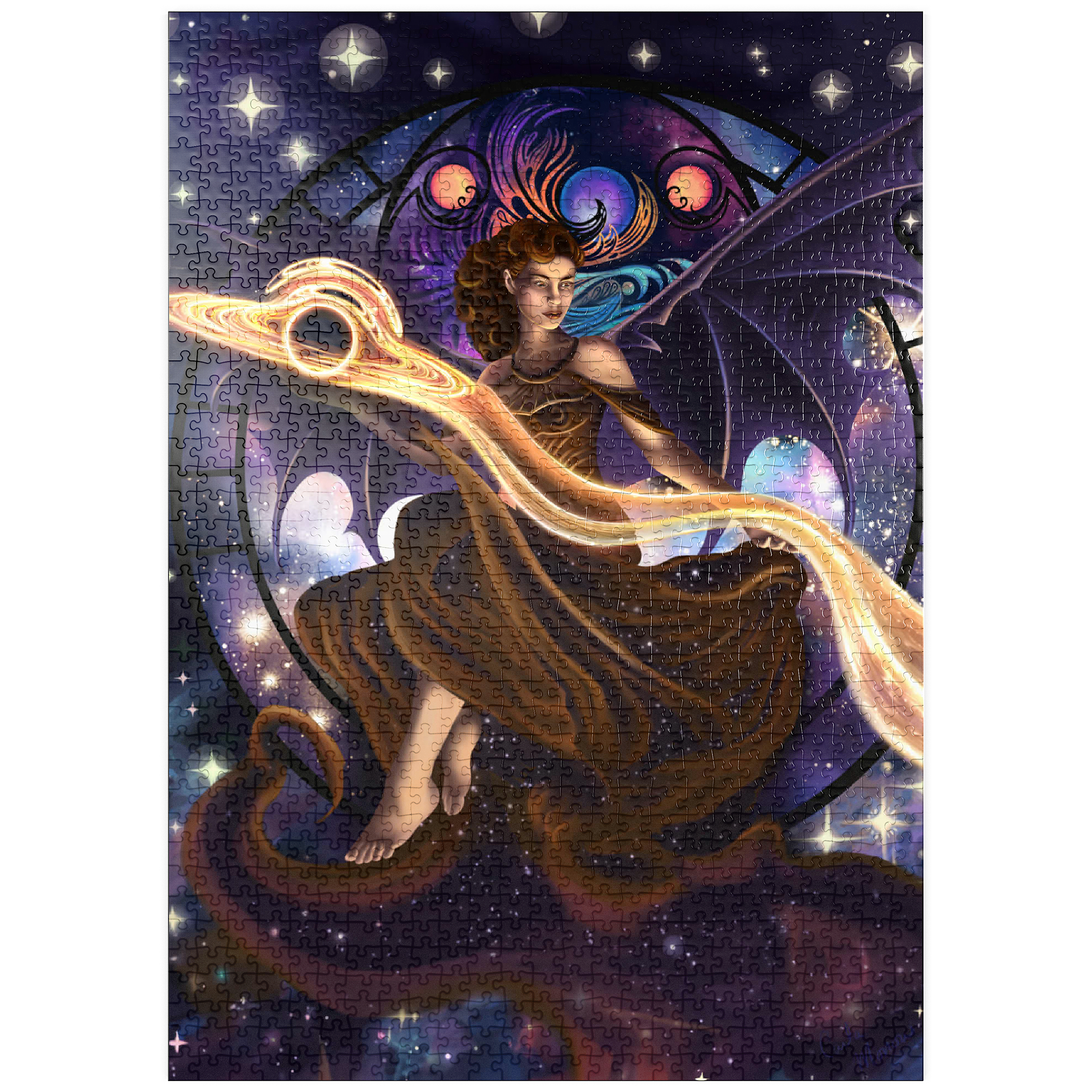 Void, dieses faszinierende Gemälde zeigt eine himmlische Gestalt, die in einer kosmischen Traumlandschaft sitzt, umgeben von wirbelnden Galaxien und strahlenden Sternen. Ihr fließendes dunkles Kleid, das mit Sternenstaub übersät ist, verschmilzt nahtlos mit der Leere um sie herum, während goldene Energielinien aus ihrer Hand spiralförmig aufsteigen und einen strahlenden Planetenring bilden. Hinter ihr erstrecken sich zwei fledermausartige Flügel vor einem Hintergrund, der an Buntglasfenster erinnert und mit abstrakten kosmischen Symbolen und satten, leuchtenden Farben gefüllt ist. Dieses mystische und kraftvolle Werk fängt die Erhabenheit des Universums und die geheimnisvolle Präsenz seiner Wächterin ein.