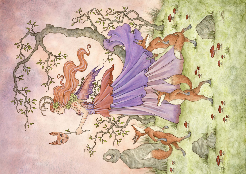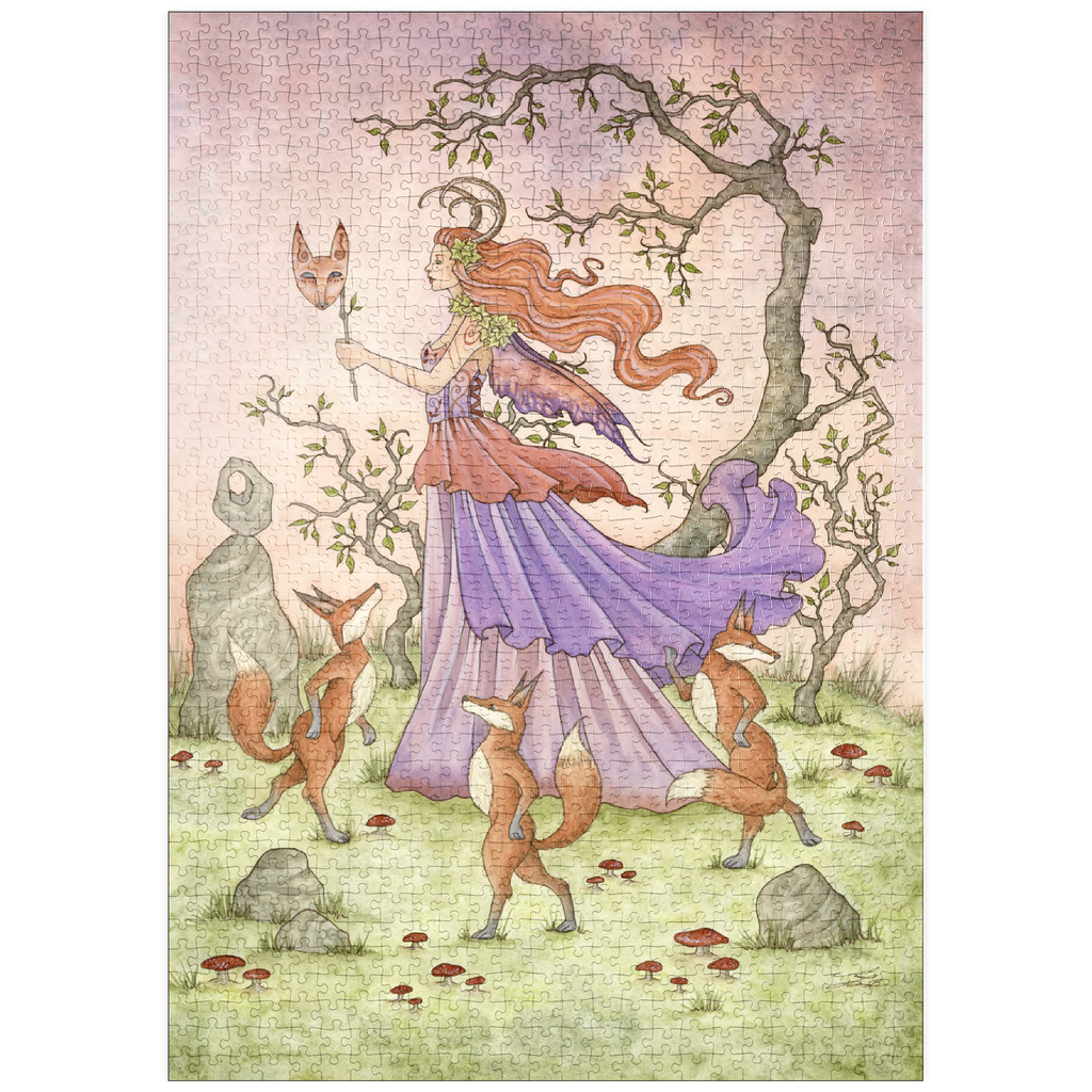 Fox Dance fängt eine königliche Fee mitten in einer Prozession ein, die eine Maske mit Fuchskopf hält, während sie von drei aufrecht stehenden, tanzenden Füchsen durch einen Ring aus Pilzen und Steinen begleitet wird. Gekleidet in fließende violette Gewänder und gekrönt mit Hörnern und Efeu, leitet sie ein spielerisches und verzaubertes Ritual in der Dämmerung des Waldes.