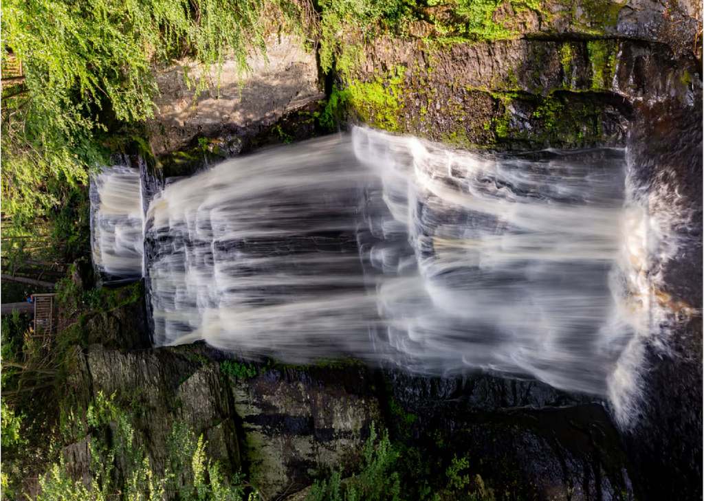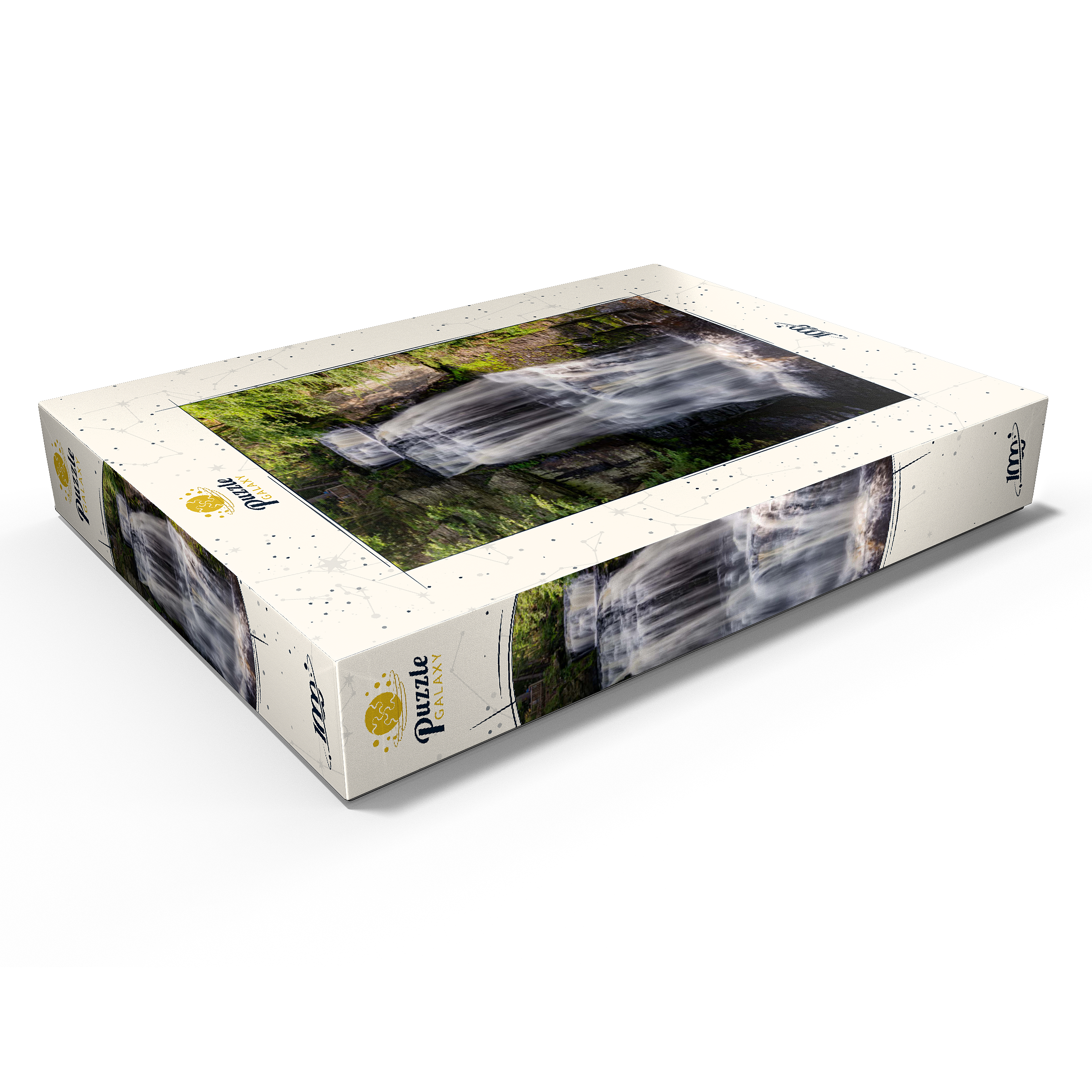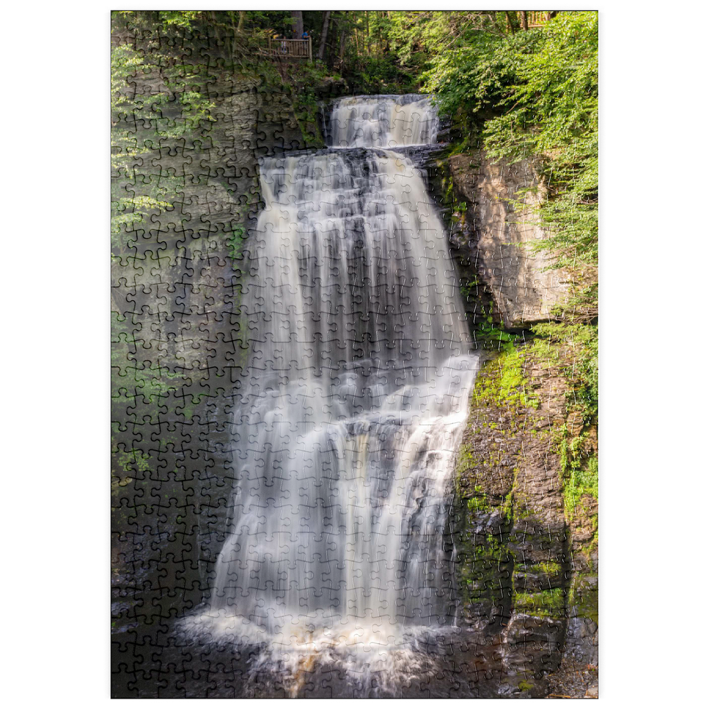Die Bushkill Falls in den Pocono Mountains im Nordosten von Pennsylvania werden oft als „Niagara von Pennsylvania” bezeichnet. Dieses atemberaubende vertikale Bild fängt einen der Hauptwasserfälle in seiner ganzen natürlichen Pracht ein, wie er sich über geschichtete Felswände, umgeben von üppig grünen Wäldern, ergießt. Der seidige Fluss des Wasserfalls, der mit einer langen Belichtungszeit eingefangen wurde, unterstreicht die ruhige und kraftvolle Schönheit dieses beliebten Naturdenkmals. Umgeben von moosbedeckten Klippen und üppigen Wäldern sind die Bushkill Falls ein beliebtes Ziel für Wanderer, Fotografen und Naturliebhaber. Die hölzernen Aussichtsplattformen bieten ideale Aussichtspunkte, um die Pracht der Wasserfälle zu genießen. Ob im Frühling bei der Schneeschmelze oder im Sommer bei voller Blüte – diese Szene spiegelt den zeitlosen Charme der Naturlandschaften Pennsylvanias wider.