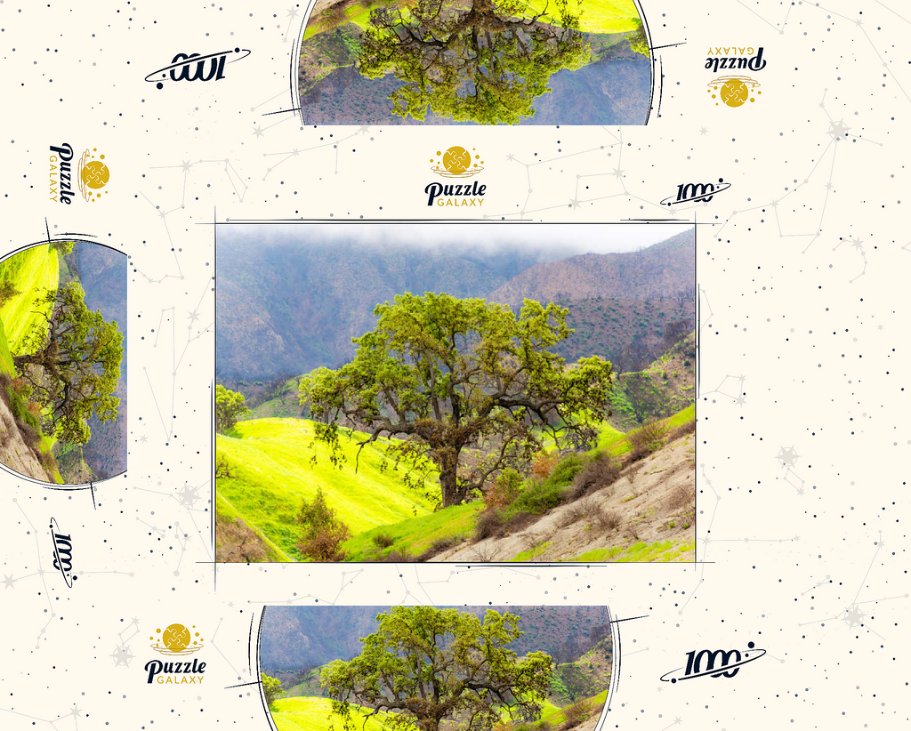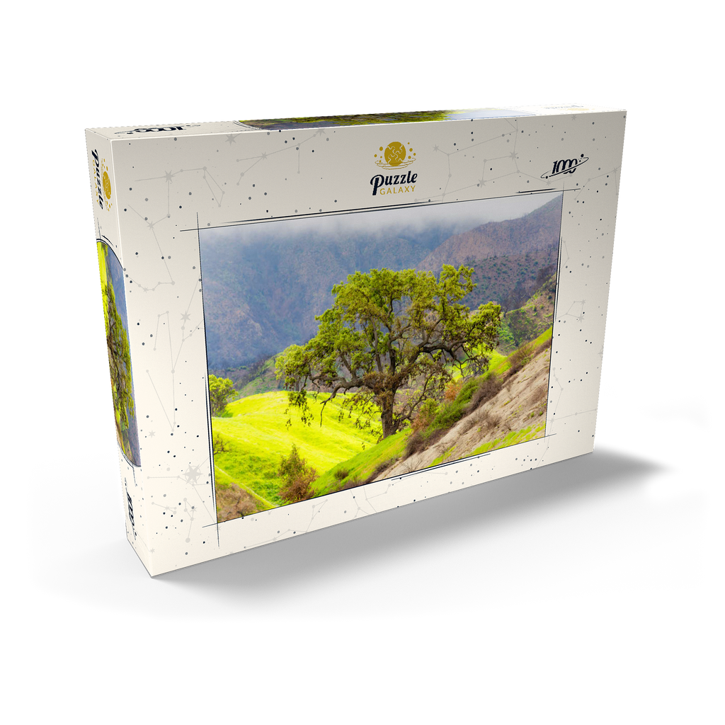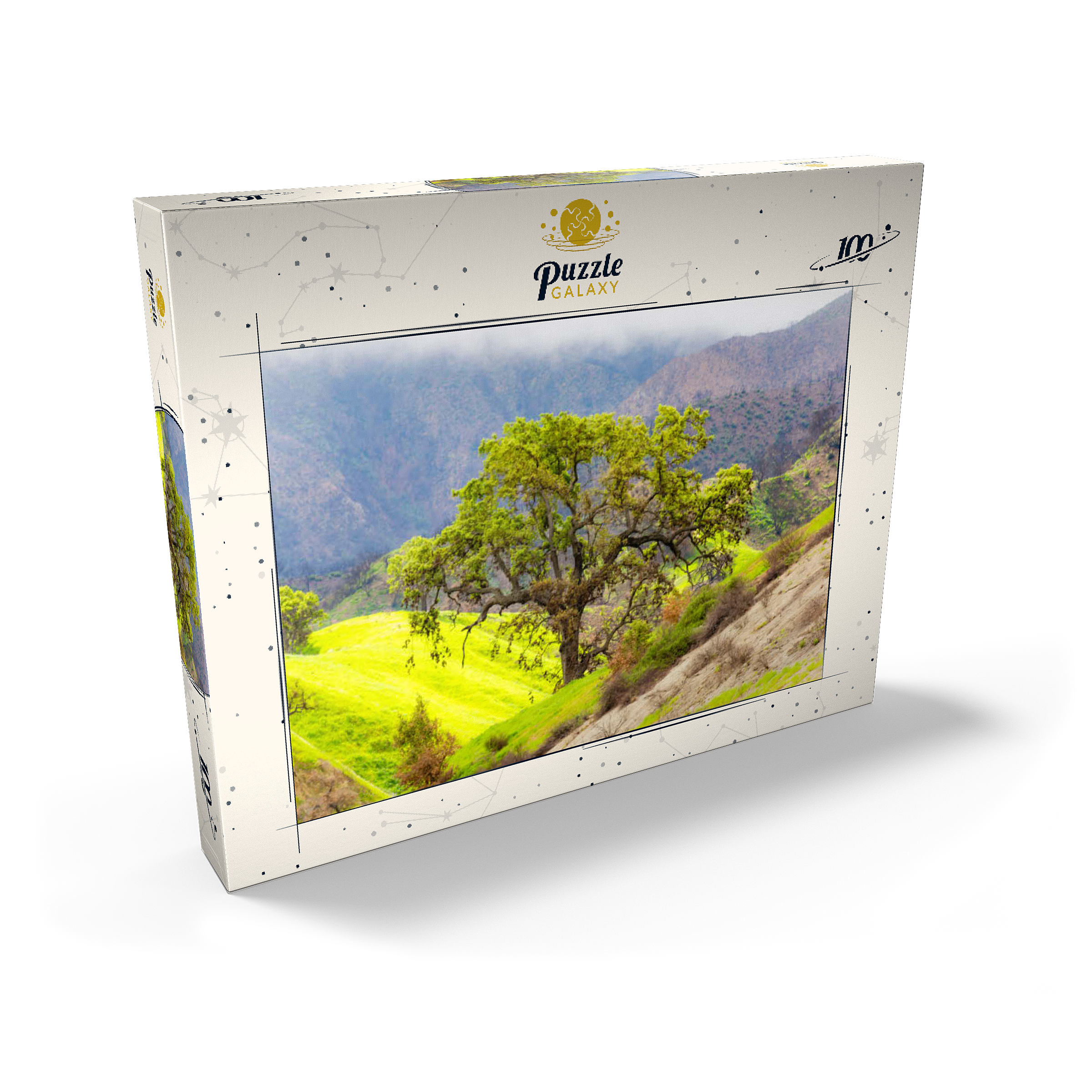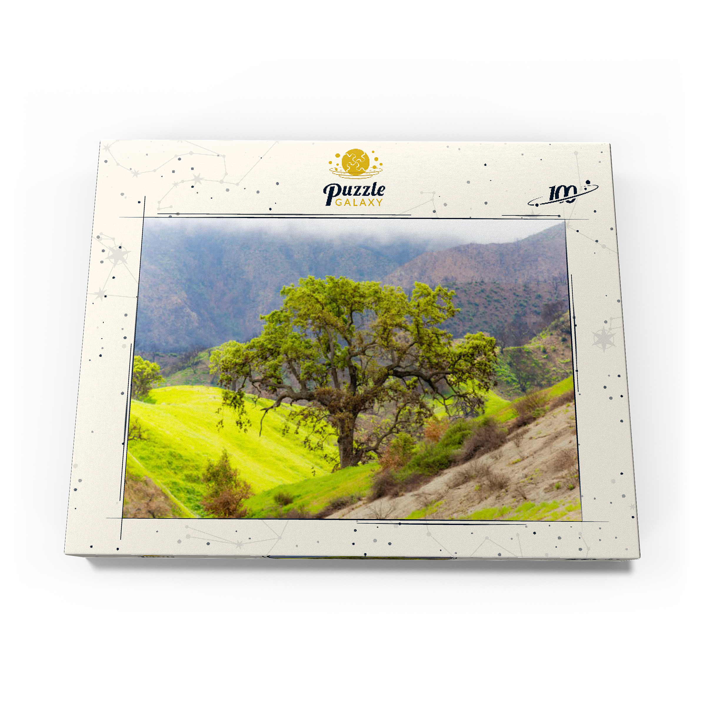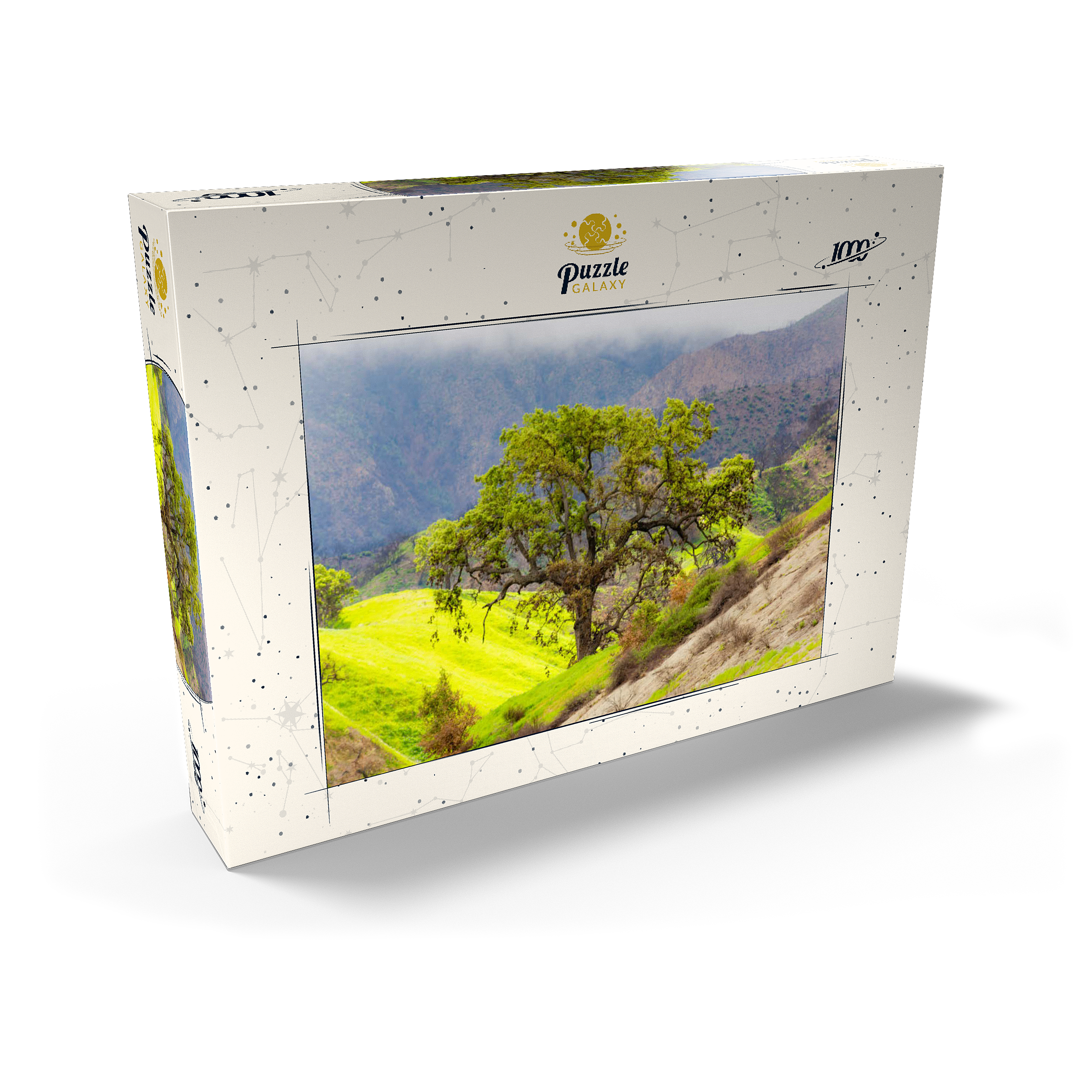 Eine majestätische kalifornische Eiche steht stolz inmitten sanfter grüner Hügel und zeigt die lebendige Schönheit des Frühlings im Golden State. Das helle, frische Gras bedeckt die Landschaft und bildet einen lebhaften Kontrast zu den verwitterten, braunen Bergen im Hintergrund und den nebelverhangenen Bergkämmen. Die weit ausladenden Äste der Eiche, die voller neu sprießender Blätter sind, stehen für Widerstandsfähigkeit und das Wiedererwachen des Lebens auf dem Land. Diese ruhige und natürliche Szene ist charakteristisch für die Central Coast und die Täler im Landesinneren Kaliforniens nach den saisonalen Regenfällen. Dieses Bild ist ideal für Naturliebhaber und alle, die die ruhige Schönheit des amerikanischen Westens schätzen, und unterstreicht die Vielfalt und Fotogenität der Landschaft Kaliforniens.