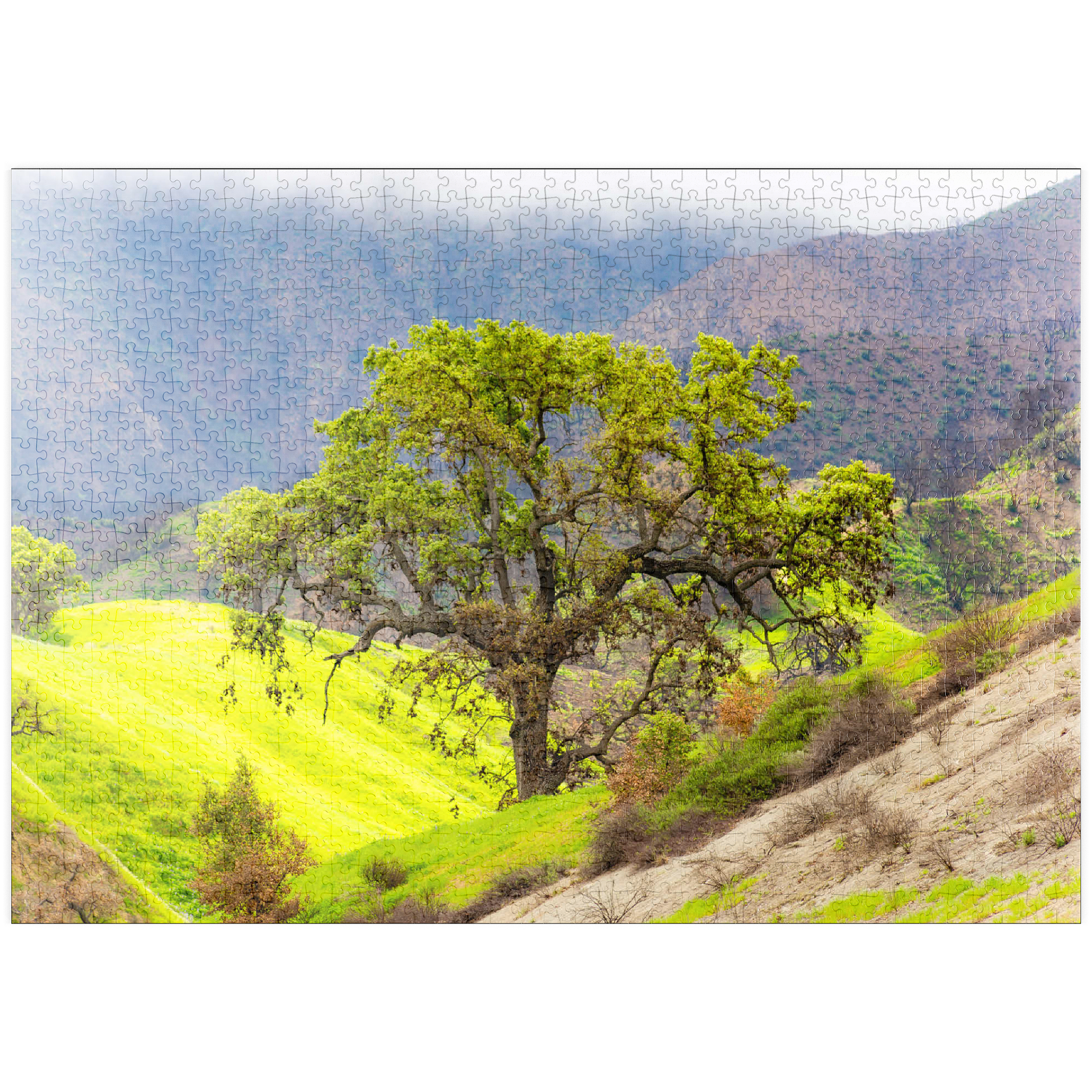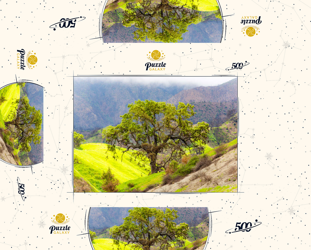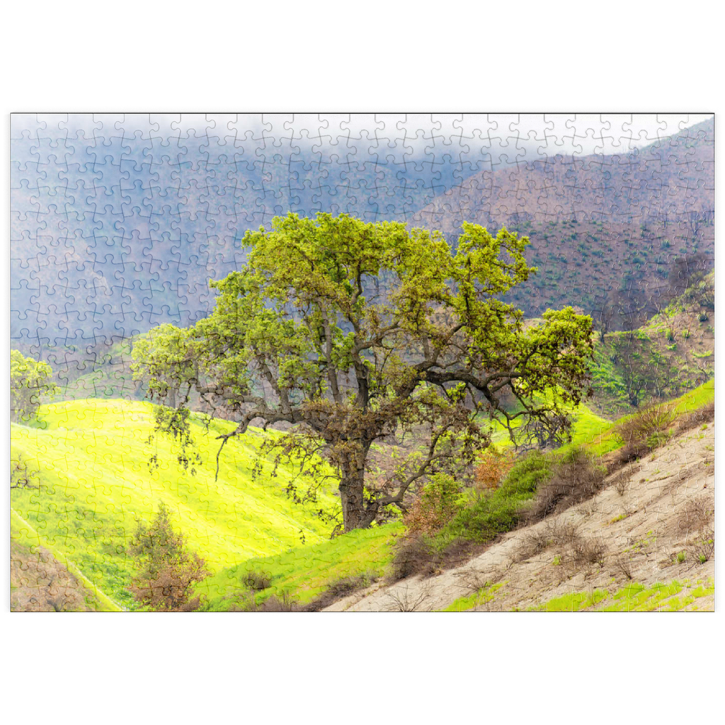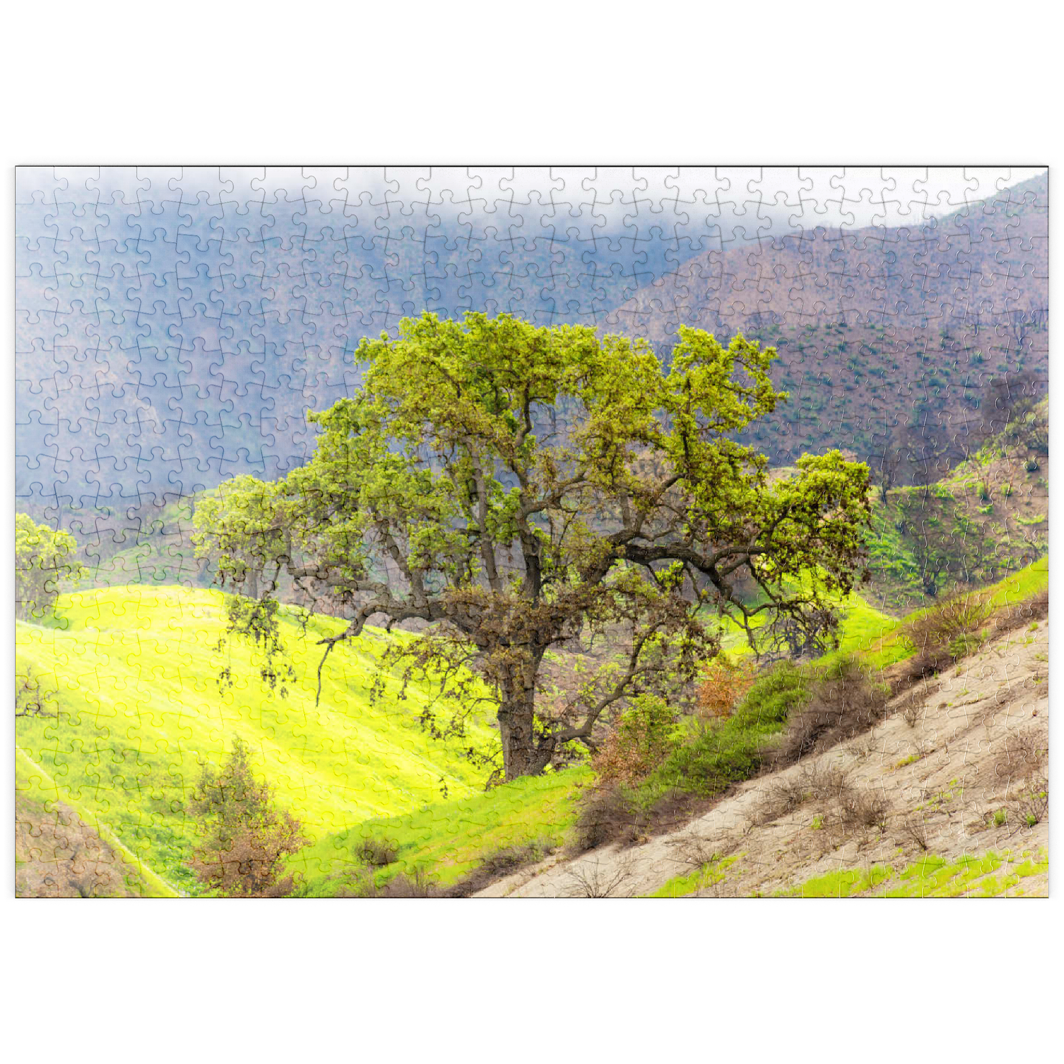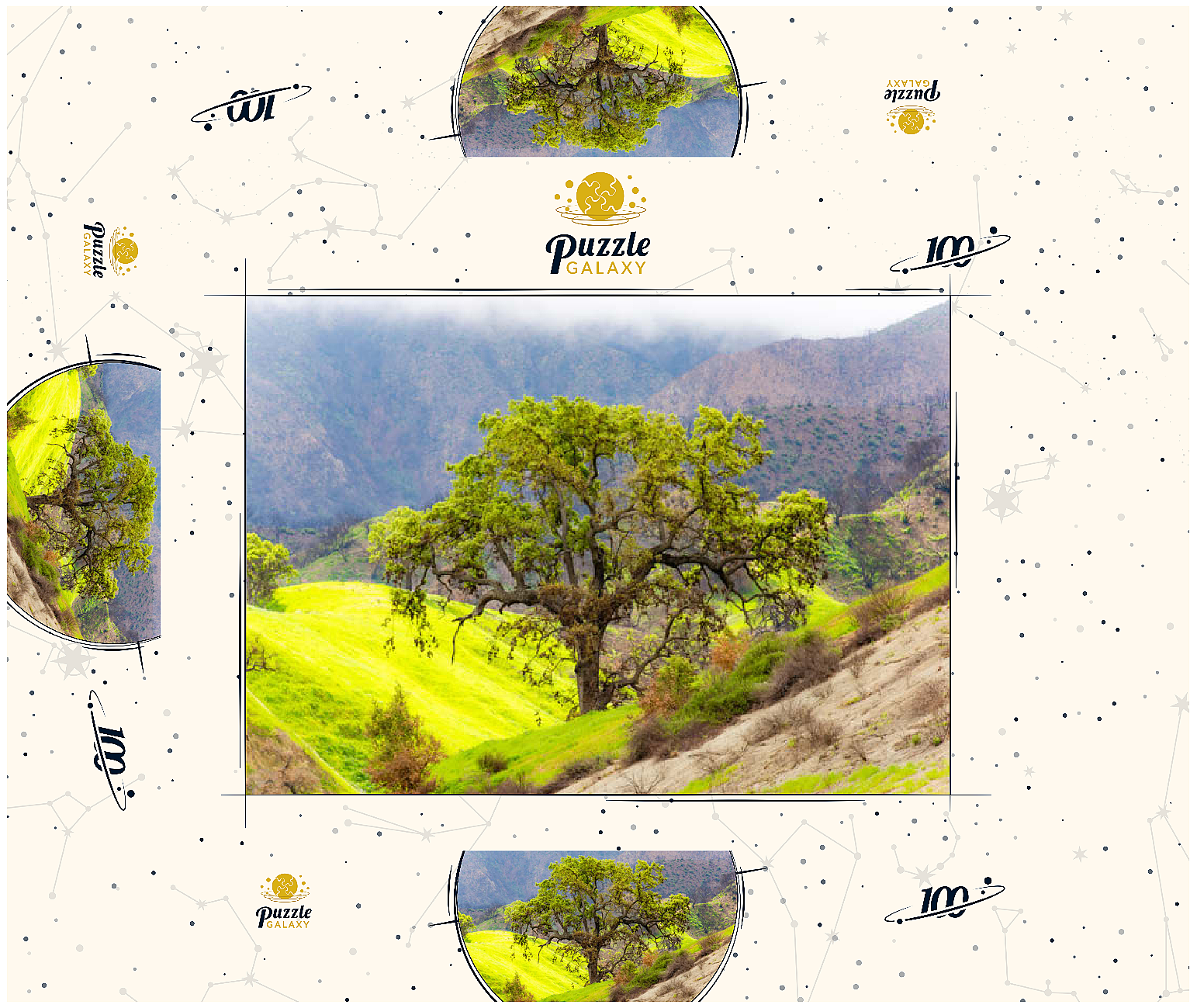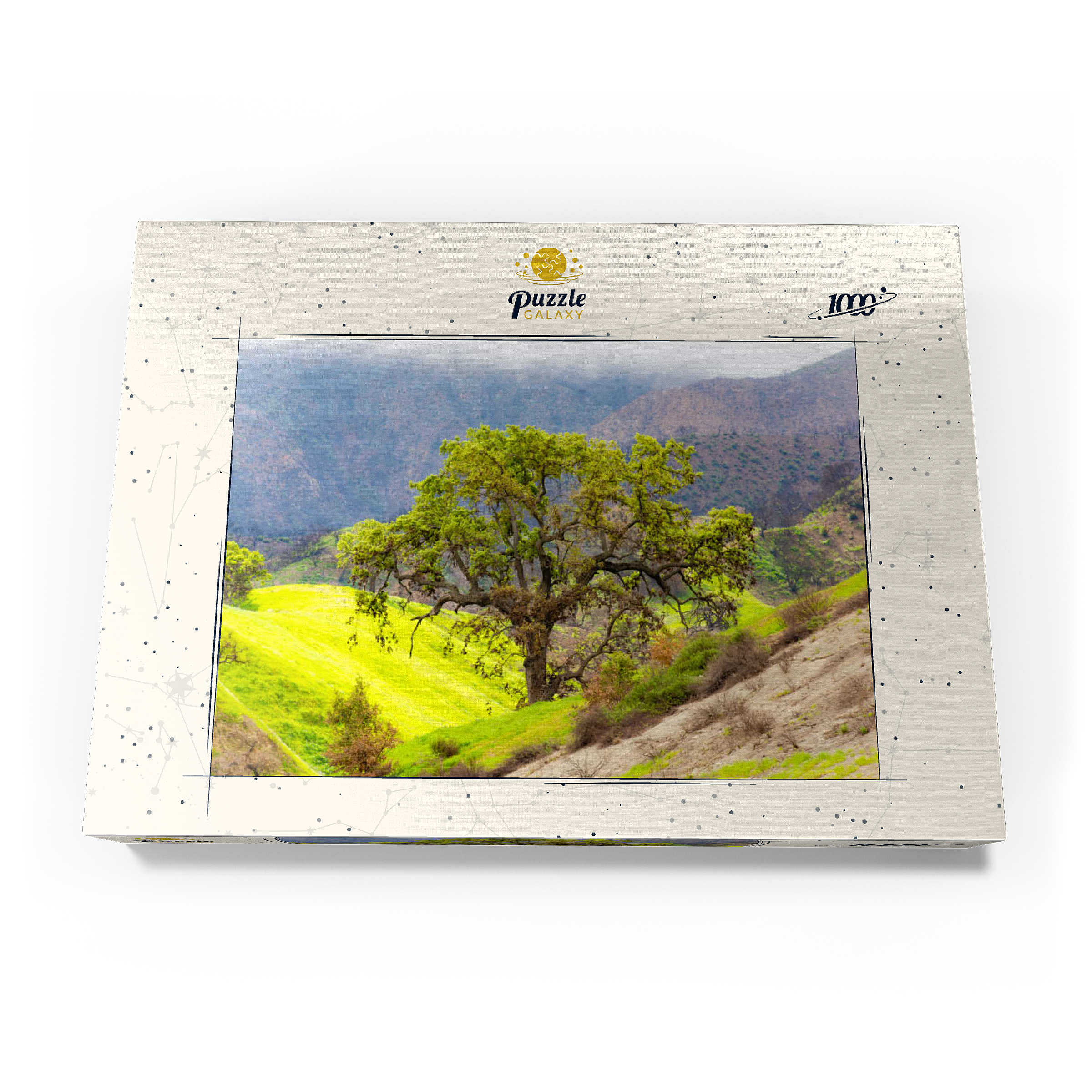 Eine majestätische kalifornische Eiche steht stolz inmitten sanfter grüner Hügel und zeigt die lebendige Schönheit des Frühlings im Golden State. Das helle, frische Gras bedeckt die Landschaft und bildet einen lebhaften Kontrast zu den verwitterten, braunen Bergen im Hintergrund und den nebelverhangenen Bergkämmen. Die weit ausladenden Äste der Eiche, die voller neu sprießender Blätter sind, stehen für Widerstandsfähigkeit und das Wiedererwachen des Lebens auf dem Land. Diese ruhige und natürliche Szene ist charakteristisch für die Central Coast und die Täler im Landesinneren Kaliforniens nach den saisonalen Regenfällen. Dieses Bild ist ideal für Naturliebhaber und alle, die die ruhige Schönheit des amerikanischen Westens schätzen, und unterstreicht die Vielfalt und Fotogenität der Landschaft Kaliforniens.