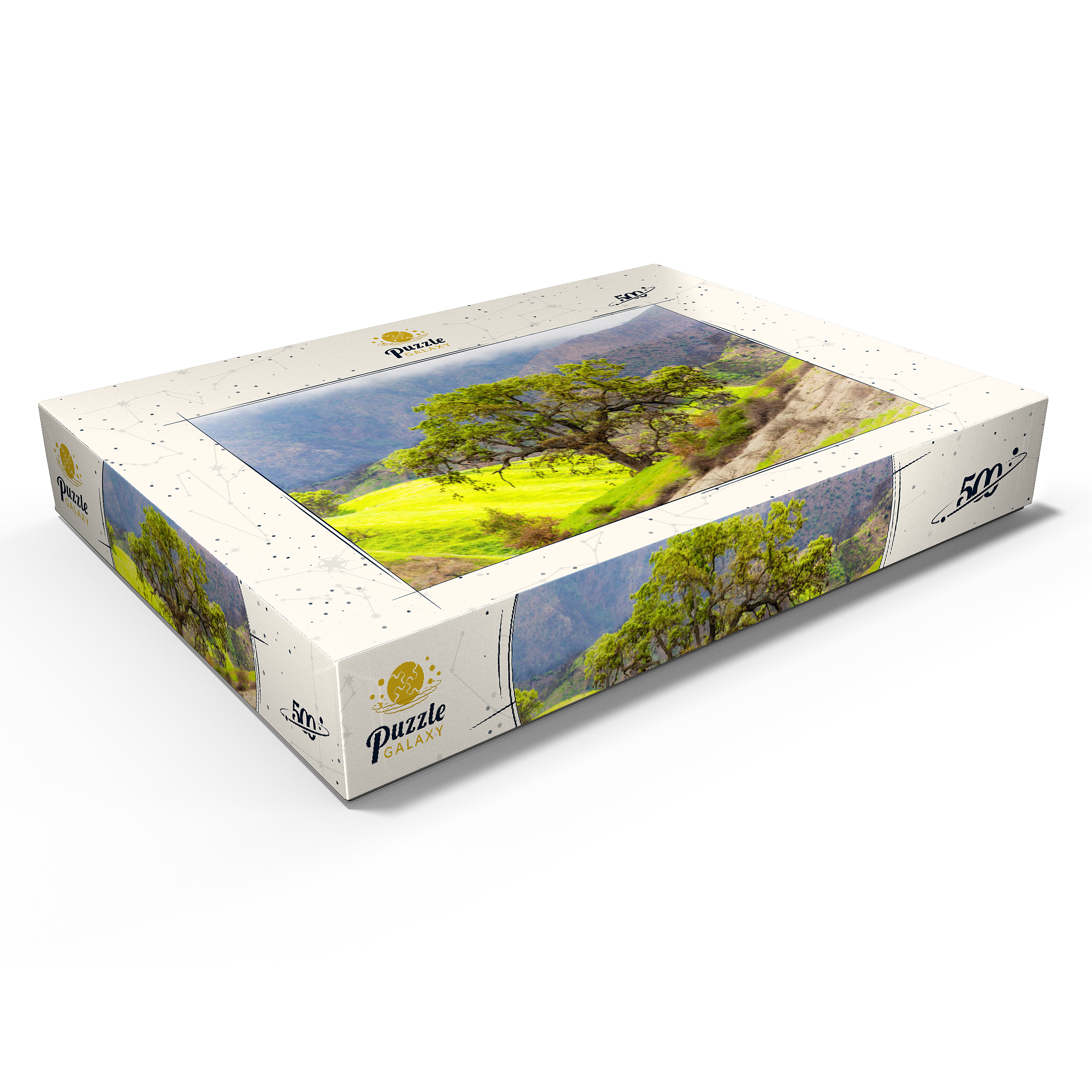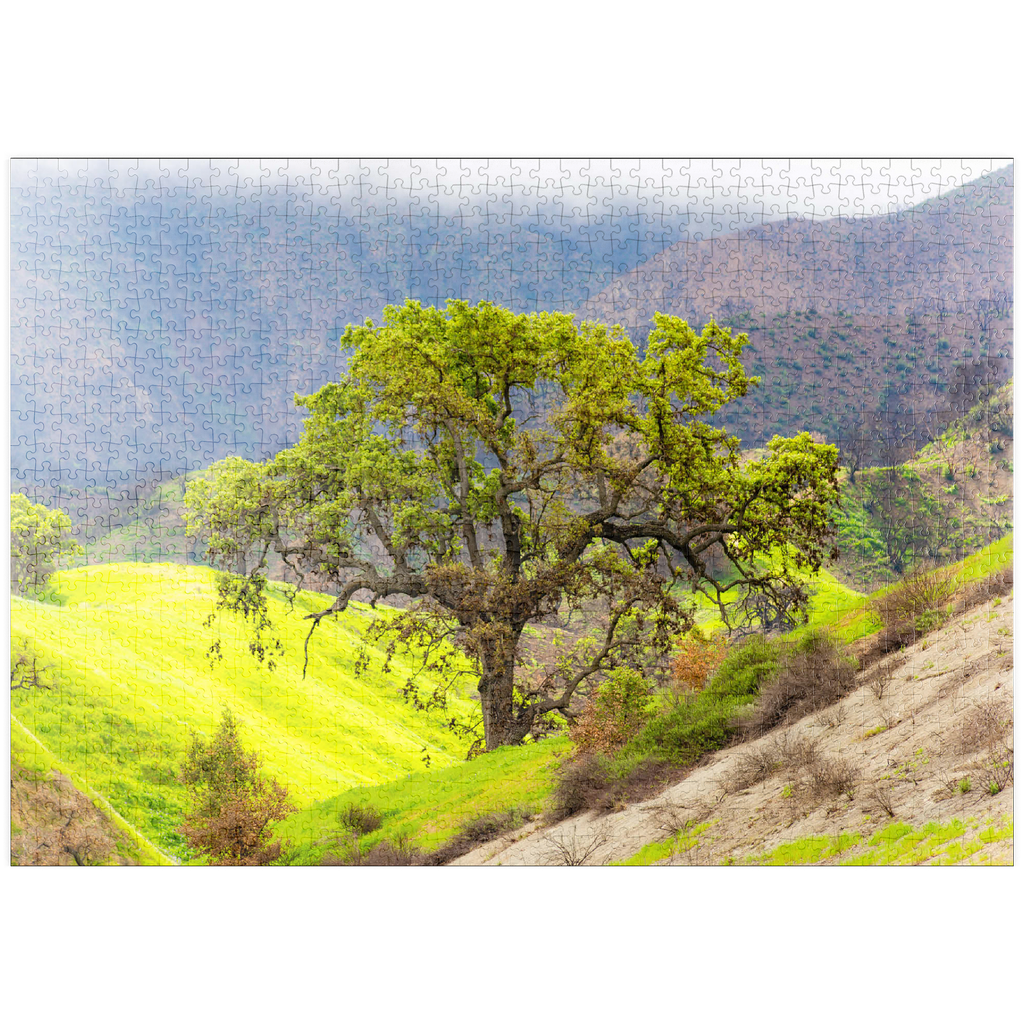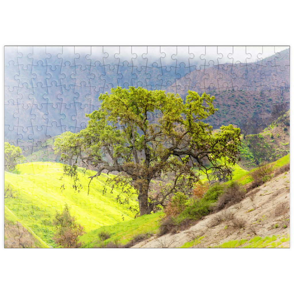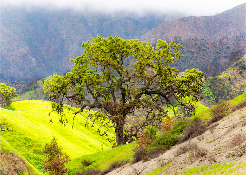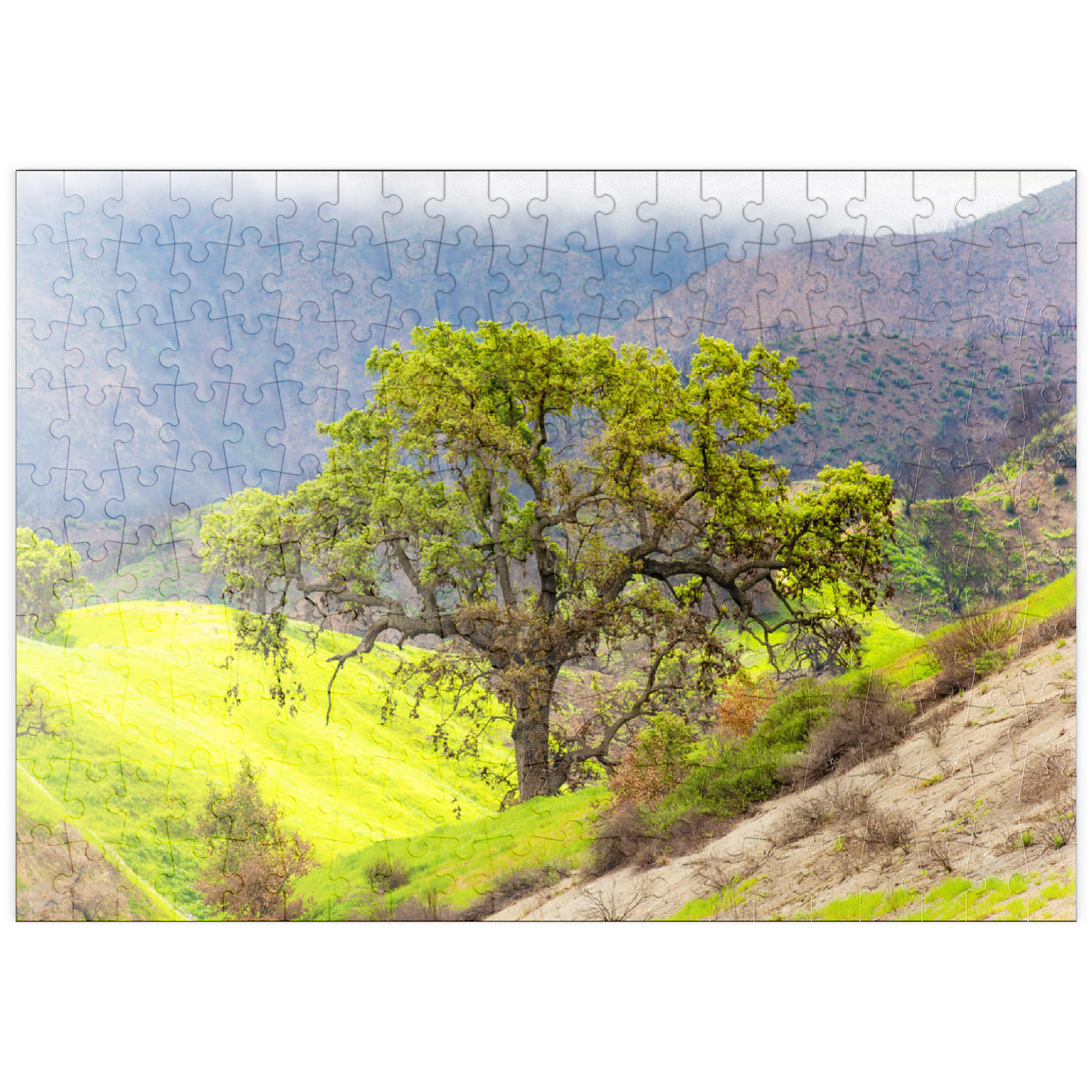 Eine majestätische kalifornische Eiche steht stolz inmitten sanfter grüner Hügel und zeigt die lebendige Schönheit des Frühlings im Golden State. Das helle, frische Gras bedeckt die Landschaft und bildet einen lebhaften Kontrast zu den verwitterten, braunen Bergen im Hintergrund und den nebelverhangenen Bergkämmen. Die weit ausladenden Äste der Eiche, die voller neu sprießender Blätter sind, stehen für Widerstandsfähigkeit und das Wiedererwachen des Lebens auf dem Land. Diese ruhige und natürliche Szene ist charakteristisch für die Central Coast und die Täler im Landesinneren Kaliforniens nach den saisonalen Regenfällen. Dieses Bild ist ideal für Naturliebhaber und alle, die die ruhige Schönheit des amerikanischen Westens schätzen, und unterstreicht die Vielfalt und Fotogenität der Landschaft Kaliforniens.
