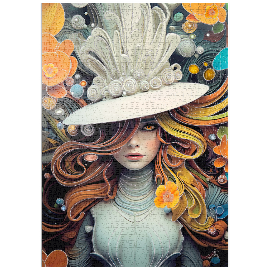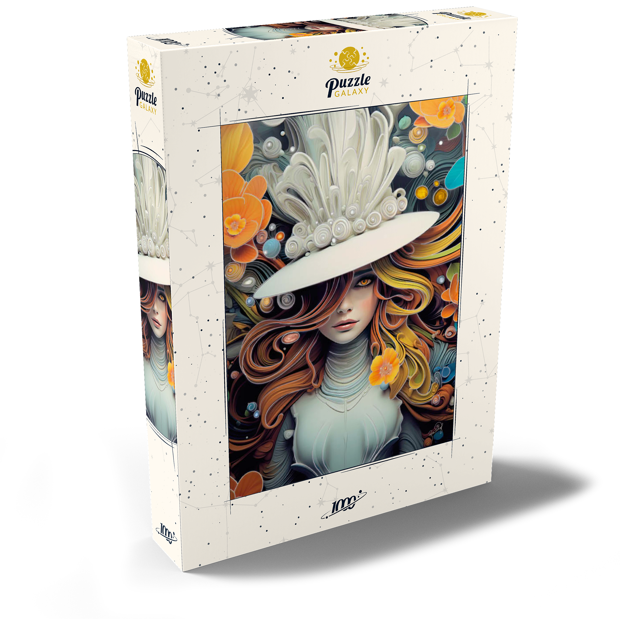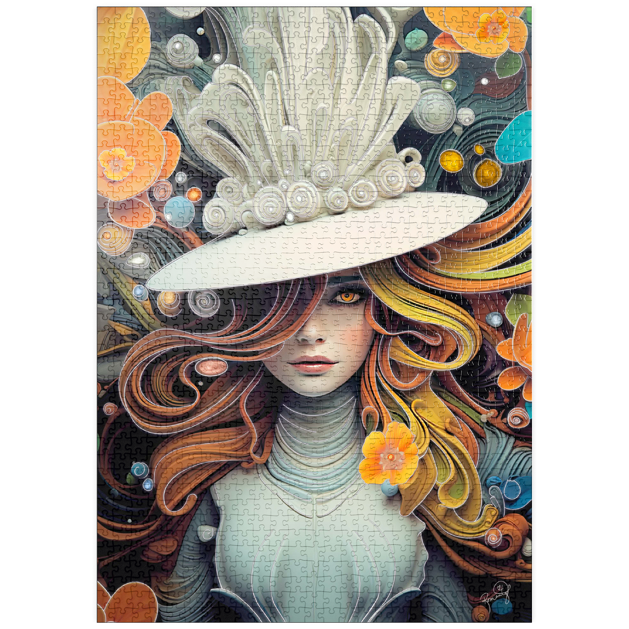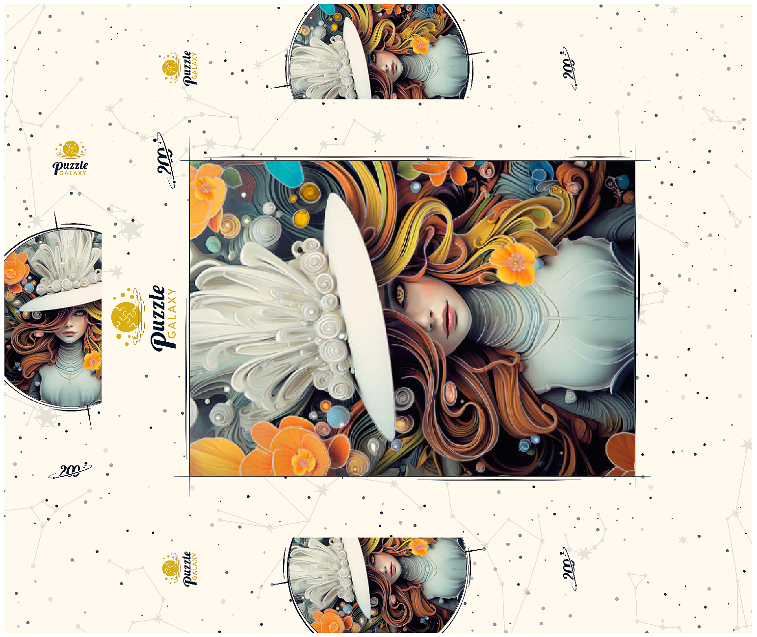 Ein bezauberndes digitales Kunstwerk einer geheimnisvollen Frau mit durchdringenden goldenen Augen, die teilweise von einem großen weißen Hut mit wirbelnden federartigen Elementen verdeckt sind. Ihre fließenden rotbraunen und goldenen Locken verschmelzen nahtlos mit floralen und abstrakten Motiven, die um sie herum wirbeln. Die Farbpalette umfasst satte Cremetöne, warme Gelbtöne und sanfte Orangetöne, die eine traumhafte, fantasievolle Ästhetik schaffen. Das Werk verbindet Eleganz und Surrealismus und ist damit ein auffälliges Bild, das Staunen und Raffinesse hervorruft.