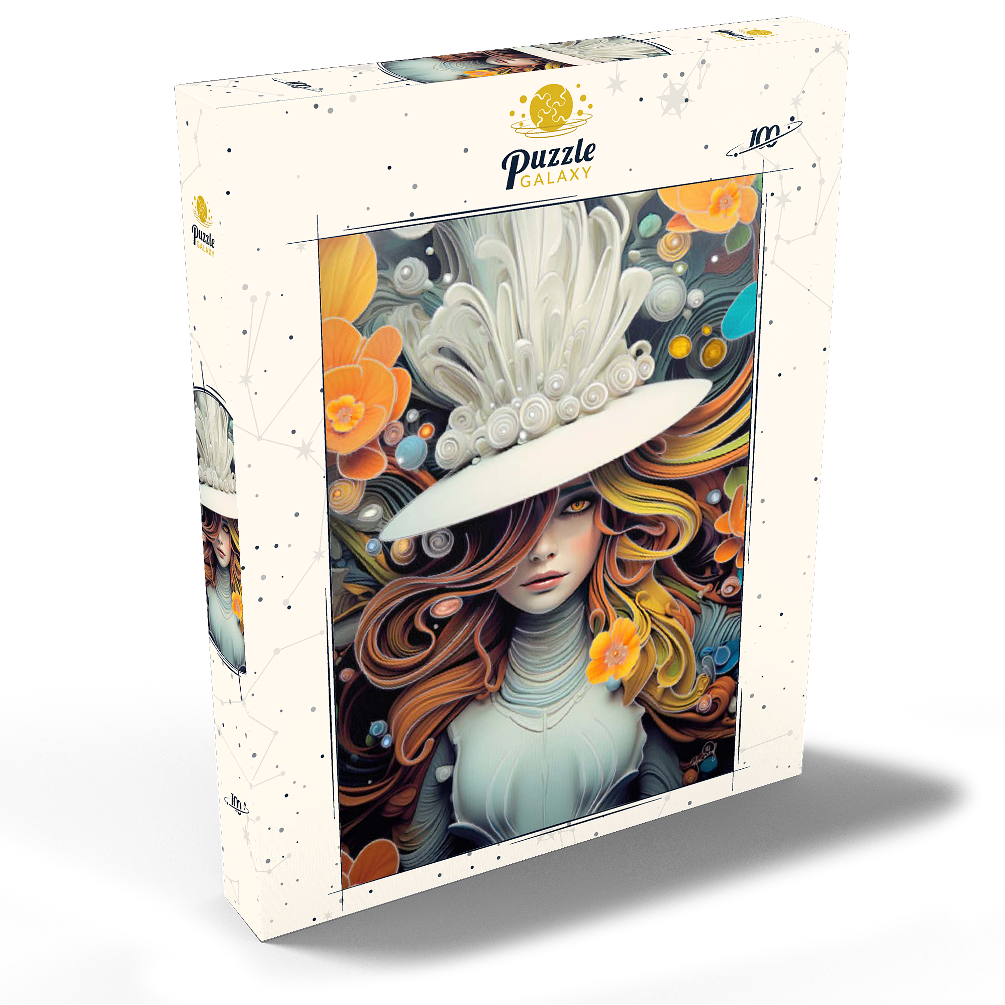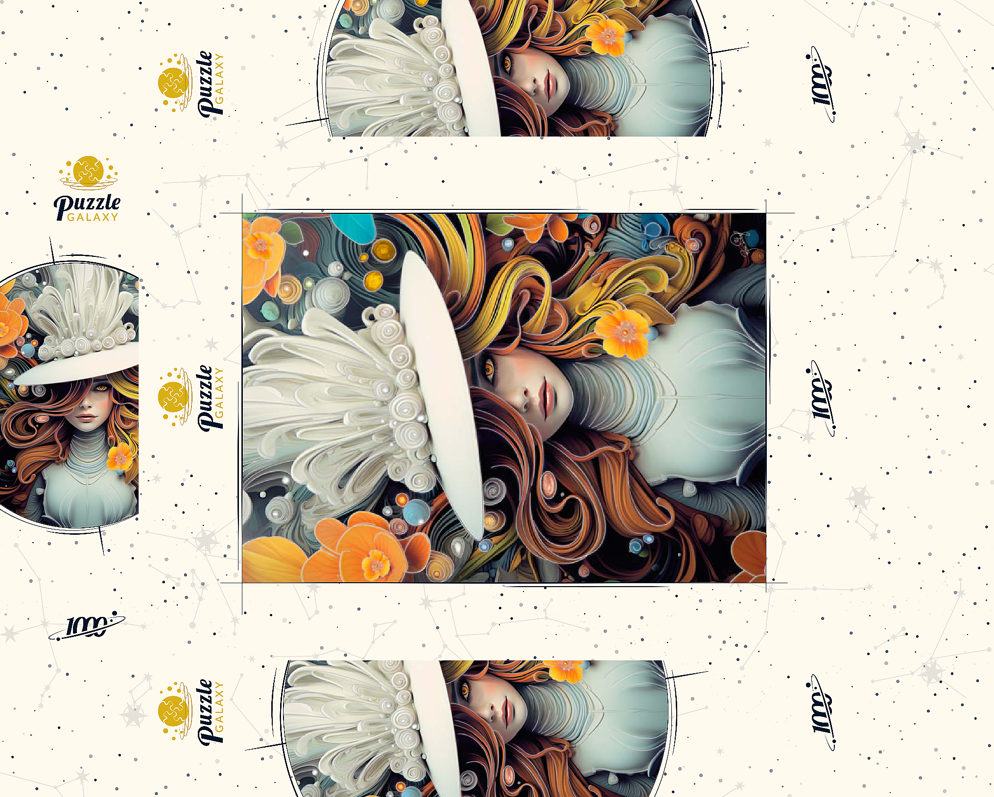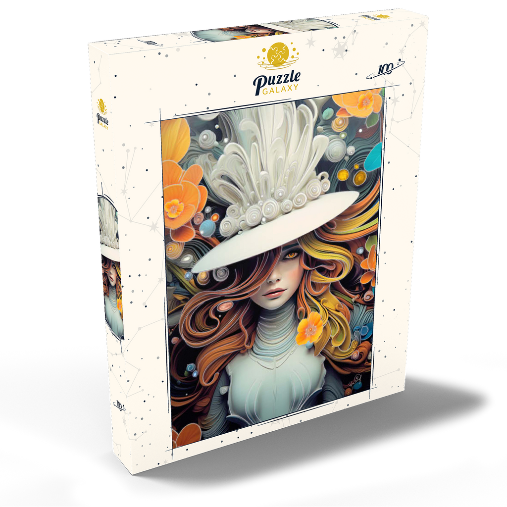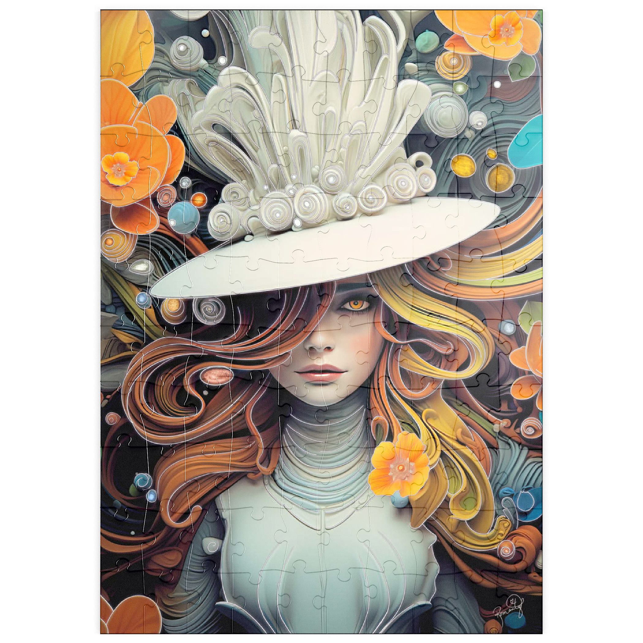 Ein bezauberndes digitales Kunstwerk einer geheimnisvollen Frau mit durchdringenden goldenen Augen, die teilweise von einem großen weißen Hut mit wirbelnden federartigen Elementen verdeckt sind. Ihre fließenden rotbraunen und goldenen Locken verschmelzen nahtlos mit floralen und abstrakten Motiven, die um sie herum wirbeln. Die Farbpalette umfasst satte Cremetöne, warme Gelbtöne und sanfte Orangetöne, die eine traumhafte, fantasievolle Ästhetik schaffen. Das Werk verbindet Eleganz und Surrealismus und ist damit ein auffälliges Bild, das Staunen und Raffinesse hervorruft.