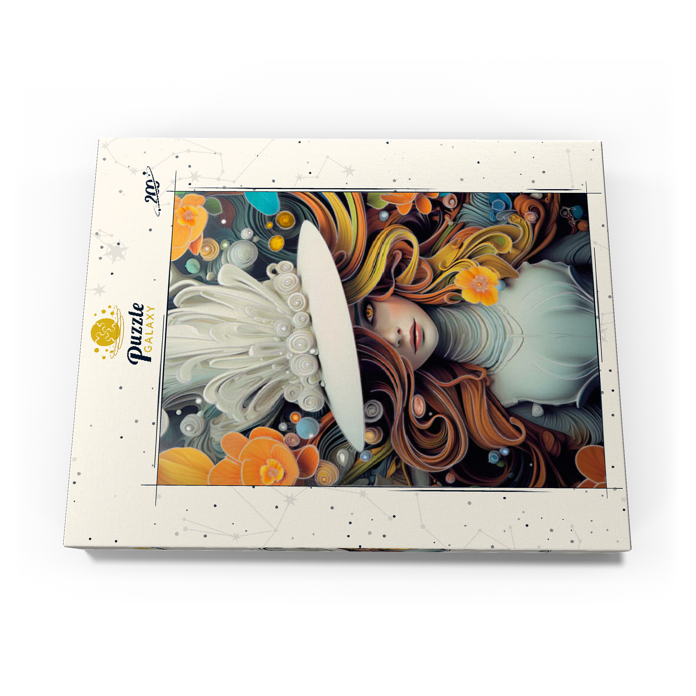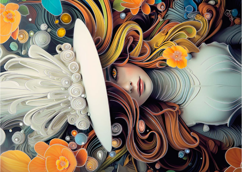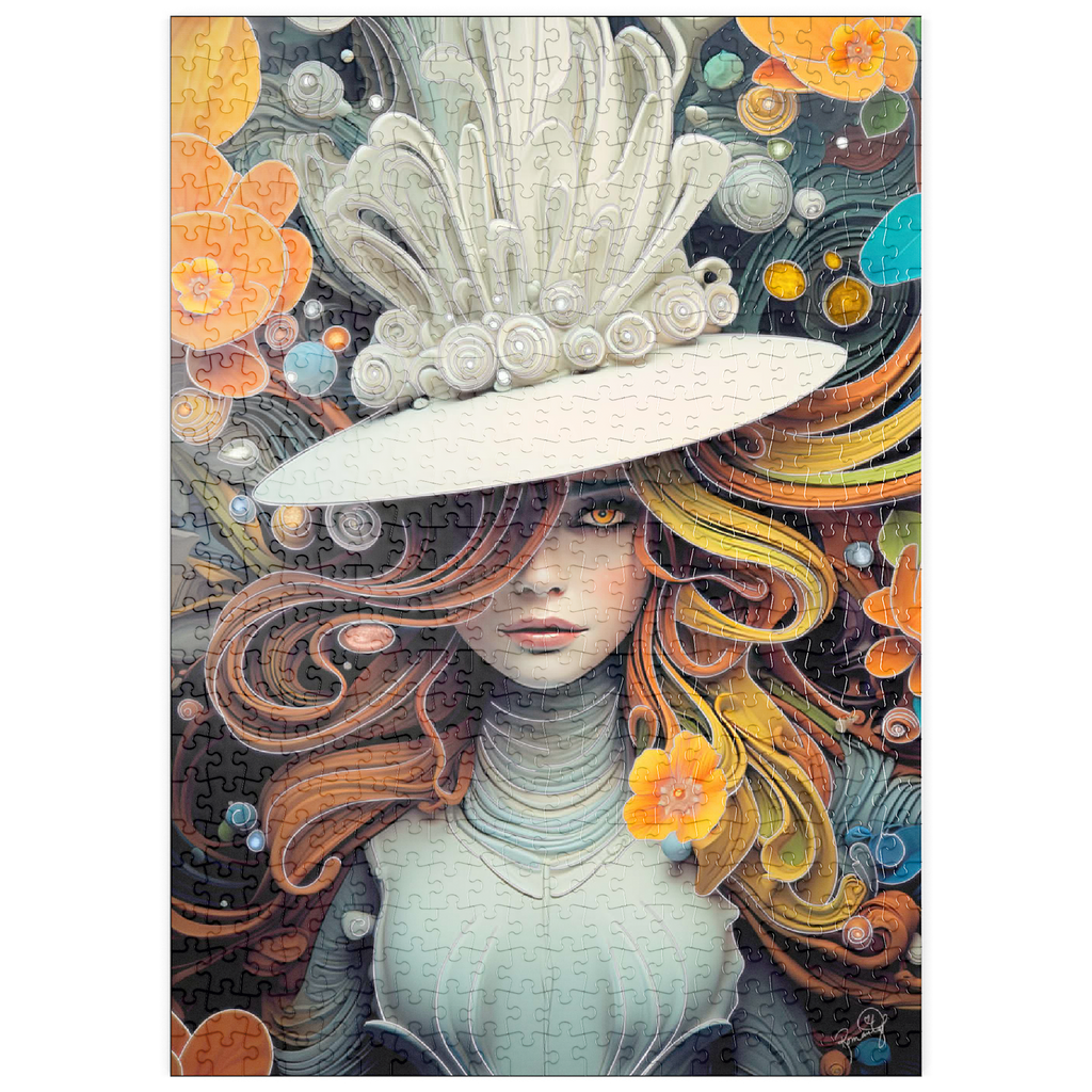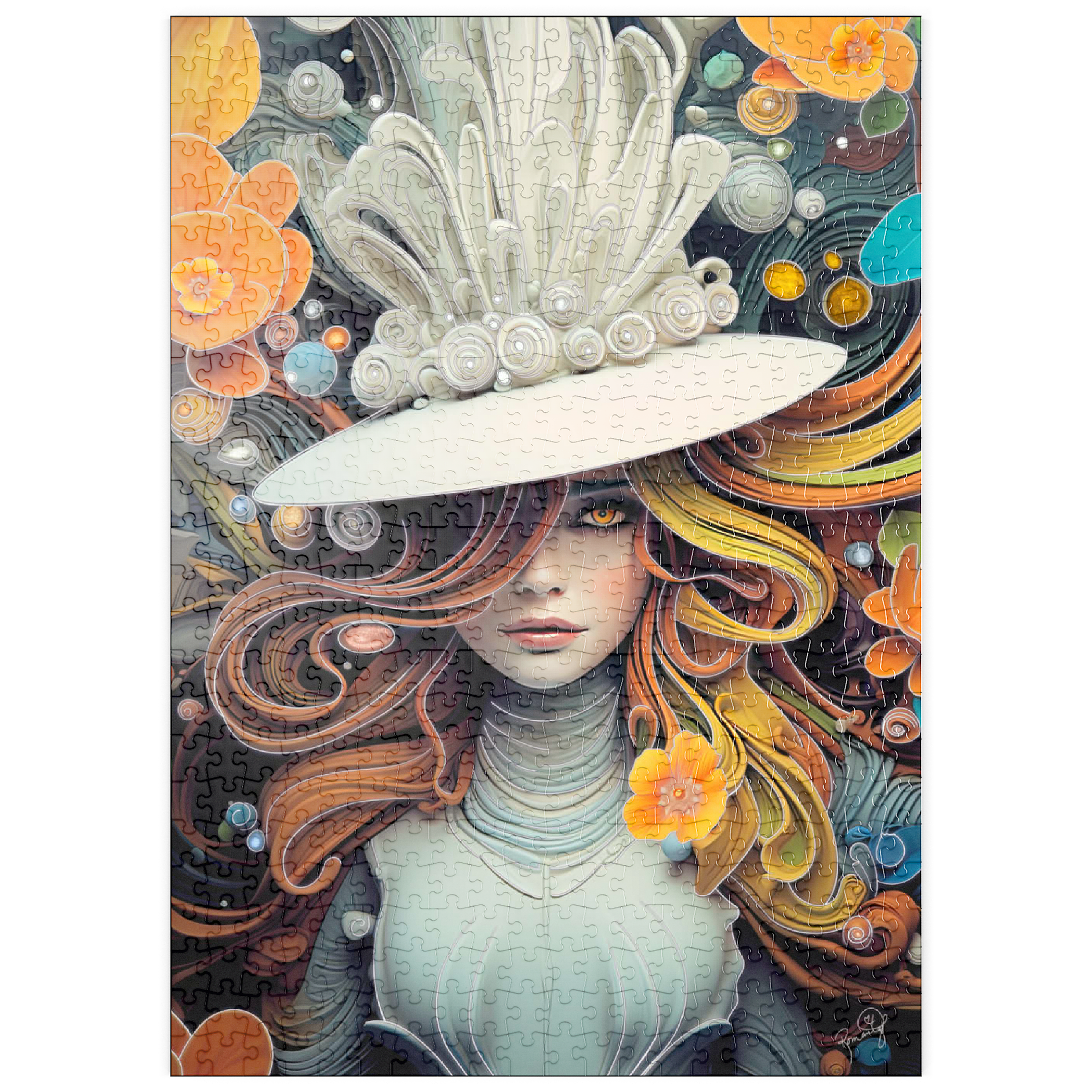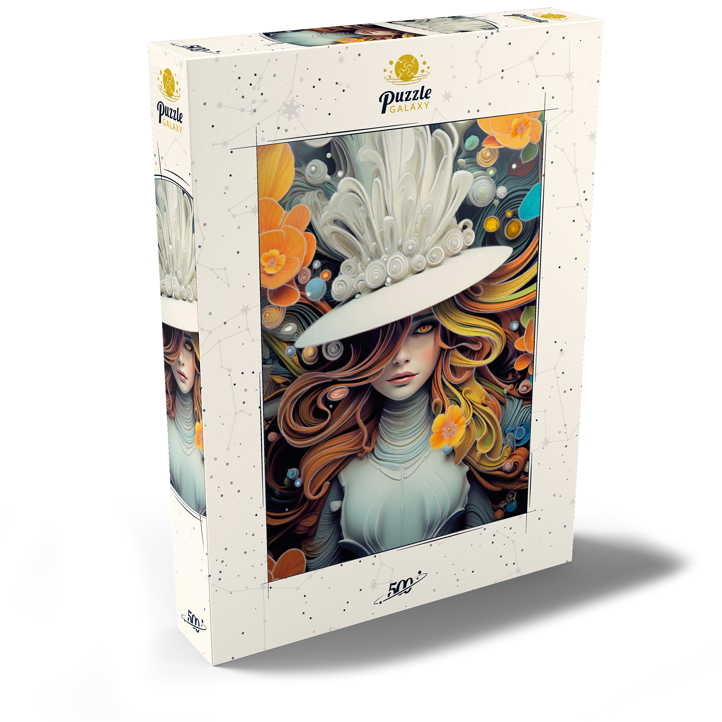 Ein bezauberndes digitales Kunstwerk einer geheimnisvollen Frau mit durchdringenden goldenen Augen, die teilweise von einem großen weißen Hut mit wirbelnden federartigen Elementen verdeckt sind. Ihre fließenden rotbraunen und goldenen Locken verschmelzen nahtlos mit floralen und abstrakten Motiven, die um sie herum wirbeln. Die Farbpalette umfasst satte Cremetöne, warme Gelbtöne und sanfte Orangetöne, die eine traumhafte, fantasievolle Ästhetik schaffen. Das Werk verbindet Eleganz und Surrealismus und ist damit ein auffälliges Bild, das Staunen und Raffinesse hervorruft.