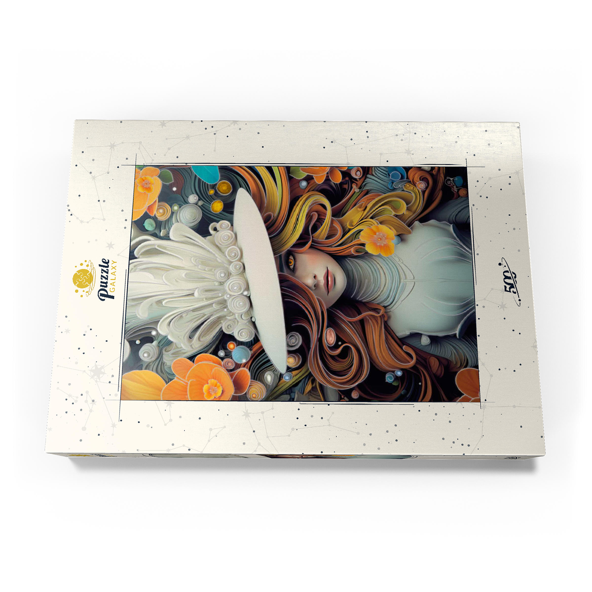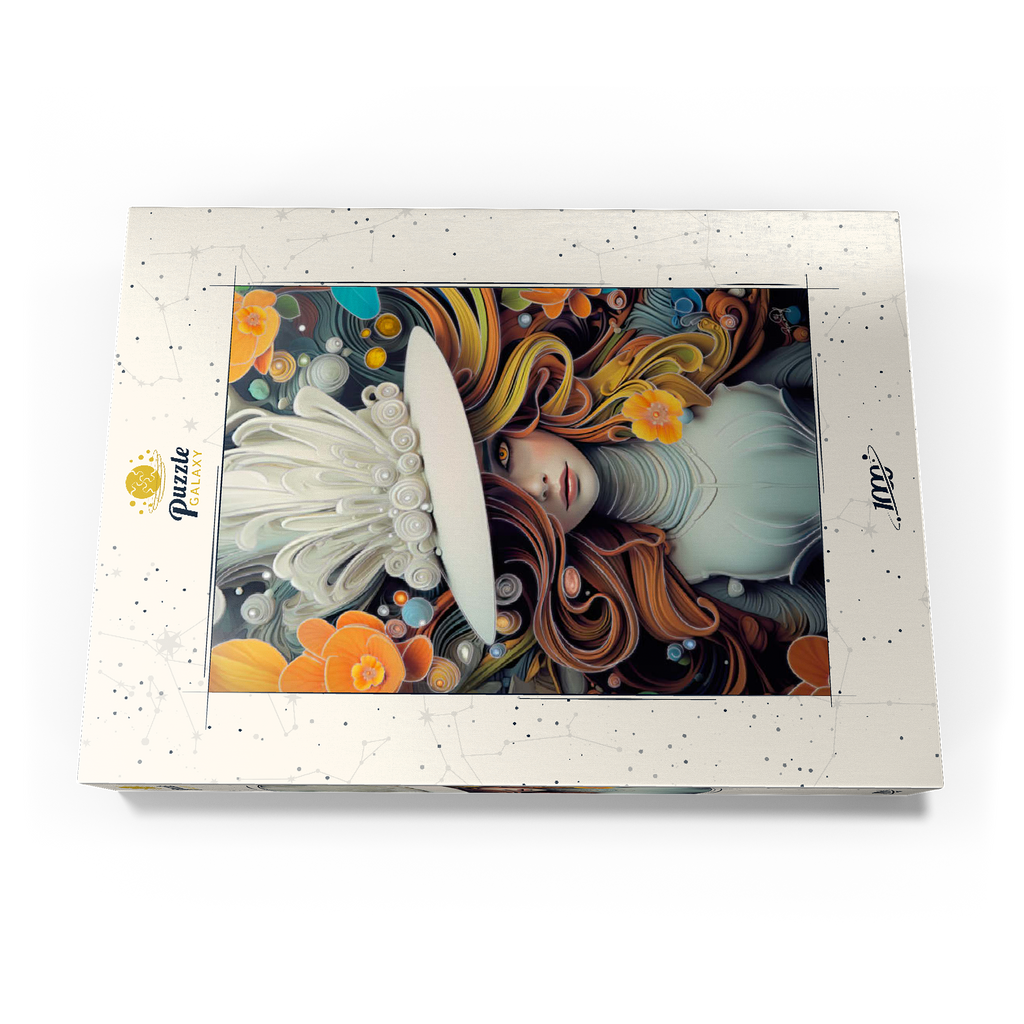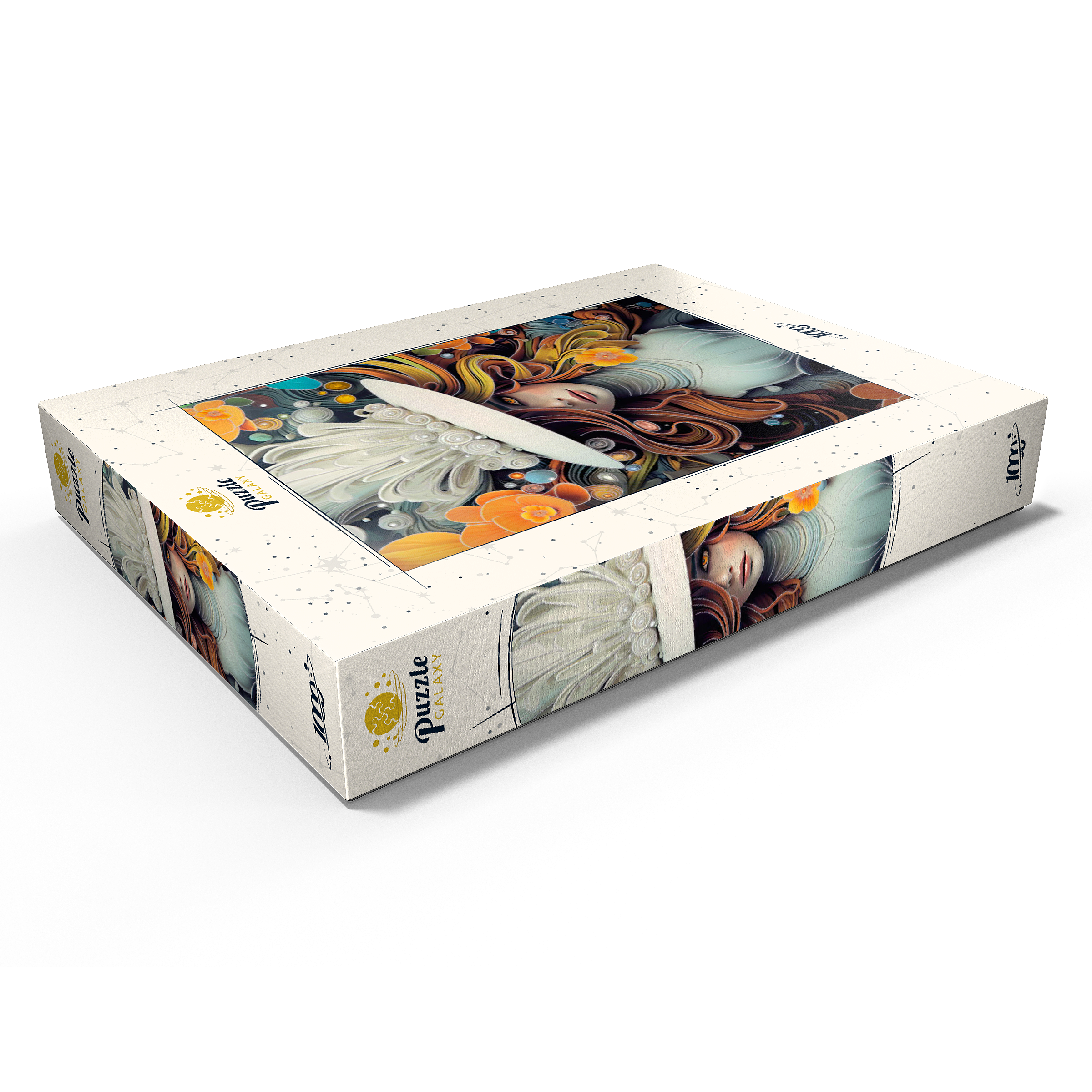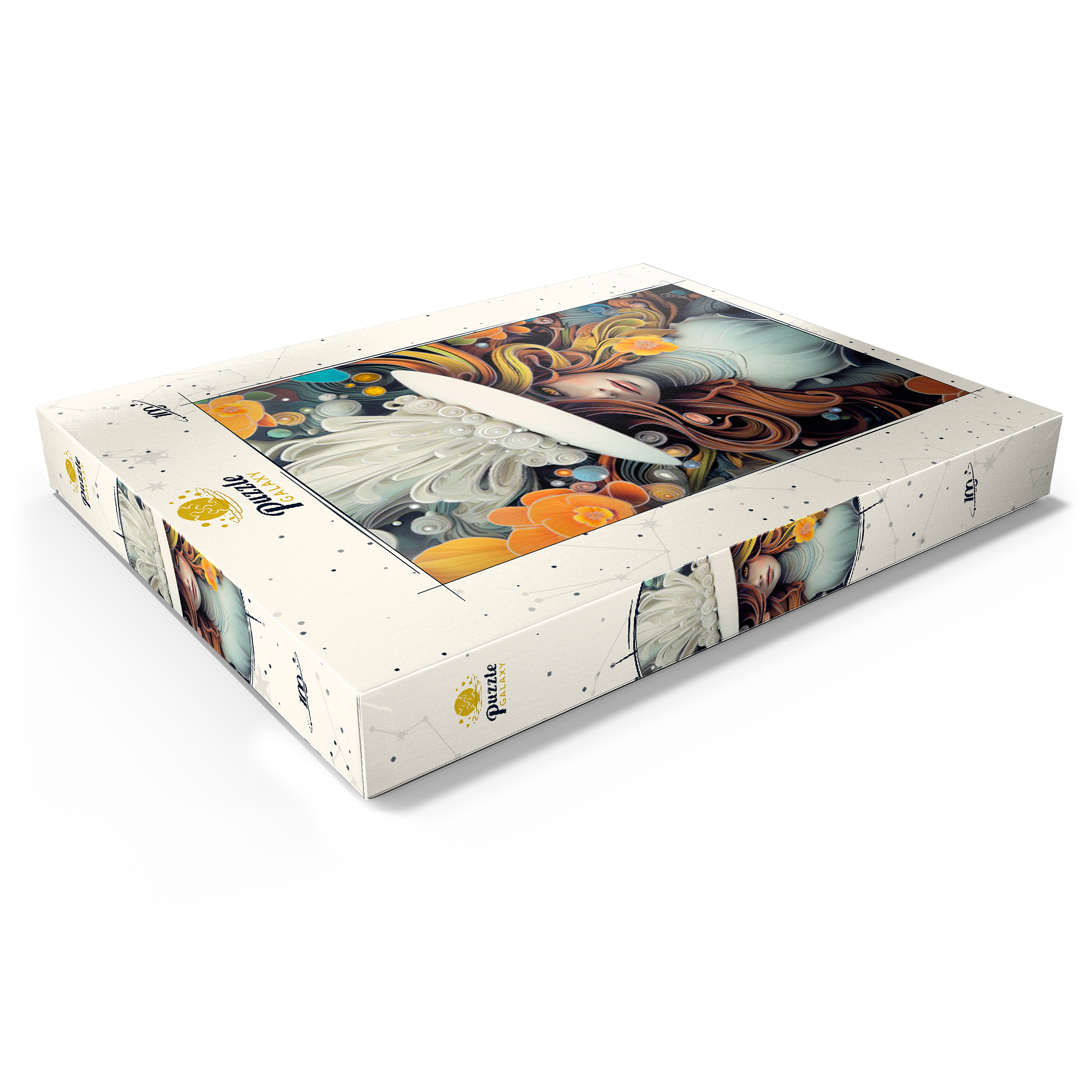Ein bezauberndes digitales Kunstwerk einer geheimnisvollen Frau mit durchdringenden goldenen Augen, die teilweise von einem großen weißen Hut mit wirbelnden federartigen Elementen verdeckt sind. Ihre fließenden rotbraunen und goldenen Locken verschmelzen nahtlos mit floralen und abstrakten Motiven, die um sie herum wirbeln. Die Farbpalette umfasst satte Cremetöne, warme Gelbtöne und sanfte Orangetöne, die eine traumhafte, fantasievolle Ästhetik schaffen. Das Werk verbindet Eleganz und Surrealismus und ist damit ein auffälliges Bild, das Staunen und Raffinesse hervorruft.