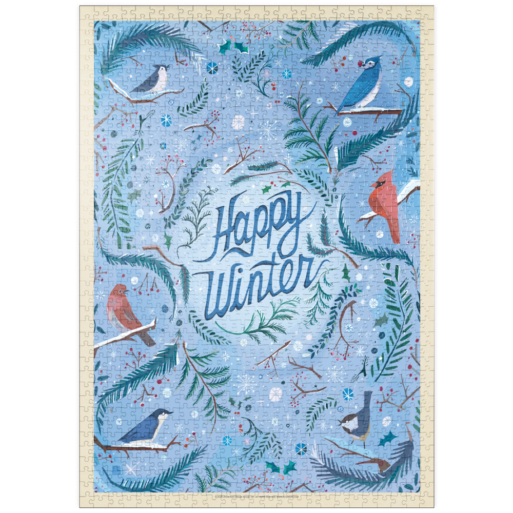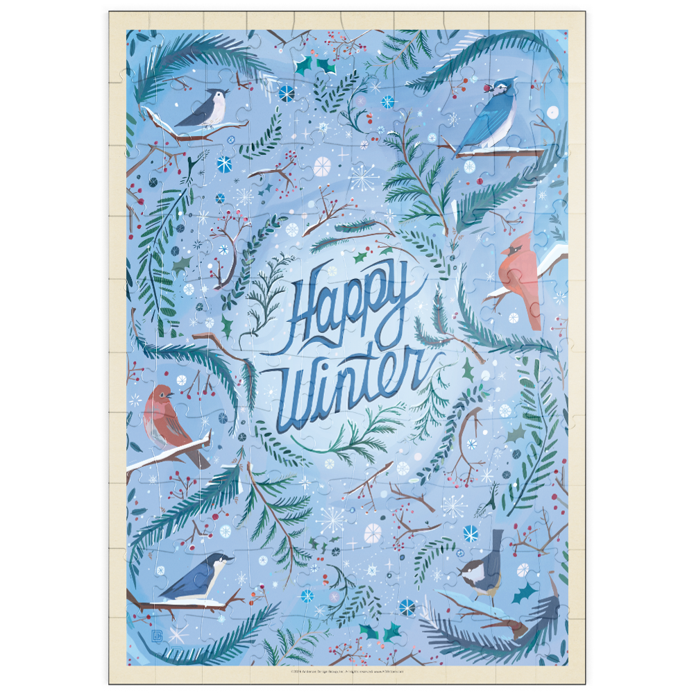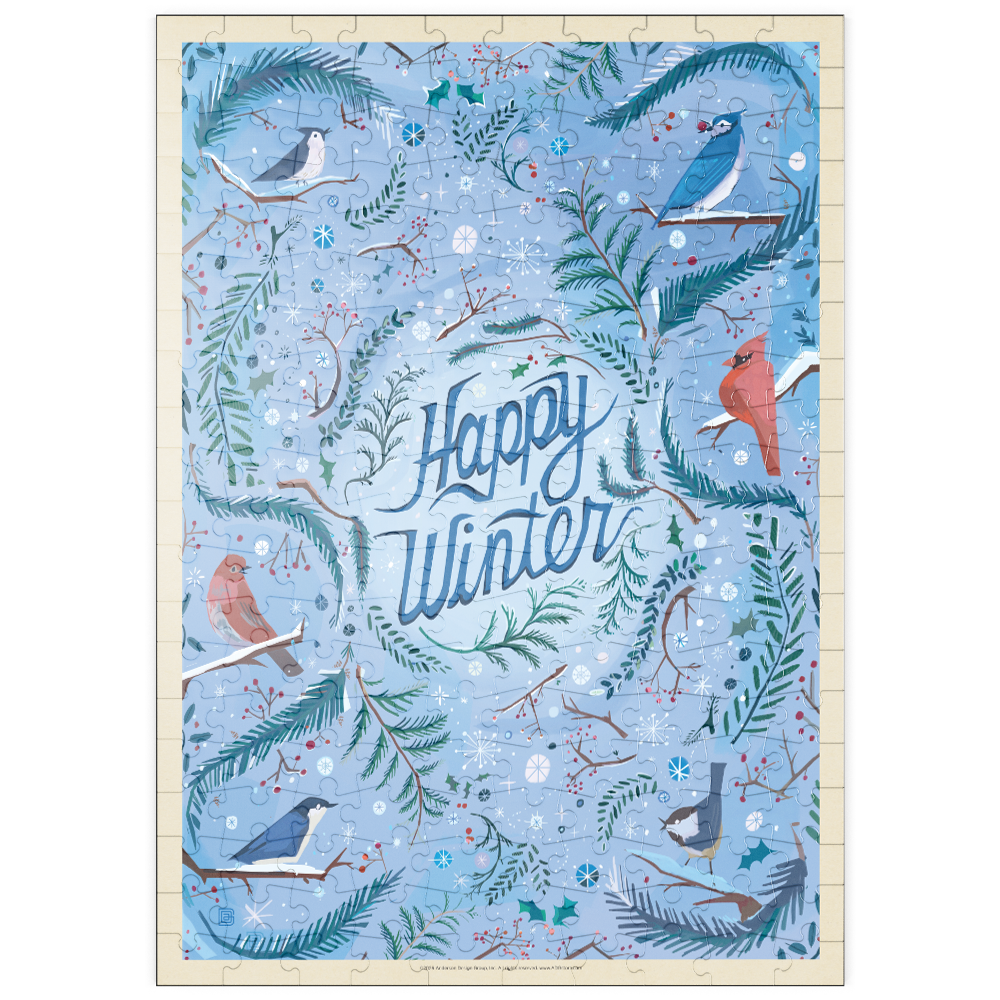 Fröhliches Wintergrußkartendesign mit Singvögeln und Wintertieren in einer festlichen, verschneiten, immergrünen Umgebung mit Blauhähern, Meisen und einem leuchtend roten Kardinal, der zwischen Tannenzweigen, Stechpalmenblättern und roten Beerenzweigen sitzt. Die mittig platzierte, handgeschriebene Botschaft „Happy Winter“ wird von wirbelnden Zweigen, botanischen Details, Schneeflocken und Sternenakzenten umrahmt, die eine gemütliche saisonale Atmosphäre schaffen. Kühle Eisblau- und frische Grüntöne kontrastieren mit leuchtendem Kardinalrot und sorgen für einen klaren, modernen Vintage-Look. Ideal für Winterurlaubsgrüße, Weihnachts- und Neujahrskarten, naturinspirierte Schreibwaren, Waldvogelliebhaber und rustikale Hütten-Saison-Dekorationen.