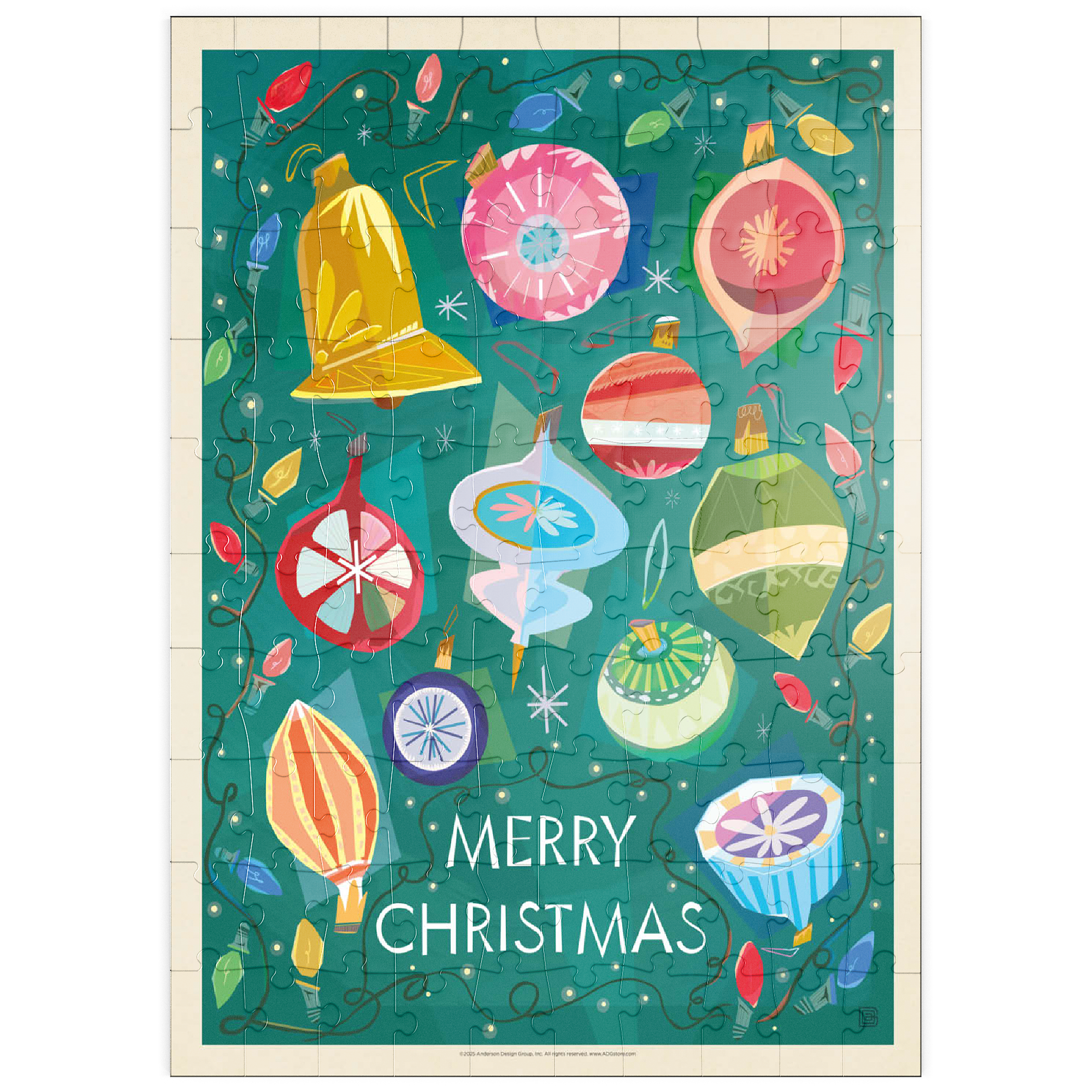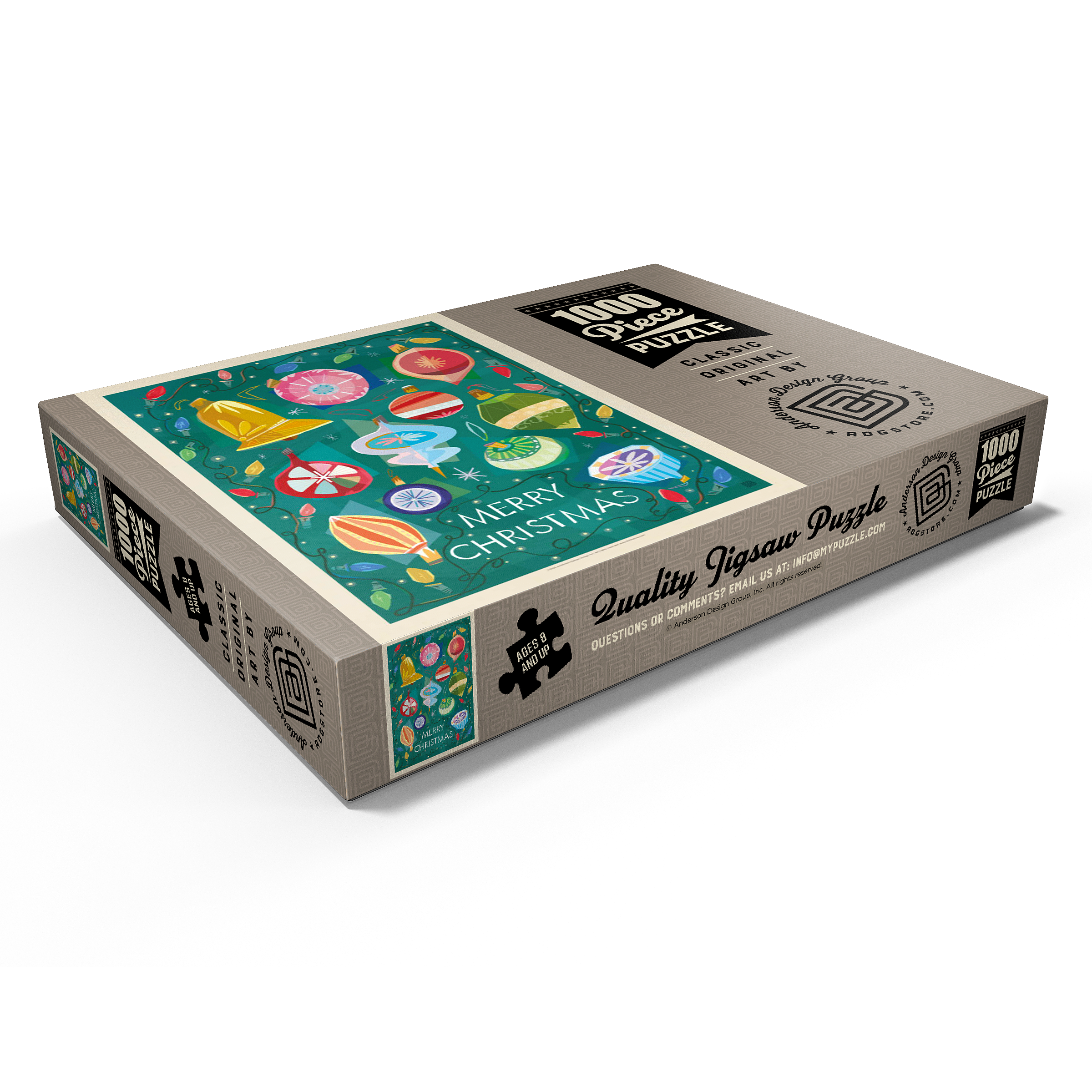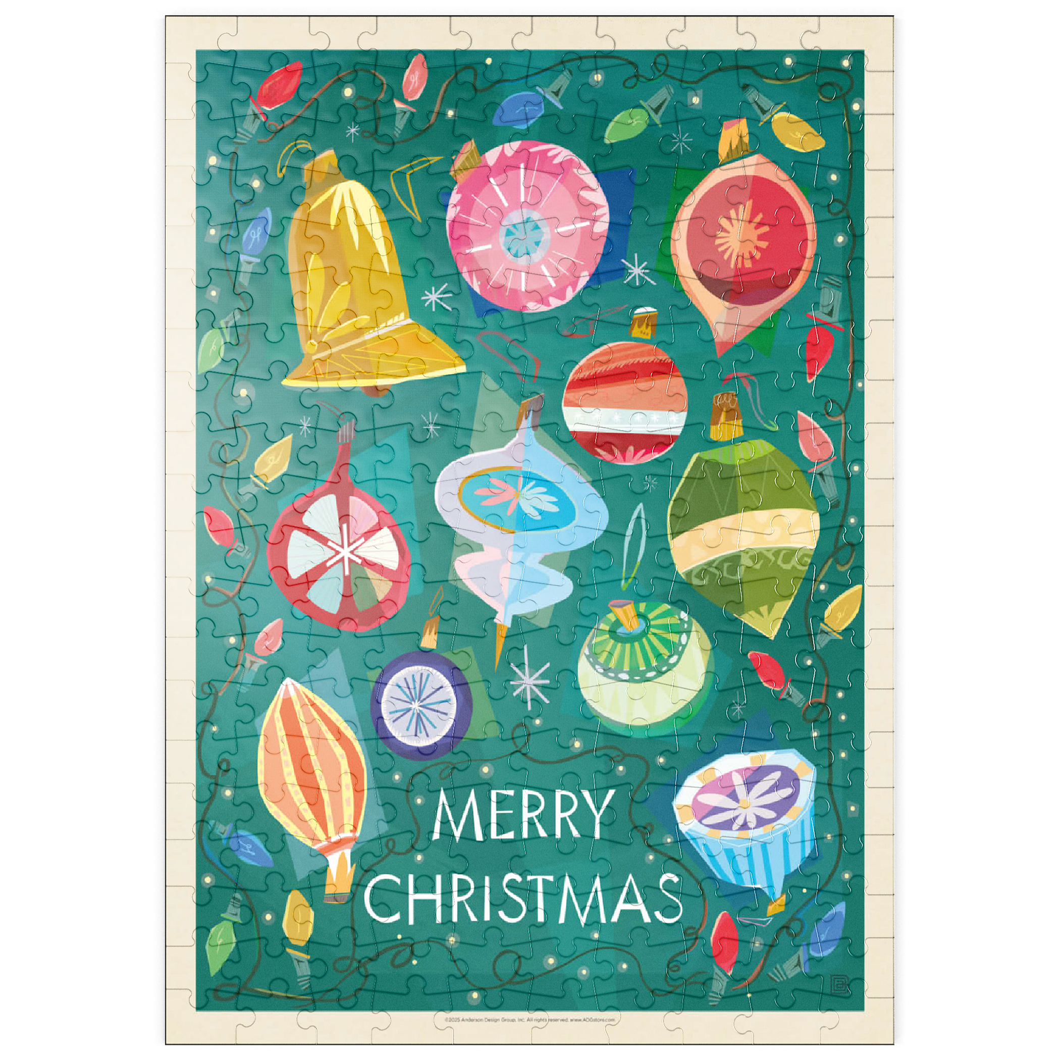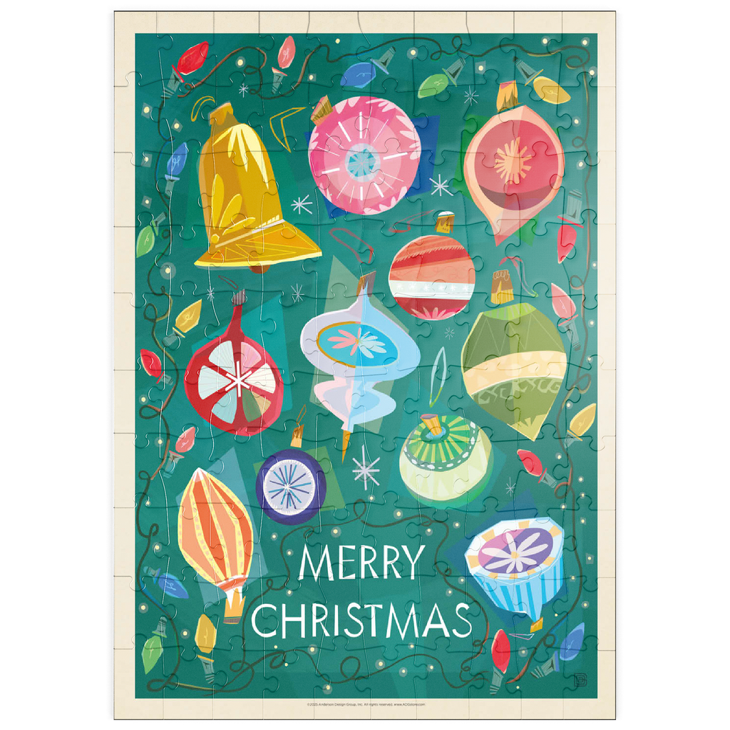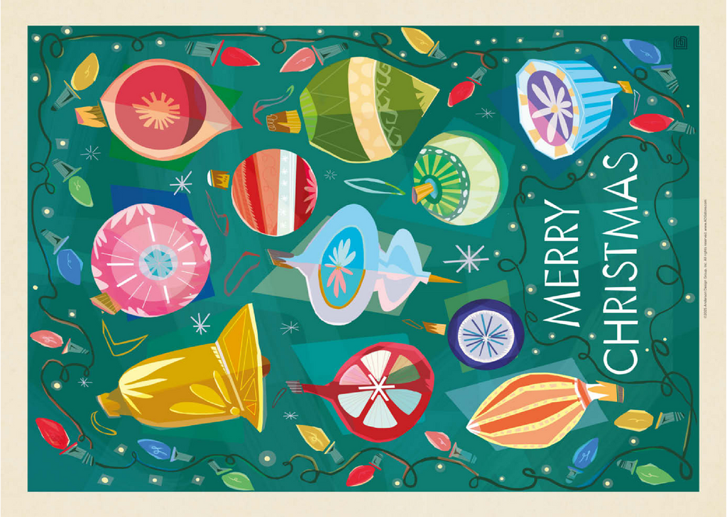 Ein festliches Weihnachtsdesign zeigt farbenfrohe Vintage-Ornamente, umgeben von leuchtenden Lichterketten auf einem tiefgrünen Hintergrund. Die Formen im Mid-Century-Stil und die leuchtenden Farben wecken nostalgische Erinnerungen an klassische Weihnachtsdekorationen, von Glaskugeln und Glöckchen bis hin zu tropfenförmigen und runden Ornamenten. Dezente Schneeflocken und Glitzerpartikel sorgen für Wärme und Fröhlichkeit und unterstreichen die freudige Weihnachtsbotschaft in der Mitte. Diese Darstellung zelebriert die zeitlose Schönheit traditioneller Weihnachtsdekorationen und fängt den Geist der Freude, des Lichts und der Zusammengehörigkeit ein, der die Weihnachtszeit ausmacht, in einem verspielten, retro-inspirierten künstlerischen Stil.
