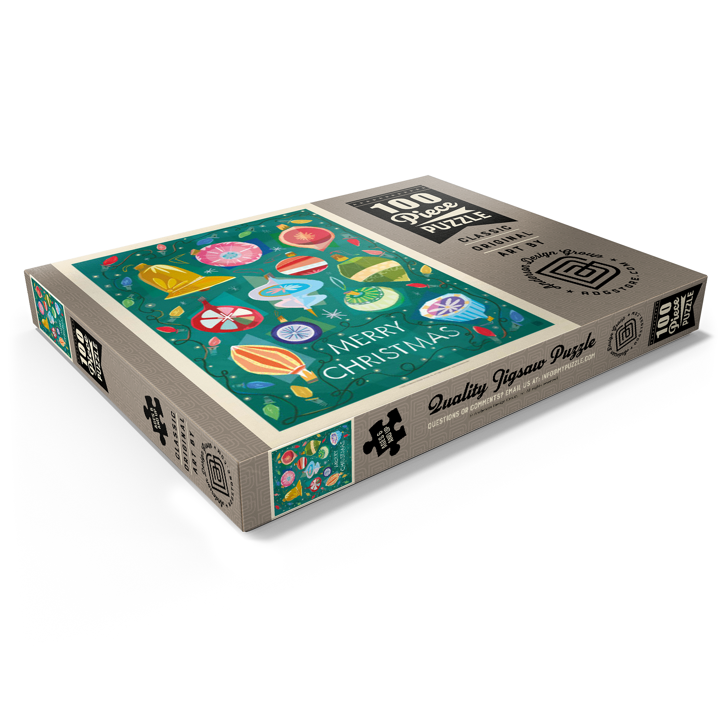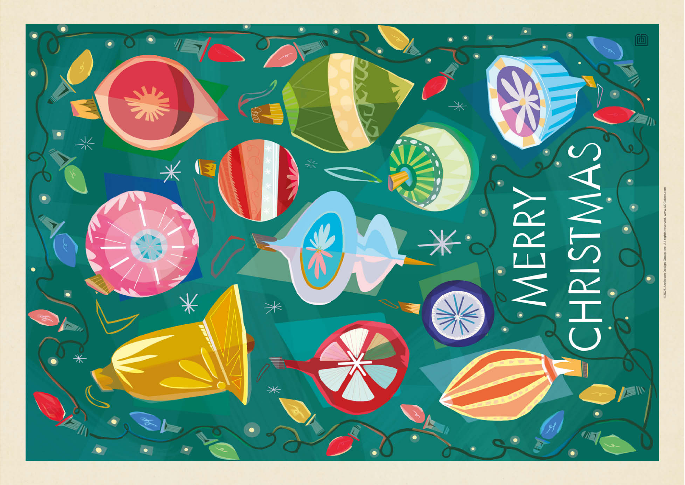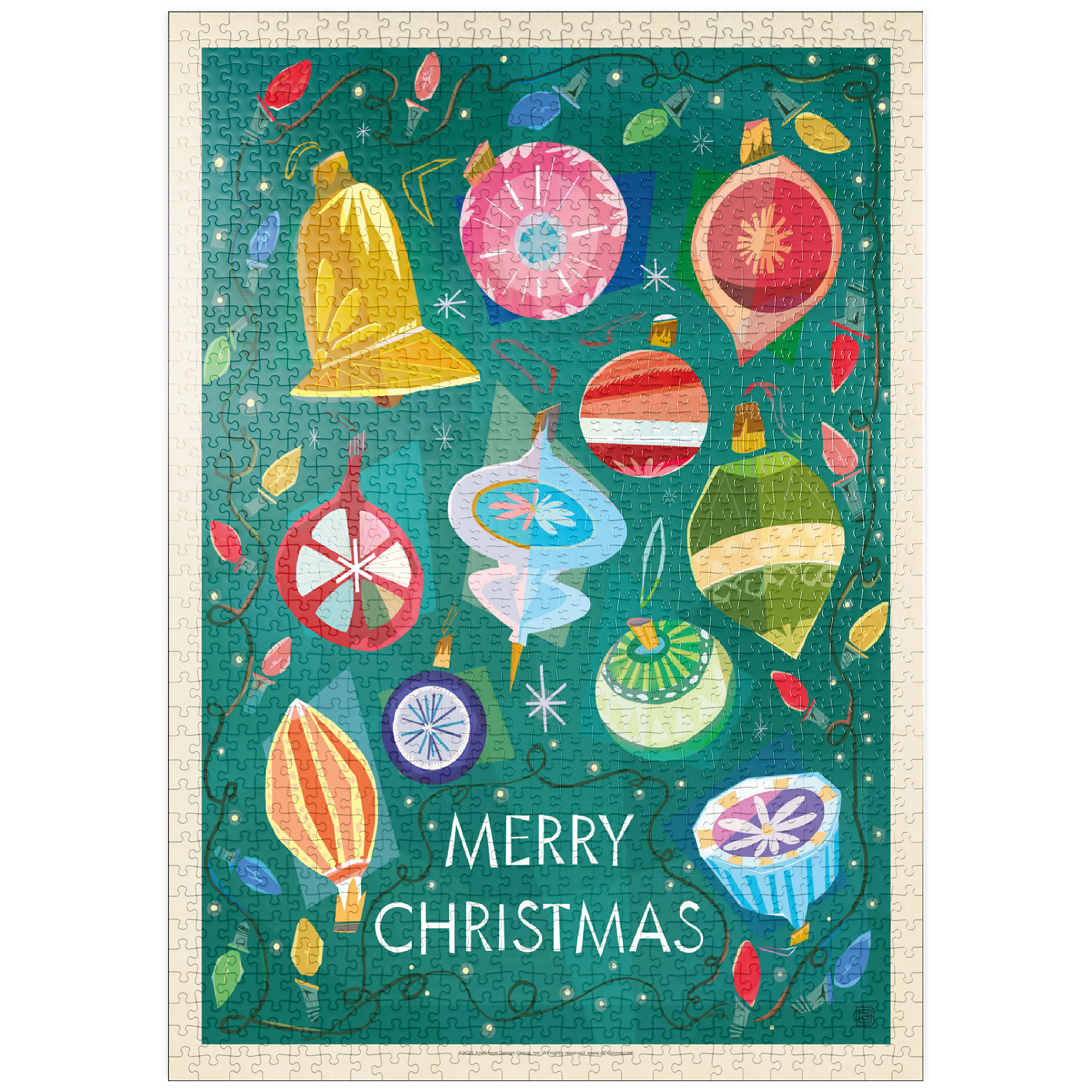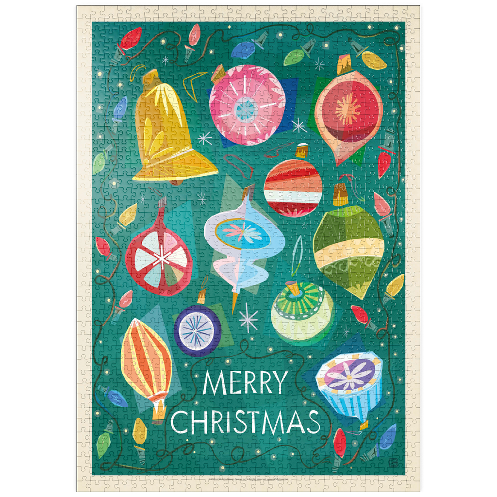 Ein festliches Weihnachtsdesign zeigt farbenfrohe Vintage-Ornamente, umgeben von leuchtenden Lichterketten auf einem tiefgrünen Hintergrund. Die Formen im Mid-Century-Stil und die leuchtenden Farben wecken nostalgische Erinnerungen an klassische Weihnachtsdekorationen, von Glaskugeln und Glöckchen bis hin zu tropfenförmigen und runden Ornamenten. Dezente Schneeflocken und Glitzerpartikel sorgen für Wärme und Fröhlichkeit und unterstreichen die freudige Weihnachtsbotschaft in der Mitte. Diese Darstellung zelebriert die zeitlose Schönheit traditioneller Weihnachtsdekorationen und fängt den Geist der Freude, des Lichts und der Zusammengehörigkeit ein, der die Weihnachtszeit ausmacht, in einem verspielten, retro-inspirierten künstlerischen Stil.