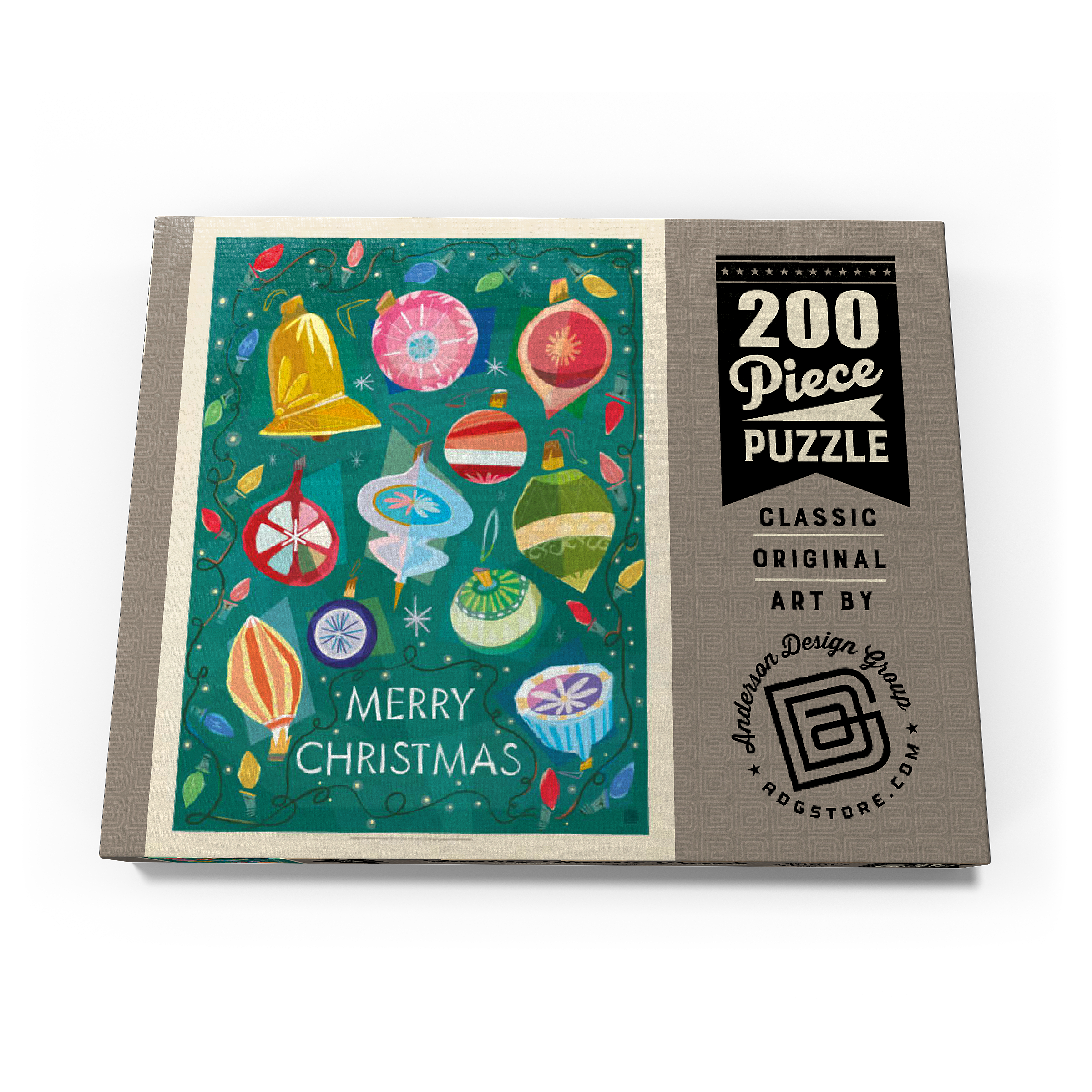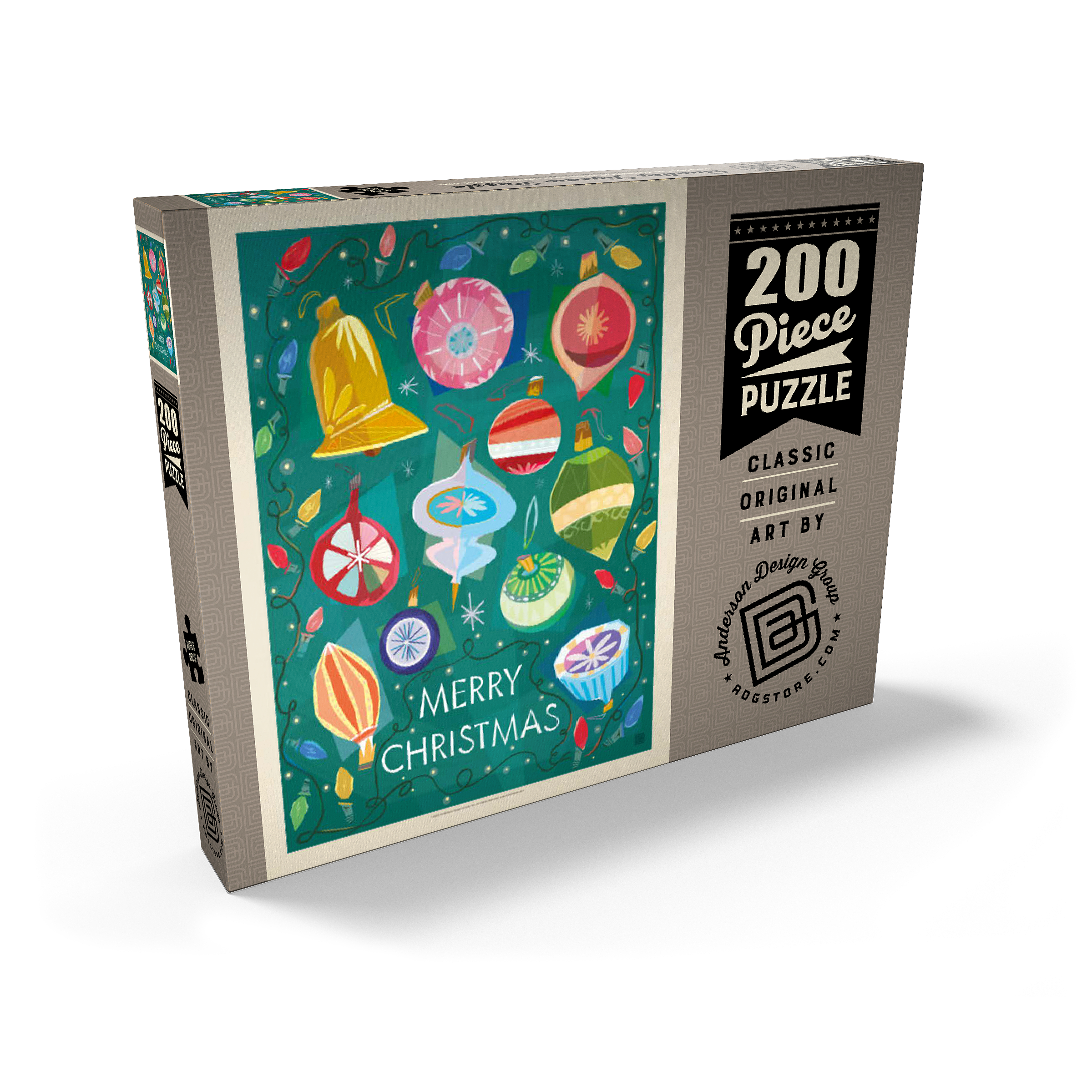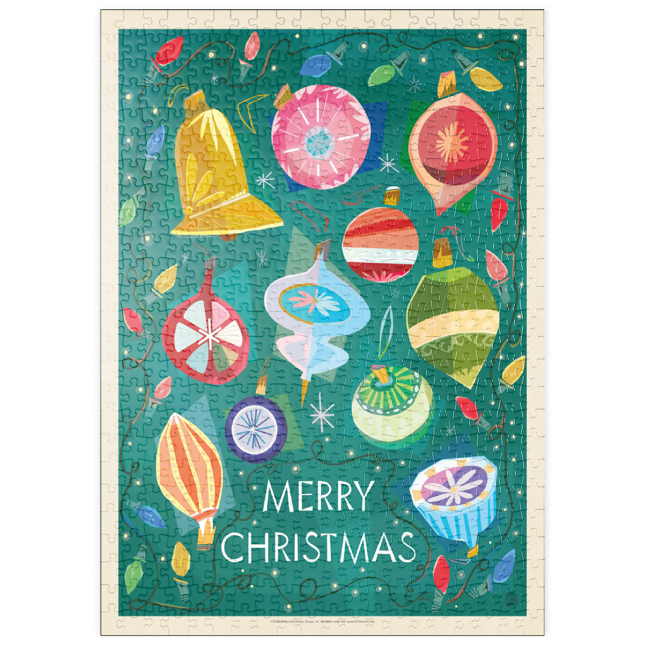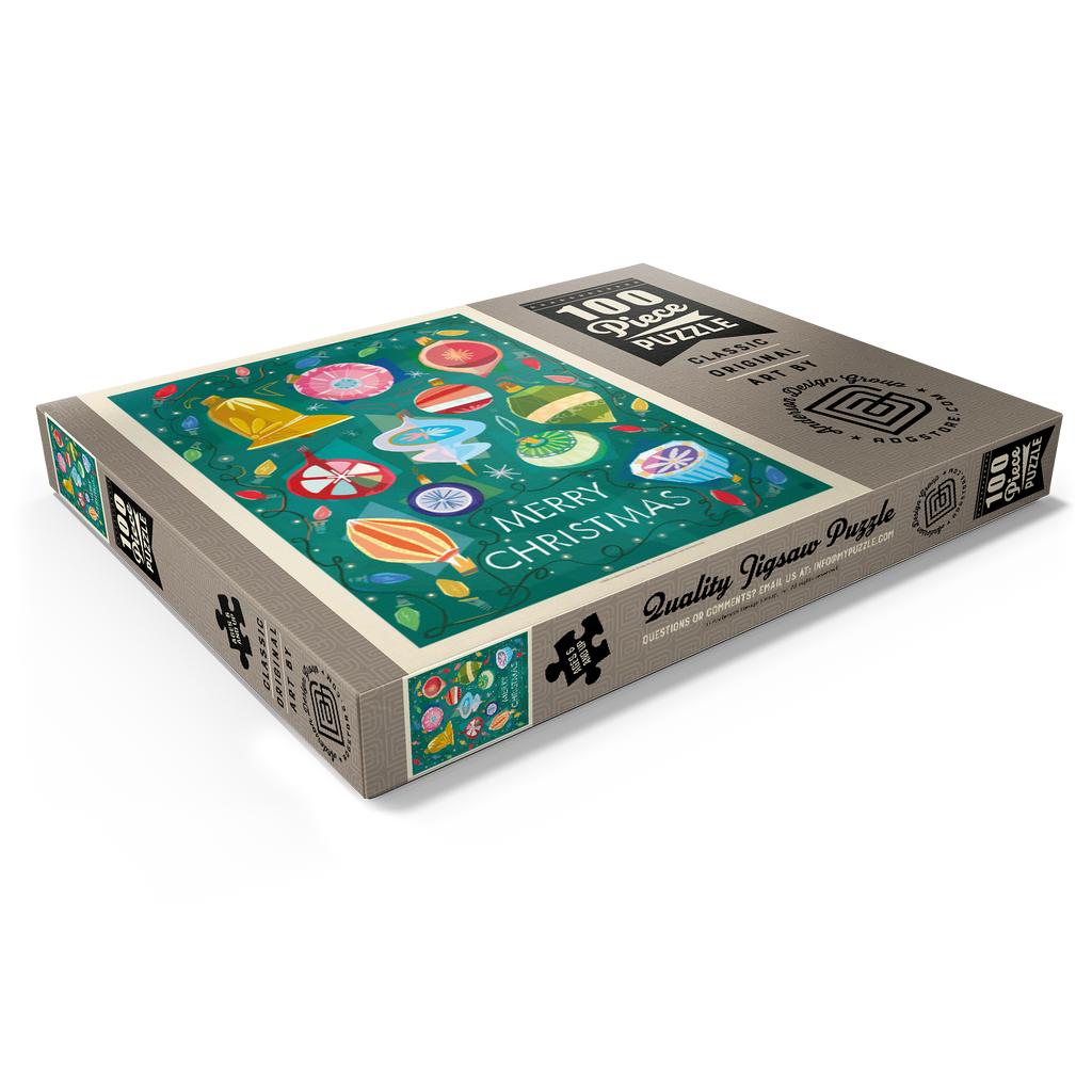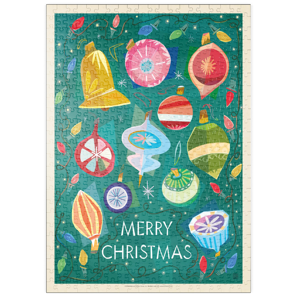 Ein festliches Weihnachtsdesign zeigt farbenfrohe Vintage-Ornamente, umgeben von leuchtenden Lichterketten auf einem tiefgrünen Hintergrund. Die Formen im Mid-Century-Stil und die leuchtenden Farben wecken nostalgische Erinnerungen an klassische Weihnachtsdekorationen, von Glaskugeln und Glöckchen bis hin zu tropfenförmigen und runden Ornamenten. Dezente Schneeflocken und Glitzerpartikel sorgen für Wärme und Fröhlichkeit und unterstreichen die freudige Weihnachtsbotschaft in der Mitte. Diese Darstellung zelebriert die zeitlose Schönheit traditioneller Weihnachtsdekorationen und fängt den Geist der Freude, des Lichts und der Zusammengehörigkeit ein, der die Weihnachtszeit ausmacht, in einem verspielten, retro-inspirierten künstlerischen Stil.