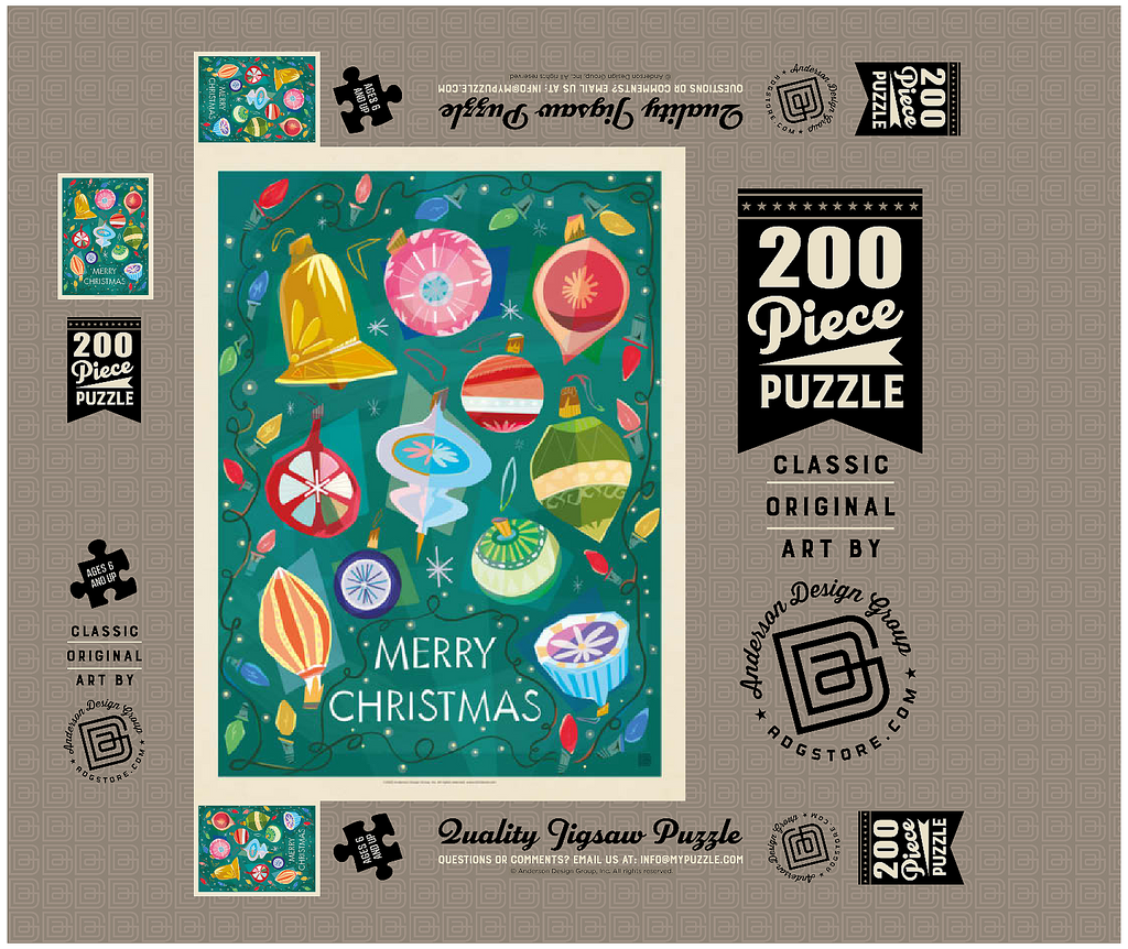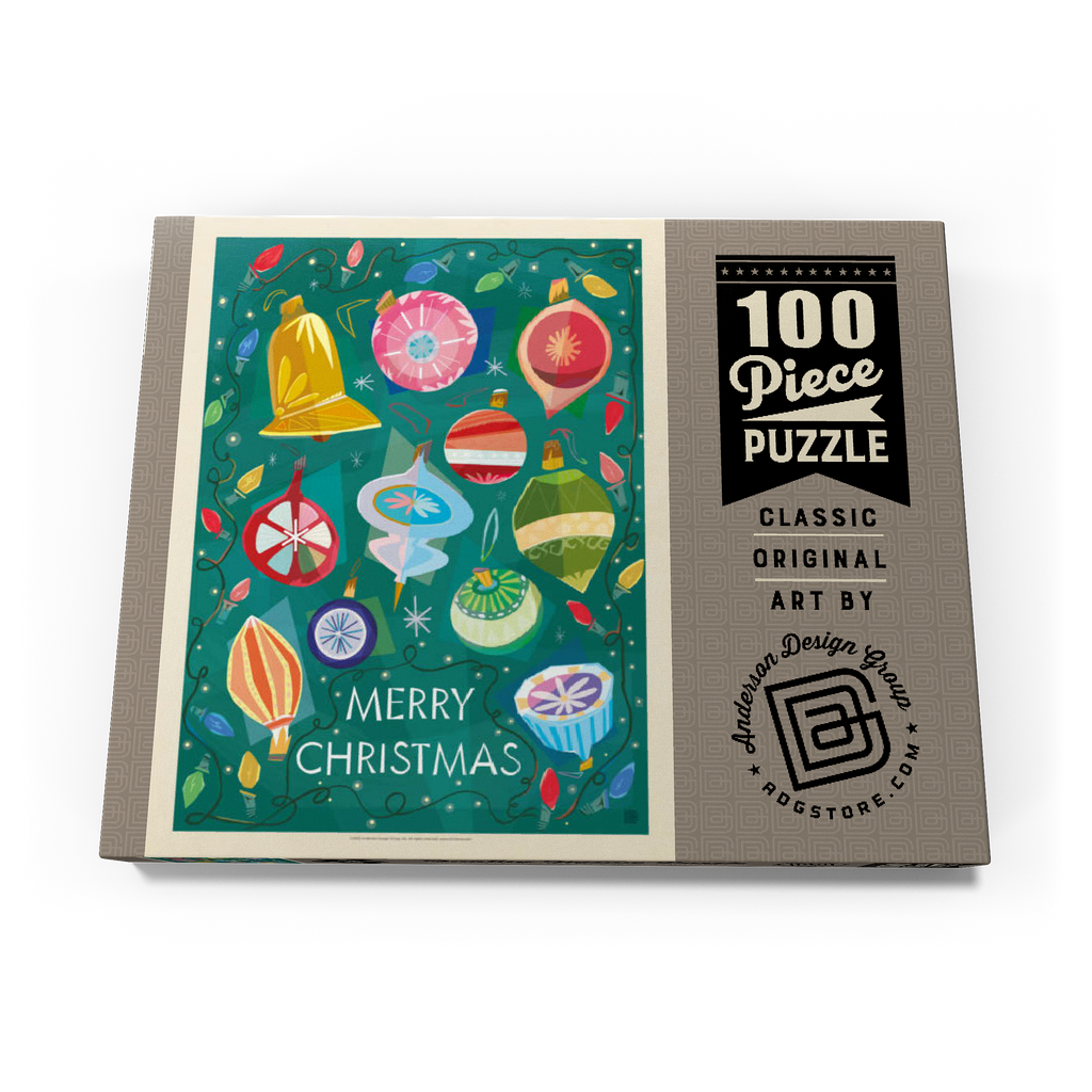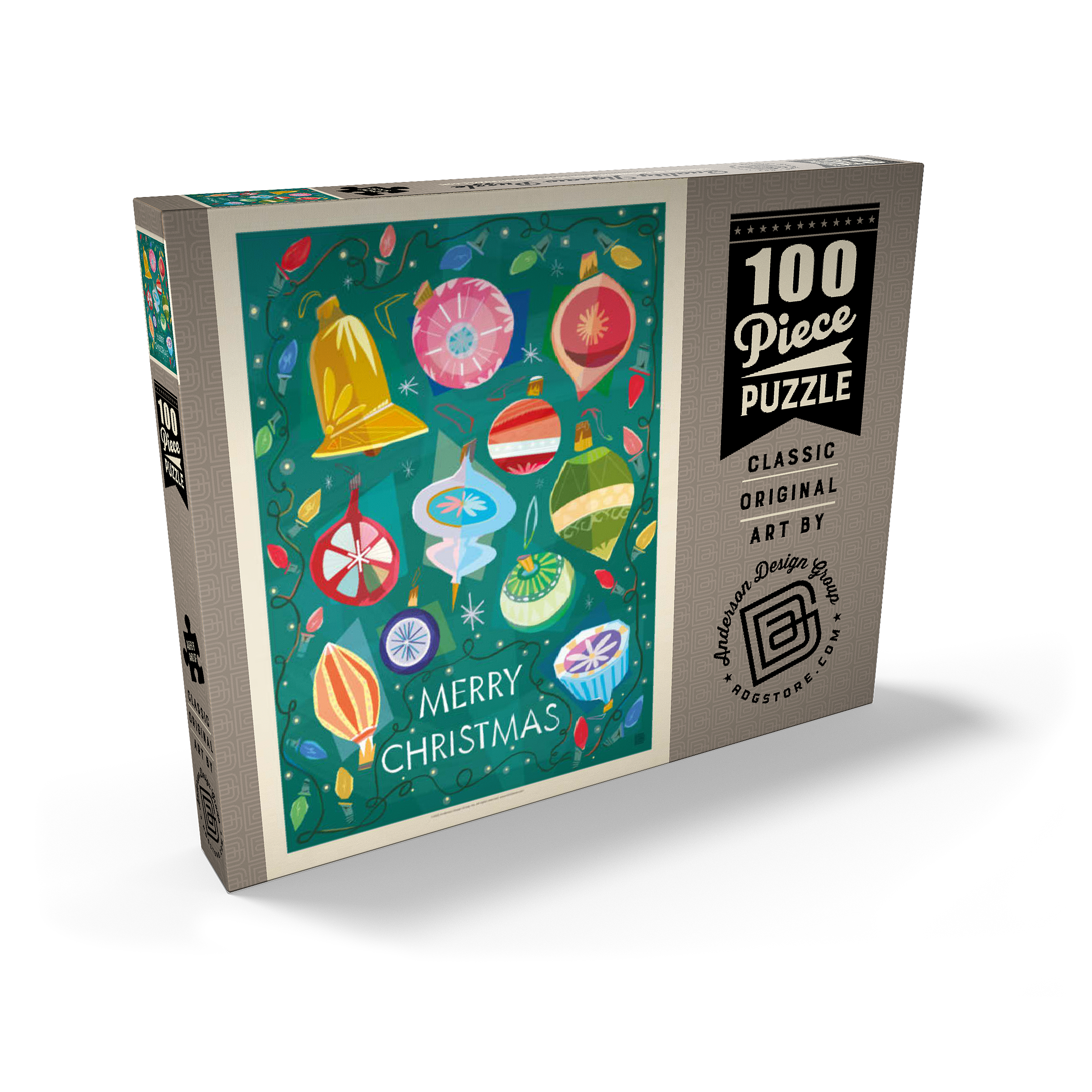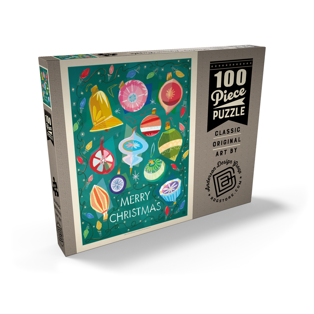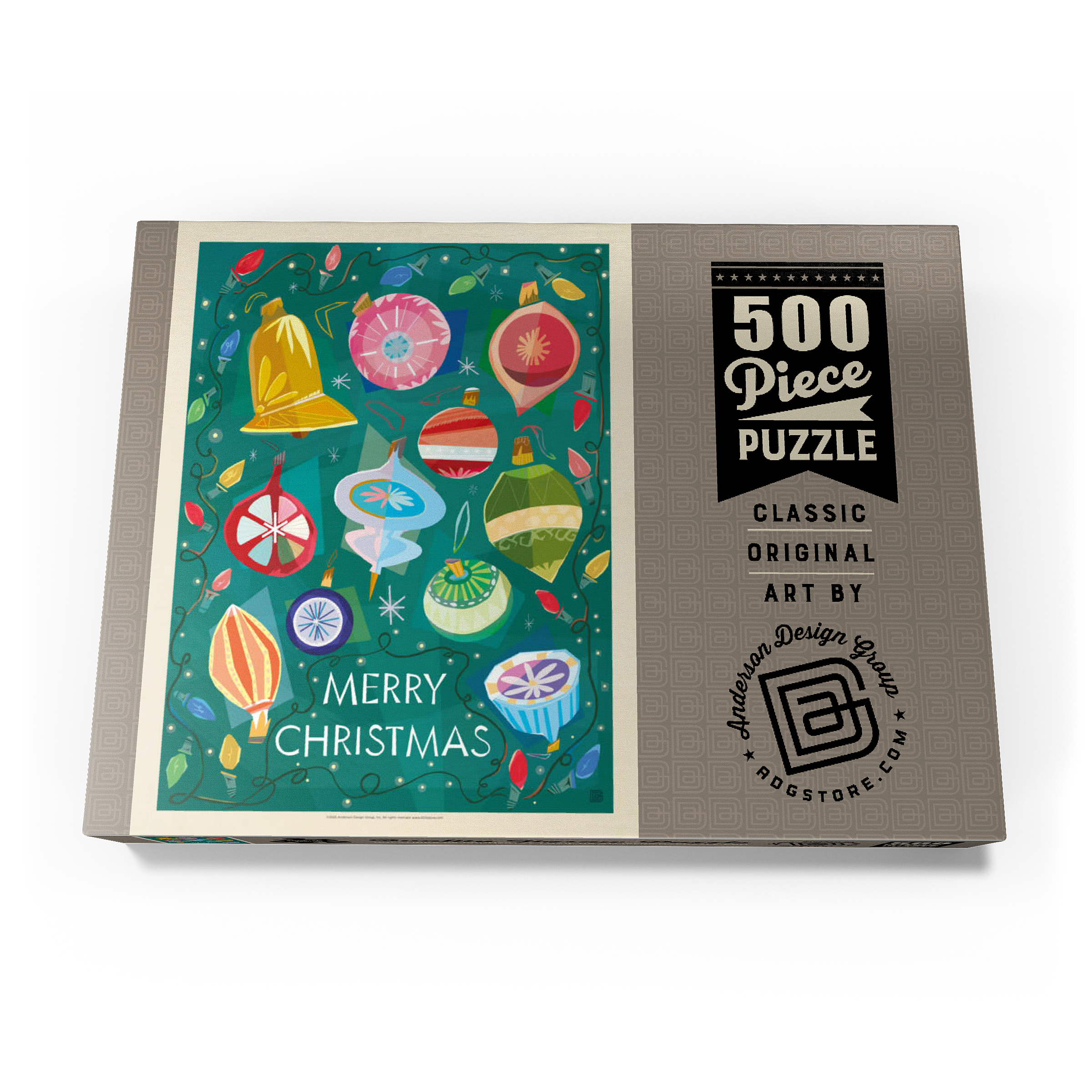 Ein festliches Weihnachtsdesign zeigt farbenfrohe Vintage-Ornamente, umgeben von leuchtenden Lichterketten auf einem tiefgrünen Hintergrund. Die Formen im Mid-Century-Stil und die leuchtenden Farben wecken nostalgische Erinnerungen an klassische Weihnachtsdekorationen, von Glaskugeln und Glöckchen bis hin zu tropfenförmigen und runden Ornamenten. Dezente Schneeflocken und Glitzerpartikel sorgen für Wärme und Fröhlichkeit und unterstreichen die freudige Weihnachtsbotschaft in der Mitte. Diese Darstellung zelebriert die zeitlose Schönheit traditioneller Weihnachtsdekorationen und fängt den Geist der Freude, des Lichts und der Zusammengehörigkeit ein, der die Weihnachtszeit ausmacht, in einem verspielten, retro-inspirierten künstlerischen Stil.