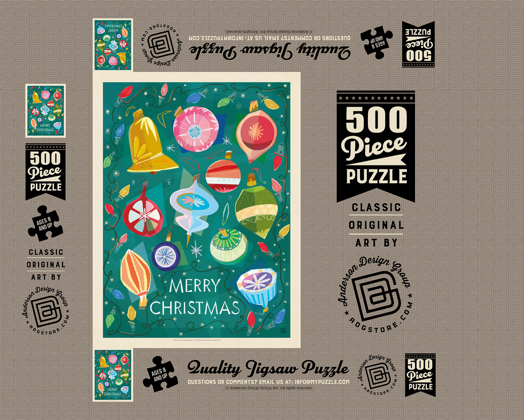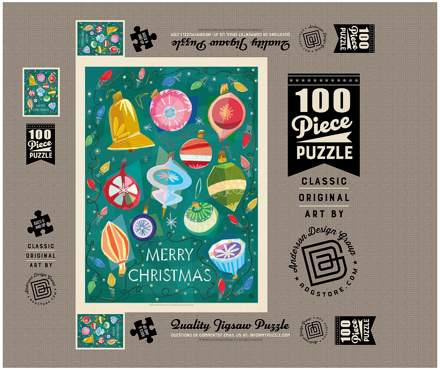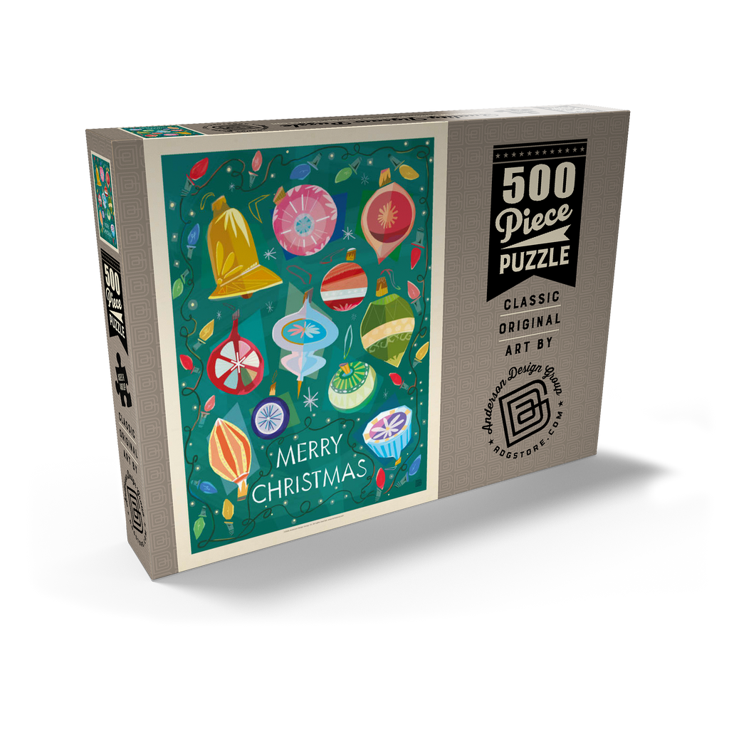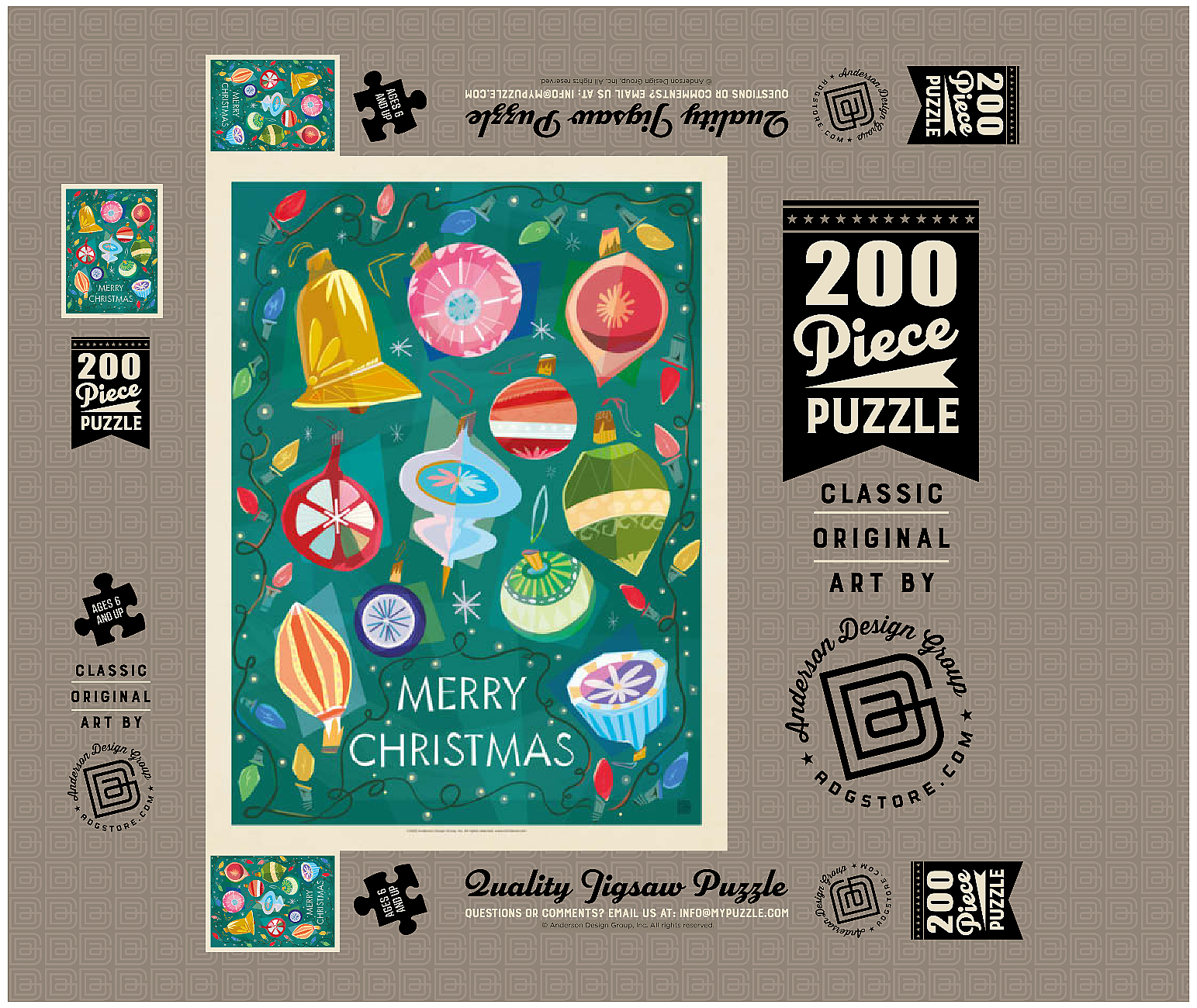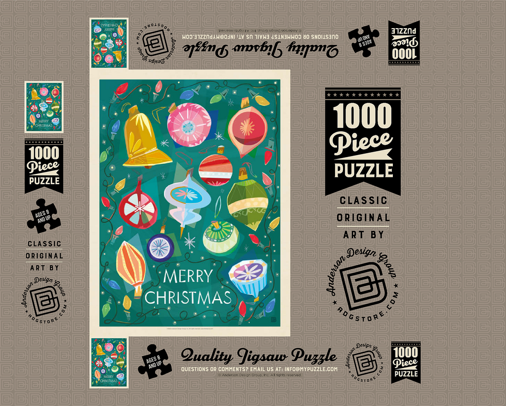 Ein festliches Weihnachtsdesign zeigt farbenfrohe Vintage-Ornamente, umgeben von leuchtenden Lichterketten auf einem tiefgrünen Hintergrund. Die Formen im Mid-Century-Stil und die leuchtenden Farben wecken nostalgische Erinnerungen an klassische Weihnachtsdekorationen, von Glaskugeln und Glöckchen bis hin zu tropfenförmigen und runden Ornamenten. Dezente Schneeflocken und Glitzerpartikel sorgen für Wärme und Fröhlichkeit und unterstreichen die freudige Weihnachtsbotschaft in der Mitte. Diese Darstellung zelebriert die zeitlose Schönheit traditioneller Weihnachtsdekorationen und fängt den Geist der Freude, des Lichts und der Zusammengehörigkeit ein, der die Weihnachtszeit ausmacht, in einem verspielten, retro-inspirierten künstlerischen Stil.
