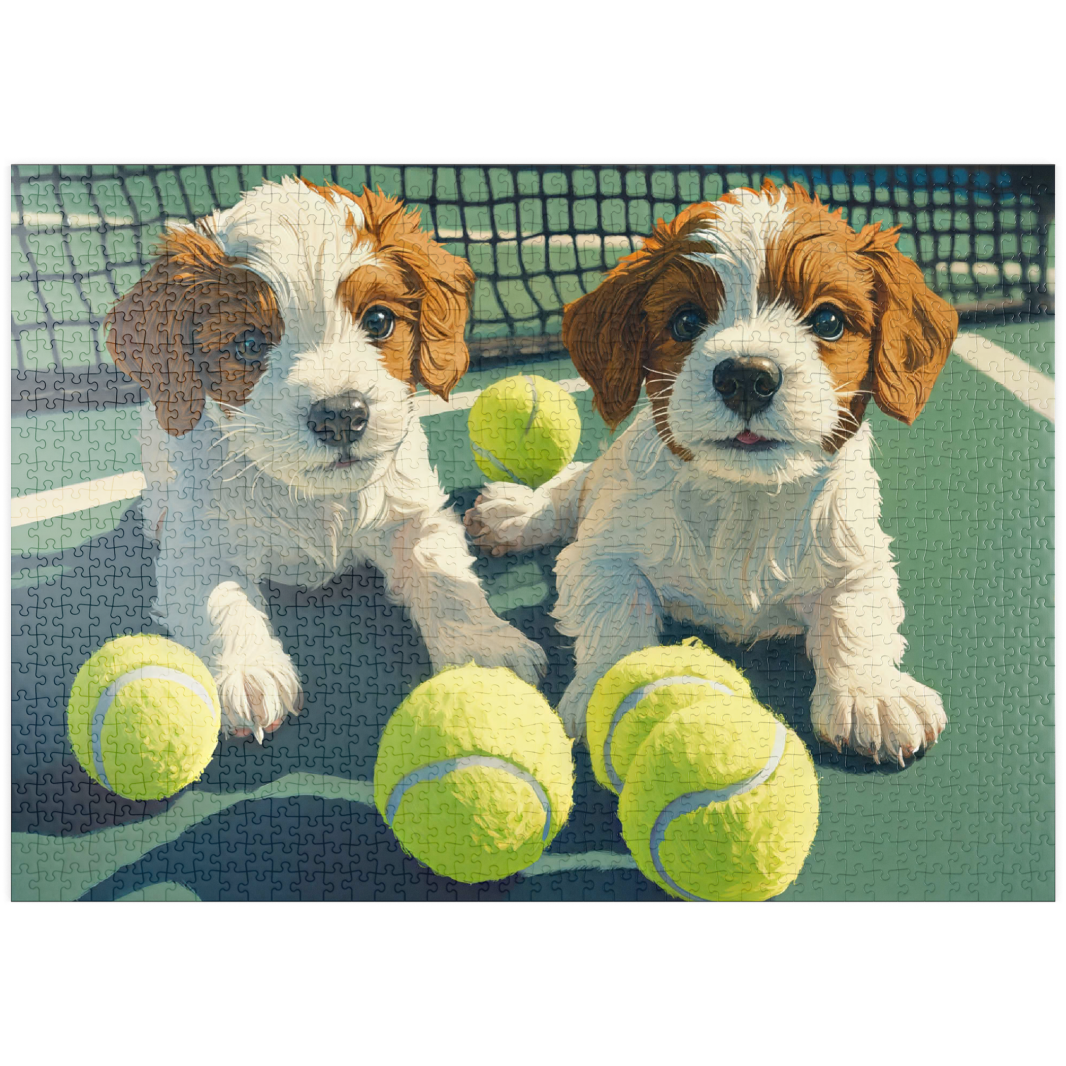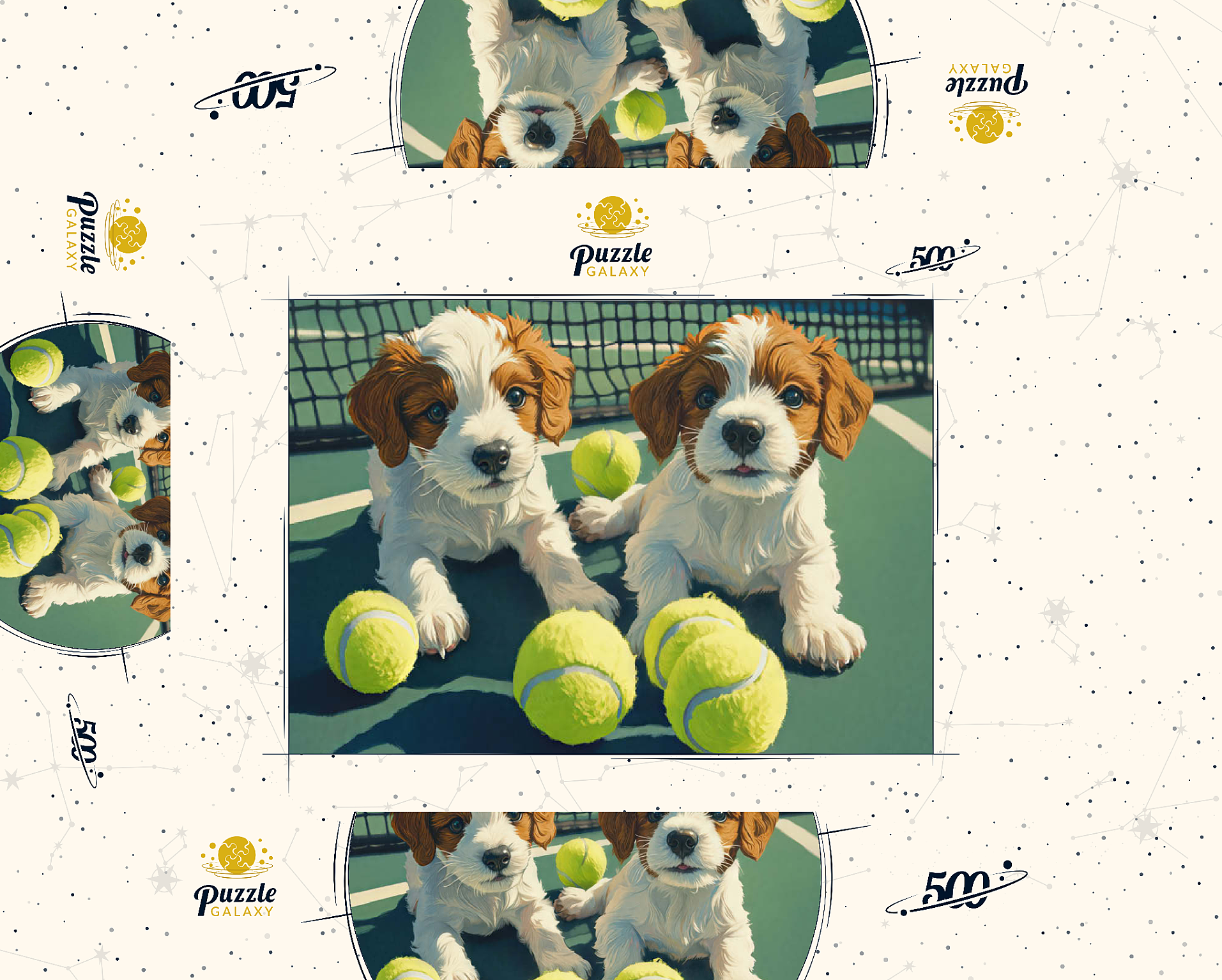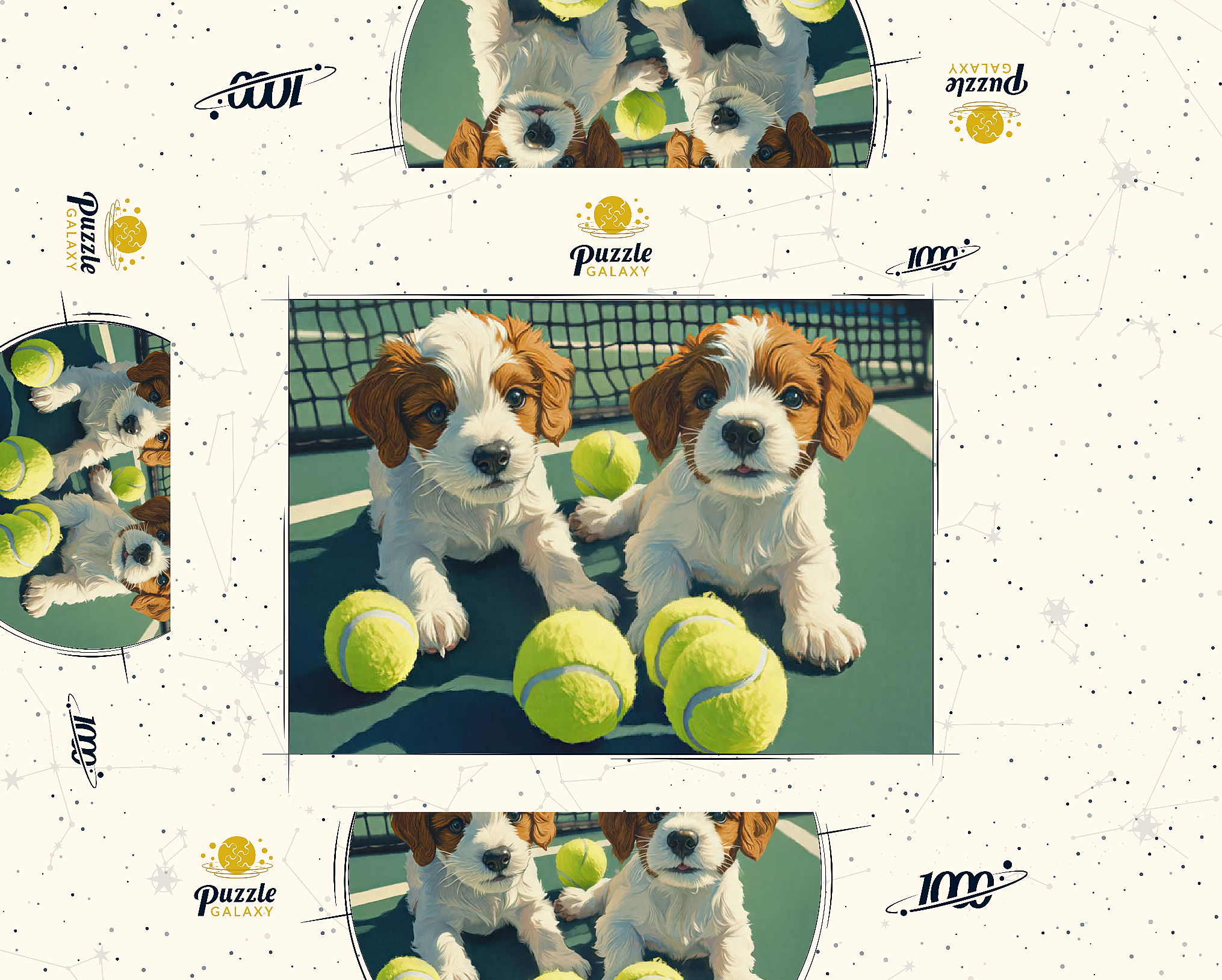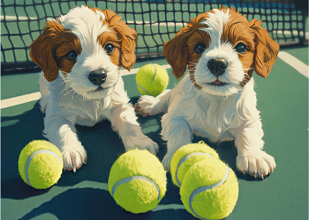 Diese entzückende Szene zeigt zwei verspielte Welpen, die sich auf einem sonnigen Tennisplatz ausruhen, umgeben von leuchtend gelben Tennisbällen. Ihr weiches weißes und braunes Fell sowie ihre großen, neugierigen Augen strahlen Charme und Wärme aus. Die kontrastierende grüne Oberfläche des Platzes und das Tennisnetz im Hintergrund verleihen diesem freudigen Moment eine sportliche und zugleich reizvolle Atmosphäre. Eine perfekte Darstellung von jugendlicher Energie und Niedlichkeit.