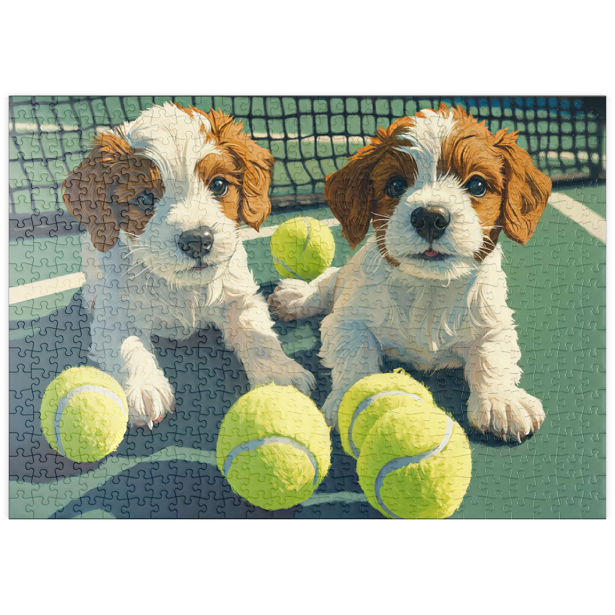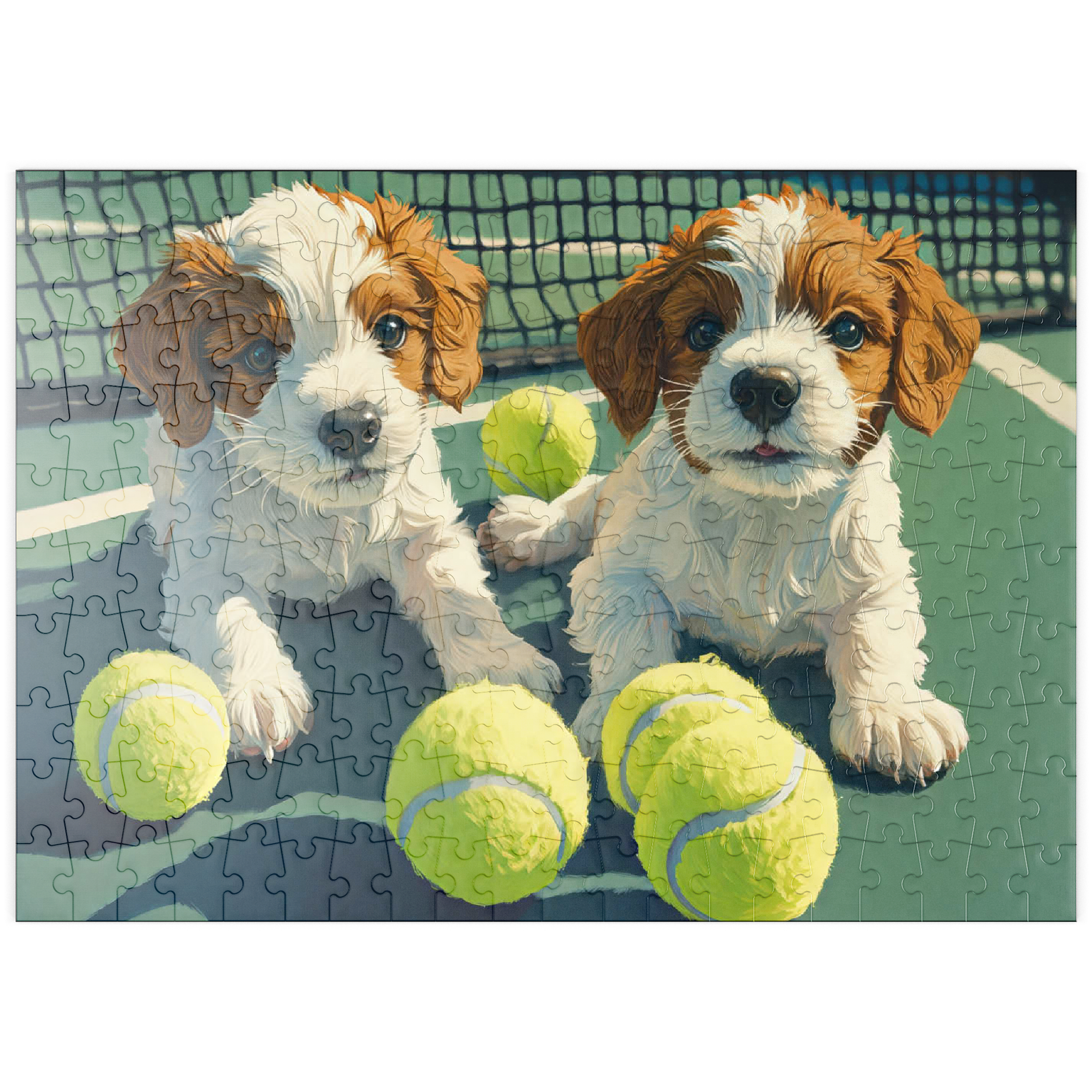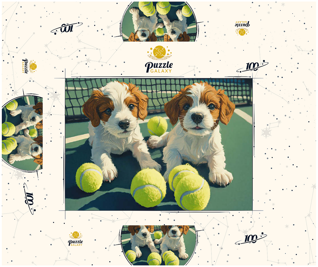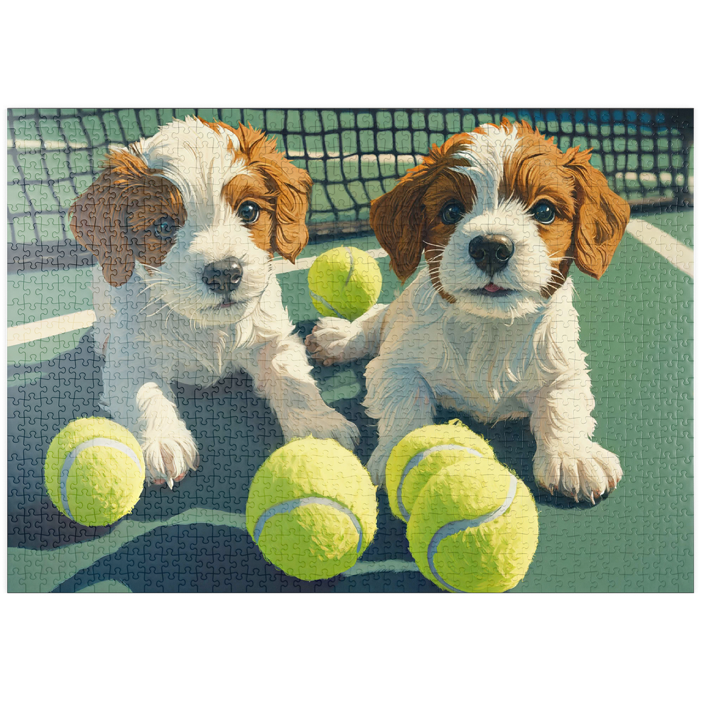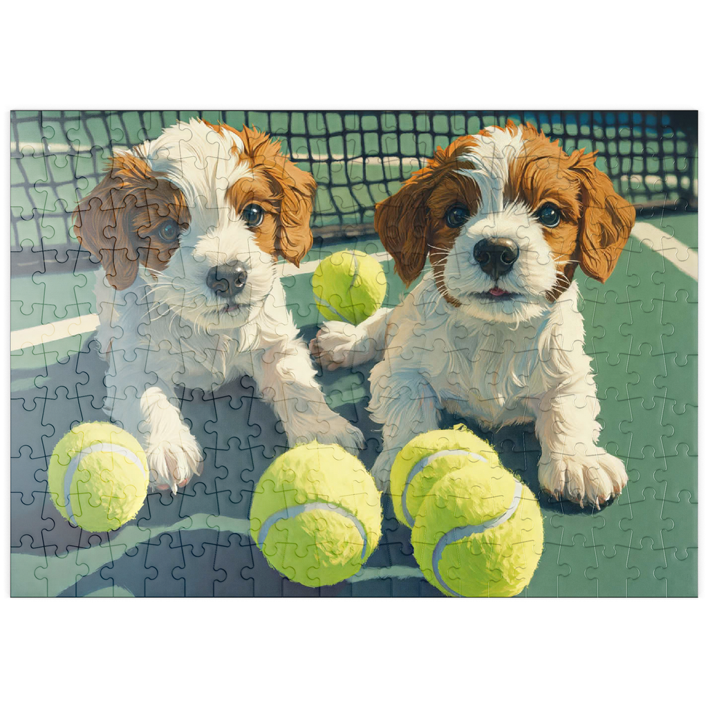 Diese entzückende Szene zeigt zwei verspielte Welpen, die sich auf einem sonnigen Tennisplatz ausruhen, umgeben von leuchtend gelben Tennisbällen. Ihr weiches weißes und braunes Fell sowie ihre großen, neugierigen Augen strahlen Charme und Wärme aus. Die kontrastierende grüne Oberfläche des Platzes und das Tennisnetz im Hintergrund verleihen diesem freudigen Moment eine sportliche und zugleich reizvolle Atmosphäre. Eine perfekte Darstellung von jugendlicher Energie und Niedlichkeit.