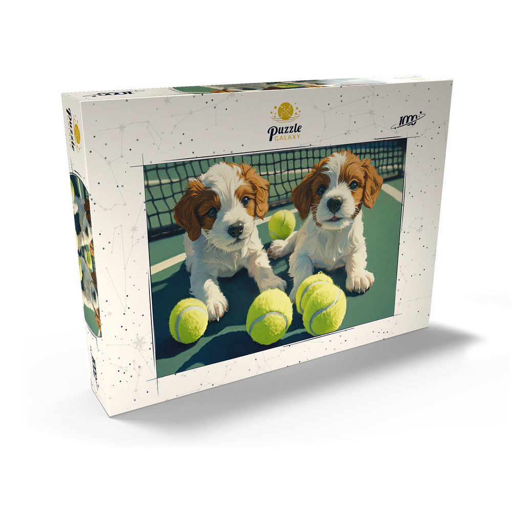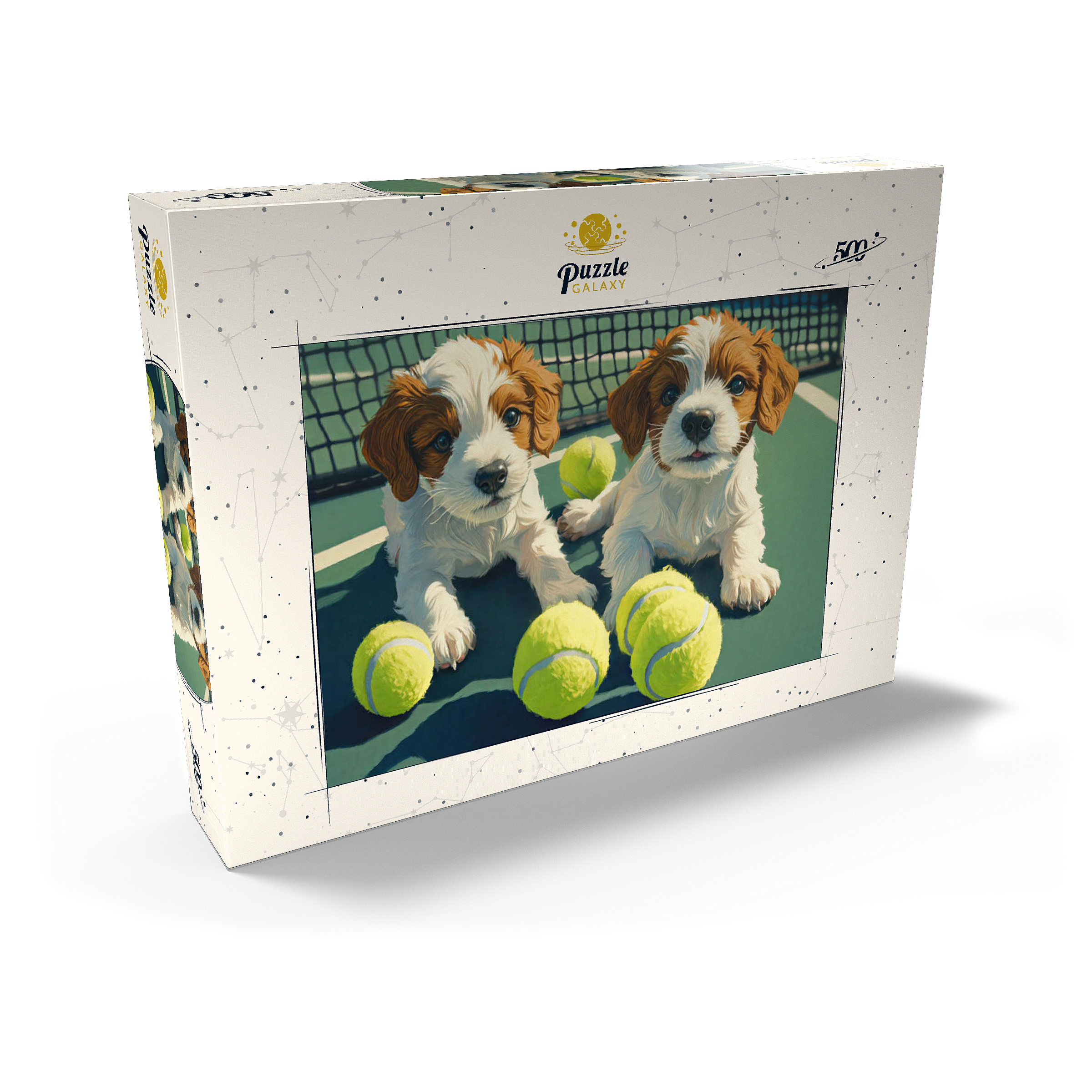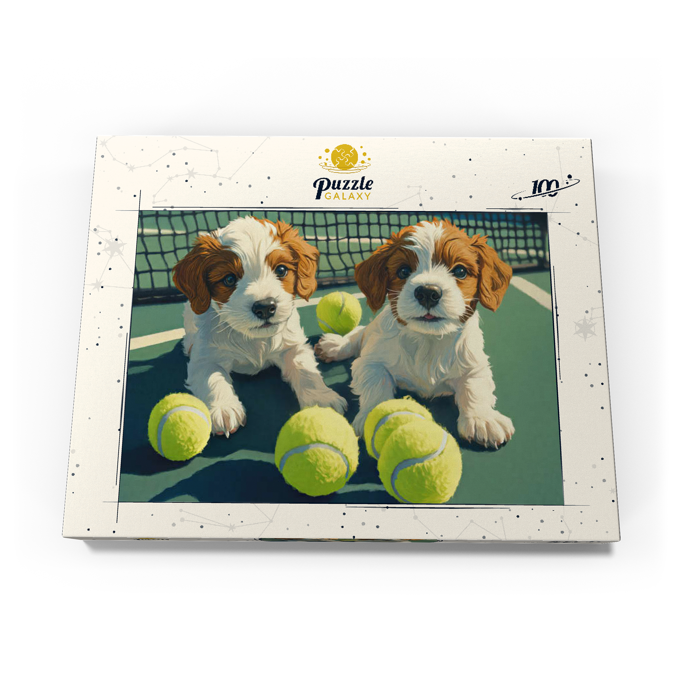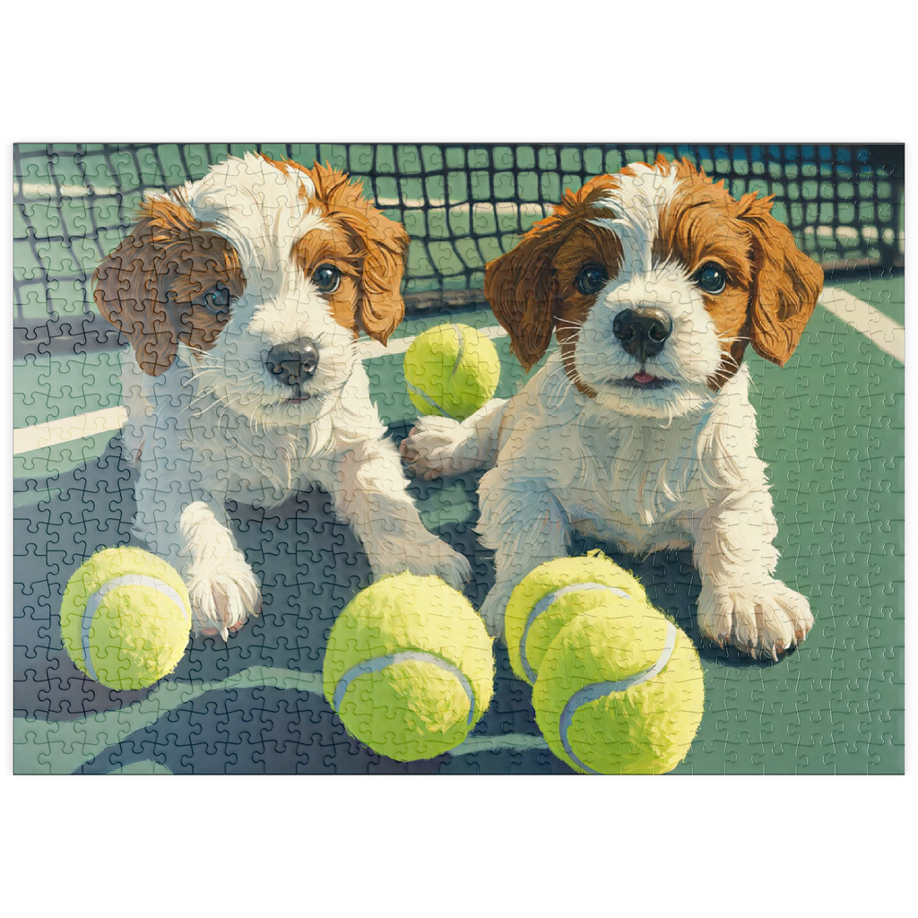 Diese entzückende Szene zeigt zwei verspielte Welpen, die sich auf einem sonnigen Tennisplatz ausruhen, umgeben von leuchtend gelben Tennisbällen. Ihr weiches weißes und braunes Fell sowie ihre großen, neugierigen Augen strahlen Charme und Wärme aus. Die kontrastierende grüne Oberfläche des Platzes und das Tennisnetz im Hintergrund verleihen diesem freudigen Moment eine sportliche und zugleich reizvolle Atmosphäre. Eine perfekte Darstellung von jugendlicher Energie und Niedlichkeit.