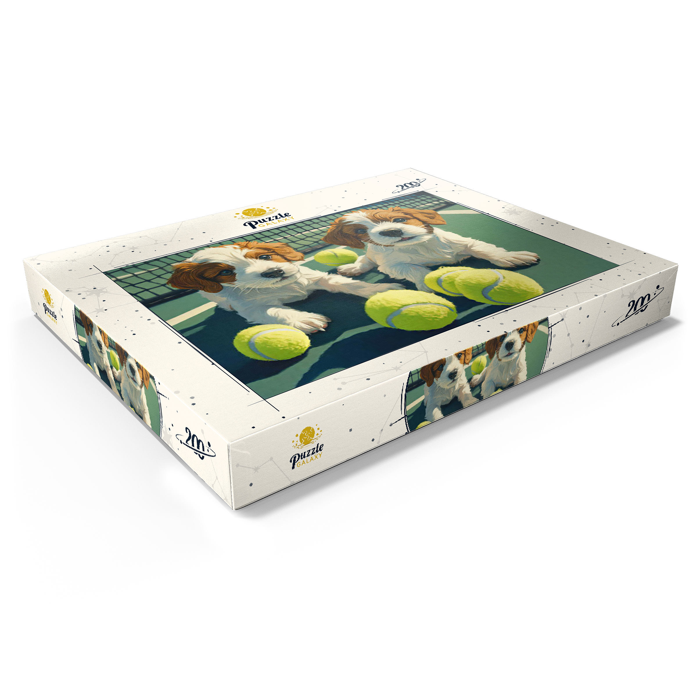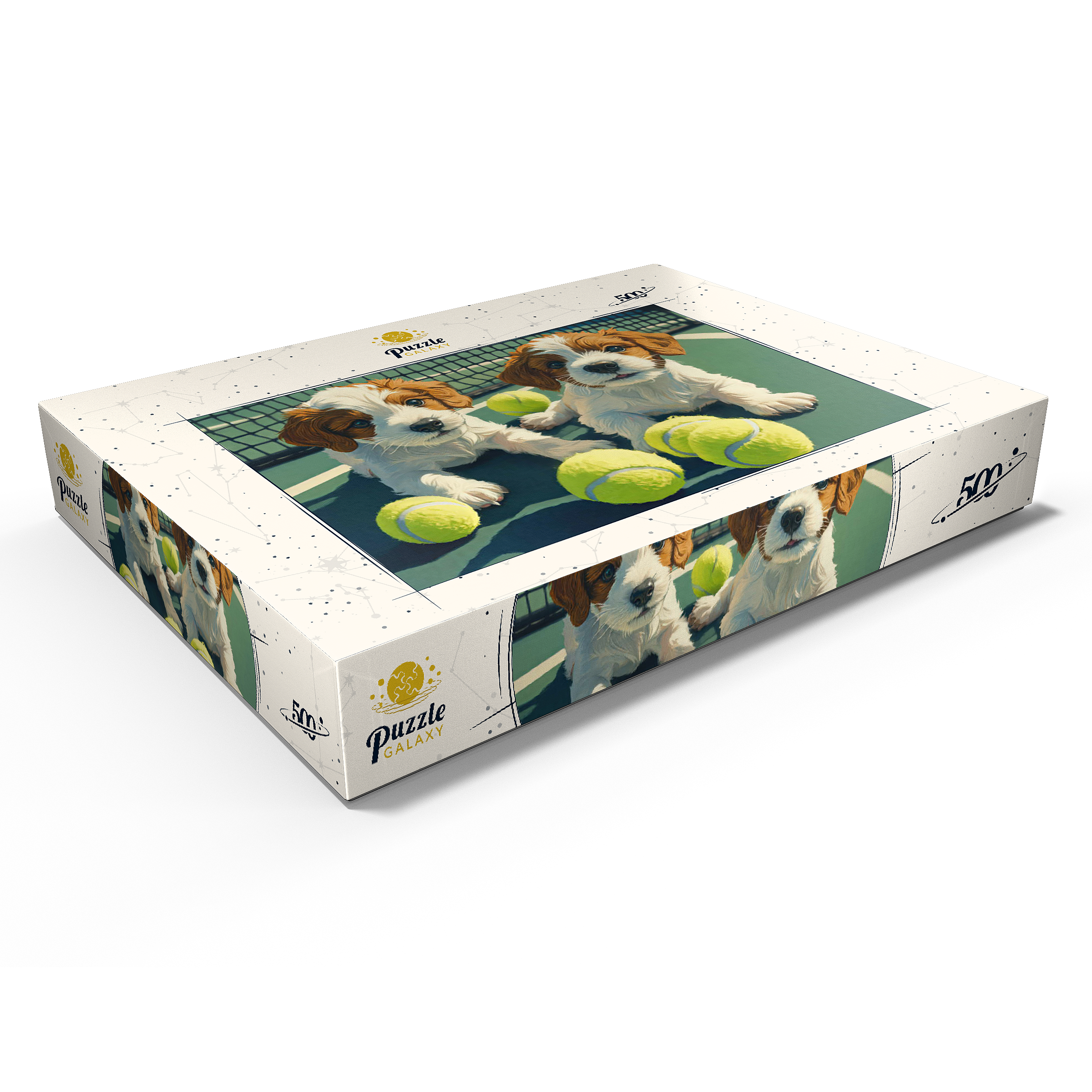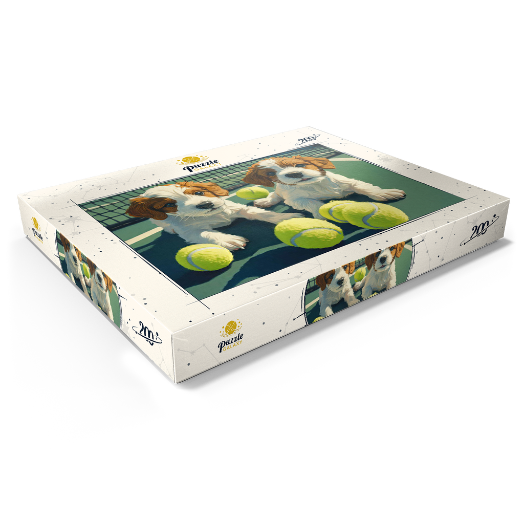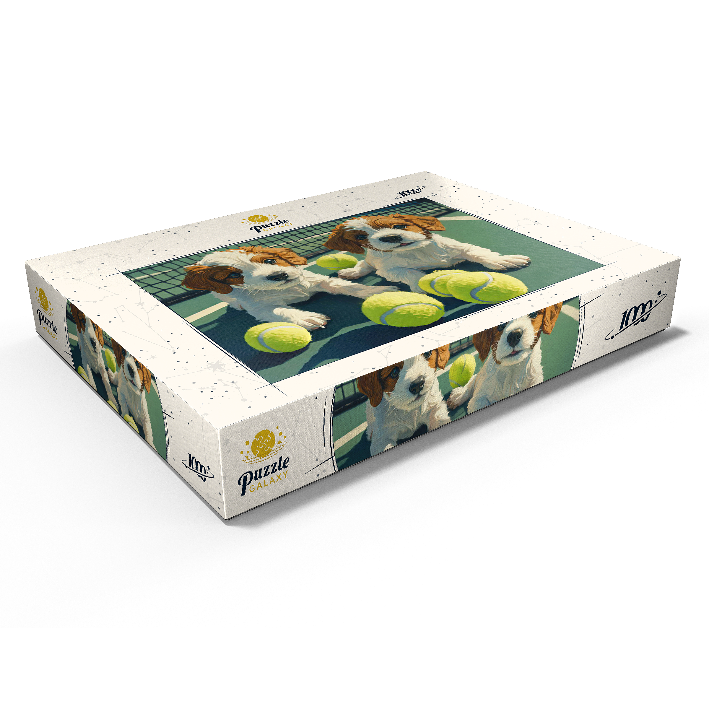 Diese entzückende Szene zeigt zwei verspielte Welpen, die sich auf einem sonnigen Tennisplatz ausruhen, umgeben von leuchtend gelben Tennisbällen. Ihr weiches weißes und braunes Fell sowie ihre großen, neugierigen Augen strahlen Charme und Wärme aus. Die kontrastierende grüne Oberfläche des Platzes und das Tennisnetz im Hintergrund verleihen diesem freudigen Moment eine sportliche und zugleich reizvolle Atmosphäre. Eine perfekte Darstellung von jugendlicher Energie und Niedlichkeit.