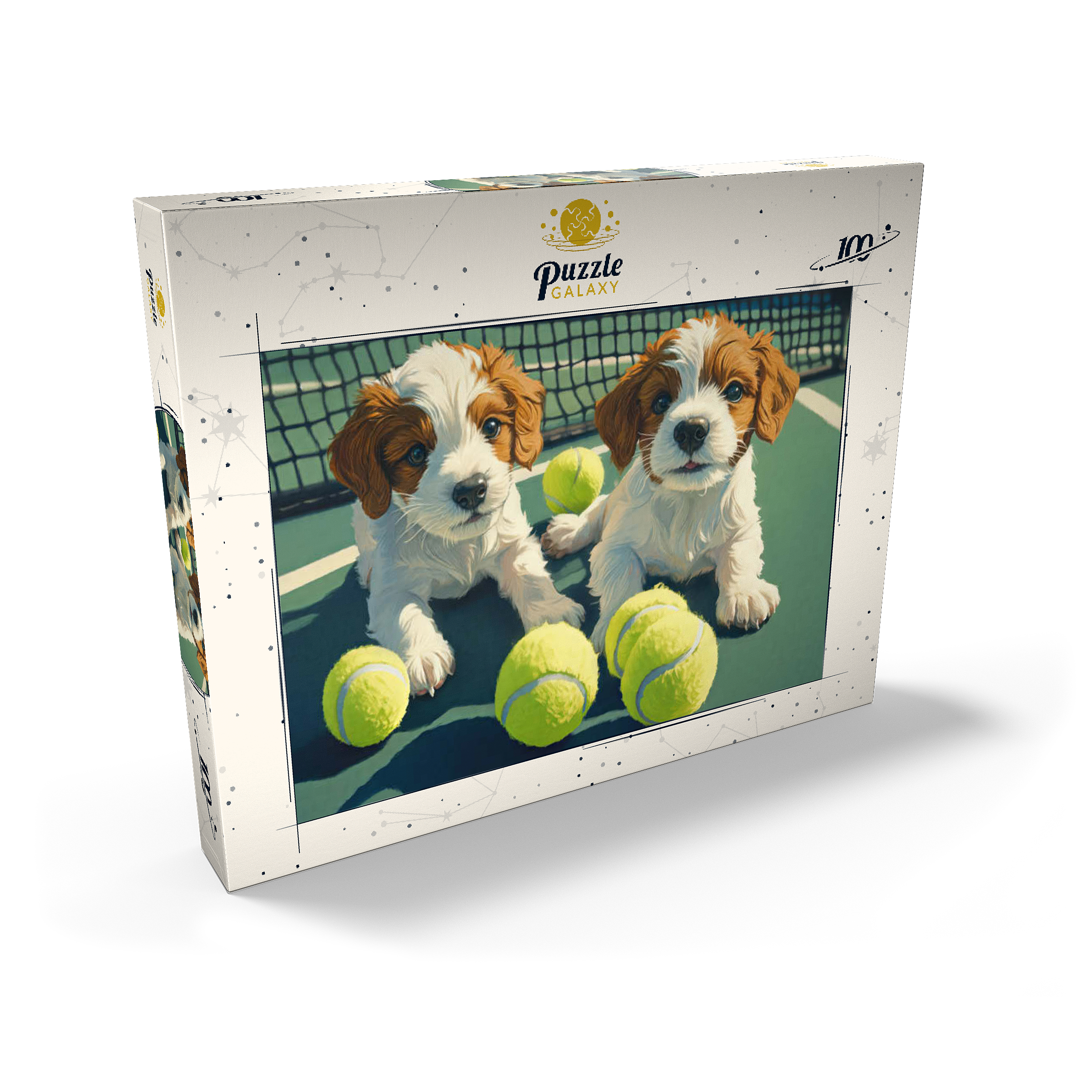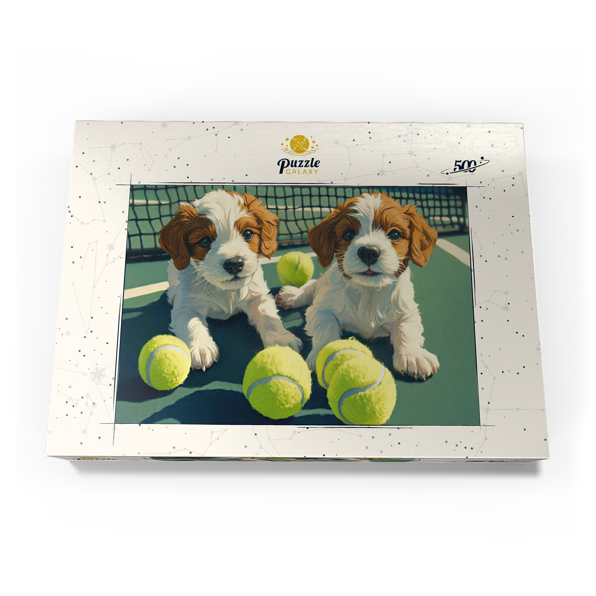 Niedliche Welpen mit Tennisbällen auf dem Platz