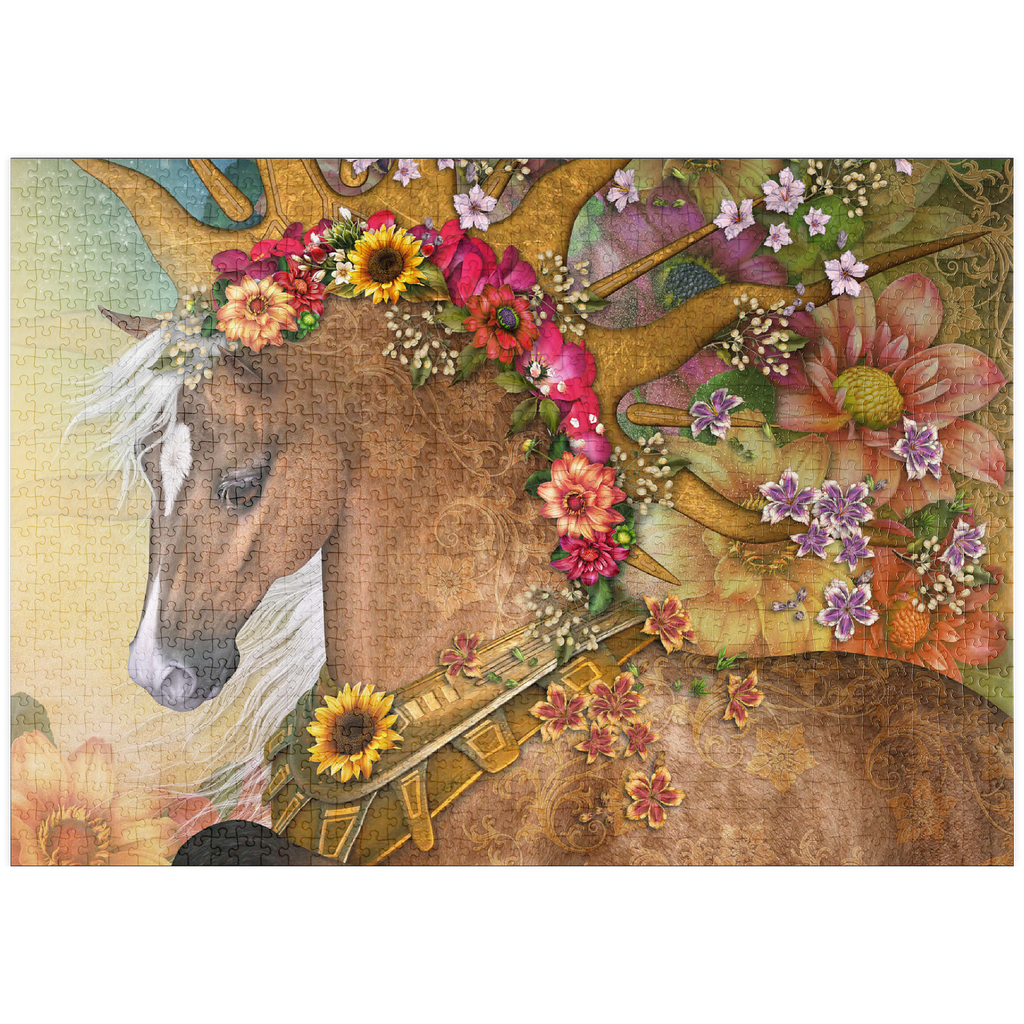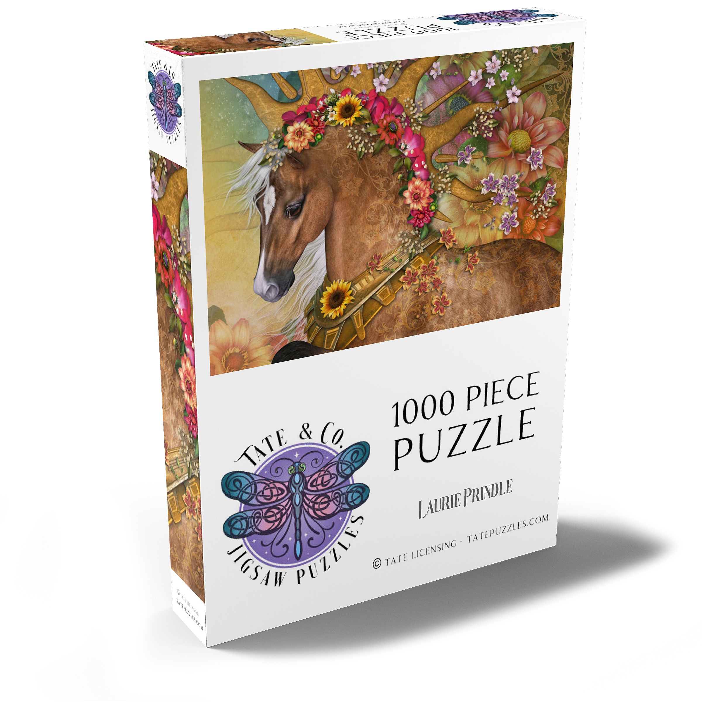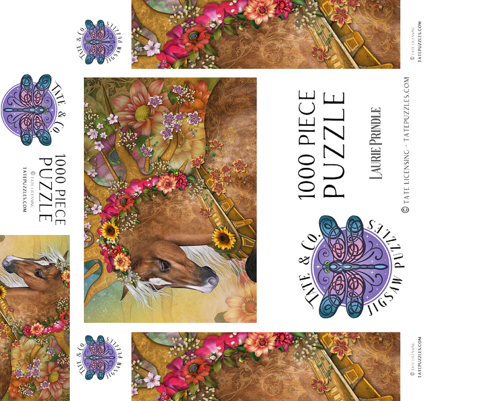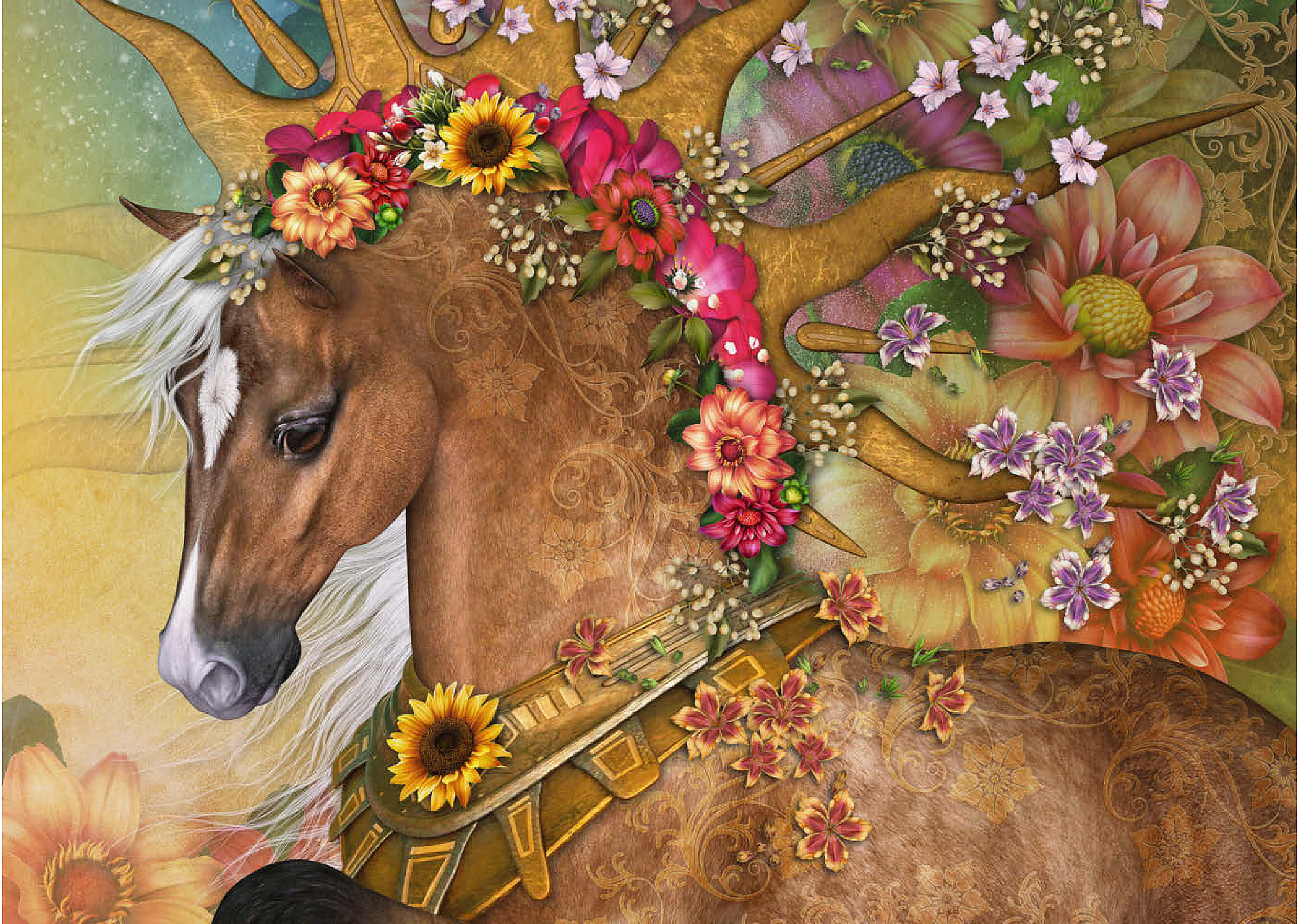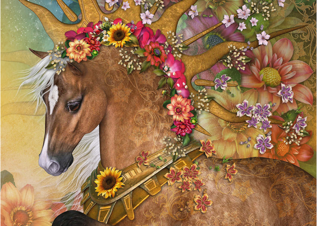 Laurie Prindles „Summer Sunshine“ zeigt ein lebhaftes goldenes Palomino-Pferd, das mit einer aufwendigen goldenen Krone geschmückt ist, die mit einer Fülle bunter Blumen wie Sonnenblumen, Dahlien und verschiedenen bunten Blüten verziert ist. Seine lange, wallende weiße Mähne bildet einen schönen Kontrast zu seinem tiefgoldenen Fell, und ein dekorativer Brustpanzer mit einer Sonnenblume betont seine Brust. Der Hintergrund ist ein Wandteppich aus großen, leuchtend bunten Blumenmustern, der eine starke sommerliche, bohemische und fantasievolle Ästhetik hervorruft und die Fülle der Natur und die Schönheit des Reitsports zelebriert.