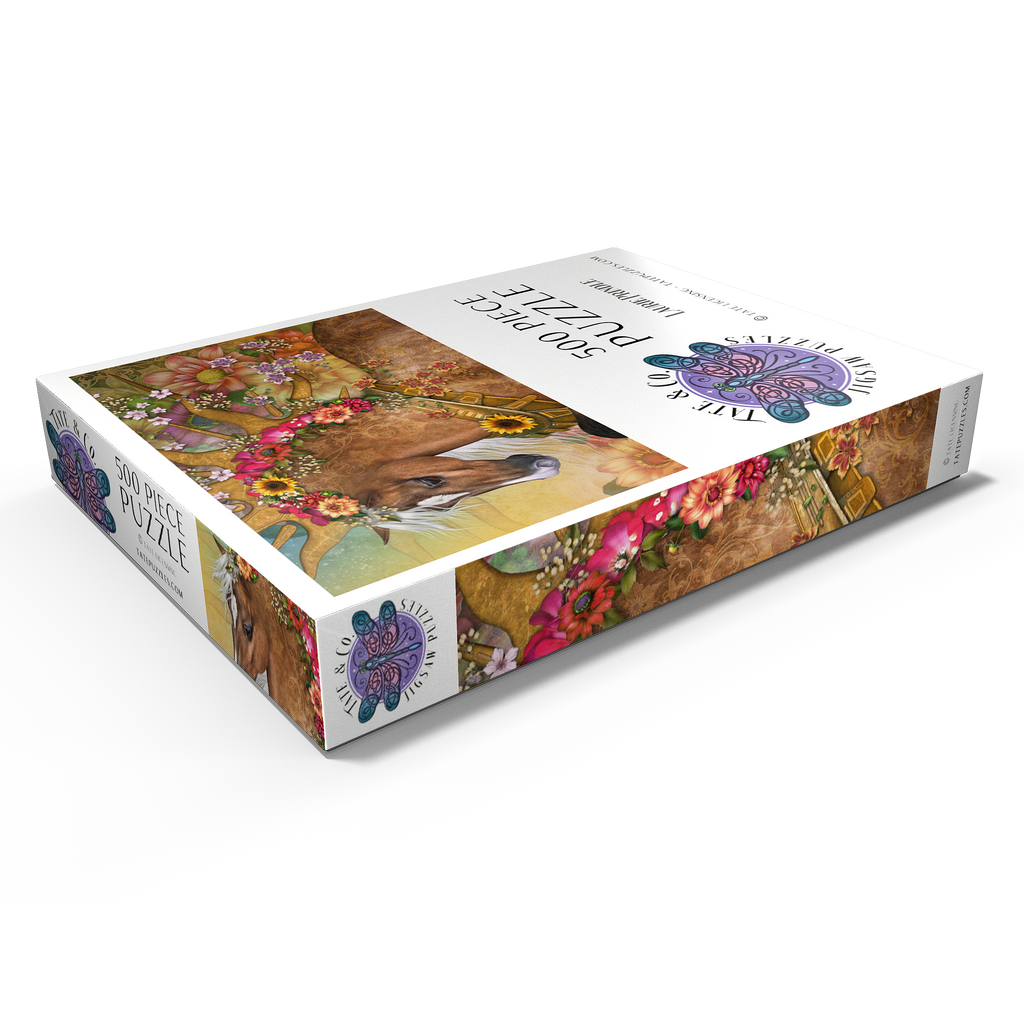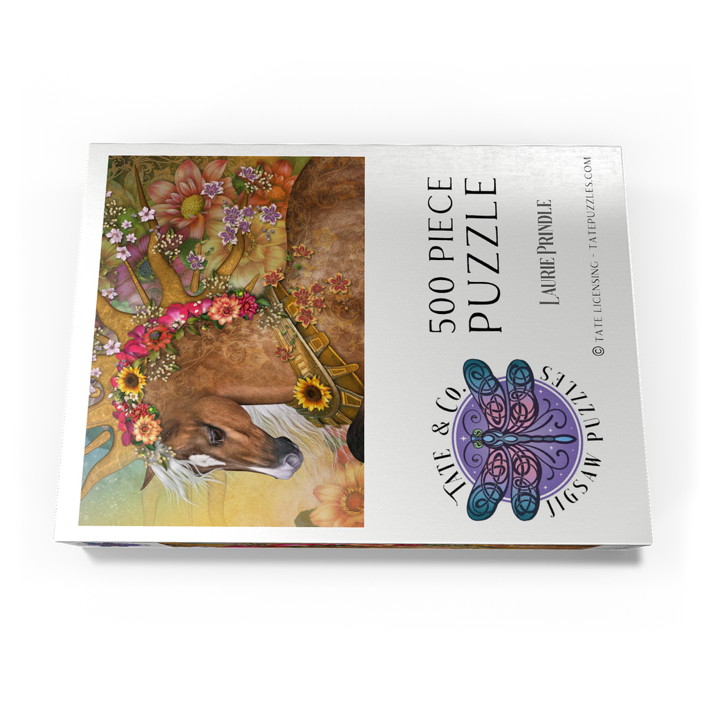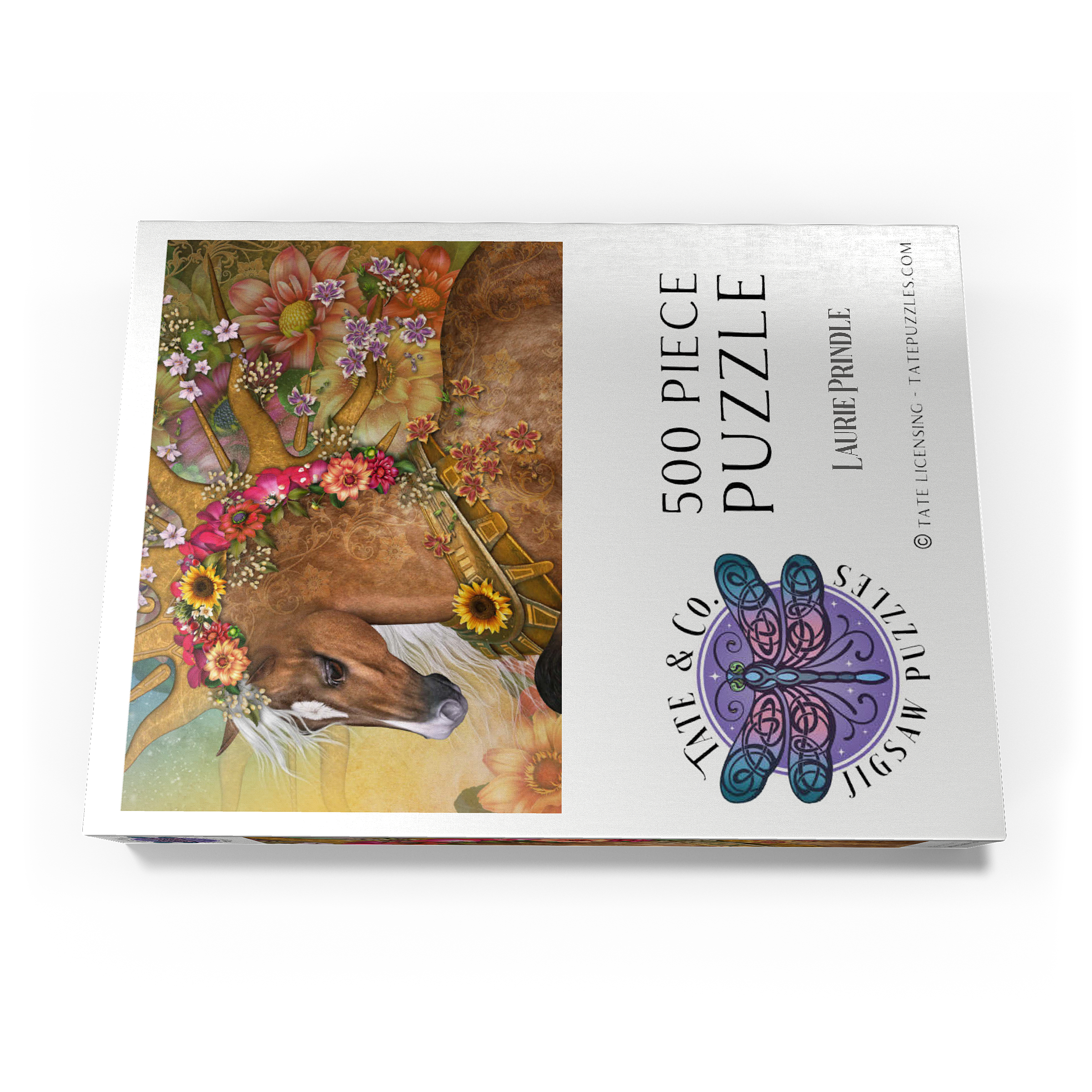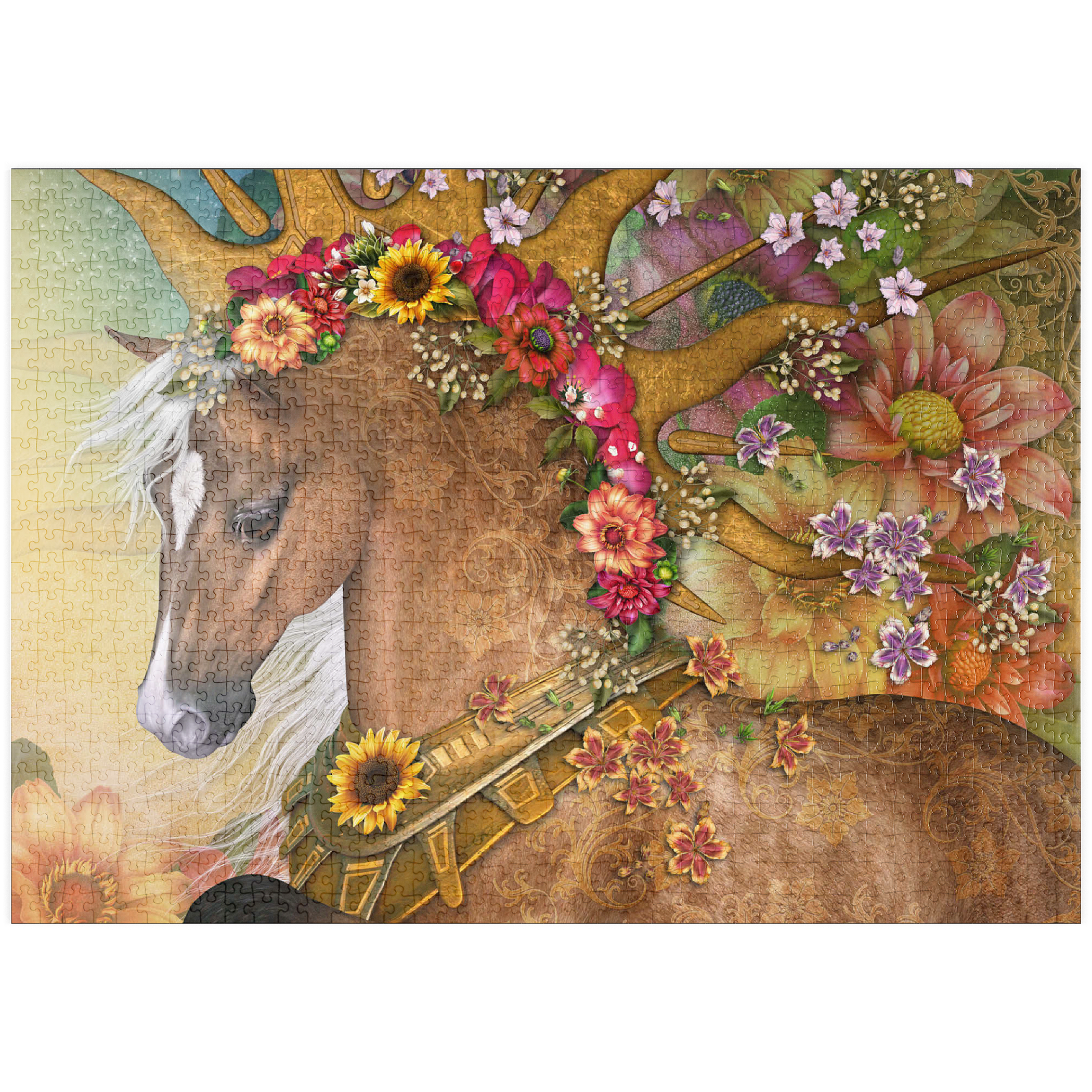 Laurie Prindles „Summer Sunshine“ zeigt ein lebhaftes goldenes Palomino-Pferd, das mit einer aufwendigen goldenen Krone geschmückt ist, die mit einer Fülle bunter Blumen wie Sonnenblumen, Dahlien und verschiedenen bunten Blüten verziert ist. Seine lange, wallende weiße Mähne bildet einen schönen Kontrast zu seinem tiefgoldenen Fell, und ein dekorativer Brustpanzer mit einer Sonnenblume betont seine Brust. Der Hintergrund ist ein Wandteppich aus großen, leuchtend bunten Blumenmustern, der eine starke sommerliche, bohemische und fantasievolle Ästhetik hervorruft und die Fülle der Natur und die Schönheit des Reitsports zelebriert.