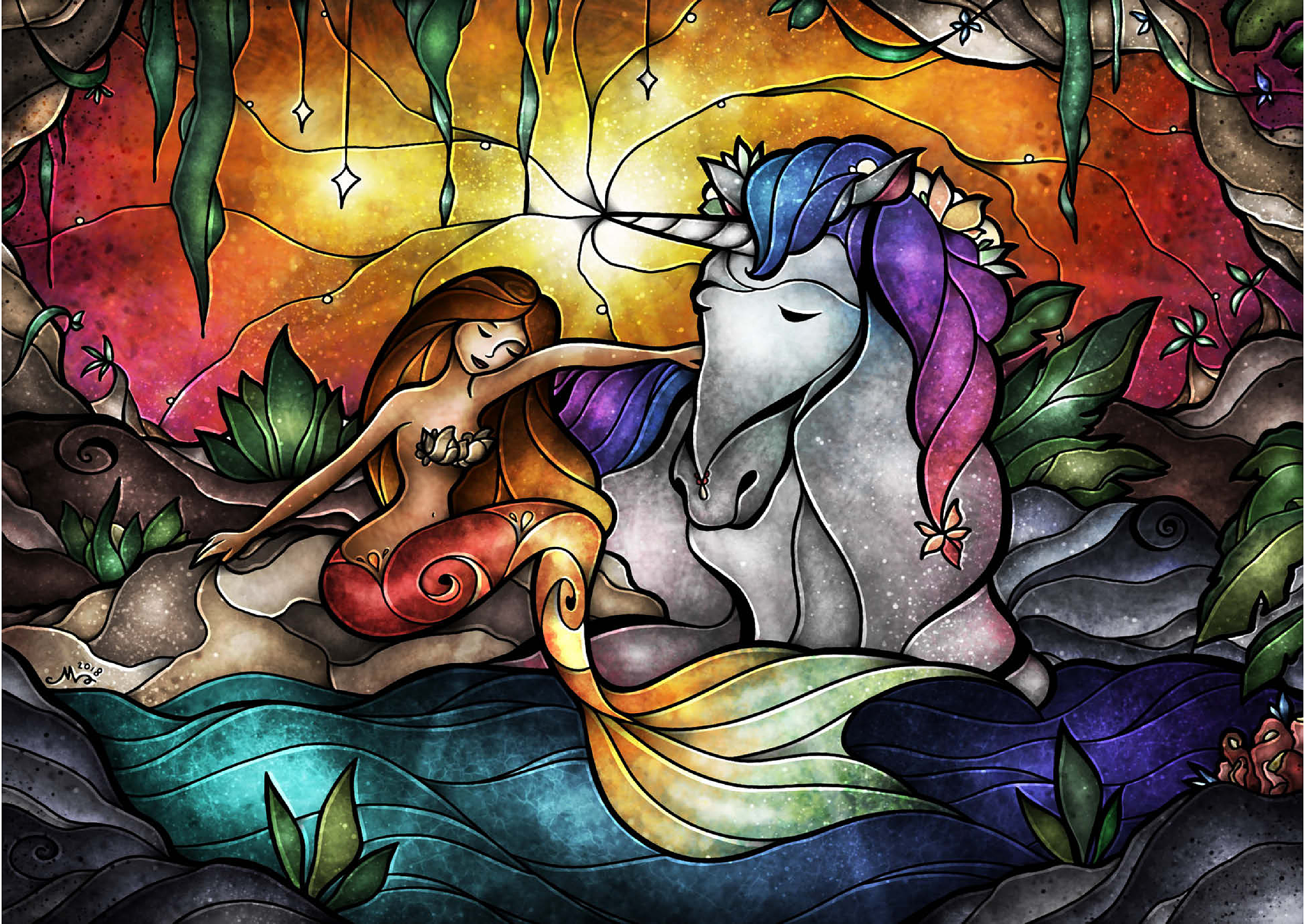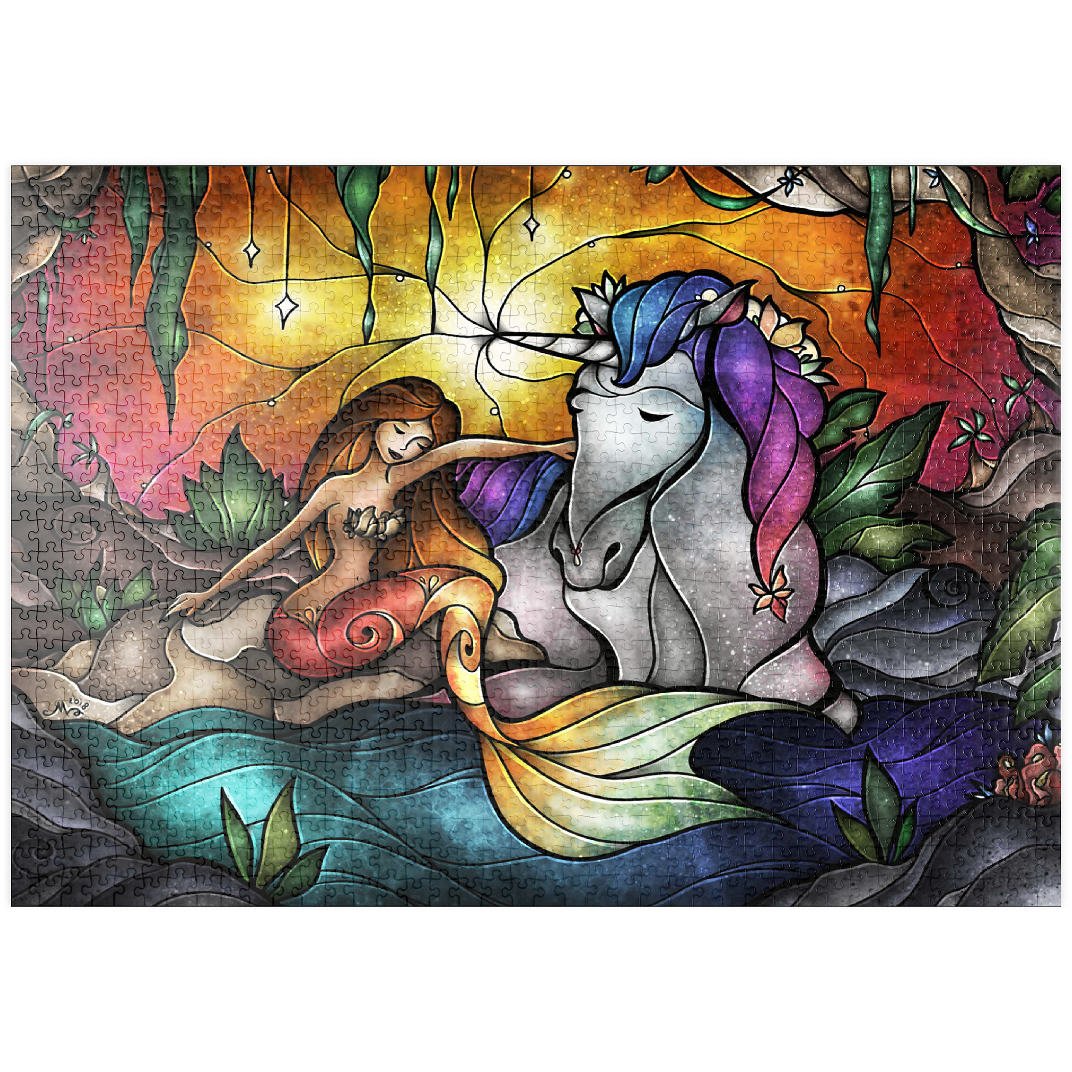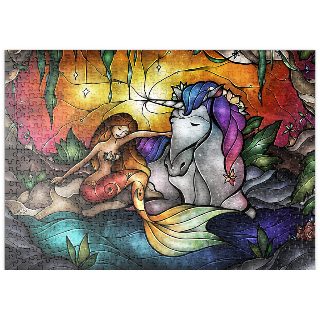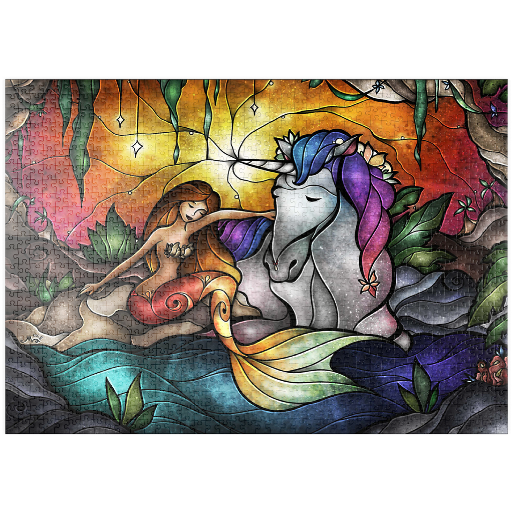 Setzen Sie diese herzerwärmende Szene der Freundschaft in einer mystischen Grotte zusammen! Eine strahlende Meerjungfrau mit schimmernder Flosse teilt einen zärtlichen Moment mit einem majestätischen Einhorn, dessen Horn sanft leuchtet. Umgeben von üppigem Laub und einem warmen, ätherischen Licht, verbindet sie eine Verbindung, die Welten übersteigt. Entdecken Sie diese bezaubernde Verbindung zwischen zwei mythischen Wesen.