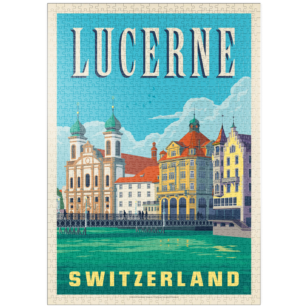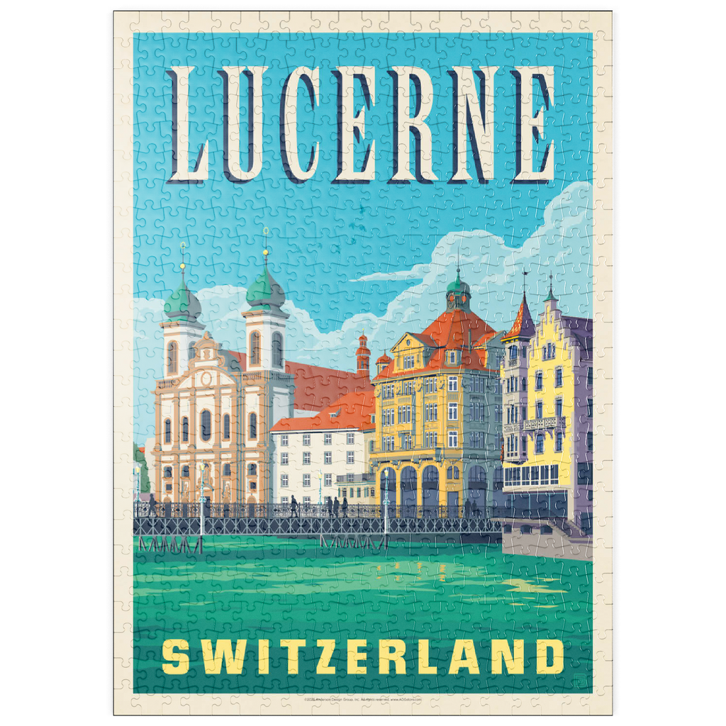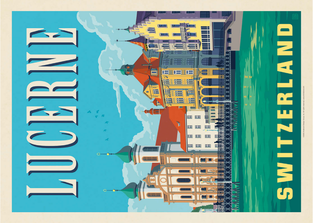 Diese wunderschön illustrierte Szene zeigt Luzern in der Schweiz mit seiner ikonischen Architektur am Seeufer und den kunstvollen Zwillingstürmen der Jesuitenkirche entlang der Reuss. Die farbenfrohen Fassaden der historischen Gebäude, die sich im türkisfarbenen Wasser spiegeln, fangen den Charme dieser malerischen Schweizer Stadt ein. Luzern ist bekannt für seine mittelalterlichen Brücken, die alpine Kulisse und seine kulturellen Sehenswürdigkeiten und ein beliebtes Reiseziel in der Zentralschweiz. Das detailreiche Kunstwerk unterstreicht die elegante Mischung aus Barock, Gotik und traditionellen Stilen und bietet einen zeitlosen Blick auf eine der beliebtesten Städte Europas am Wasser.