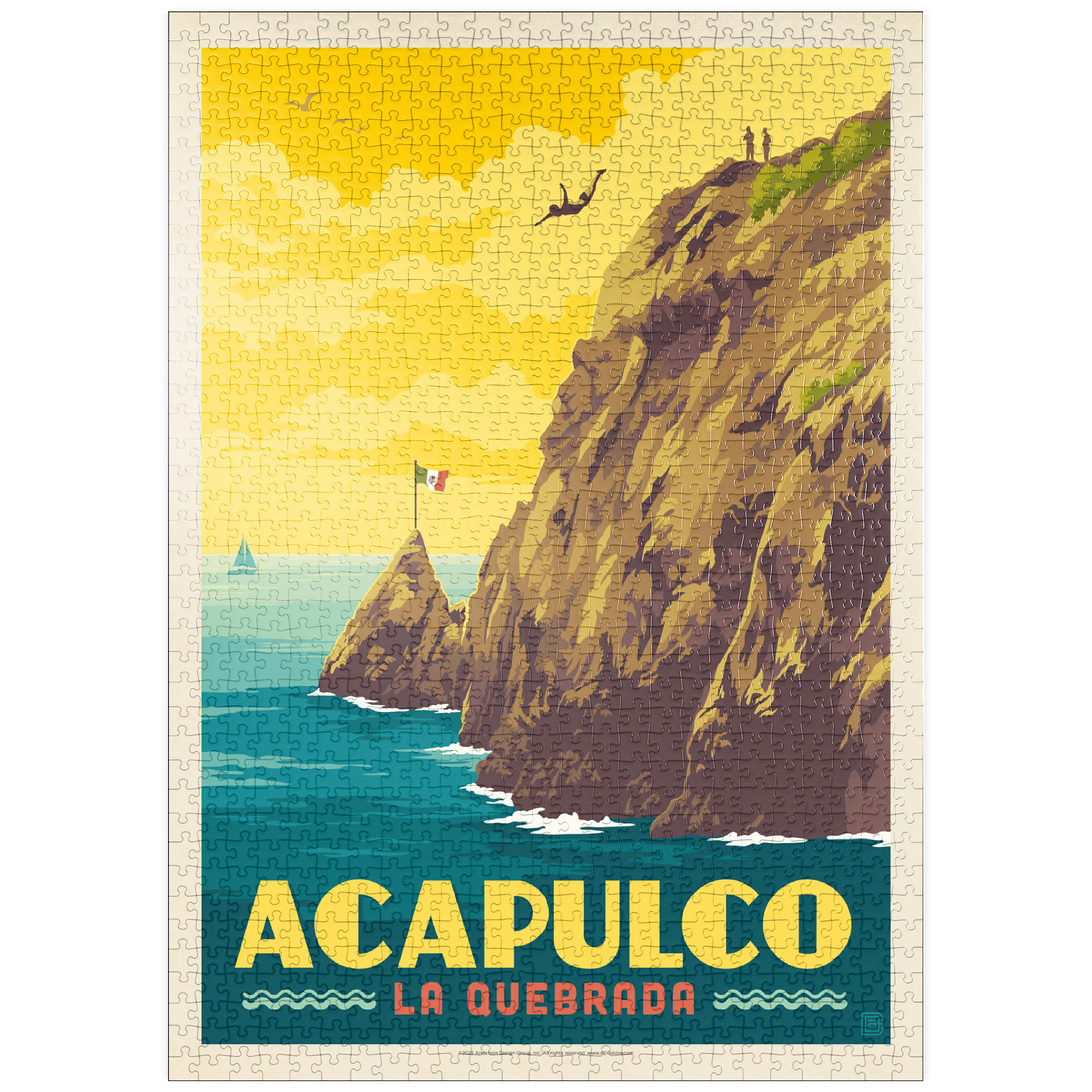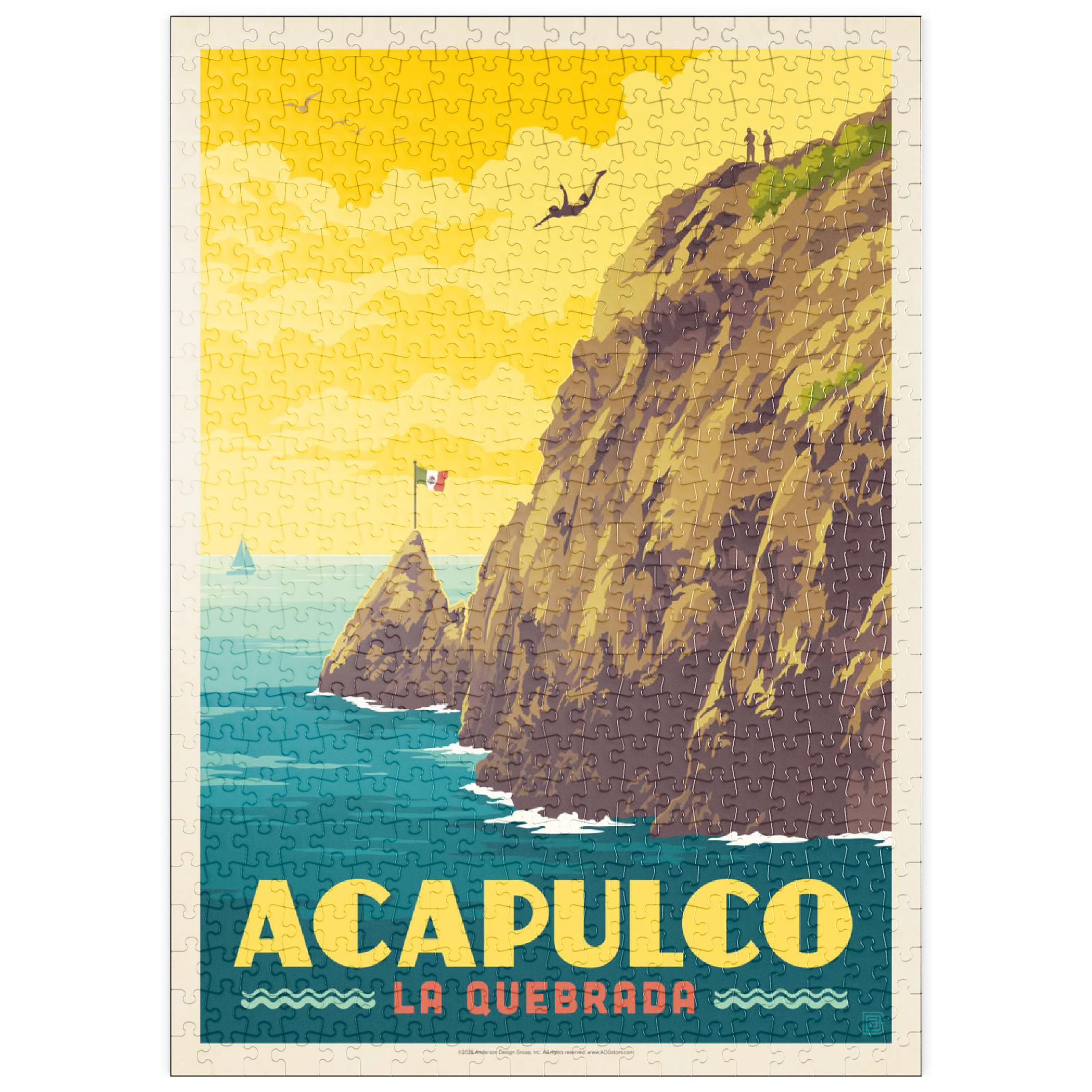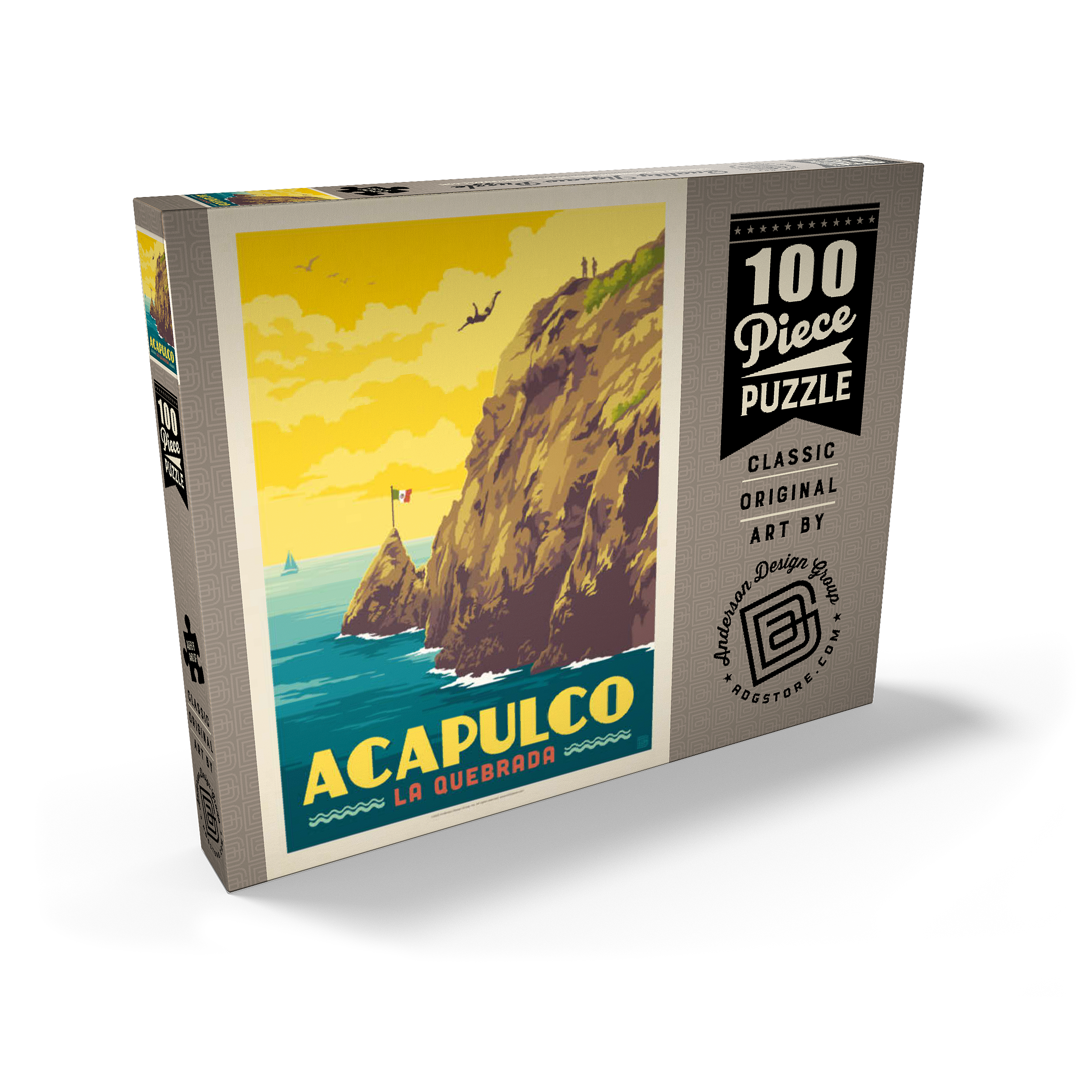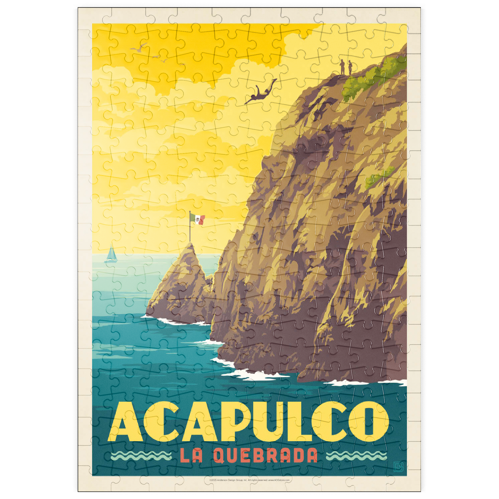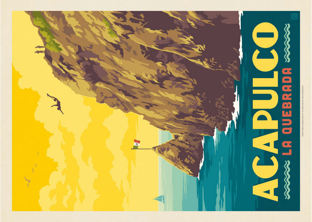 La Quebrada in Acapulco, Mexiko, ist weltberühmt für seine waghalsigen Klippenspringer, die von hoch aufragenden Felsformationen in den Pazifischen Ozean springen. Dieses dynamische Kunstwerk zeigt einen dramatischen Sprung in der Luft bei Sonnenuntergang und fängt den Nervenkitzel und die Tradition dieses ikonischen Küstenspektakels ein. Die zerklüfteten Klippen ragen steil über dem türkisfarbenen Wasser empor, mit einer mexikanischen Flagge auf einem Felsvorsprung und Silhouetten vor einem goldenen Himmel. Als eine der Hauptattraktionen von Acapulco verbindet La Quebrada natürliche Schönheit mit adrenalingeladenen Darbietungen und zieht Besucher aus aller Welt an, die dieses einzigartige Schauspiel von Geschicklichkeit und Mut miterleben möchten.