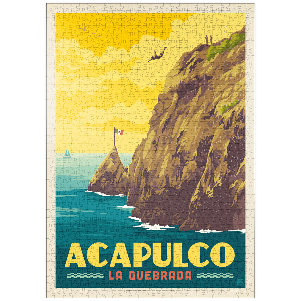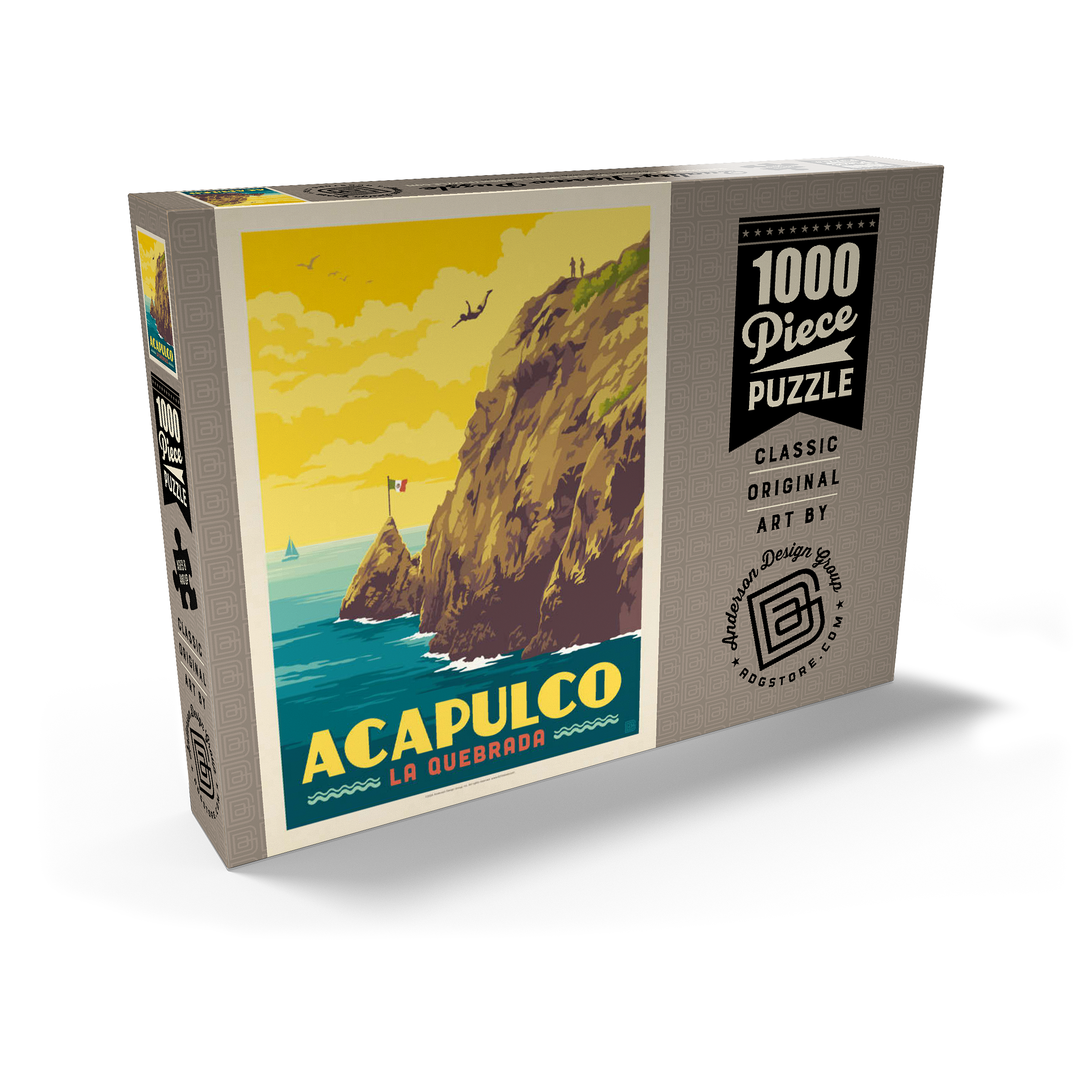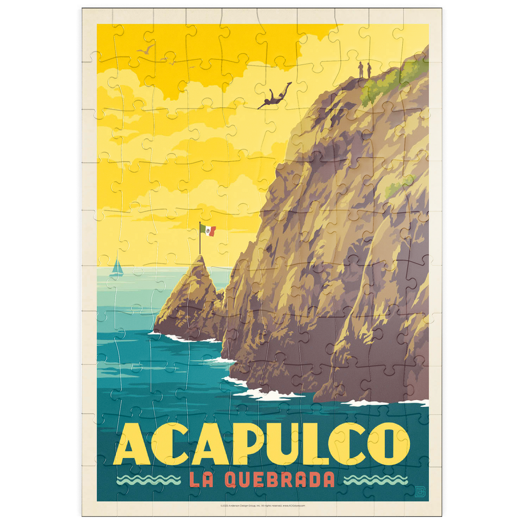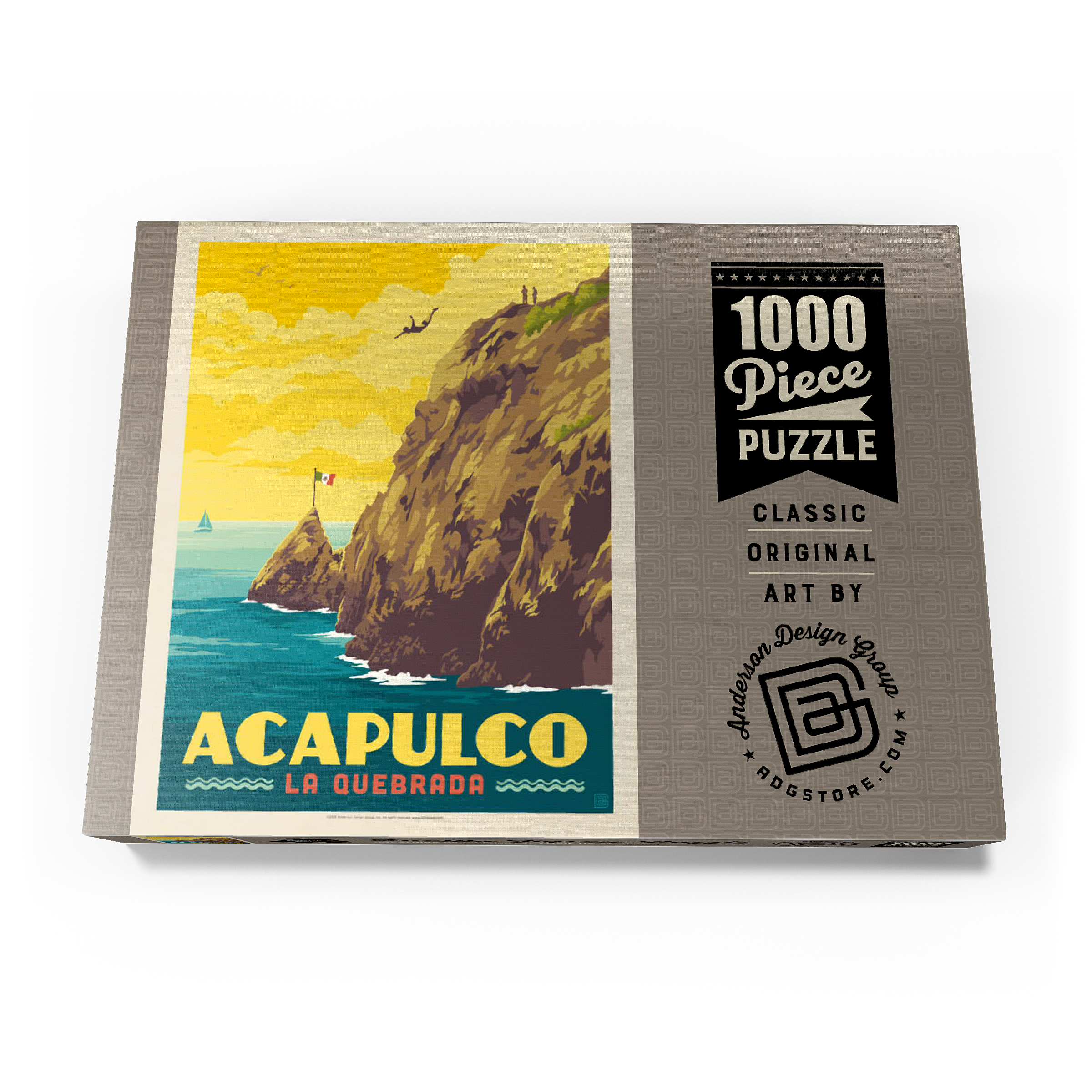 La Quebrada in Acapulco, Mexiko, ist weltberühmt für seine waghalsigen Klippenspringer, die von hoch aufragenden Felsformationen in den Pazifischen Ozean springen. Dieses dynamische Kunstwerk zeigt einen dramatischen Sprung in der Luft bei Sonnenuntergang und fängt den Nervenkitzel und die Tradition dieses ikonischen Küstenspektakels ein. Die zerklüfteten Klippen ragen steil über dem türkisfarbenen Wasser empor, mit einer mexikanischen Flagge auf einem Felsvorsprung und Silhouetten vor einem goldenen Himmel. Als eine der Hauptattraktionen von Acapulco verbindet La Quebrada natürliche Schönheit mit adrenalingeladenen Darbietungen und zieht Besucher aus aller Welt an, die dieses einzigartige Schauspiel von Geschicklichkeit und Mut miterleben möchten.