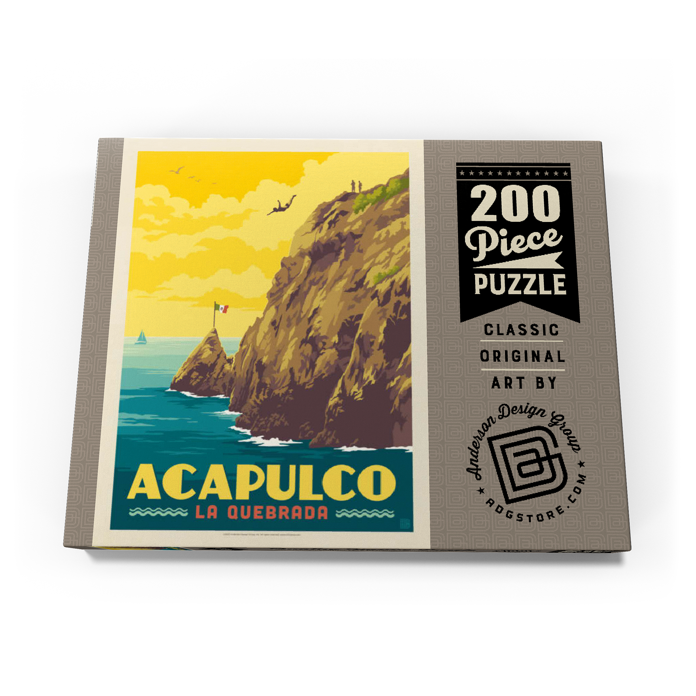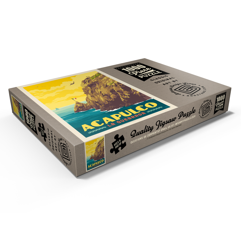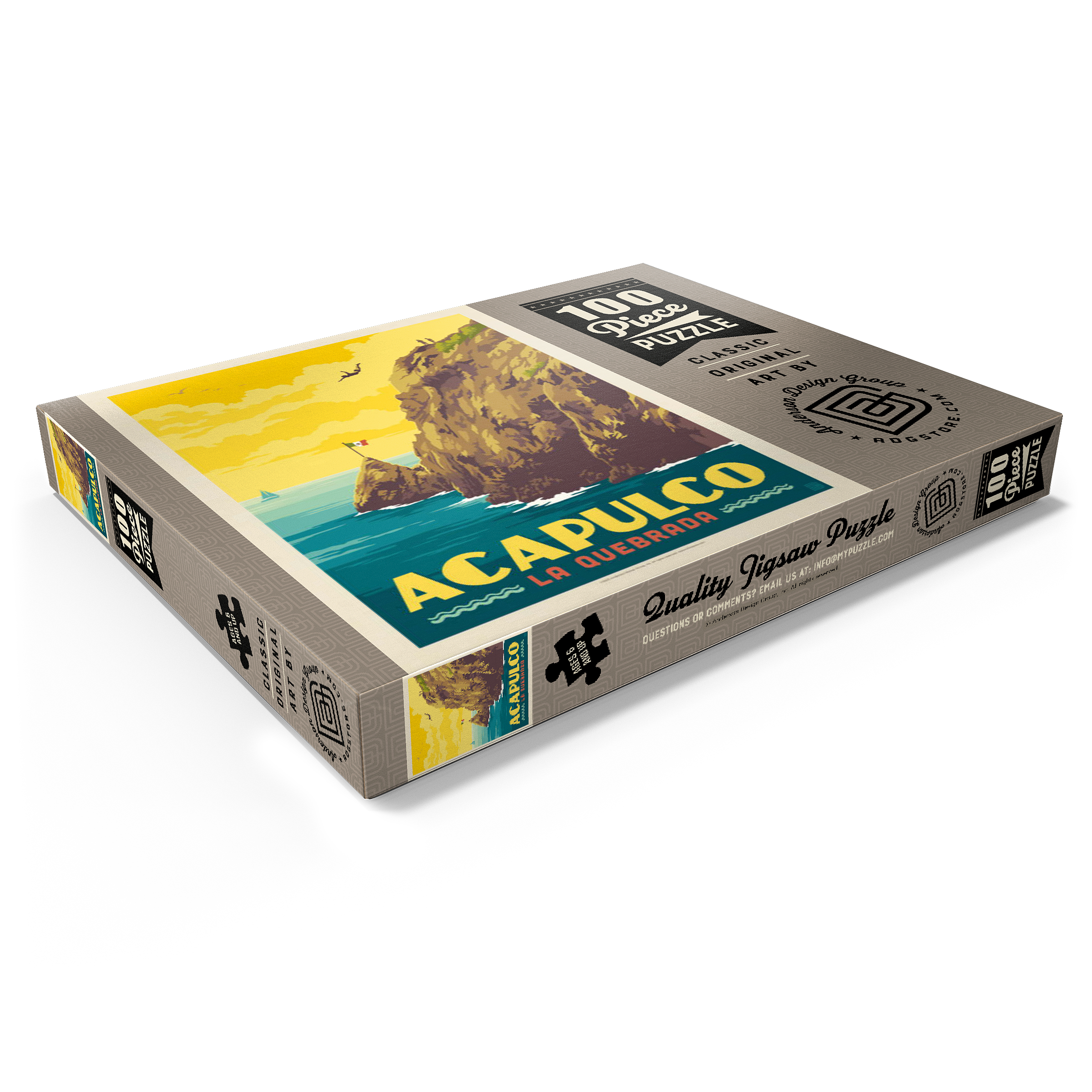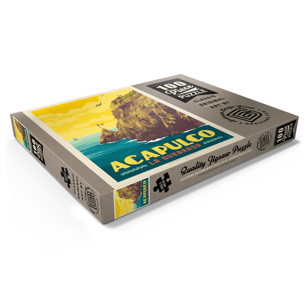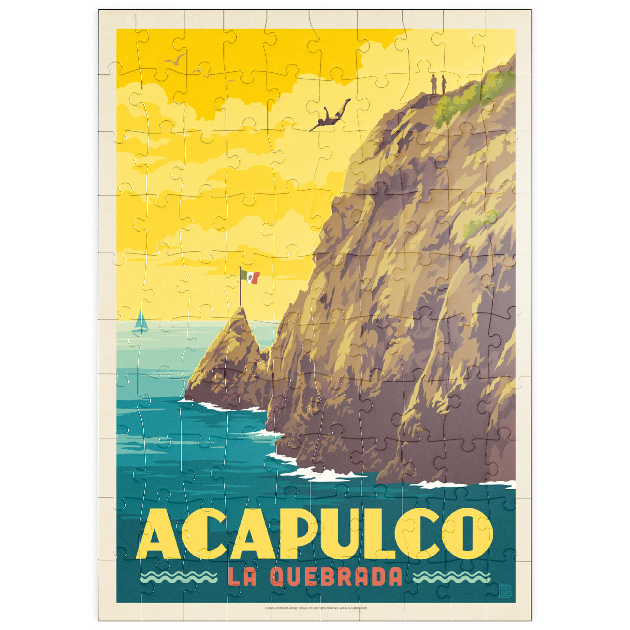 La Quebrada in Acapulco, Mexiko, ist weltberühmt für seine waghalsigen Klippenspringer, die von hoch aufragenden Felsformationen in den Pazifischen Ozean springen. Dieses dynamische Kunstwerk zeigt einen dramatischen Sprung in der Luft bei Sonnenuntergang und fängt den Nervenkitzel und die Tradition dieses ikonischen Küstenspektakels ein. Die zerklüfteten Klippen ragen steil über dem türkisfarbenen Wasser empor, mit einer mexikanischen Flagge auf einem Felsvorsprung und Silhouetten vor einem goldenen Himmel. Als eine der Hauptattraktionen von Acapulco verbindet La Quebrada natürliche Schönheit mit adrenalingeladenen Darbietungen und zieht Besucher aus aller Welt an, die dieses einzigartige Schauspiel von Geschicklichkeit und Mut miterleben möchten.
