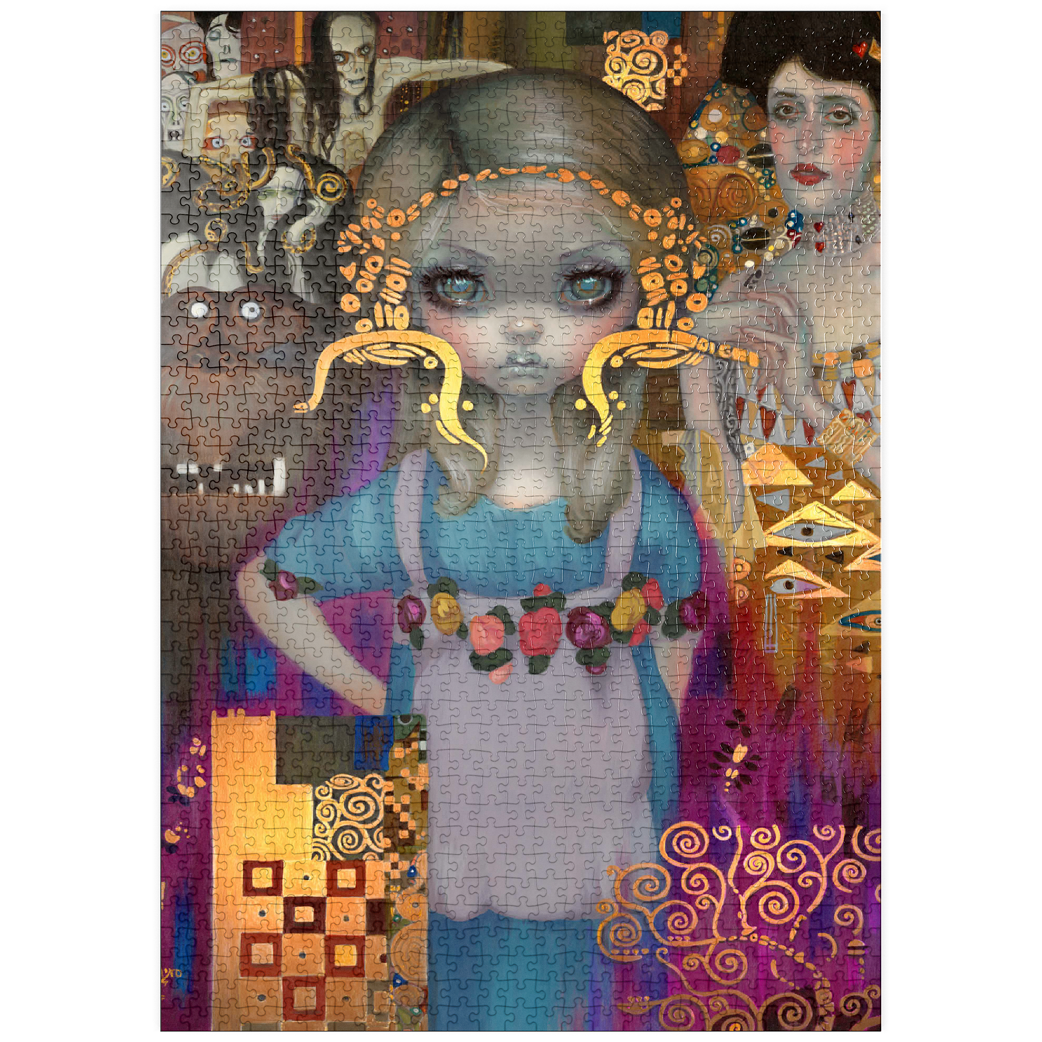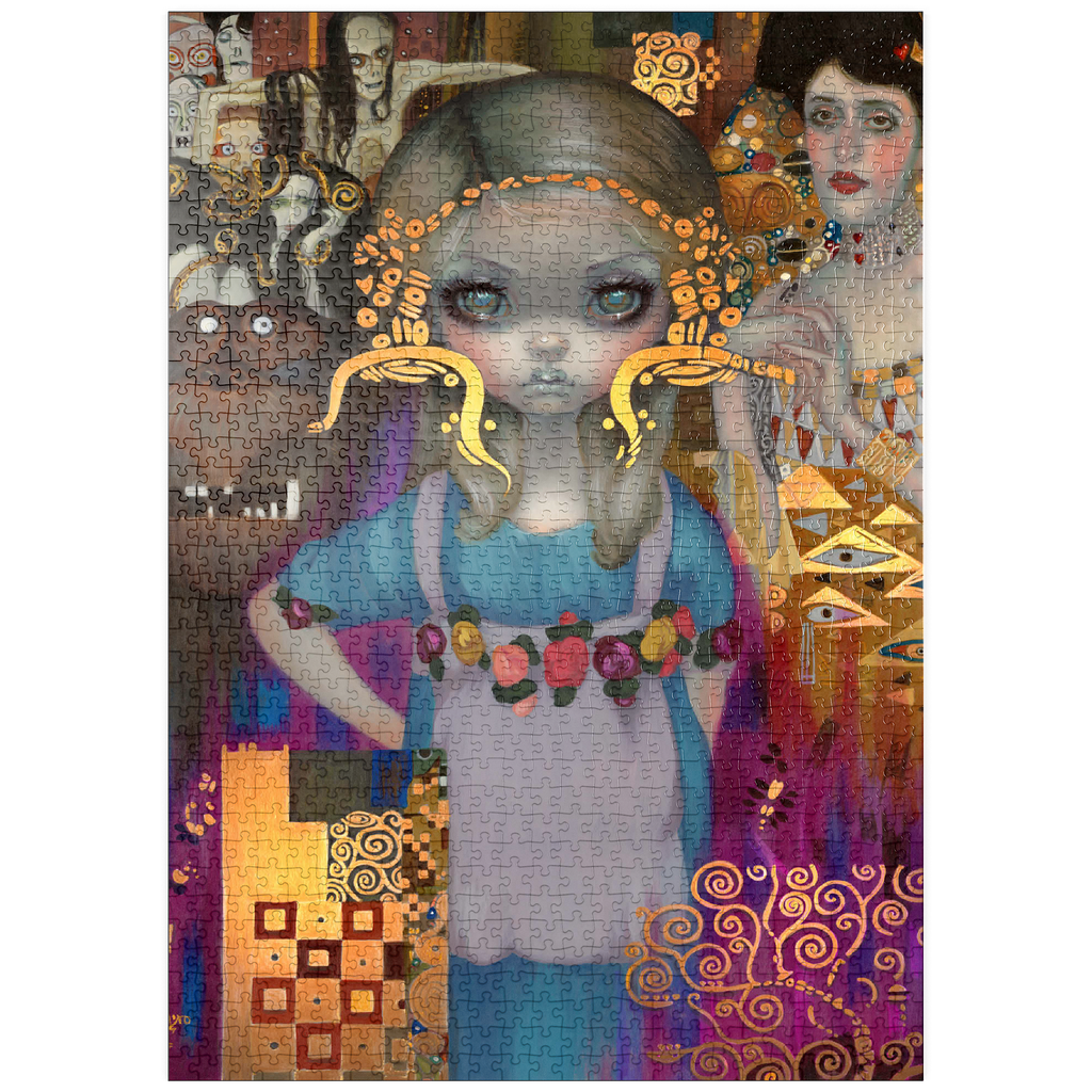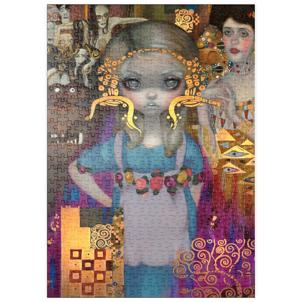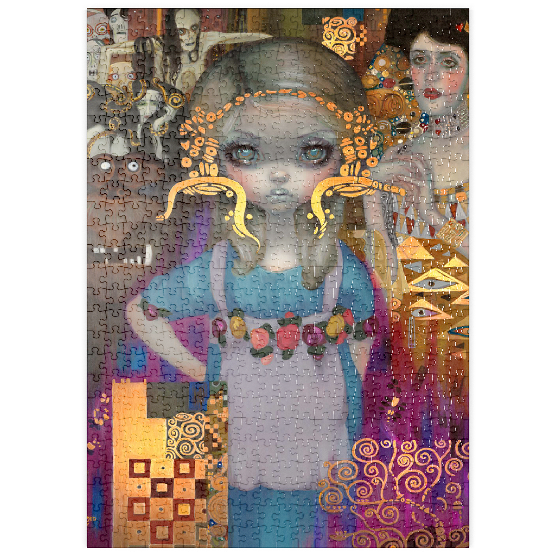Setzen Sie ein goldenes Zeitalter der Kunst zusammen mit dem Puzzle -Alice in a Klimt Dream-! Dieses einzigartige Puzzle verbindet Alice im Wunderland mit dem kultigen Jugendstil von Gustav Klimt. Entdecken Sie wirbelnde Muster, symbolische Figuren und einen Hauch von Herzkönigin Unfug. Ein anspruchsvolles und schönes Puzzle für Kunstliebhaber und Alice-Fans. Teil der Serie -Alice in Other Lands-.