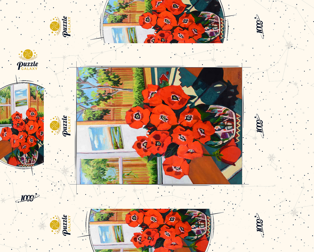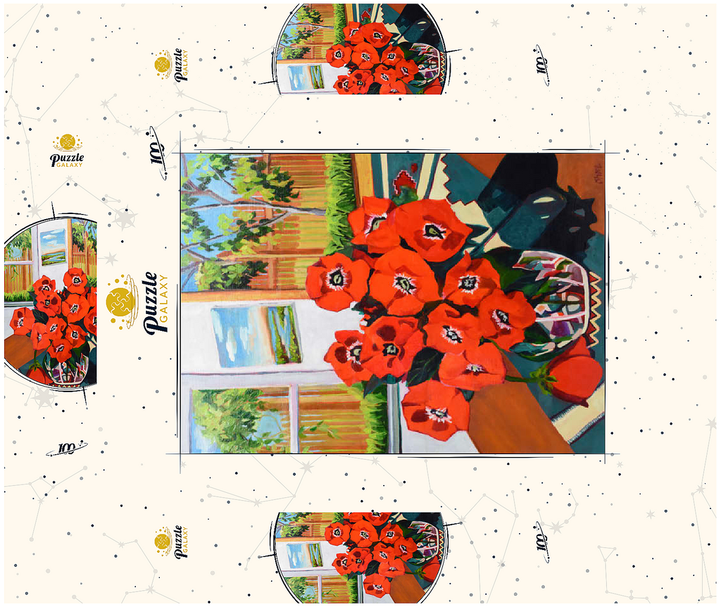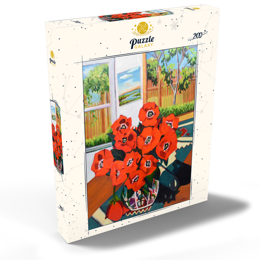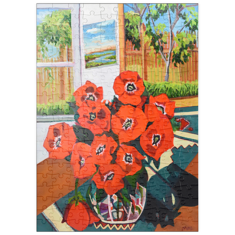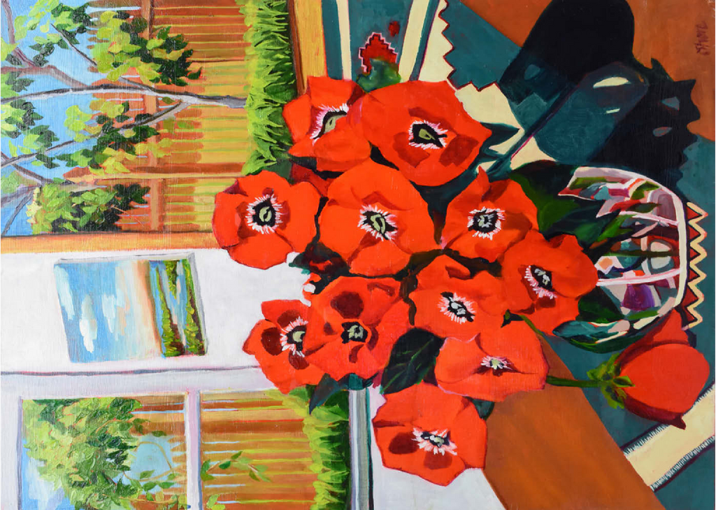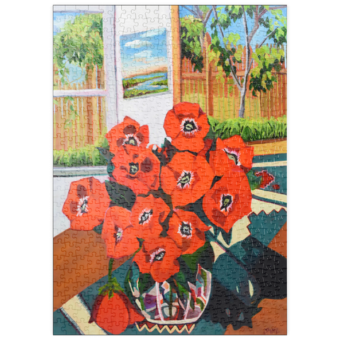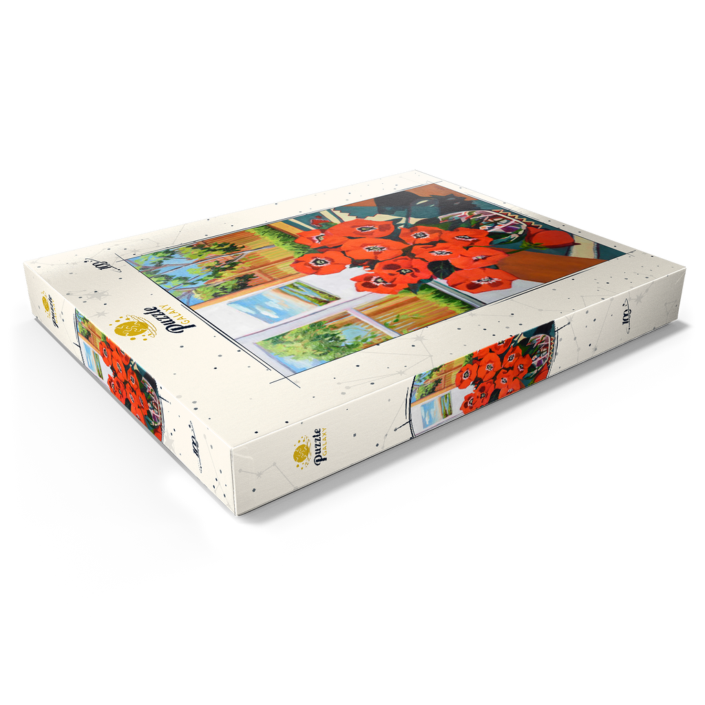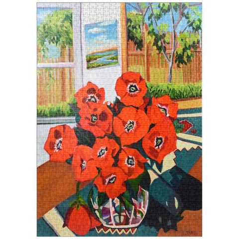 Dieses eindrucksvolle Stillleben zeigt einen leuchtenden Strauß roter Mohnblumen in einer schön gemusterten Vase vor einem sonnenbeschienenen Hintergrund. Der starke Kontrast zwischen tiefgrünen Blättern und feuerroten Blütenblättern schafft eine dynamische Komposition voller Wärme und Energie. Das Sonnenlicht fällt durch das offene Fenster und gibt den Blick auf eine üppige Gartenszene frei, während ein gerahmtes Landschaftsgemälde dem gemütlichen Ambiente zusätzliche Tiefe verleiht. Die ausdrucksstarken Pinselstriche und die reiche Farbpalette verleihen diesem klassischen Blumenarrangement eine moderne Note und machen es zu einem perfekten Stück für Liebhaber zeitgenössischer Stillleben und kühner, von der Natur inspirierter Kunst.