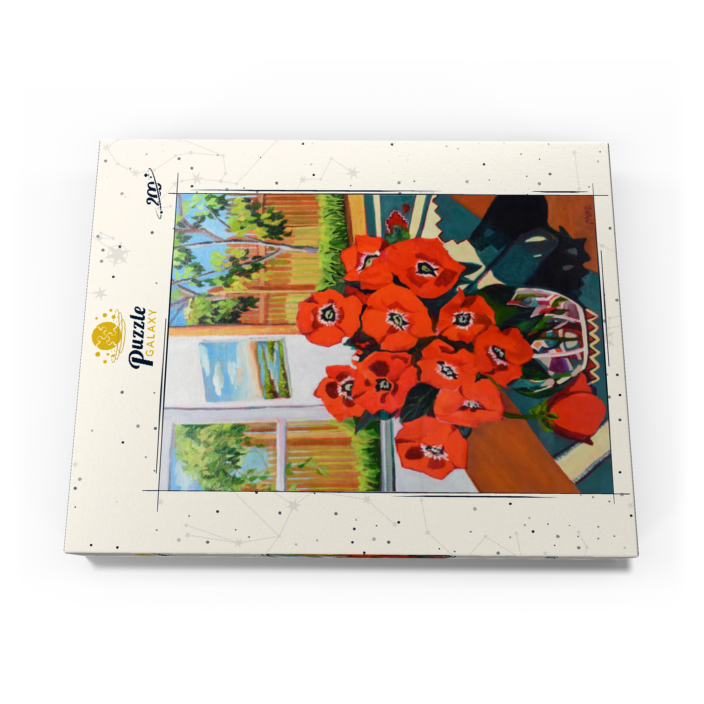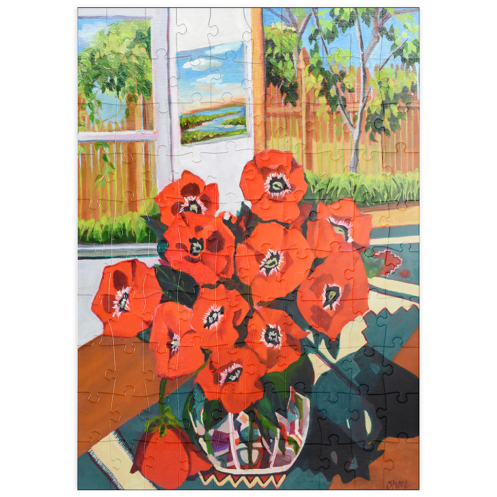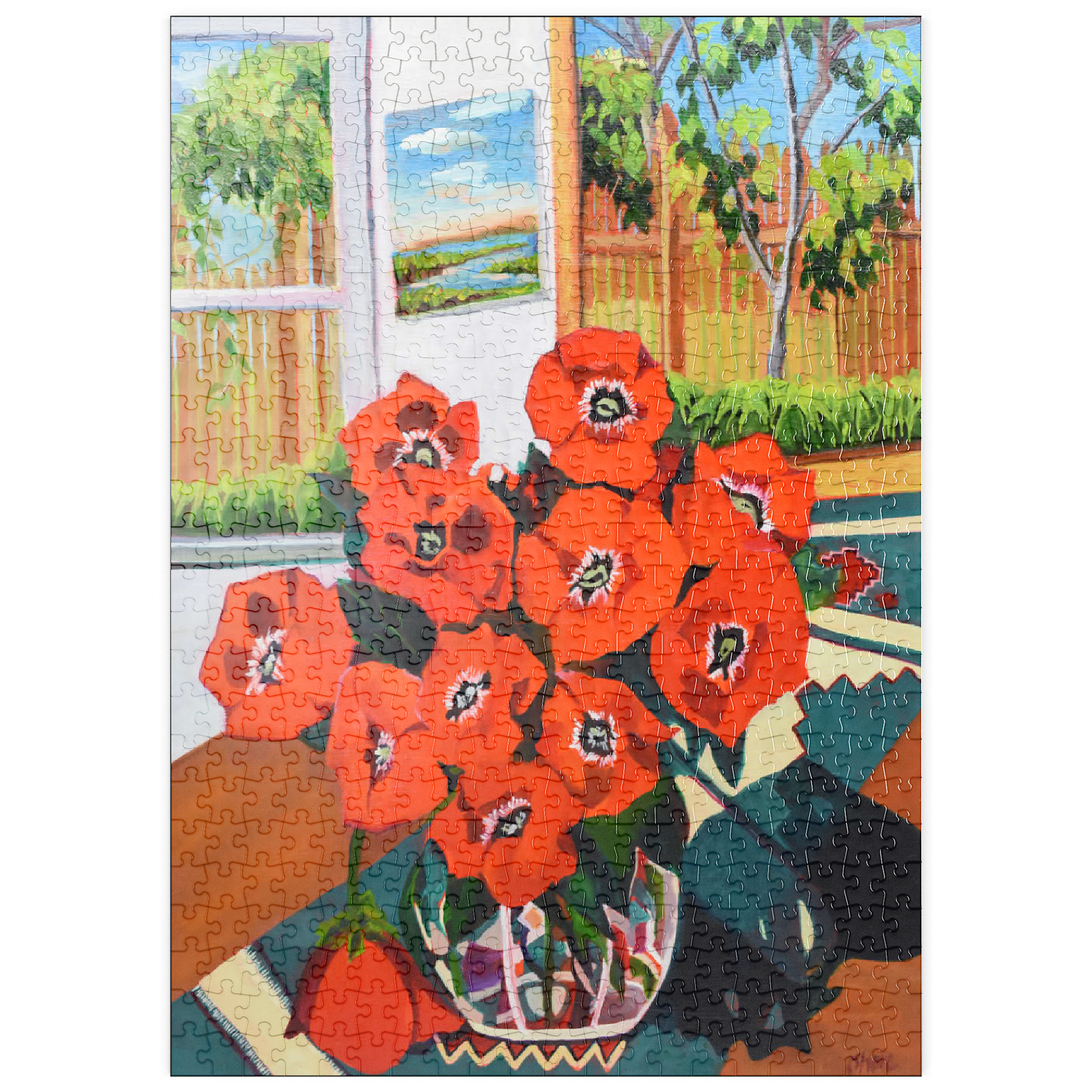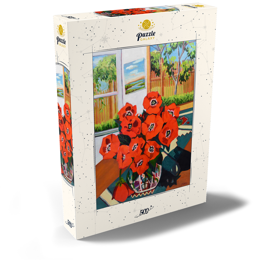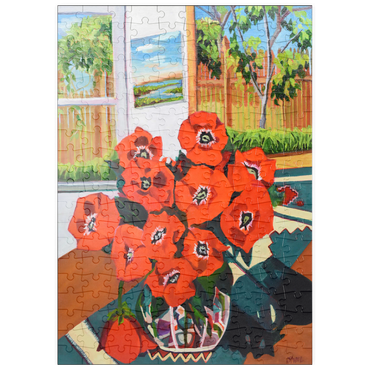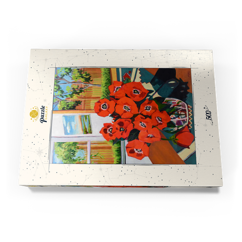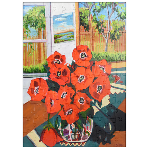 Dieses eindrucksvolle Stillleben zeigt einen leuchtenden Strauß roter Mohnblumen in einer schön gemusterten Vase vor einem sonnenbeschienenen Hintergrund. Der starke Kontrast zwischen tiefgrünen Blättern und feuerroten Blütenblättern schafft eine dynamische Komposition voller Wärme und Energie. Das Sonnenlicht fällt durch das offene Fenster und gibt den Blick auf eine üppige Gartenszene frei, während ein gerahmtes Landschaftsgemälde dem gemütlichen Ambiente zusätzliche Tiefe verleiht. Die ausdrucksstarken Pinselstriche und die reiche Farbpalette verleihen diesem klassischen Blumenarrangement eine moderne Note und machen es zu einem perfekten Stück für Liebhaber zeitgenössischer Stillleben und kühner, von der Natur inspirierter Kunst.