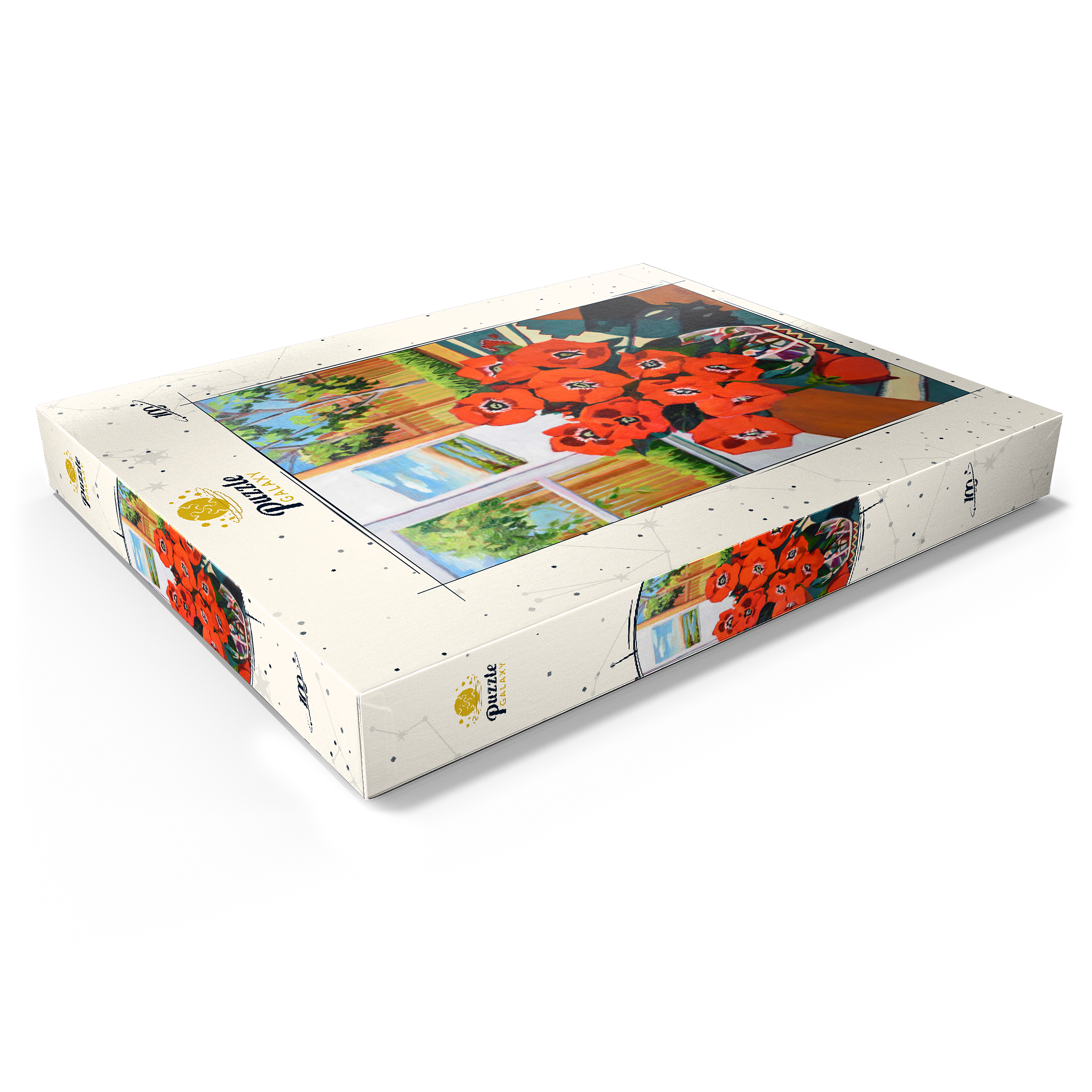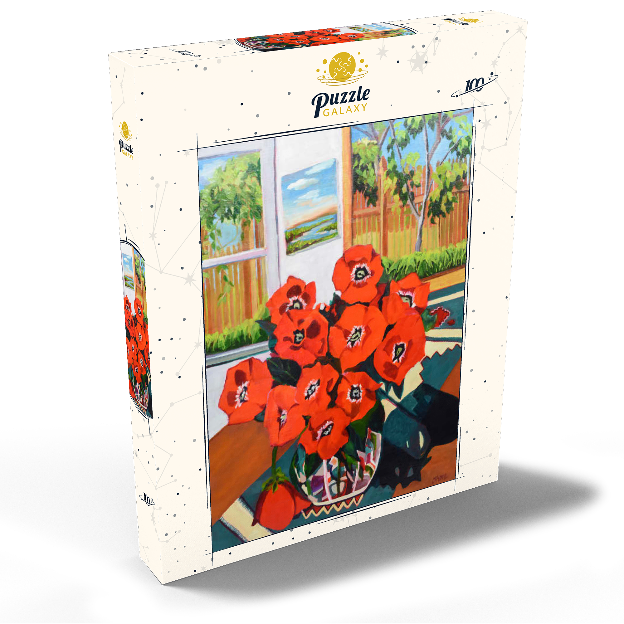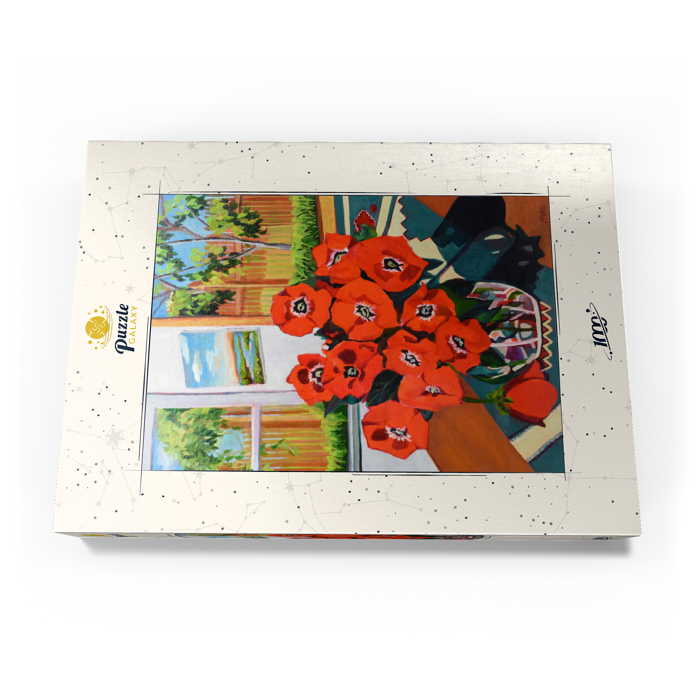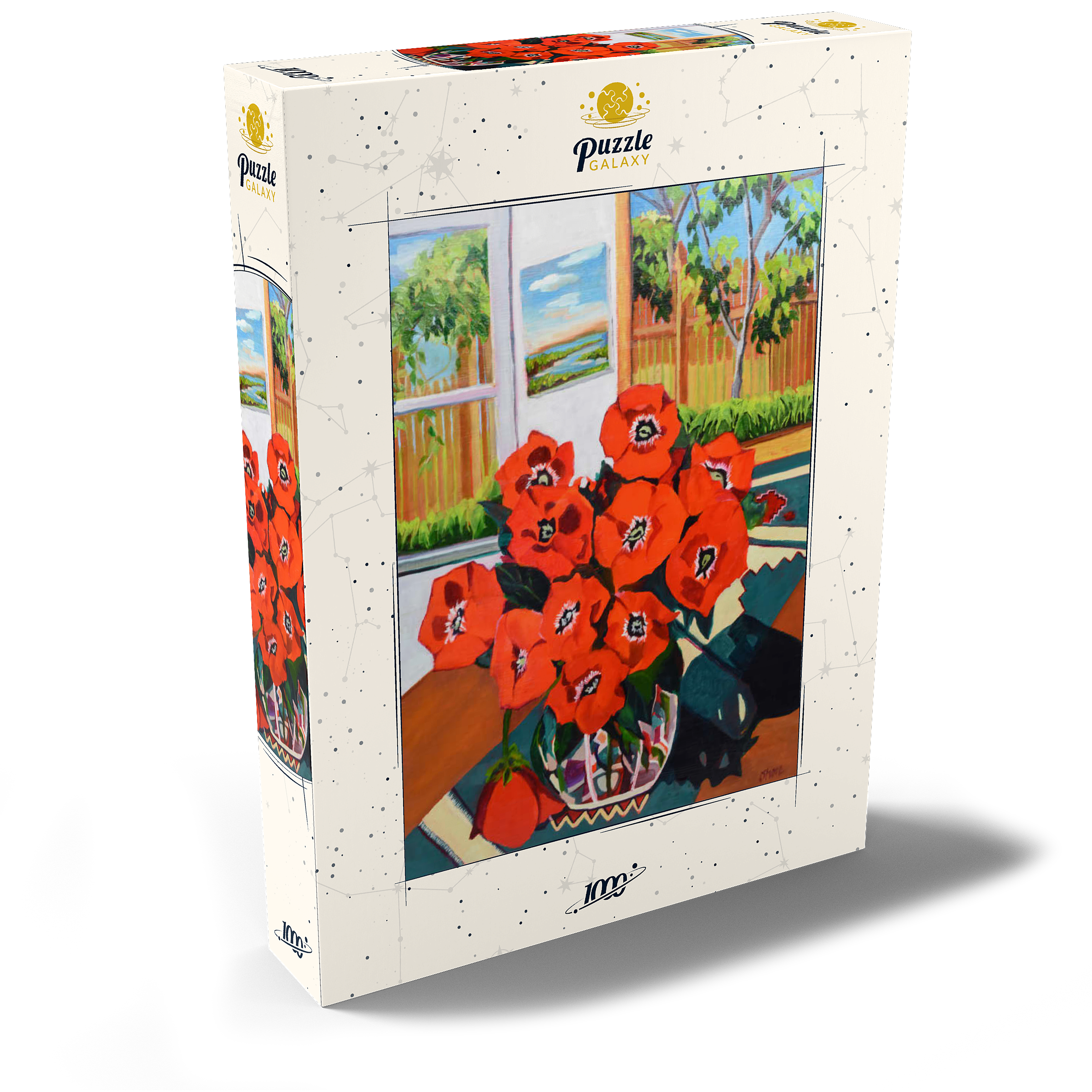 Dieses eindrucksvolle Stillleben zeigt einen leuchtenden Strauß roter Mohnblumen in einer schön gemusterten Vase vor einem sonnenbeschienenen Hintergrund. Der starke Kontrast zwischen tiefgrünen Blättern und feuerroten Blütenblättern schafft eine dynamische Komposition voller Wärme und Energie. Das Sonnenlicht fällt durch das offene Fenster und gibt den Blick auf eine üppige Gartenszene frei, während ein gerahmtes Landschaftsgemälde dem gemütlichen Ambiente zusätzliche Tiefe verleiht. Die ausdrucksstarken Pinselstriche und die reiche Farbpalette verleihen diesem klassischen Blumenarrangement eine moderne Note und machen es zu einem perfekten Stück für Liebhaber zeitgenössischer Stillleben und kühner, von der Natur inspirierter Kunst.