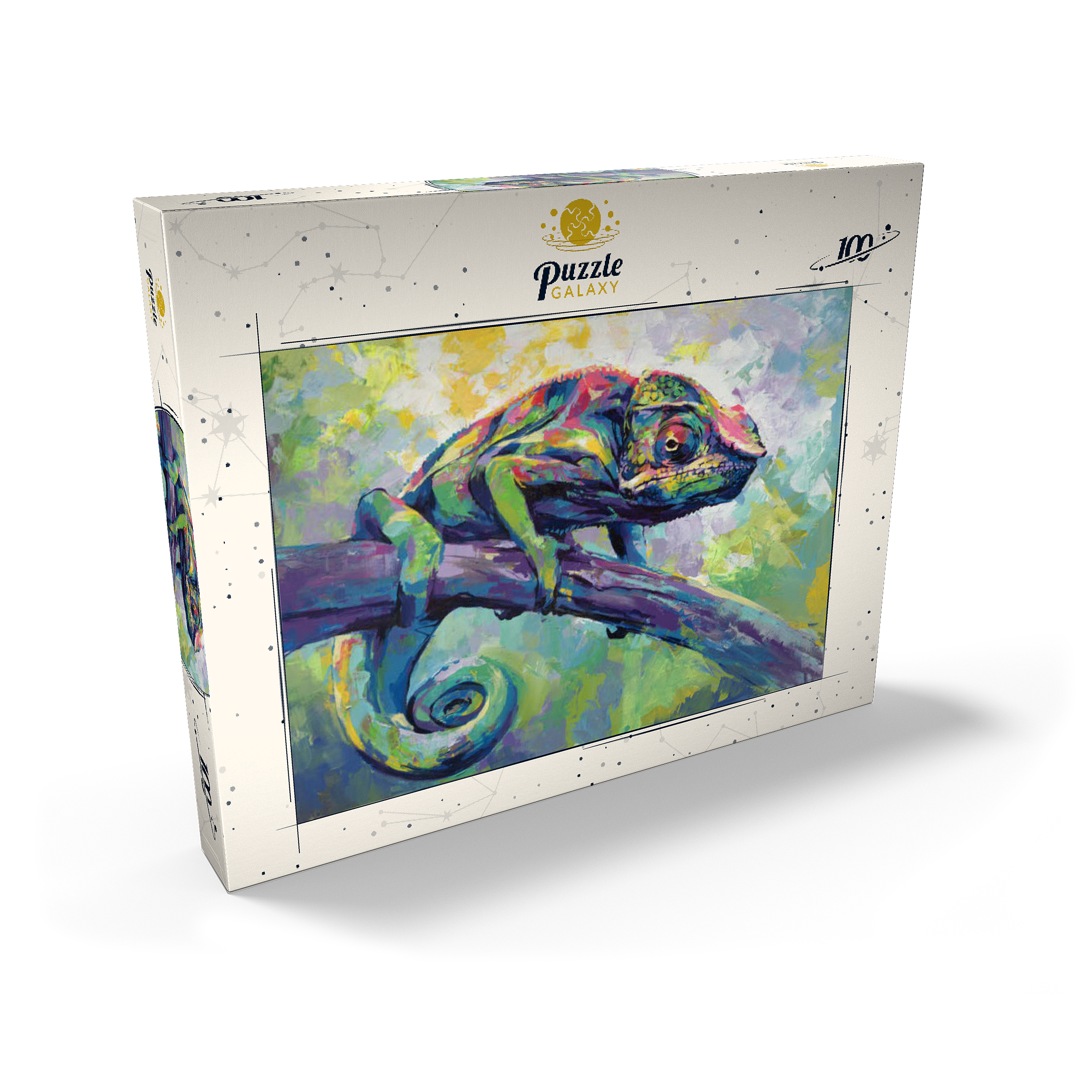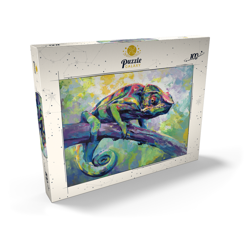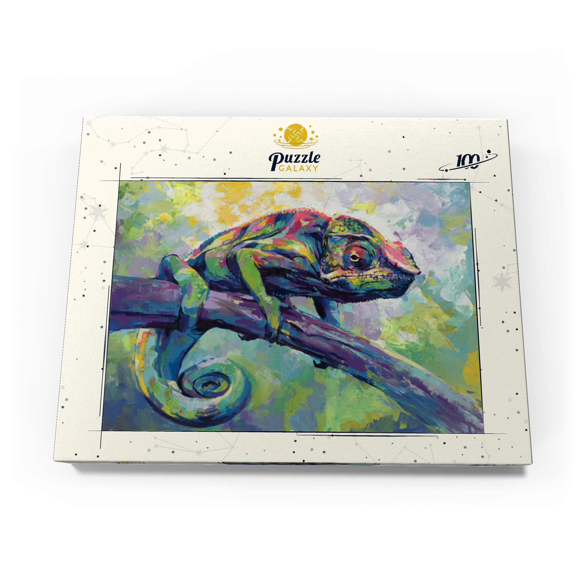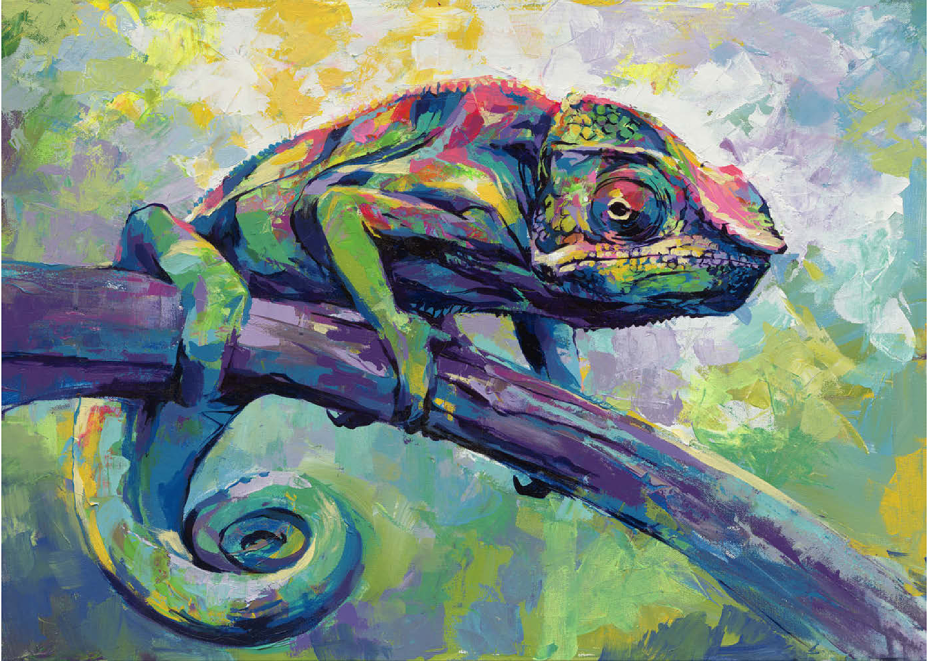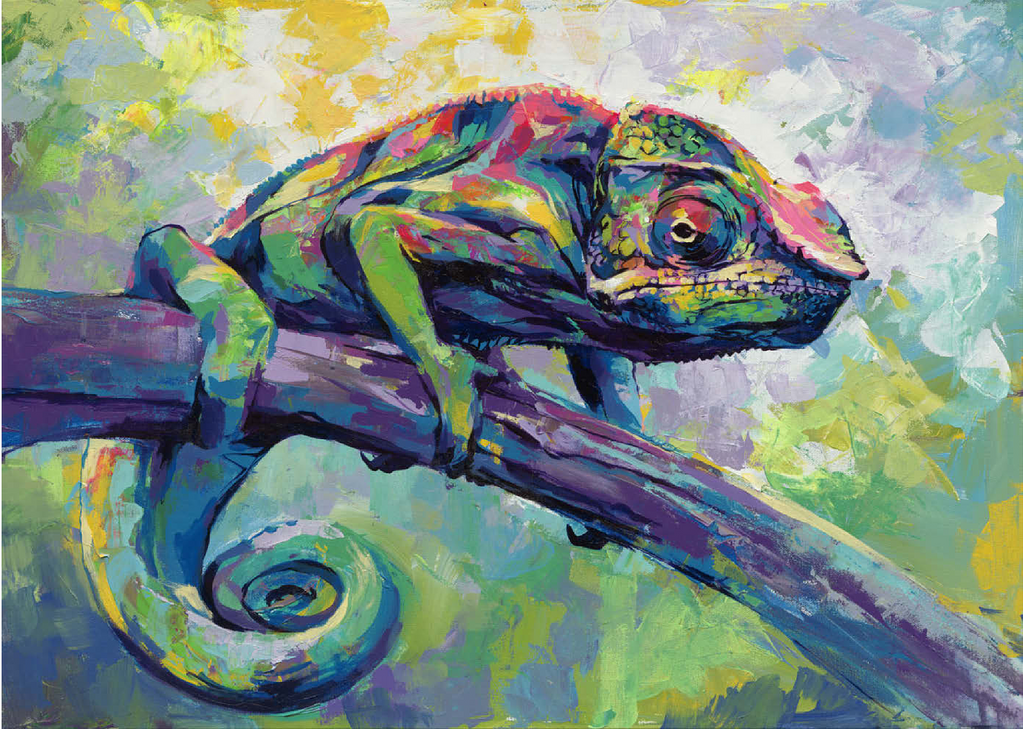 Dieses ausdrucksstarke Gemälde fängt ein Pantherchamäleon in seiner ganzen farbenprächtigen Pracht ein, das anmutig auf einem gebogenen Ast sitzt. Das Kunstwerk lebt durch eine dynamische Mischung aus Farben – leuchtendes Grün, Blau, Violett und Rosa –, die die natürliche Fähigkeit des Tieres widerspiegeln, sich in seine Umgebung einzufügen und gleichzeitig in künstlerischer Form hervorzustechen. Die strukturierten Pinselstriche und der impressionistische Hintergrund aus Laub und Licht verleihen der Szene eine lebendige Energie und betonen die exotische und faszinierende Schönheit dieses bemerkenswerten Reptils. Eine perfekte Hommage an einen der faszinierendsten Meister der Tarnung in der Natur.