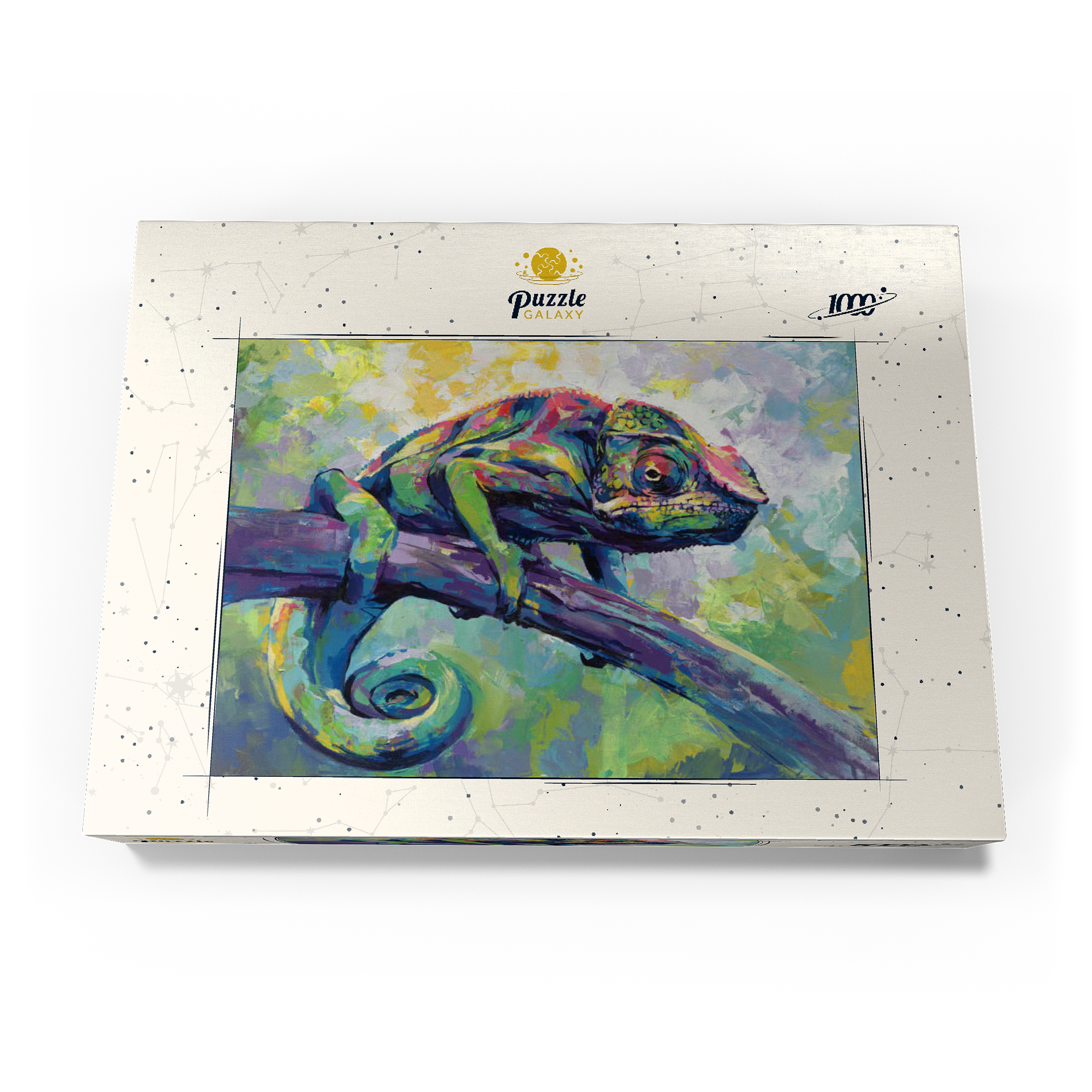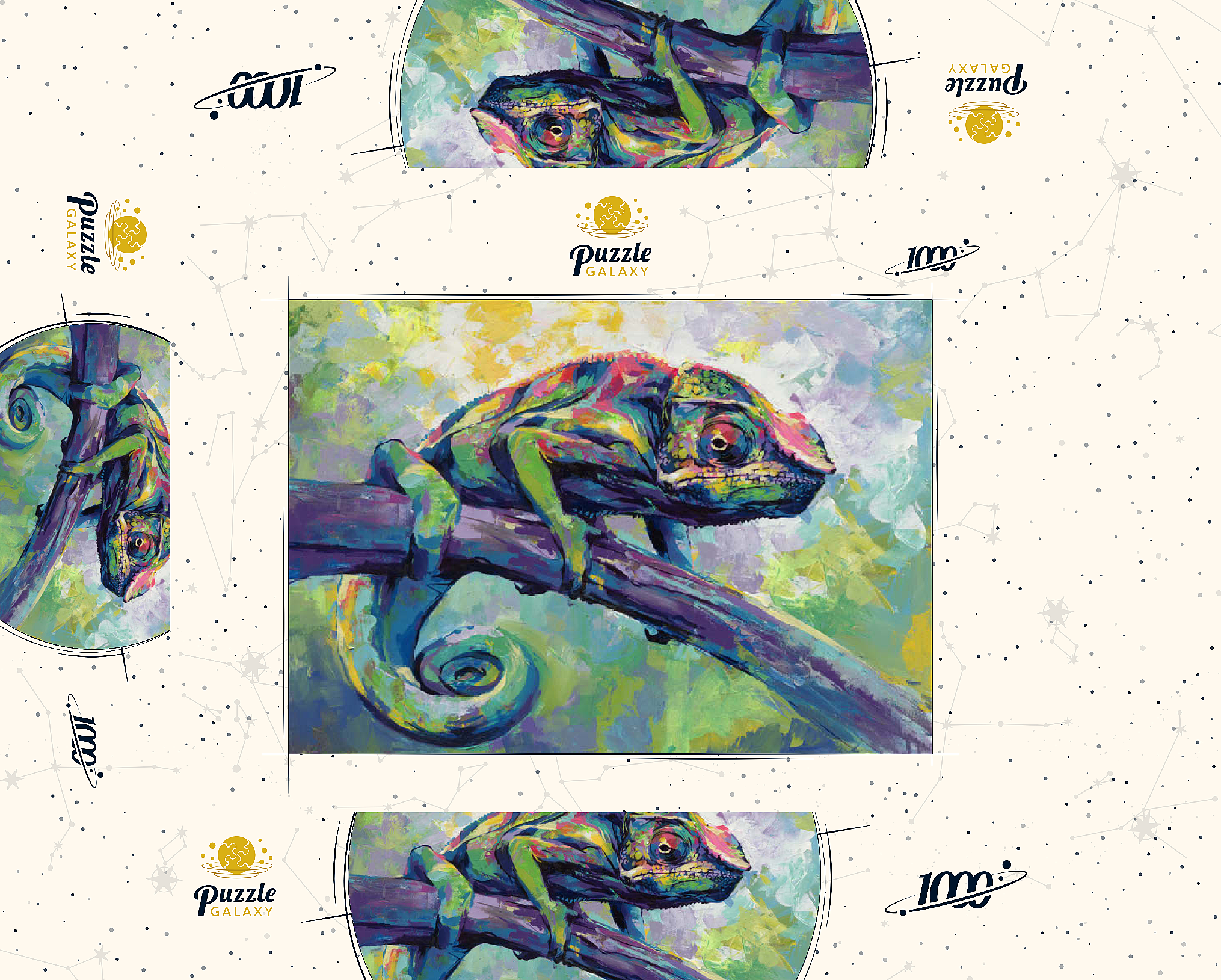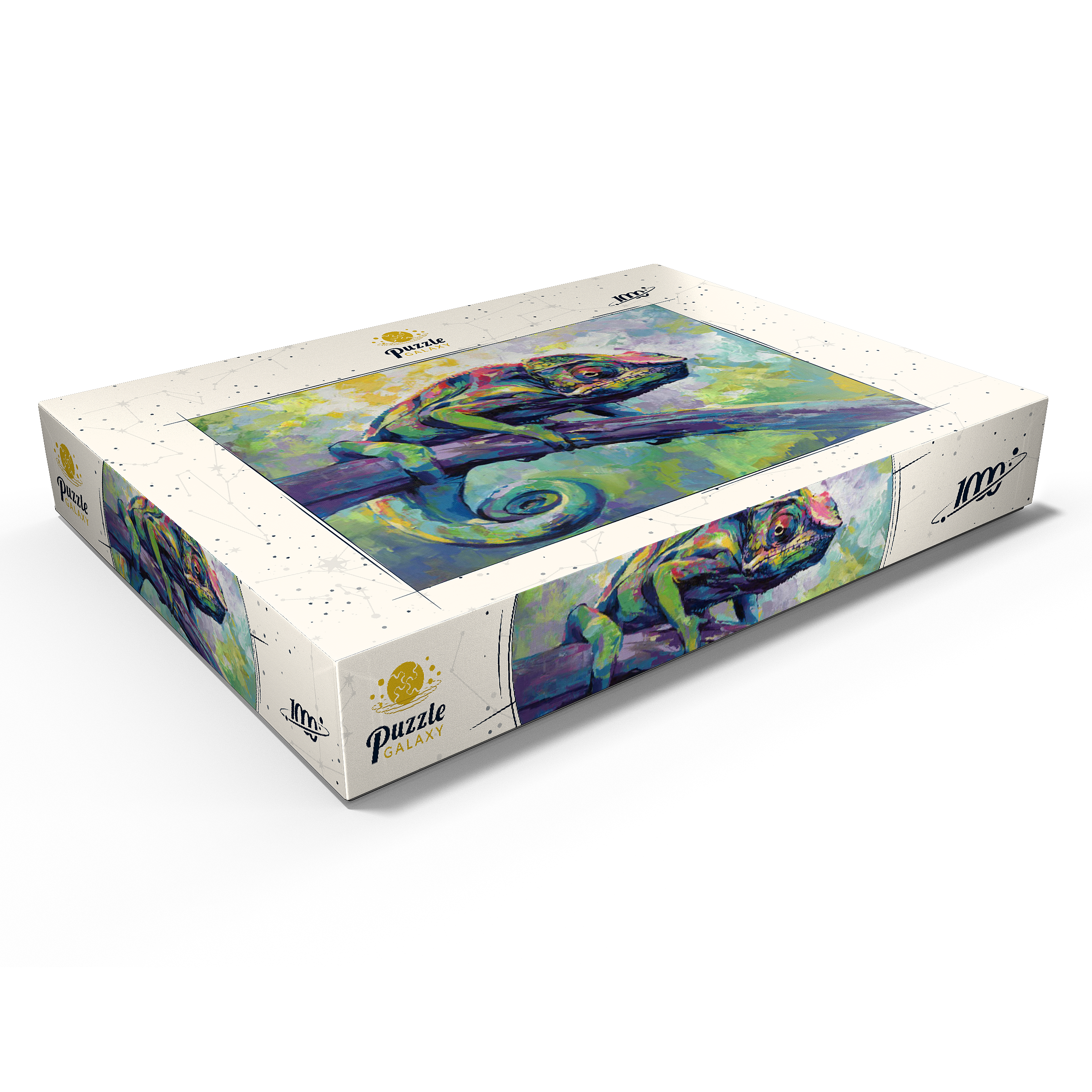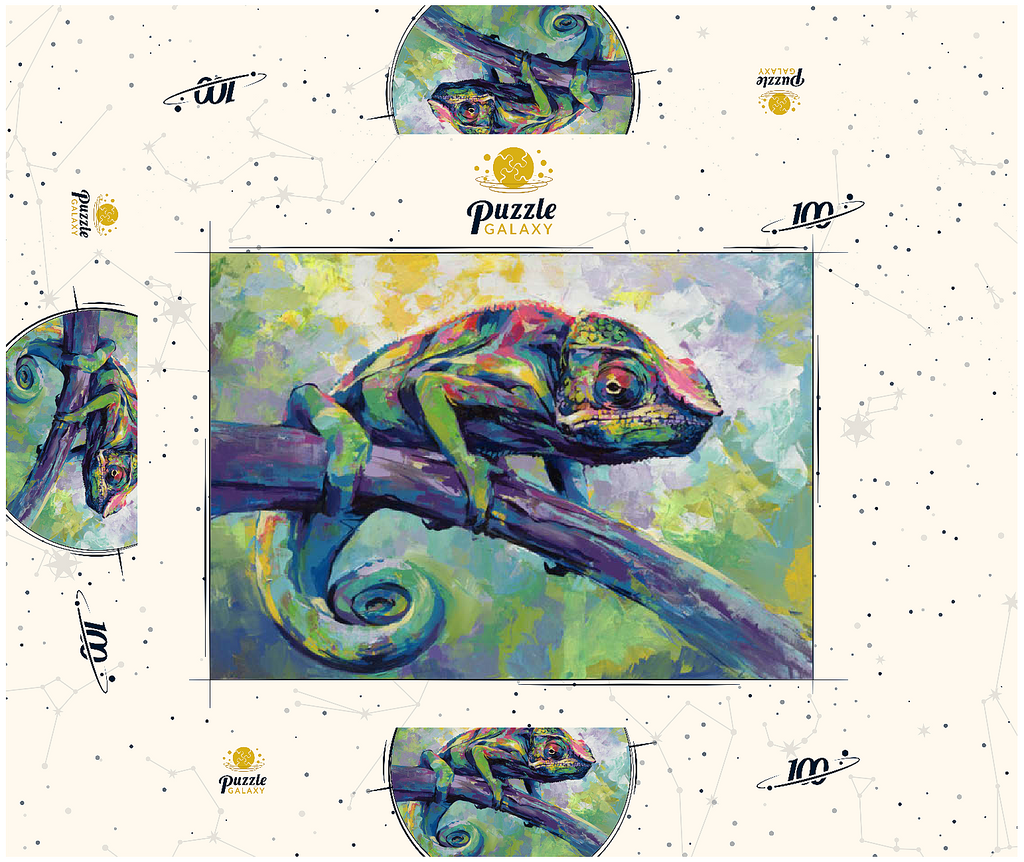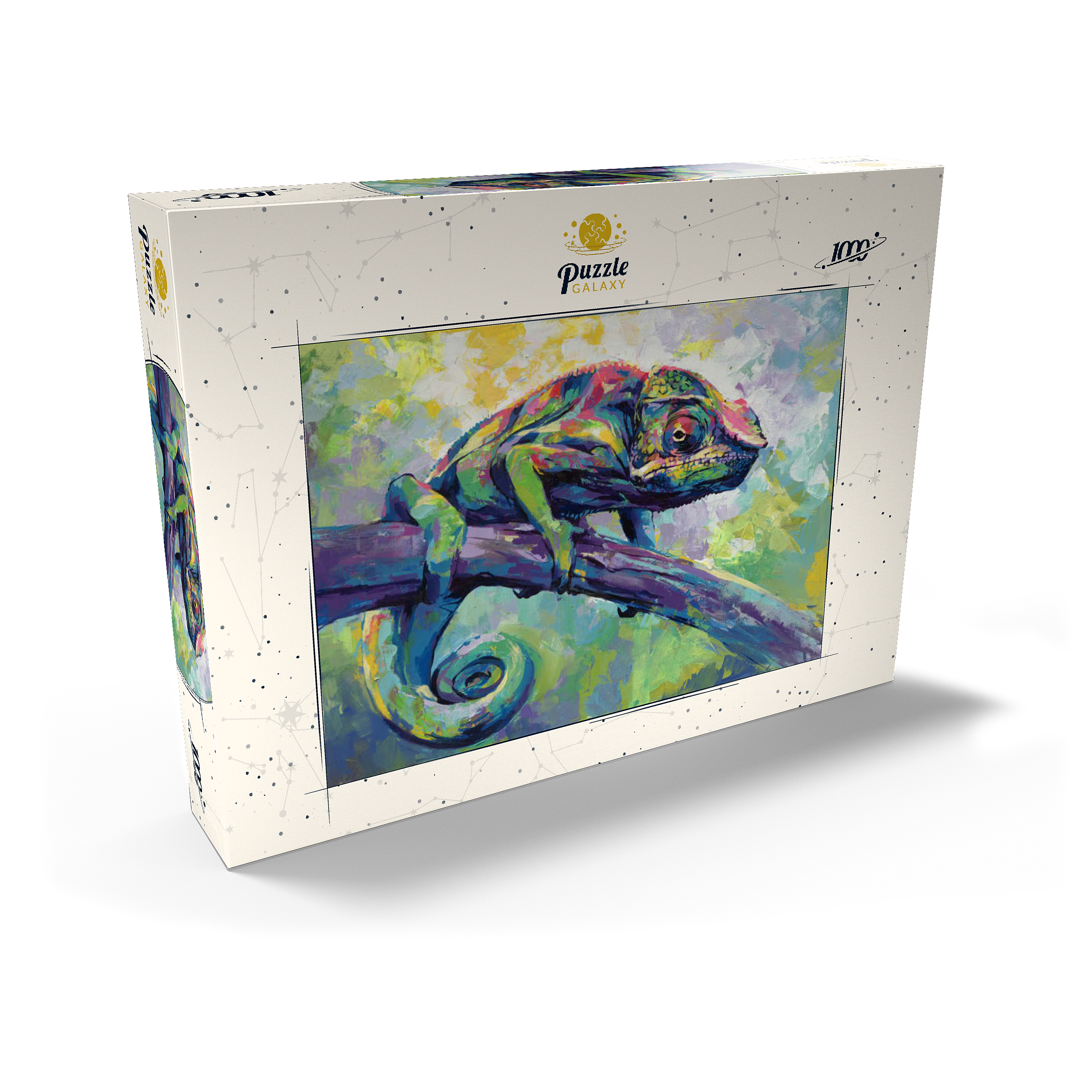 Dieses ausdrucksstarke Gemälde fängt ein Pantherchamäleon in seiner ganzen farbenprächtigen Pracht ein, das anmutig auf einem gebogenen Ast sitzt. Das Kunstwerk lebt durch eine dynamische Mischung aus Farben – leuchtendes Grün, Blau, Violett und Rosa –, die die natürliche Fähigkeit des Tieres widerspiegeln, sich in seine Umgebung einzufügen und gleichzeitig in künstlerischer Form hervorzustechen. Die strukturierten Pinselstriche und der impressionistische Hintergrund aus Laub und Licht verleihen der Szene eine lebendige Energie und betonen die exotische und faszinierende Schönheit dieses bemerkenswerten Reptils. Eine perfekte Hommage an einen der faszinierendsten Meister der Tarnung in der Natur.