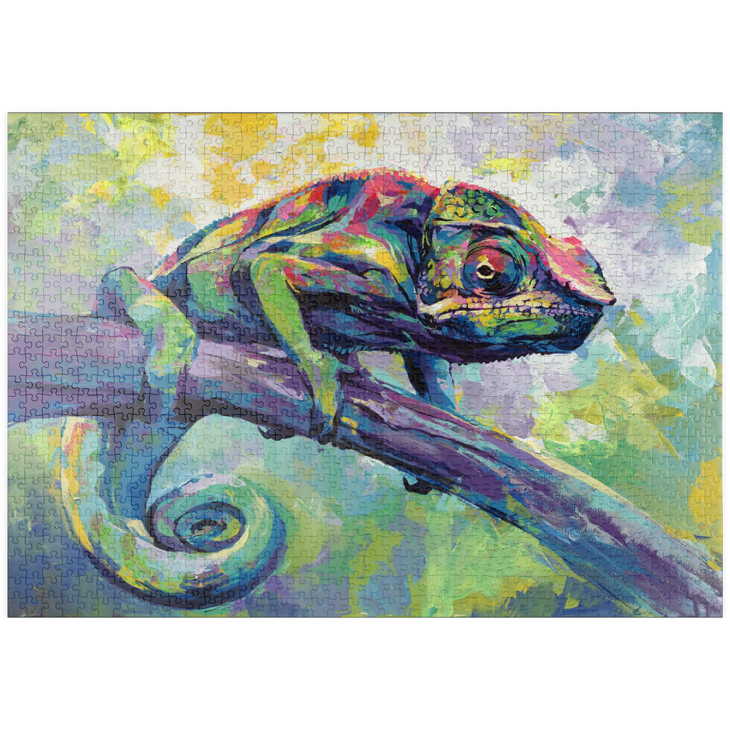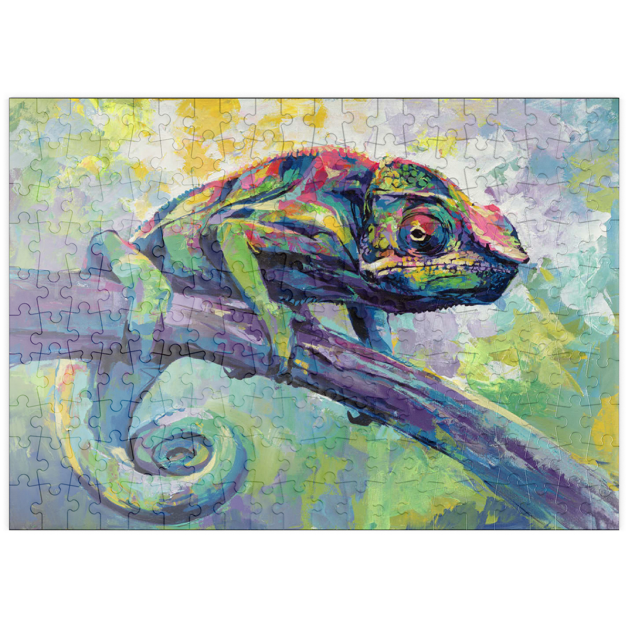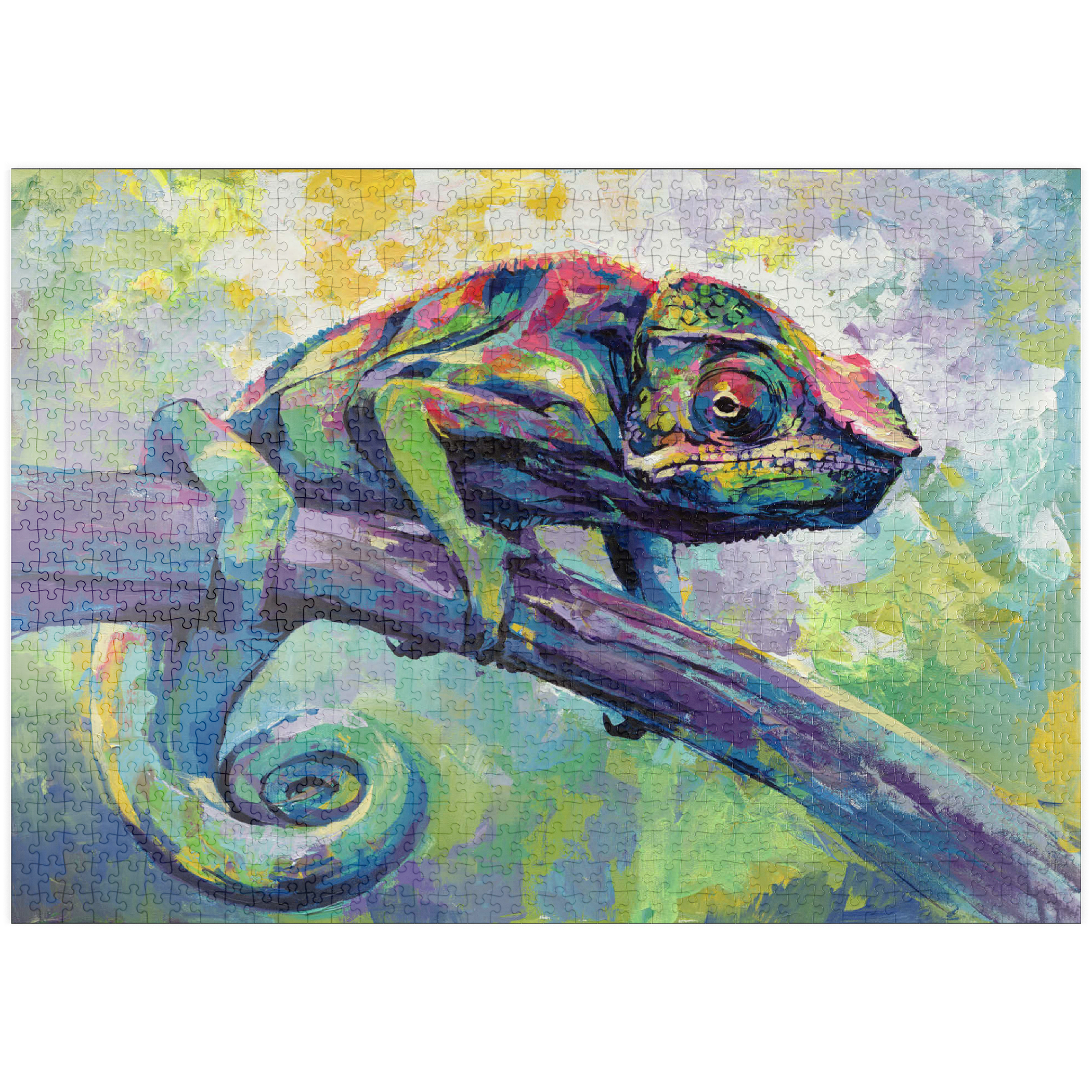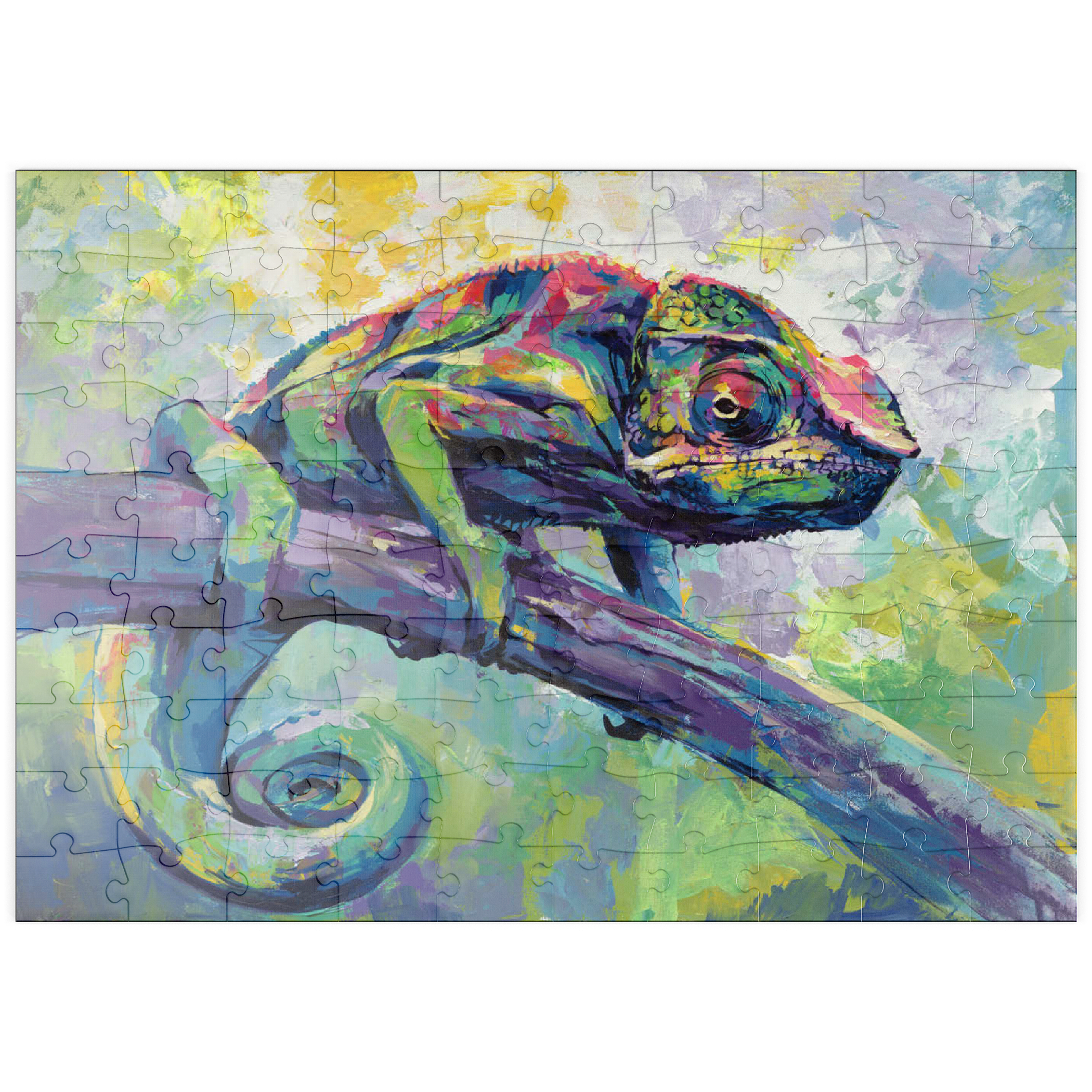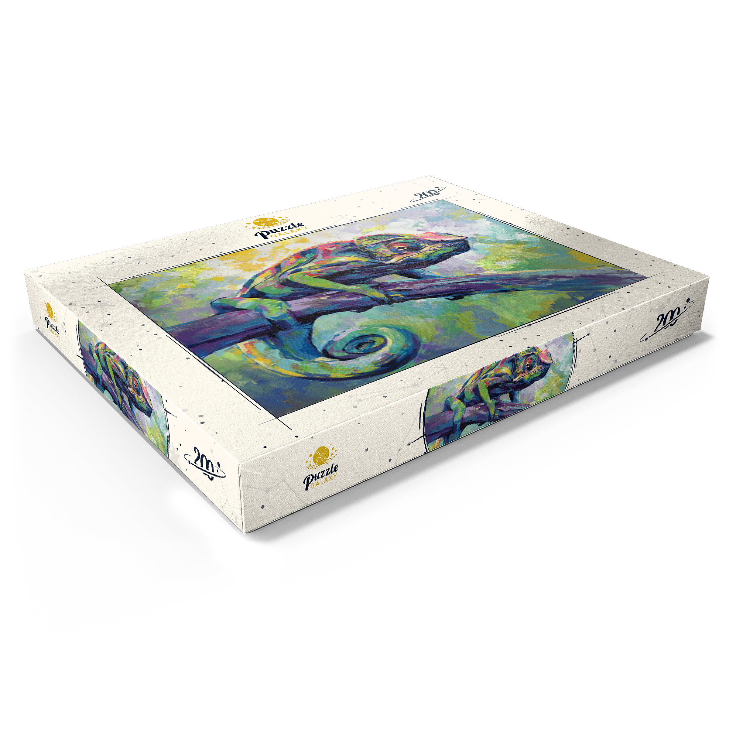 Dieses ausdrucksstarke Gemälde fängt ein Pantherchamäleon in seiner ganzen farbenprächtigen Pracht ein, das anmutig auf einem gebogenen Ast sitzt. Das Kunstwerk lebt durch eine dynamische Mischung aus Farben – leuchtendes Grün, Blau, Violett und Rosa –, die die natürliche Fähigkeit des Tieres widerspiegeln, sich in seine Umgebung einzufügen und gleichzeitig in künstlerischer Form hervorzustechen. Die strukturierten Pinselstriche und der impressionistische Hintergrund aus Laub und Licht verleihen der Szene eine lebendige Energie und betonen die exotische und faszinierende Schönheit dieses bemerkenswerten Reptils. Eine perfekte Hommage an einen der faszinierendsten Meister der Tarnung in der Natur.