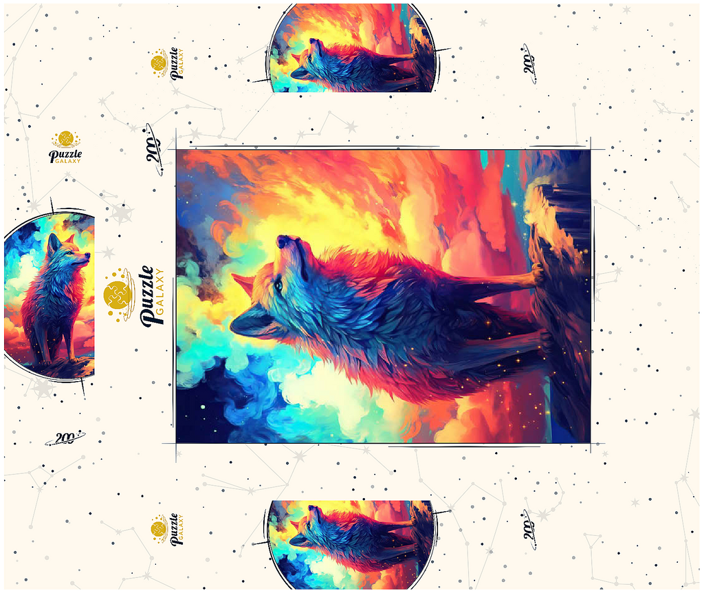 Dieses atemberaubende Kunstwerk zeigt einen majestätischen Wolf, der auf einem felsigen Gipfel steht, beleuchtet von einer Explosion leuchtender Farben am Himmel. In einer Mischung aus tiefem Blau, feurigem Rot und leuchtendem Gelb scheint das Fell des Wolfes mit der mystischen kosmischen Energie um ihn herum zu verschmelzen. Das Bild fängt den Geist der Wildnis mit einer traumhaften, ätherischen Qualität ein und ist damit die perfekte Wahl für Naturliebhaber und Fantasy-Fans gleichermaßen. Dieses atemberaubende digitale Gemälde symbolisiert Stärke, Freiheit und die Schönheit des Unbekannten.