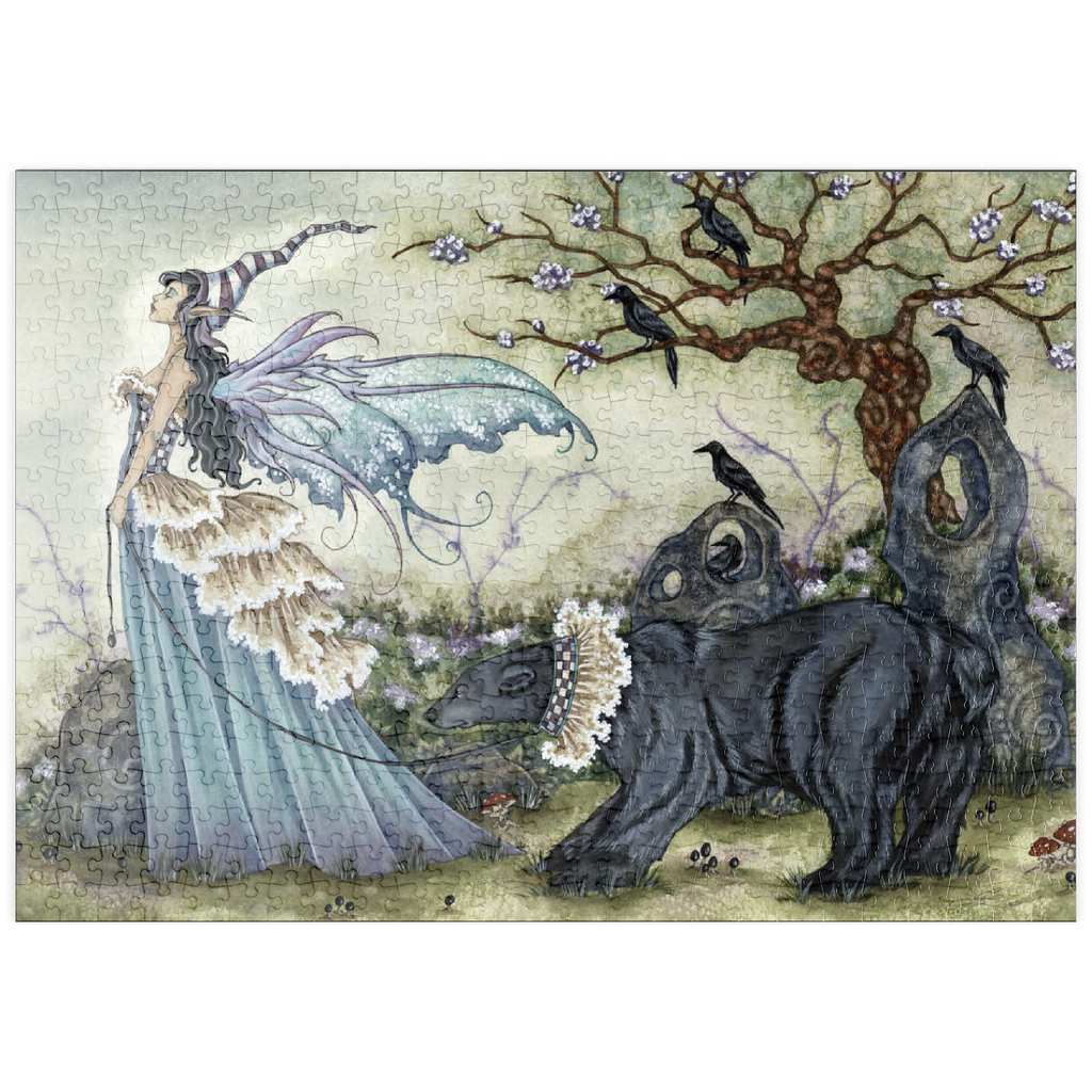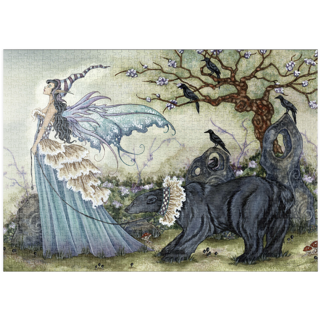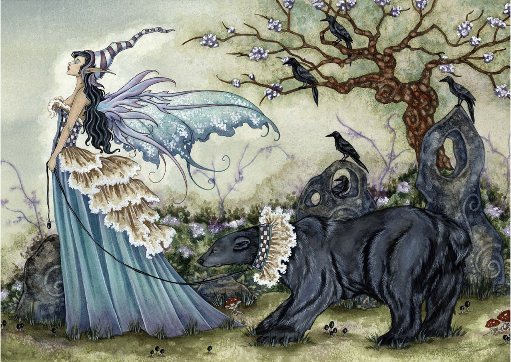 Dieses bezaubernde Kunstwerk -Frillicent und der Bär- von Amy Brown zeigt eine anmutige Fee in einem fließenden, mehrlagigen Kleid und einer skurrilen gestreiften Mütze, die einen königlichen schwarzen Bären an der Leine hält, der mit einer karierten Halskrause geschmückt ist. Die heitere Szene ist voller zarter Details, von den zarten Blüten an einem verdrehten Baum bis zu Krähen, die inmitten mystischer Steinformationen hocken.
