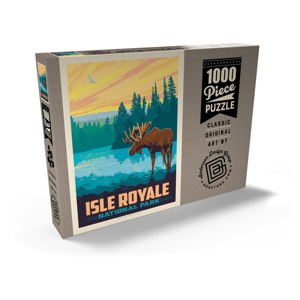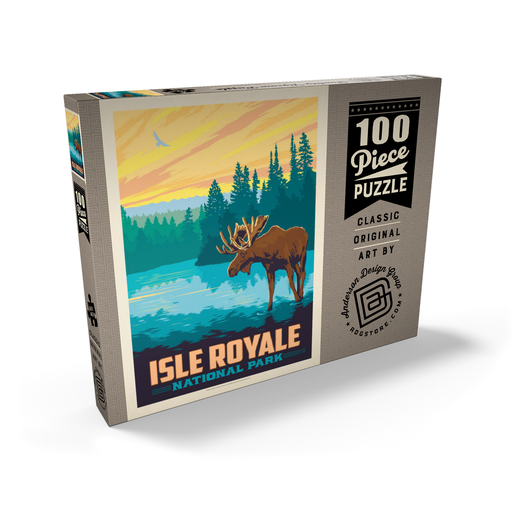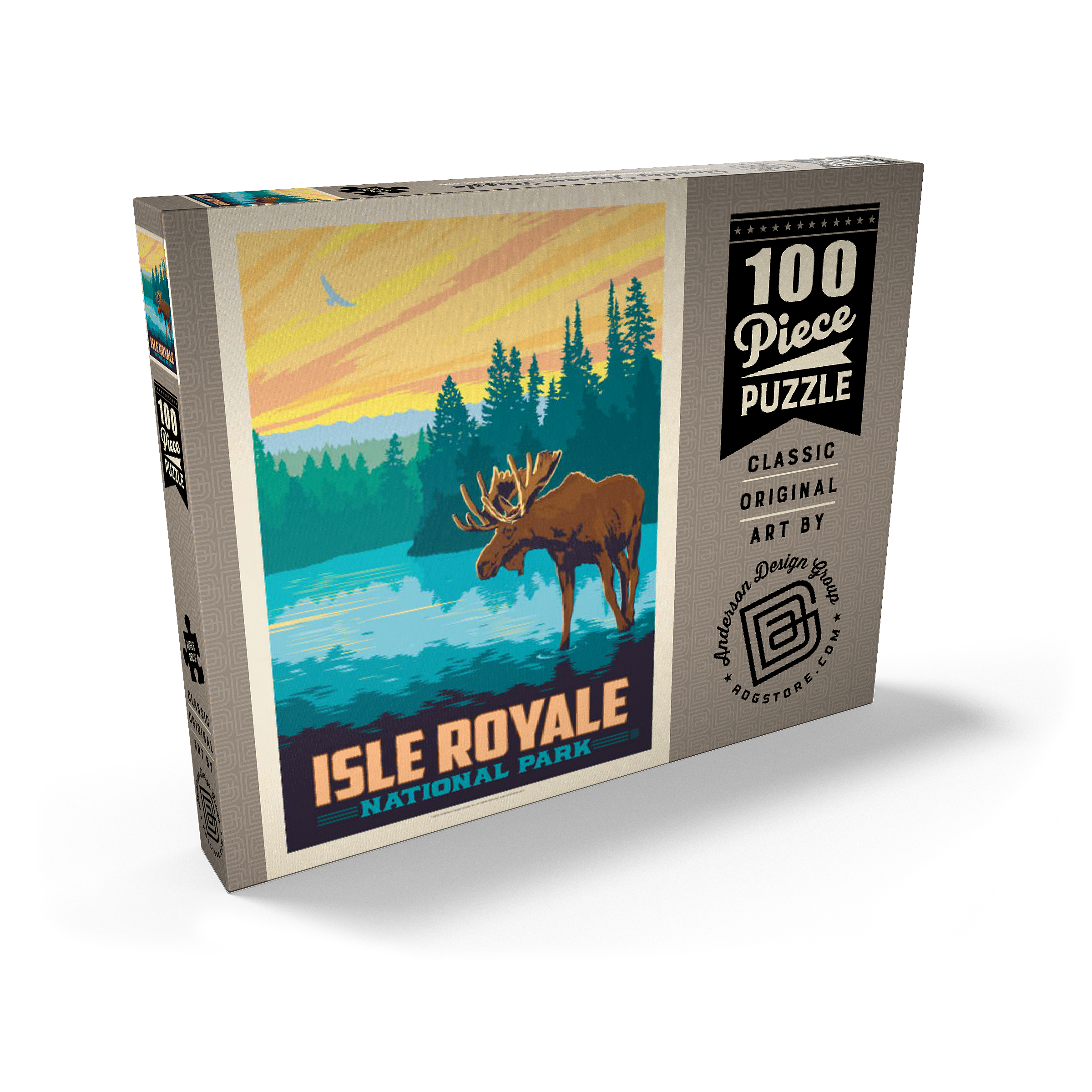 Eine ruhige Morgenszene im Isle Royale Nationalpark, in der ein Elch still am Wasser steht. Der ruhige See spiegelt das sanfte Morgenlicht wider, während Kiefern im Hintergrund die wilde Einsamkeit des Parks betonen. Der friedlich grasende Elch fängt die raue Schönheit und Ruhe des Parks ein. Die stille Morgenstimmung, verbunden mit der ungezähmten Landschaft, macht diese Szene zu einer perfekten Darstellung des abgelegenen und wilden Isle Royale.