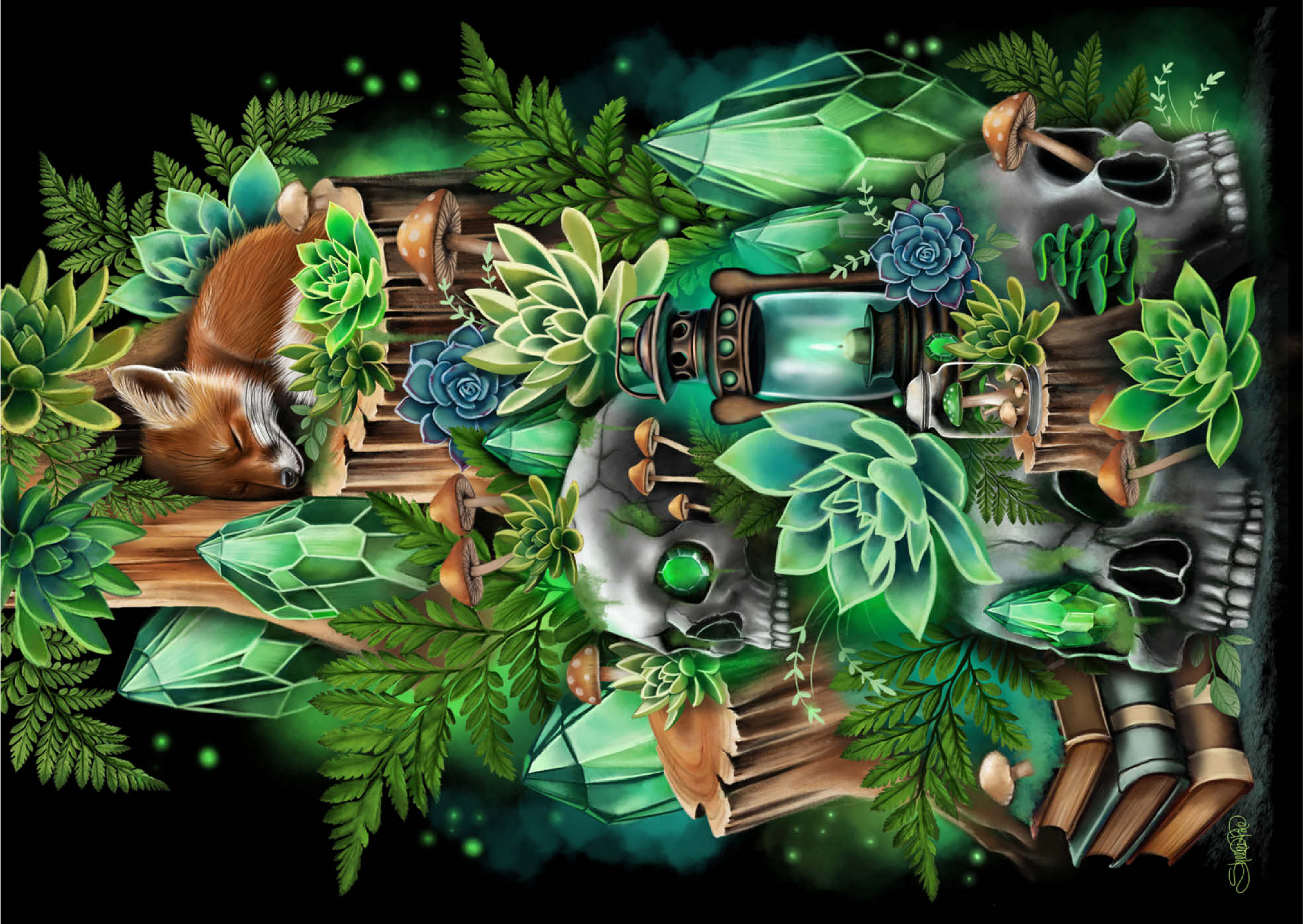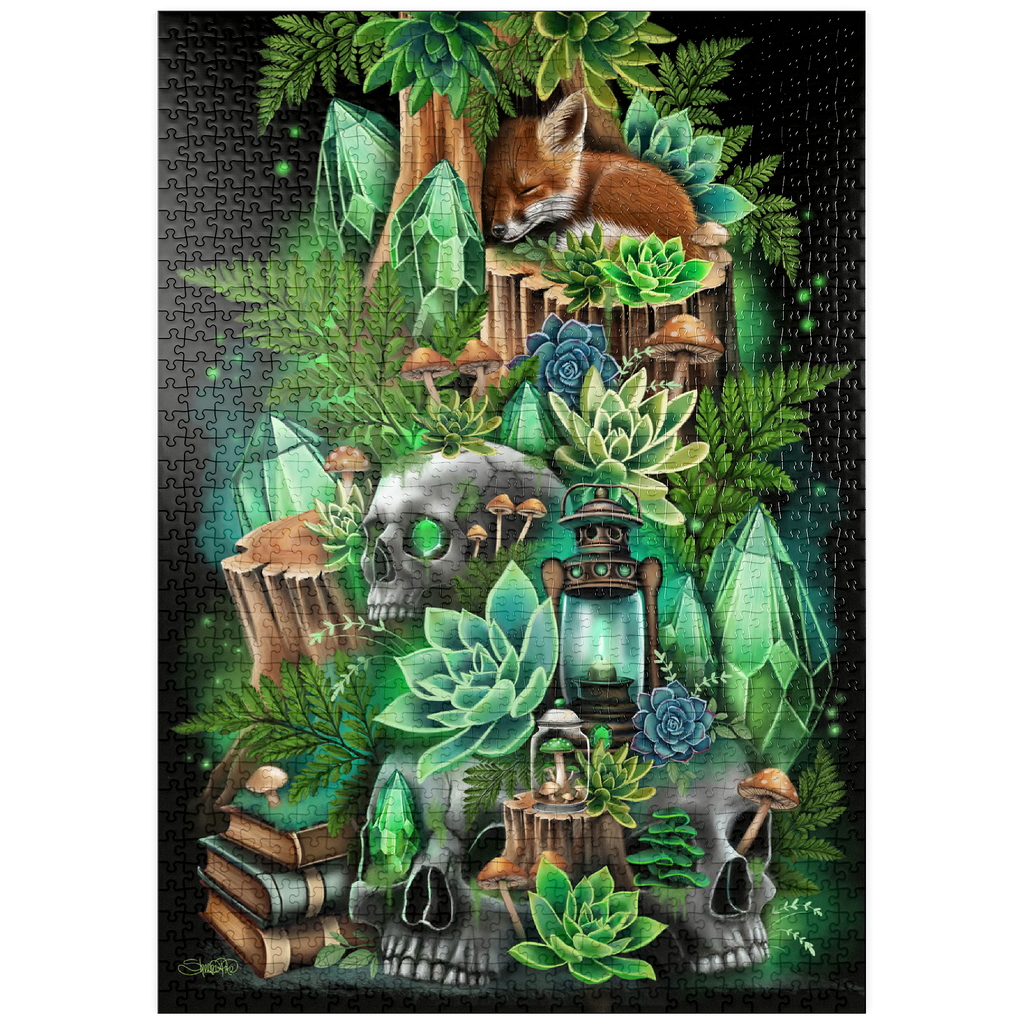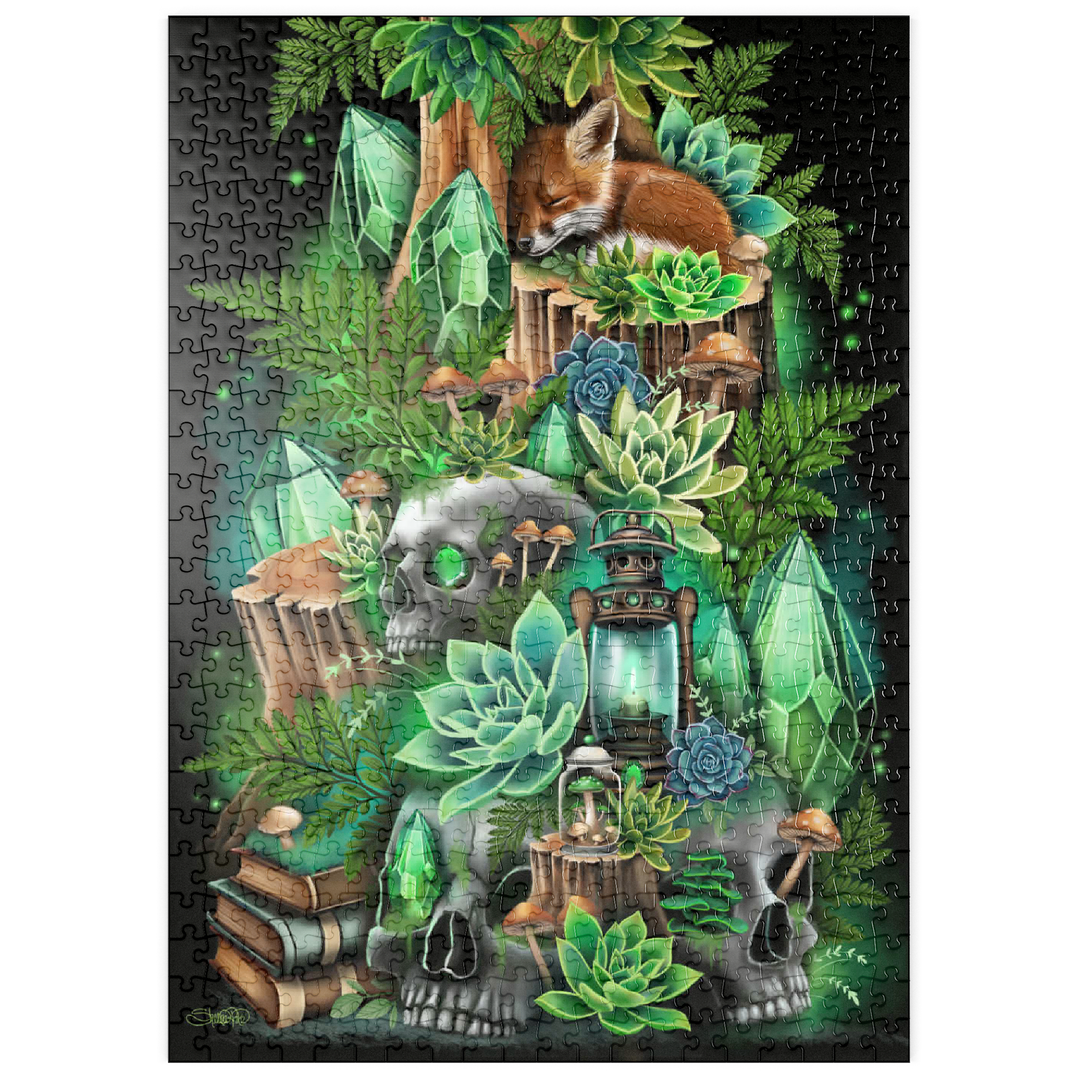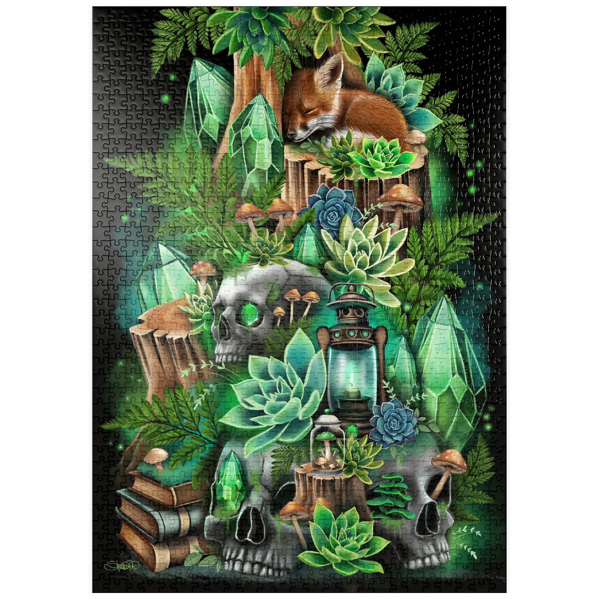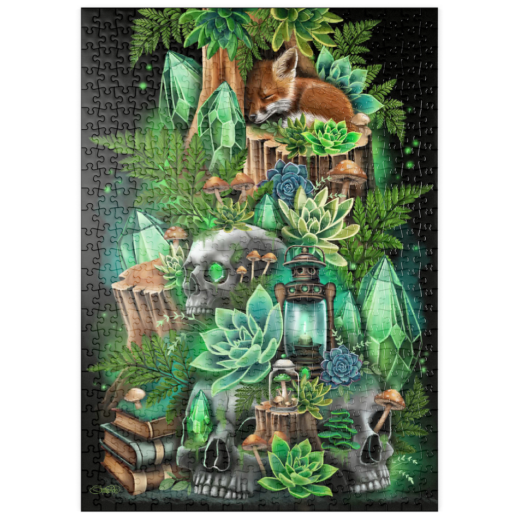 In einem Reich, in dem Zauber und Natur miteinander verschmelzen, entfaltet sich eine zarte Szene. Ein Babyfuchs, der Unschuld ausstrahlt, schlummert friedlich in der Umarmung eines hohlen Baumes. Dieser ruhige Zufluchtsort liegt eingebettet in einem magischen grünen Wald, der voller Leben und Geheimnisse ist. Sukkulenten, Kristalle und Pilze sind kunstvoll arrangiert und verleihen dem Bild zusätzliche Textur und visuelle Faszination. Das Kunstwerk erinnert an den skurrilen Stil von Sheena Pike und strotzt vor charmanten Details, die Neugier wecken und zum näheren Hinsehen einladen. Es ist ein faszinierendes Werk, das Freude und Staunen hervorruft und sich perfekt als anspruchsvolles, aber reizvolles Puzzle eignet. Die verspielte Komposition und die harmonische Farbpalette strahlen Wärme und Gelassenheit aus.