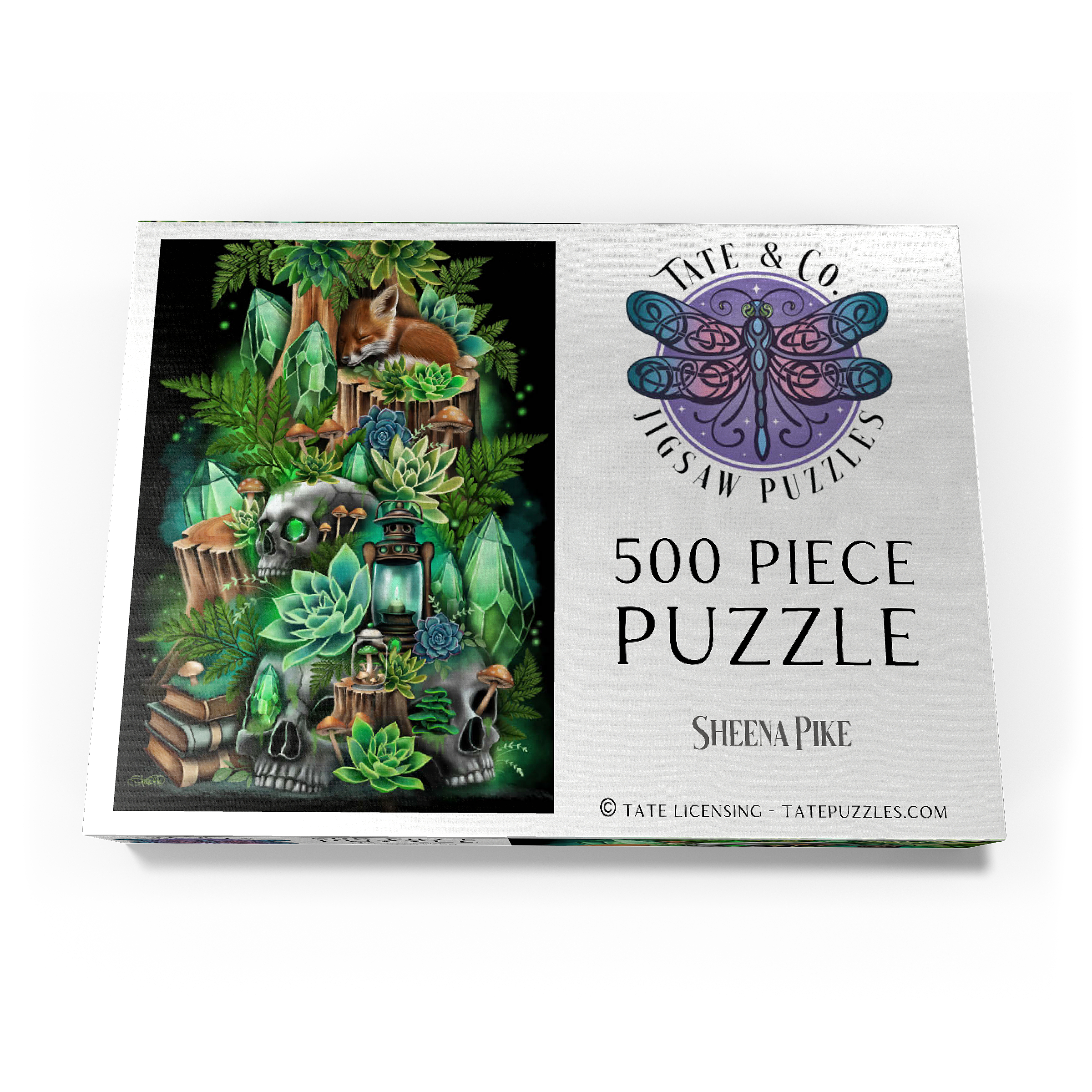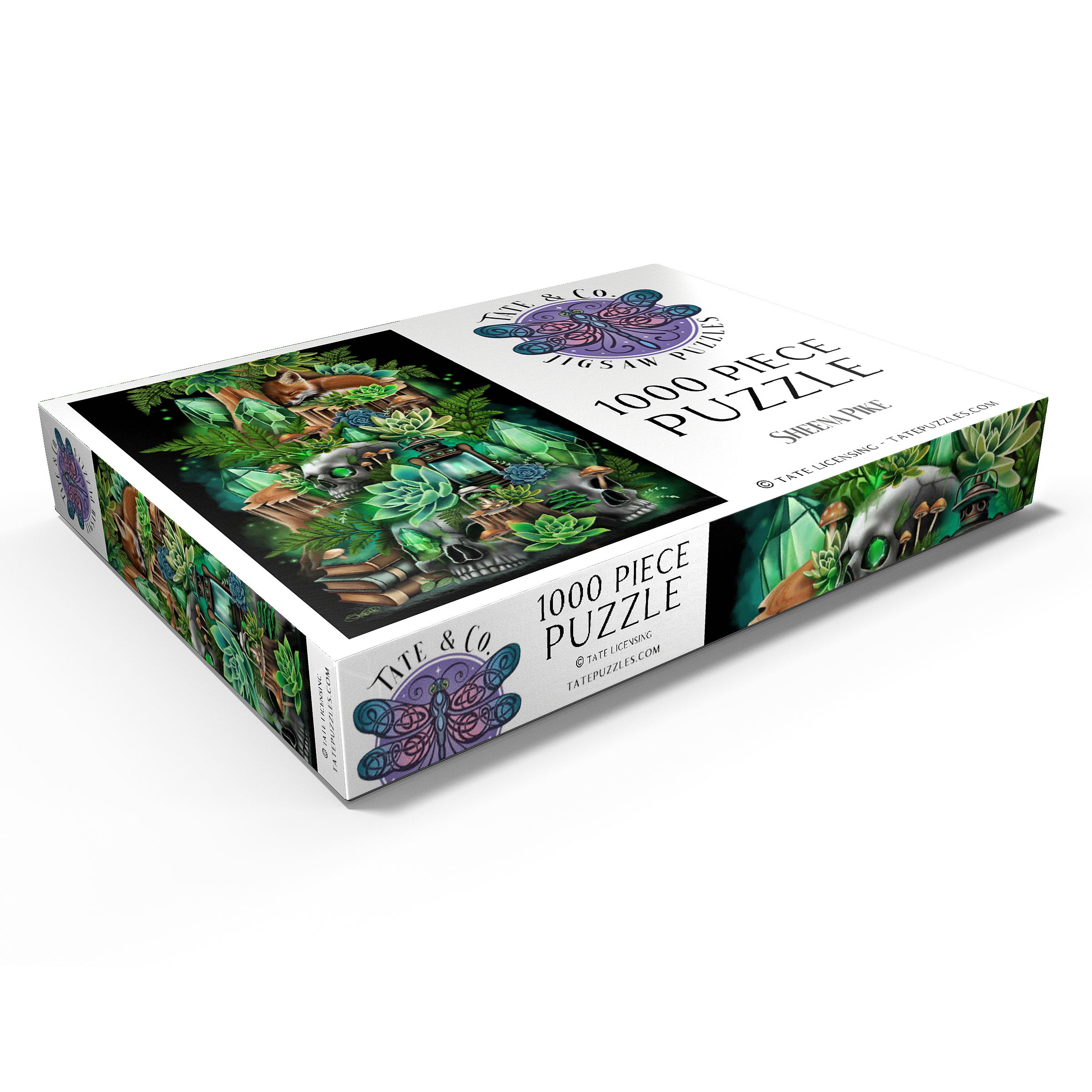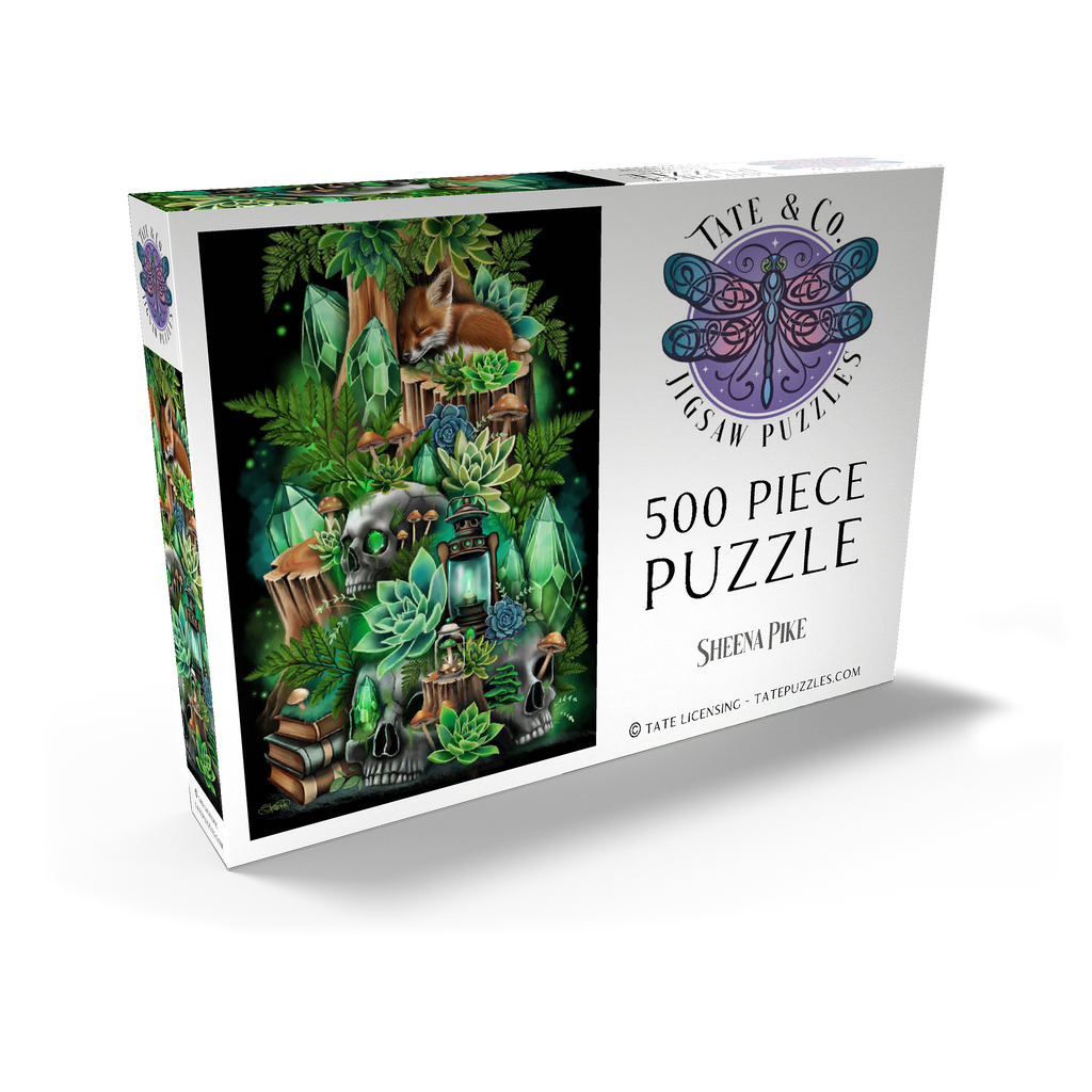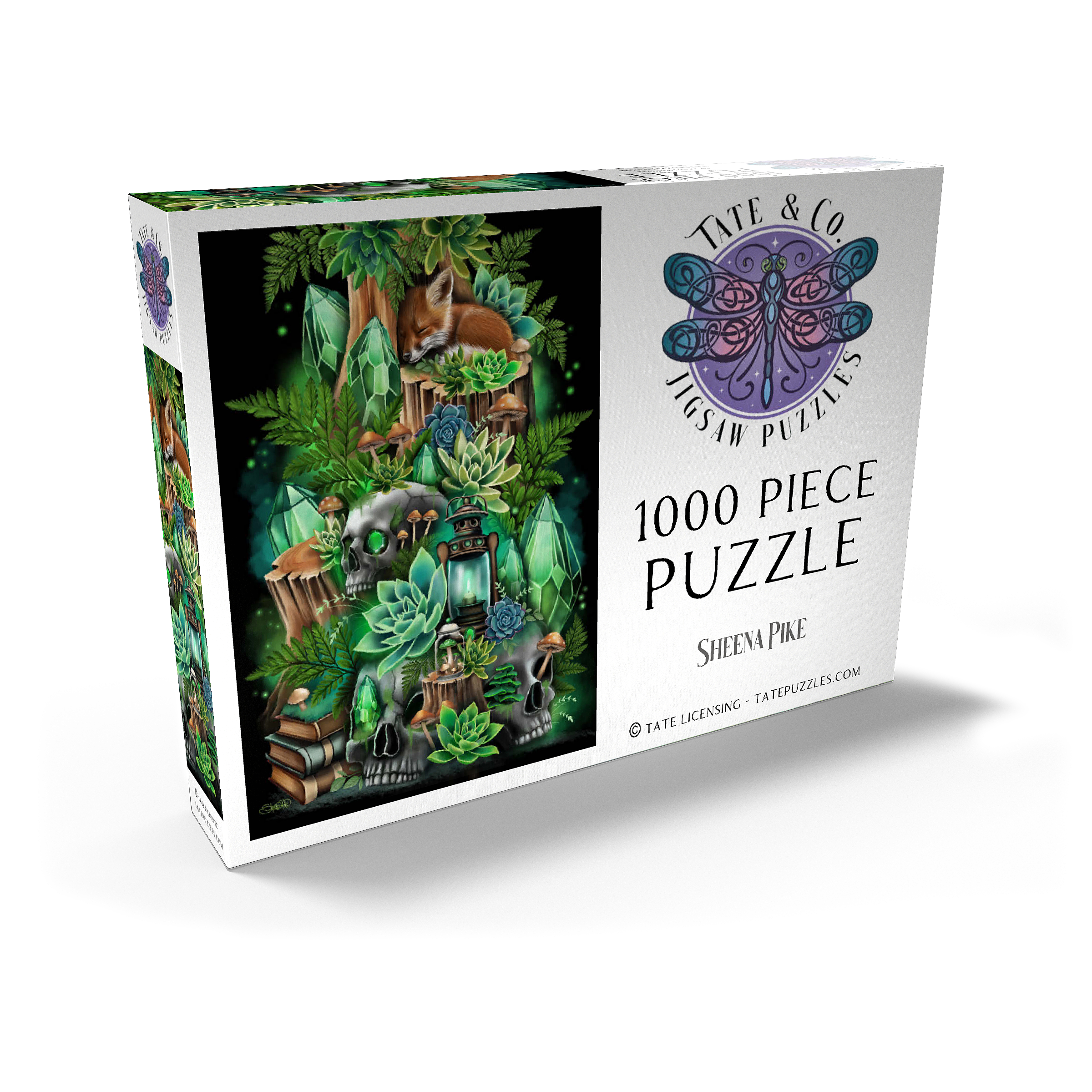 In einem Reich, in dem Zauber und Natur miteinander verschmelzen, entfaltet sich eine zarte Szene. Ein Babyfuchs, der Unschuld ausstrahlt, schlummert friedlich in der Umarmung eines hohlen Baumes. Dieser ruhige Zufluchtsort liegt eingebettet in einem magischen grünen Wald, der voller Leben und Geheimnisse ist. Sukkulenten, Kristalle und Pilze sind kunstvoll arrangiert und verleihen dem Bild zusätzliche Textur und visuelle Faszination. Das Kunstwerk erinnert an den skurrilen Stil von Sheena Pike und strotzt vor charmanten Details, die Neugier wecken und zum näheren Hinsehen einladen. Es ist ein faszinierendes Werk, das Freude und Staunen hervorruft und sich perfekt als anspruchsvolles, aber reizvolles Puzzle eignet. Die verspielte Komposition und die harmonische Farbpalette strahlen Wärme und Gelassenheit aus.