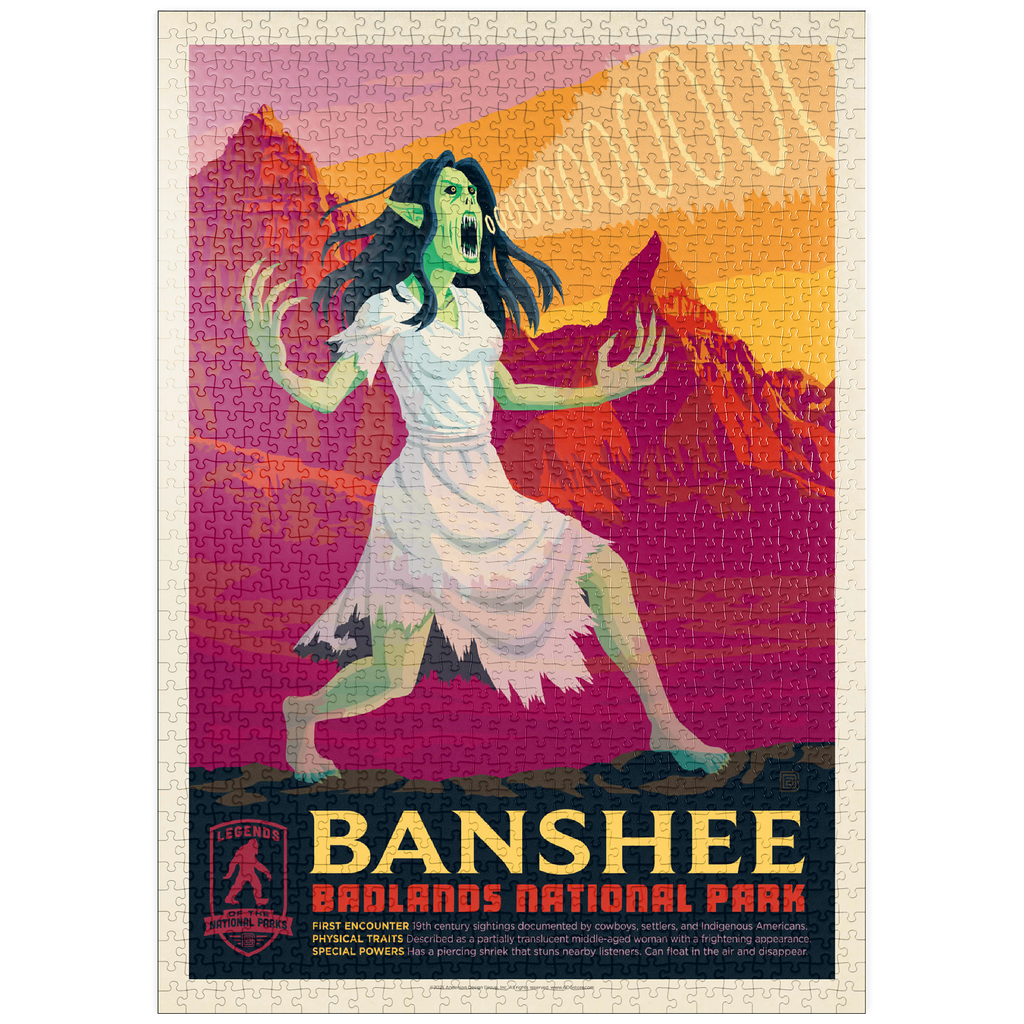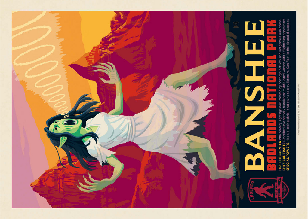 Die Banshee im Badlands-Nationalpark ist eine furchterregende Geistergestalt, die tief in der Folklore des 19. Jahrhunderts verwurzelt ist und von Cowboys, Siedlern und amerikanischen Ureinwohnern gesichtet wurde. Dieses geisterhafte Wesen wird als eine teilweise durchscheinende Frau mittleren Alters mit stechenden Augen, langem wallendem Haar und zerrissenen weißen Kleidern beschrieben. Die Legenden erzählen von ihrem durchdringenden Schrei, einem schaurigen Heulen, das Zuhörer in der Nähe betäubt und Unheil ankündigt. Es ist bekannt, dass die Banshee über der zerklüfteten Landschaft der Badlands schwebt und sich in Luft auflöst, so dass nur das Echo ihres übernatürlichen Schreis zurückbleibt. Diese Illustration im Vintage-Stil fängt ihre unheimliche Präsenz vor dem Hintergrund der dramatischen roten Felsformationen und des glühenden Sonnenuntergangs im Badlands National Park ein. Dieses Kunstwerk ist ein Muss für Folklore-Enthusiasten, Geisterjäger und Liebhaber übernatürlicher Legenden und erweckt einen legendären Mythos zum Leben.