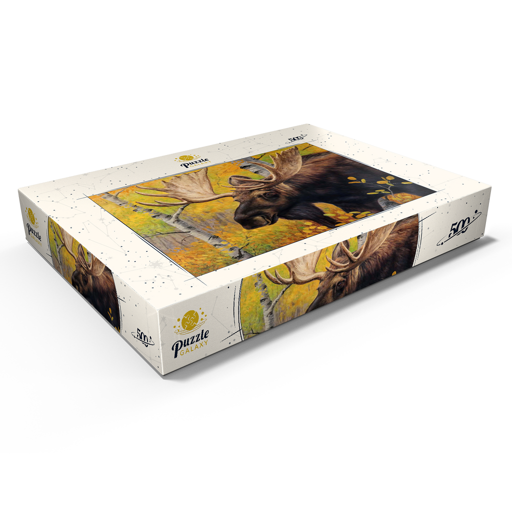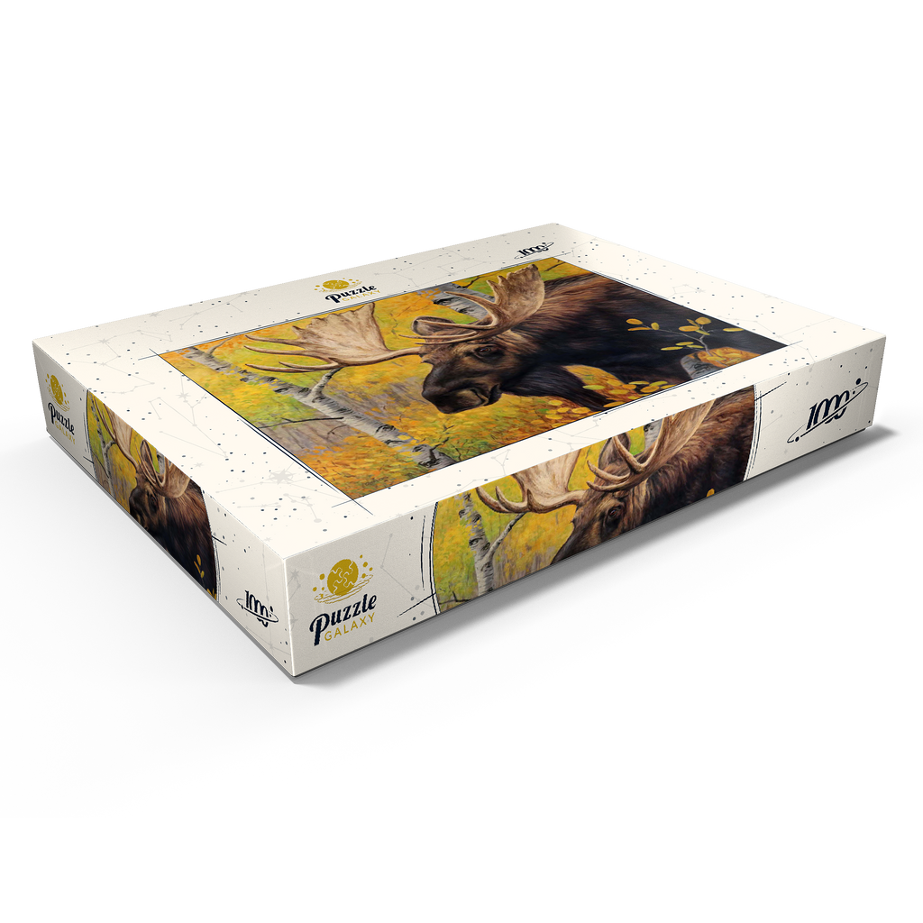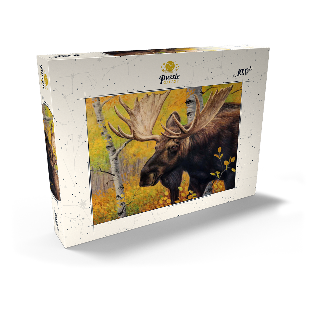 Eine beeindruckende Nahaufnahme eines Elchbullen inmitten eines lebhaften Herbstwaldes. Das goldgelbe Laub der Espenbäume umgibt den Elch und hebt die warmen, erdigen Töne seines dicken Fells und die Pracht seines massiven Geweihs hervor. Der ruhige Gesichtsausdruck des Elchs in Kombination mit den leuchtenden Herbstfarben schafft eine fesselnde Szene, die die Schönheit und Ruhe der Wildtiere in ihrem natürlichen Lebensraum verkörpert.